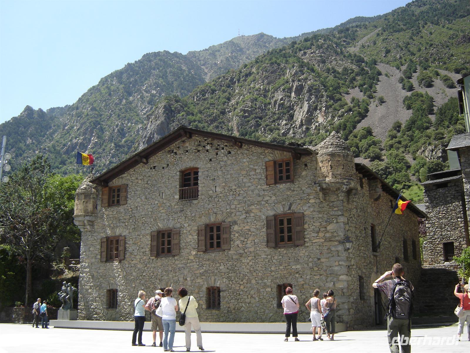 Zum Mittag erfolgte die Rückfahrt nach Andorra la Vella, die Hauptstadt des kleinen Fürstenstaates und zugleich höchste Hauptstadt Europas. In unserer Freizeit bummelten wir durch die kleinen und großen Geschäfte, schlenderten durch die schmalen Gassen und ließen uns zum Mittagssnack oder Kaffee und Kuchen in einem Restaurant nieder, um das Treiben auf den Straßen zu beobachten. Im Anschluss brachte uns Helga zum Casa de la Vall aus dem Jahr 1580, wörtlich übersetzt Haus des Tales, war der ehemalige Sitz des Generalrats von Andorra. Seit letztem Jahr tagt das Parlament bestehend aus 28 Abgeordneten im neben stehenden modernen Glasgebäude.
