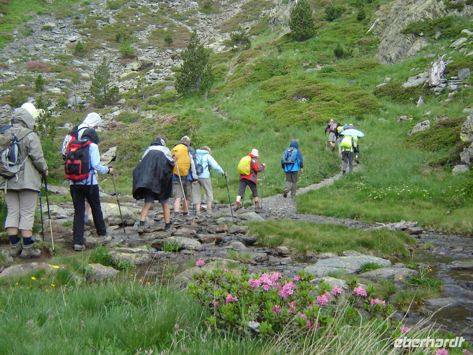 Auf unserem Programm stand eigentlich die Passüberquerung von Meners auf über 2700 Metern, doch aufgrund von Gewittergefahr haben sich unserer Wanderleiter Marco und Ignasi dazu entschieden, eine alternative Wanderung durchzuführen. Wir wanderten auf dem höchsten Berg Andorras, dem Coma Pedrosa mit knapp 3000 Metern Höhe. Doch wir wanderten nicht auf dieser gefährlichen Höhe, sondern befanden uns nur auf der unteren Hälfte des Berges. Nichtsdestotrotz war ein steiler Aufstieg von von ca. 800 Metern zu überwinden sowie mehrere Holzbrücken und kleine Bäche zu überqueren. An unserem Ziel angekommen, eine der zwei bewirtschafteten Berghäusern Andorras, fanden wir Unterschlupf, denn genau in diesem Moment begann es zu regnen und zu gewittern. Schön im Trockenen verbrachten wir unsere Mittagspause bei einer warmen Suppe und einer duftenden Tasse Kaffee, während sich das Gewitter draußen ausregnen konnte.