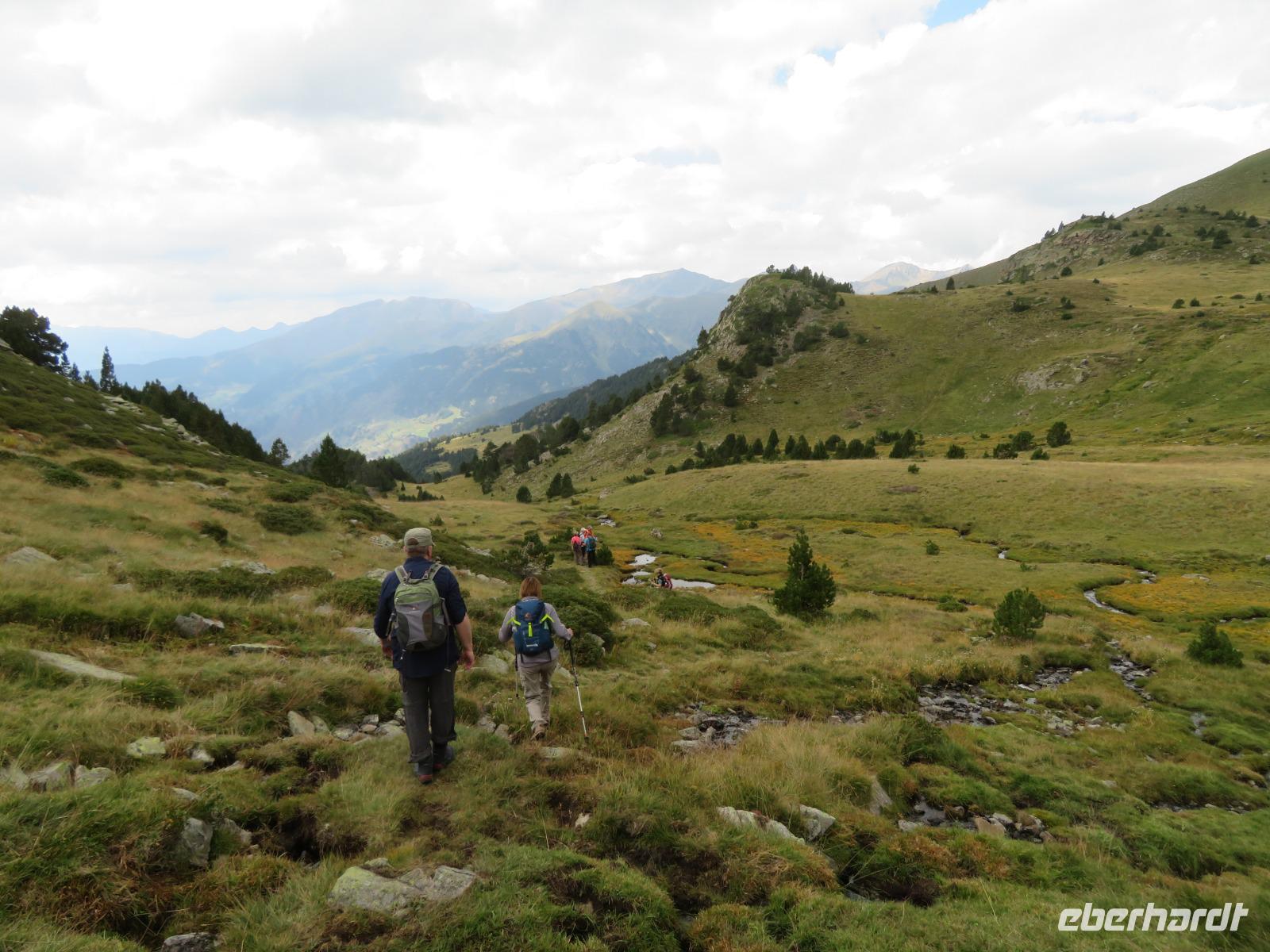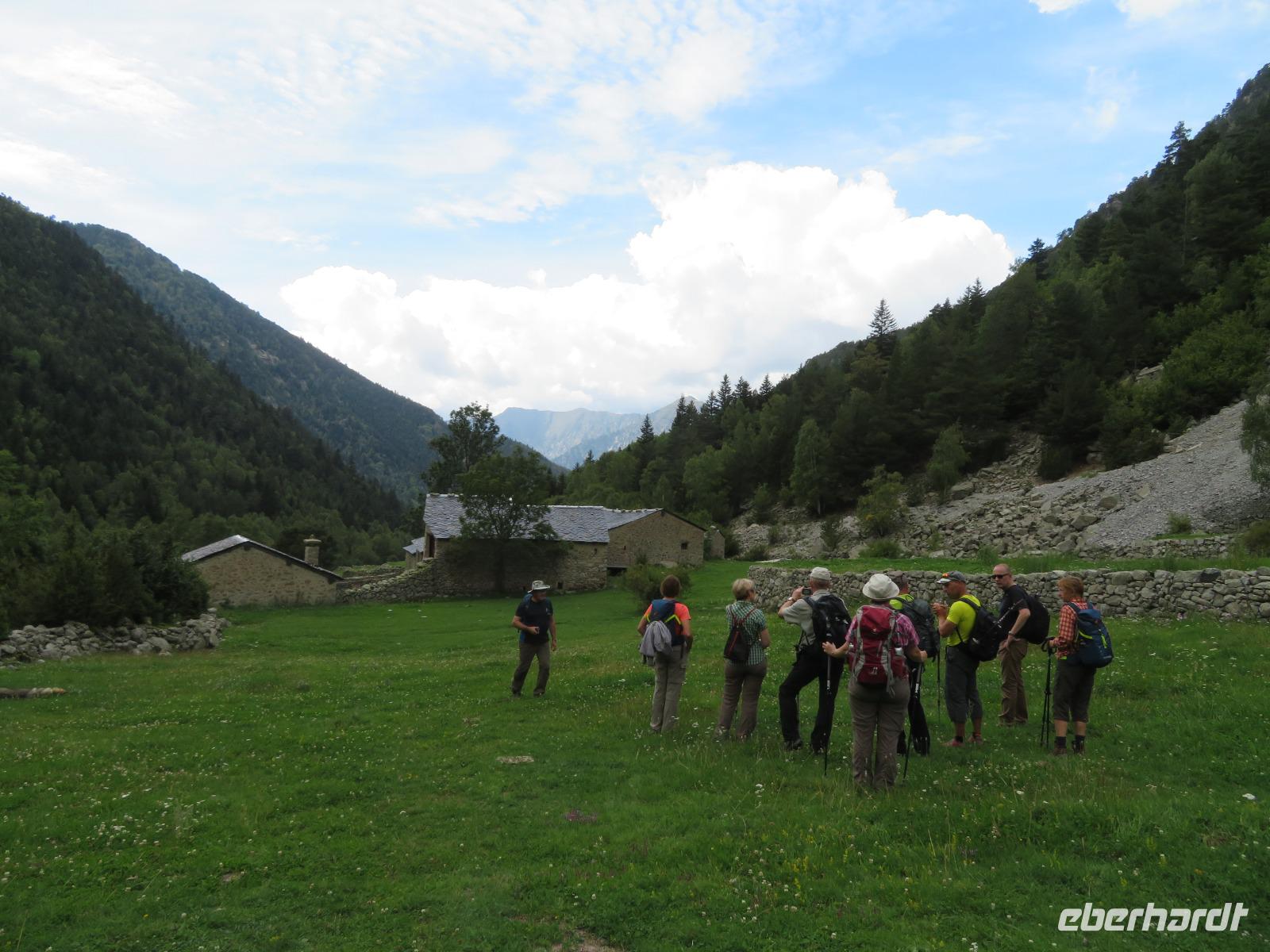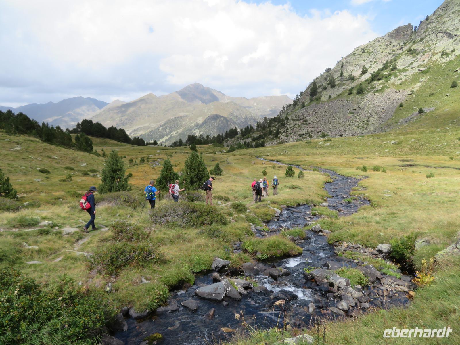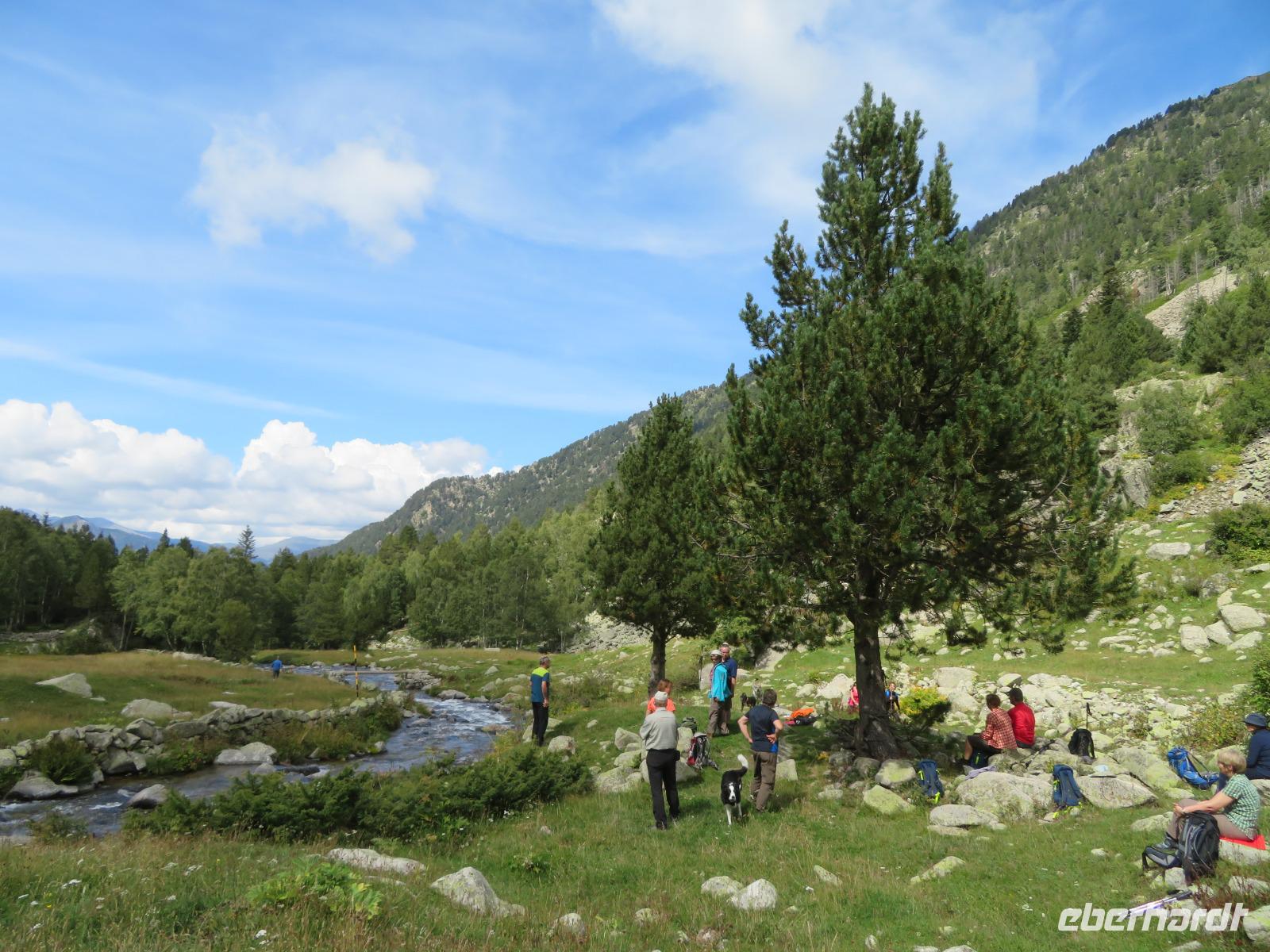 Unsere erste Wanderung führt uns ins Gletschertal Vall del Madriu. Als UNESCO-Welterbe ist das imposante Tal weitestgehend naturbelassen. Nach einem ersten Anstieg zum Coll Jovell wandern wir auf einem Höhenweg hinein ins Tal durch dichten Kiefernwald und über riesige Geröllfelder. Bei der Schutzhütte am Bach genießen wir die herrliche Bergwelt und unser Picknick. Am Fluss entlang wandern wir zu einer alten Siedlung in typischer Bauweise mit Granit und Schiefer-Dächern. Mit Land- und Weidewirtschaft sowie Eisengewinnung verdiente man sich einst seinen Unterhalt und lebte bescheiden im Einklang mit der Natur. Der Wanderauftakt ist gelungen und so kehren wir abschließend zufrieden auf ein Bierchen ein.