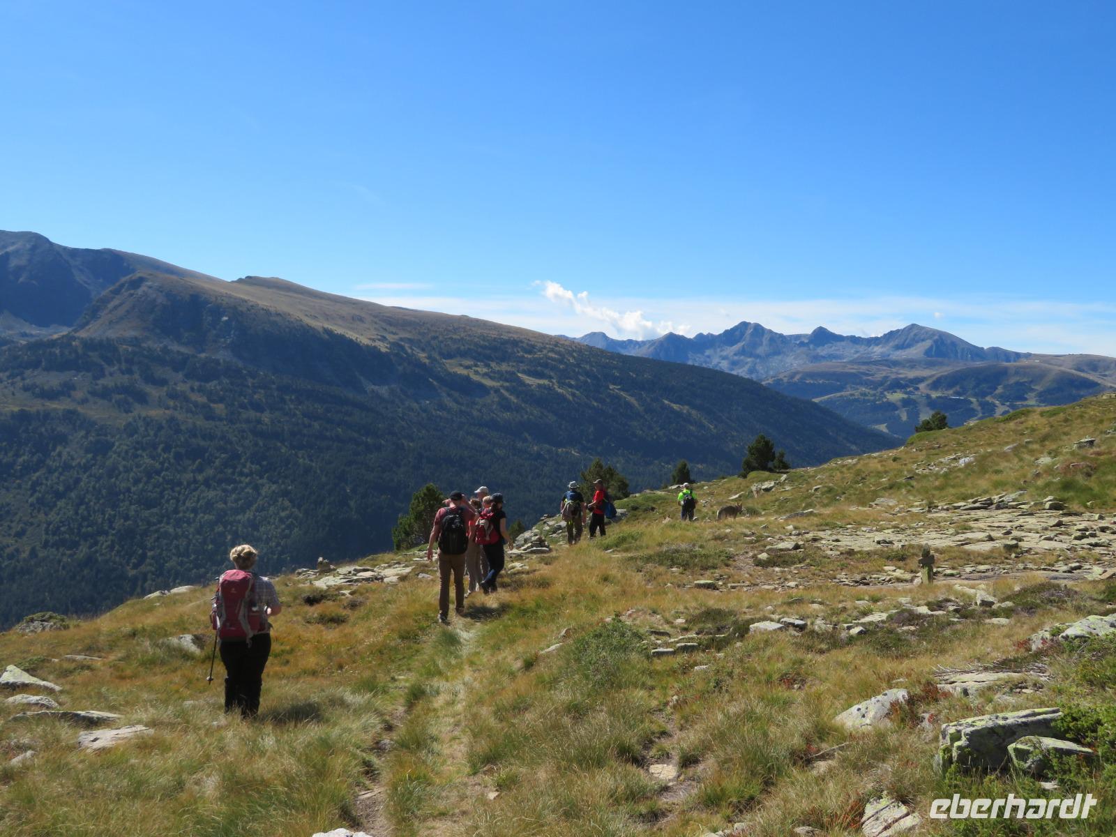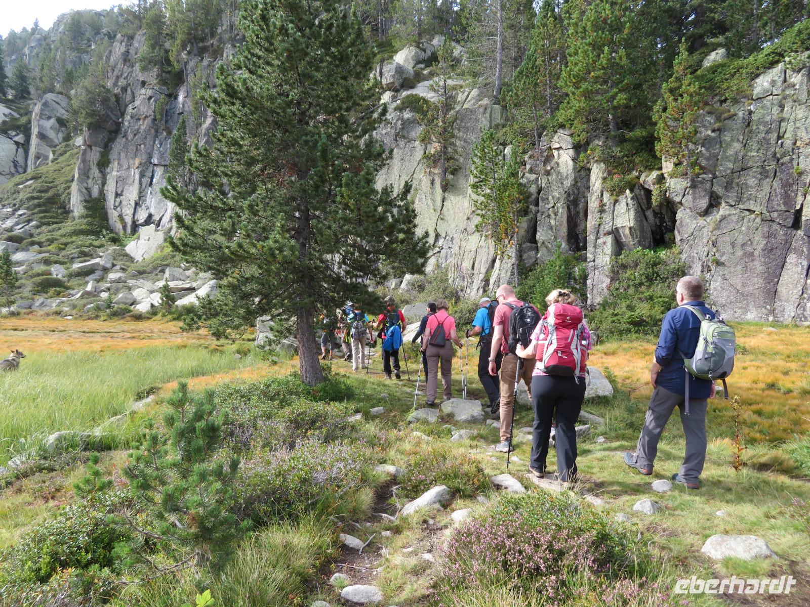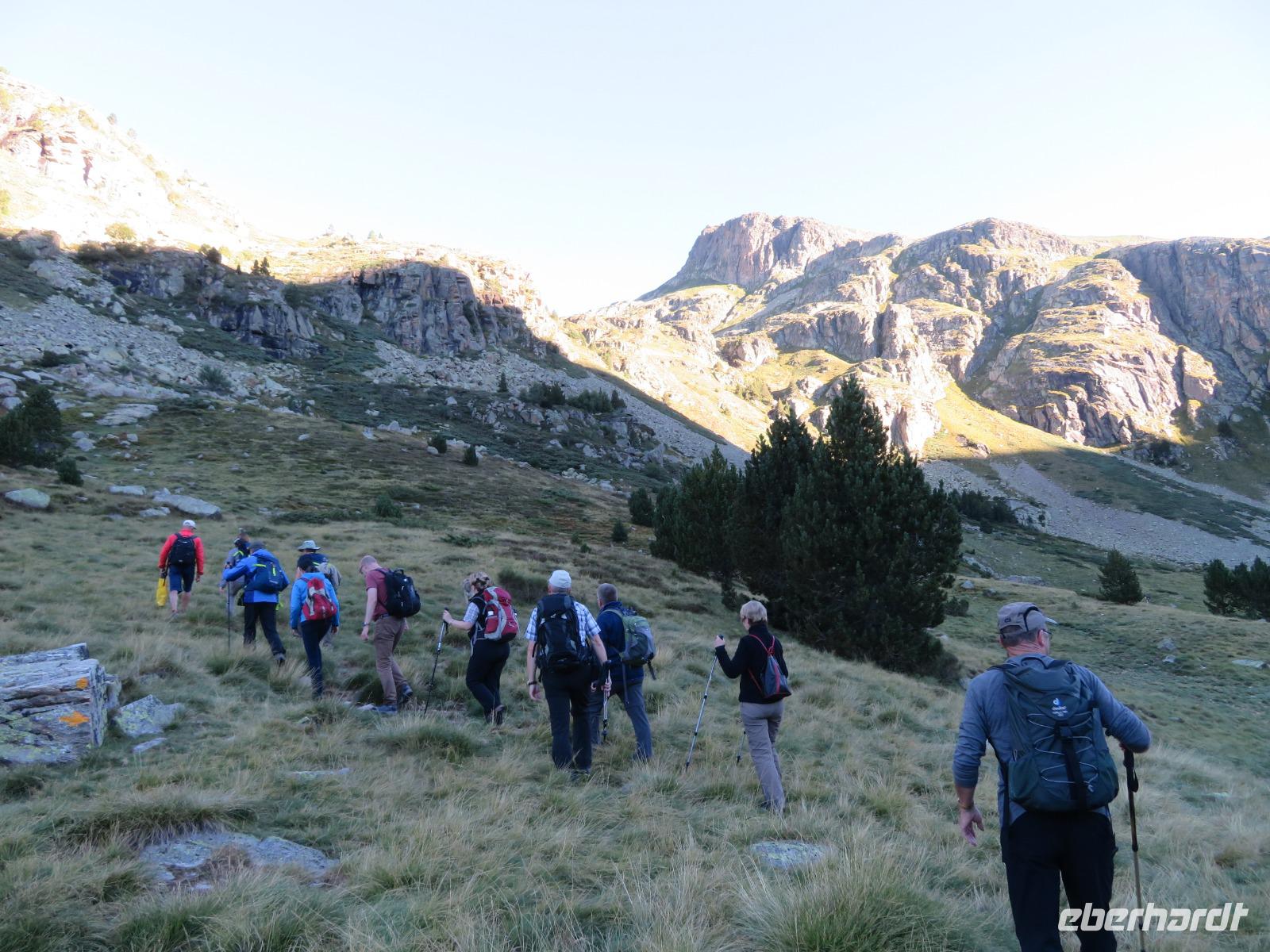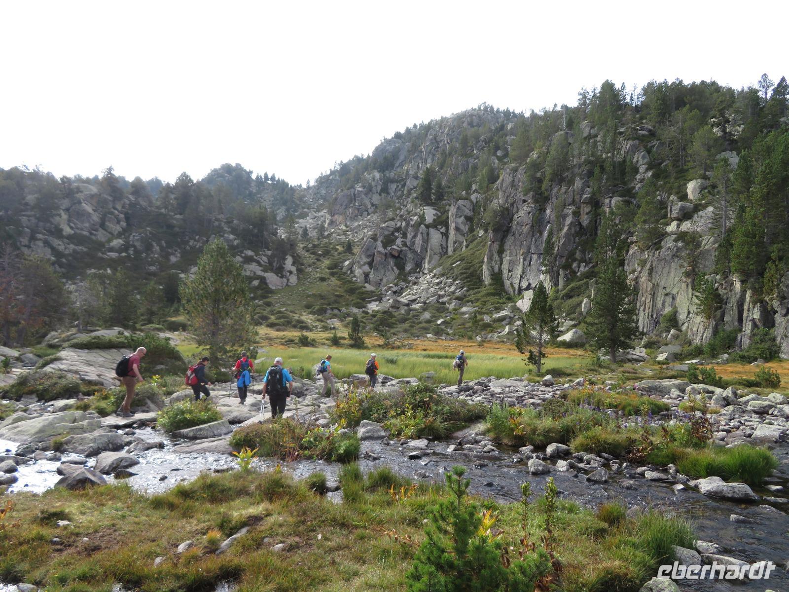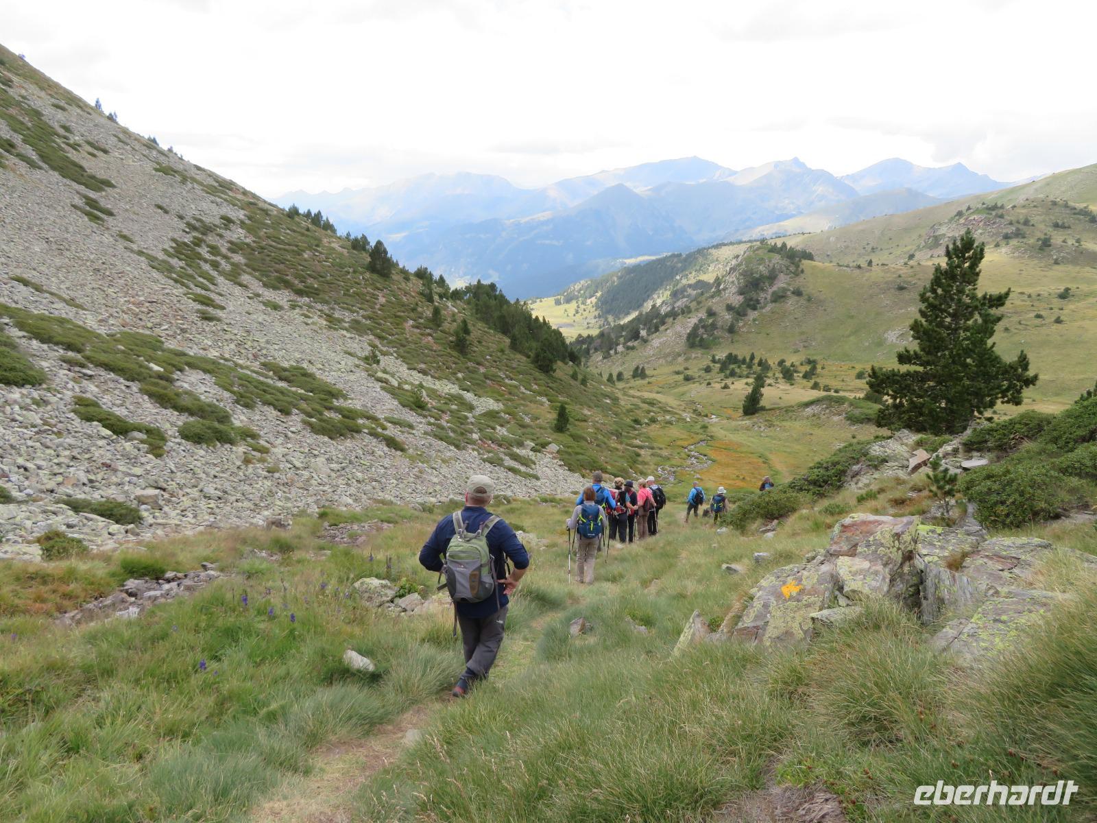 Unsere erste Wanderung führt uns ins Gletschertal Vall del Madriu. Als UNESCO-Welterbe ist das imposante Tal weitestgehend naturbelassen. Nach einem ersten Anstieg zum Coll Jovell wandern wir auf einem Höhenweg hinein ins Tal durch dichten Kiefernwald und über riesige Geröllfelder. Bei der Schutzhütte am Bach genießen wir die herrliche Bergwelt und unser Picknick. Am Fluss entlang wandern wir zu einer alten Siedlung in typischer Bauweise mit Granit und Schiefer-Dächern. Mit Land- und Weidewirtschaft sowie Eisengewinnung verdiente man sich einst seinen Unterhalt und lebte bescheiden im Einklang mit der Natur. Der Wanderauftakt ist gelungen und so kehren wir abschließend zufrieden auf ein Bierchen ein.