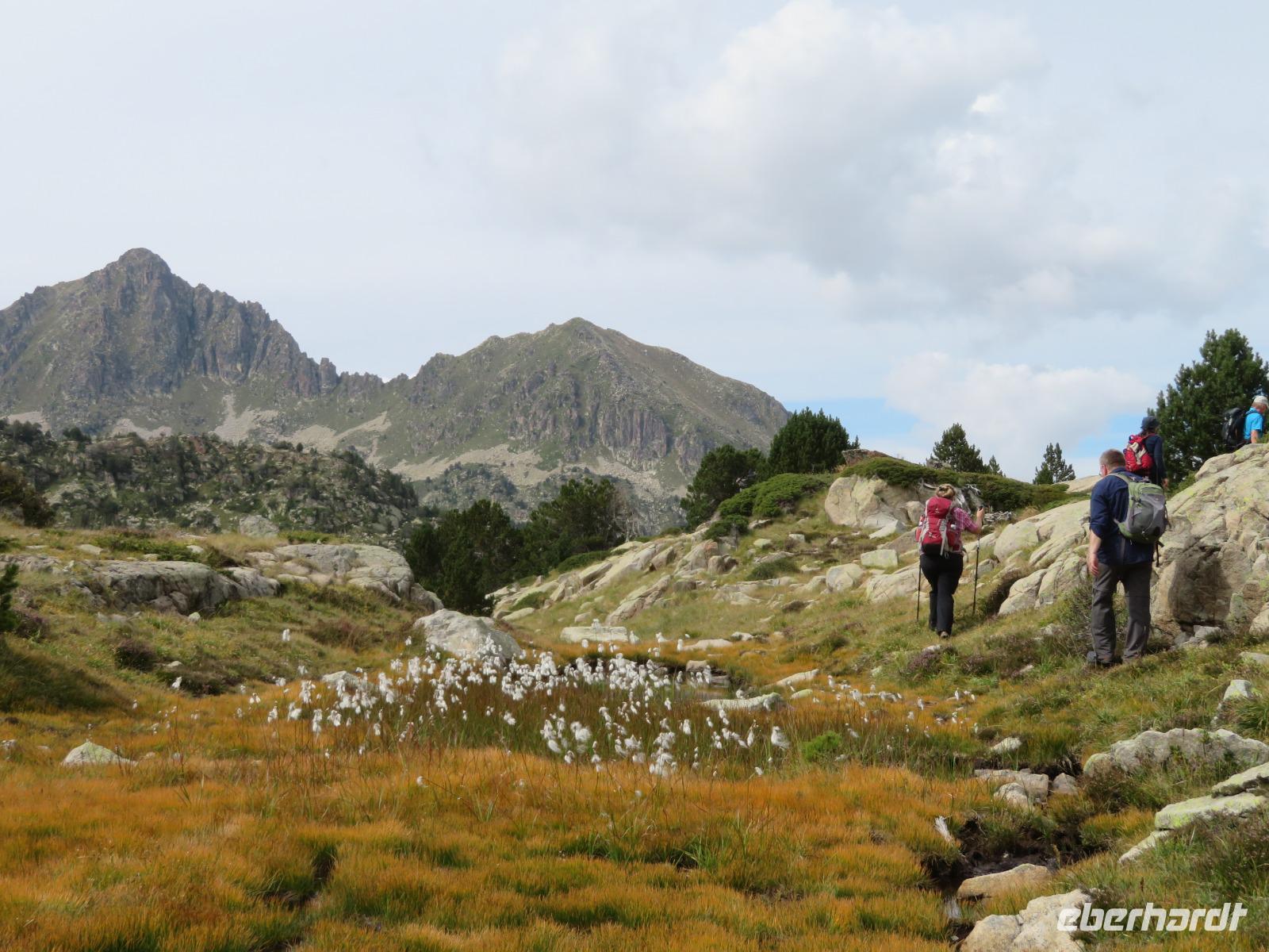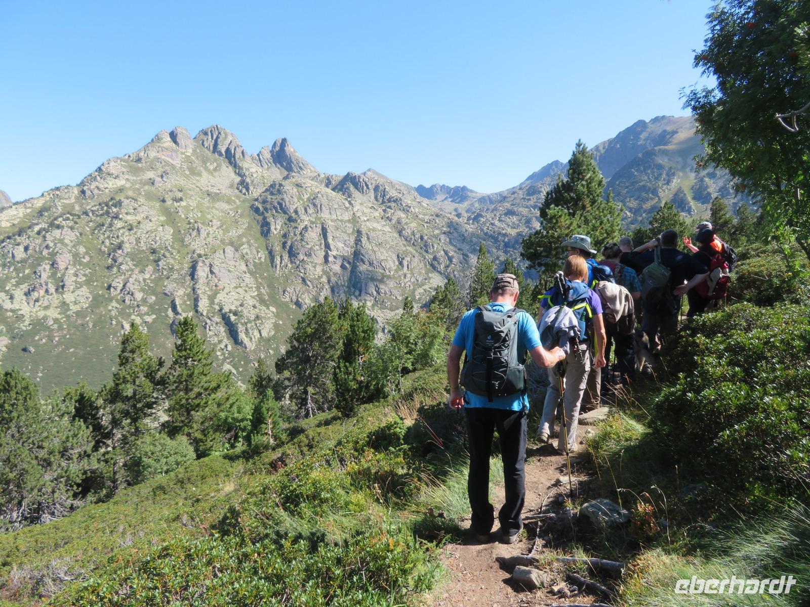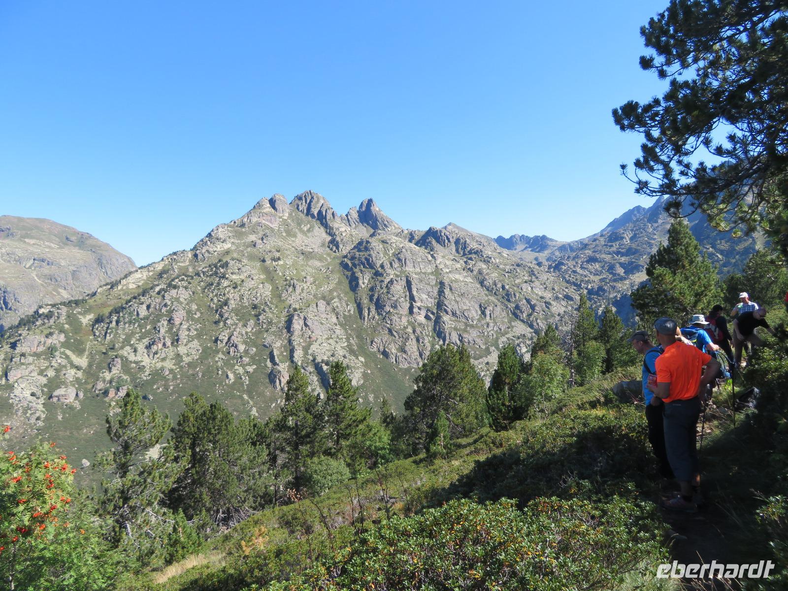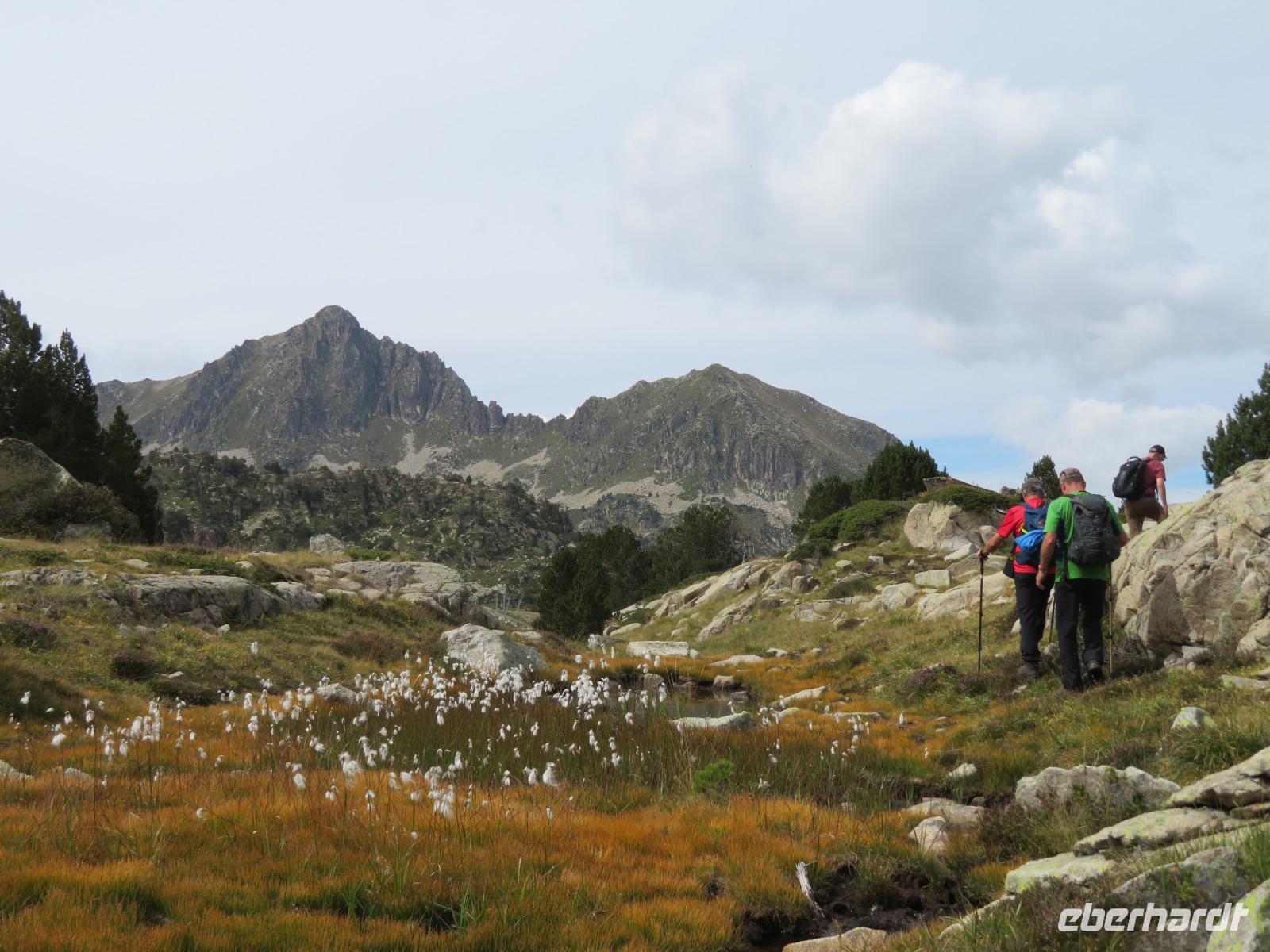 Unsere erste Wanderung führt uns ins Gletschertal Vall del Madriu. Als UNESCO-Welterbe ist das imposante Tal weitestgehend naturbelassen. Nach einem ersten Anstieg zum Coll Jovell wandern wir auf einem Höhenweg hinein ins Tal durch dichten Kiefernwald und über riesige Geröllfelder. Bei der Schutzhütte am Bach genießen wir die herrliche Bergwelt und unser Picknick. Am Fluss entlang wandern wir zu einer alten Siedlung in typischer Bauweise mit Granit und Schiefer-Dächern. Mit Land- und Weidewirtschaft sowie Eisengewinnung verdiente man sich einst seinen Unterhalt und lebte bescheiden im Einklang mit der Natur. Der Wanderauftakt ist gelungen und so kehren wir abschließend zufrieden auf ein Bierchen ein.