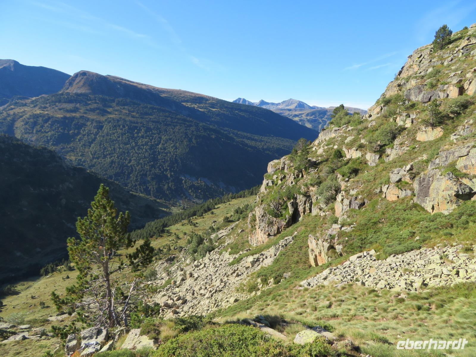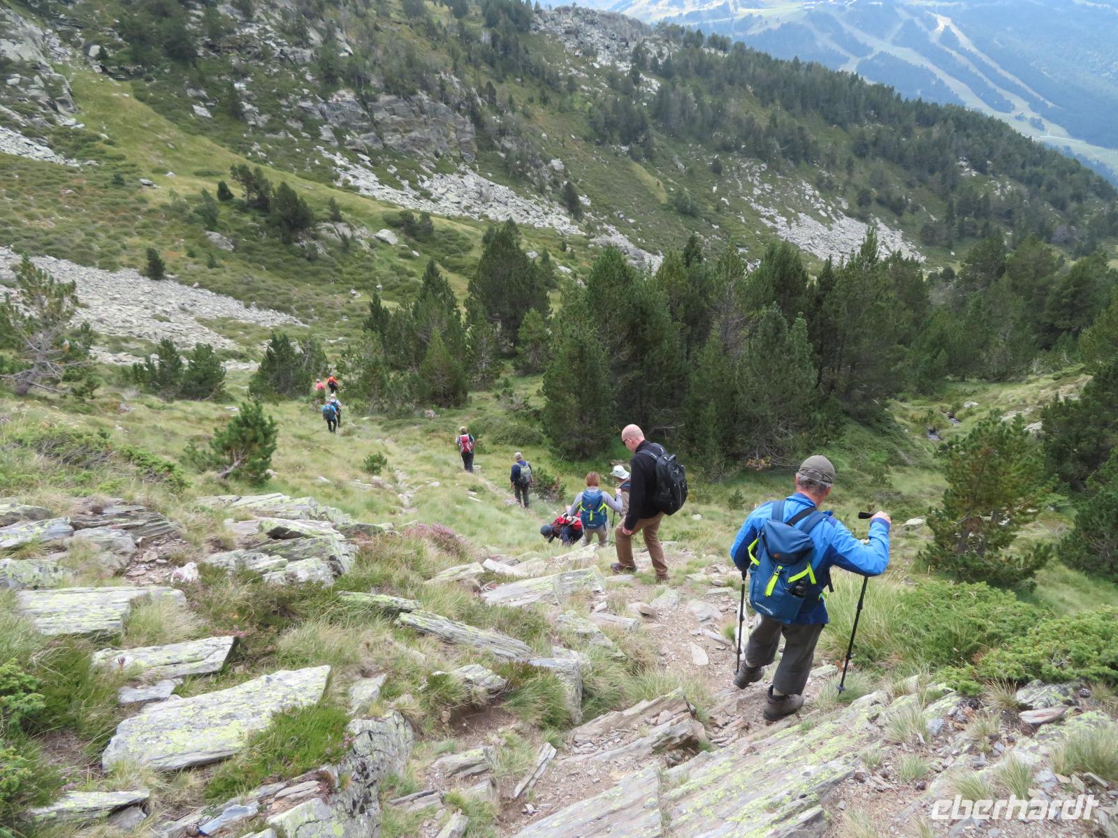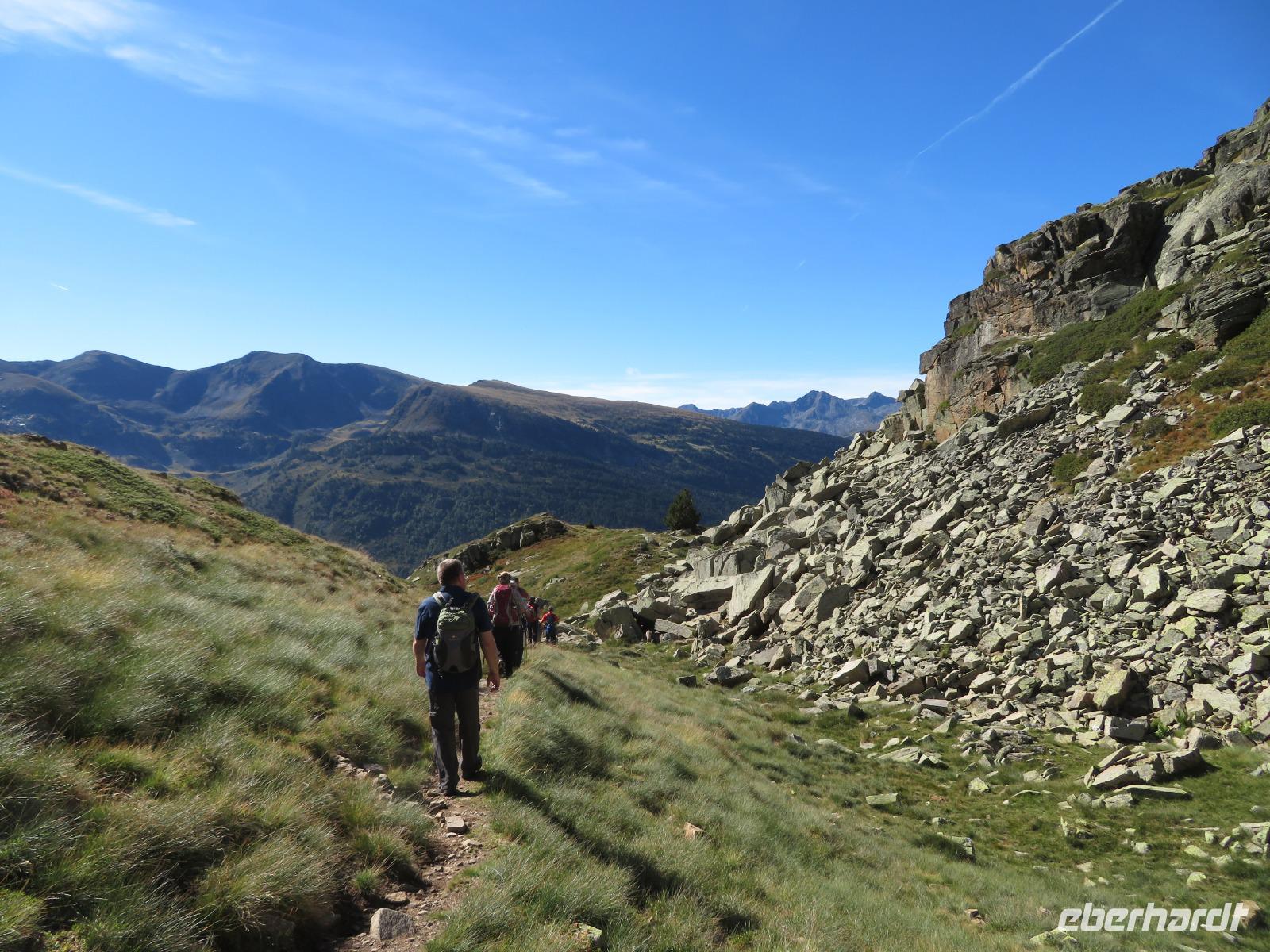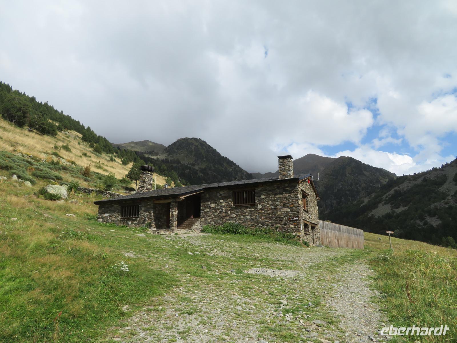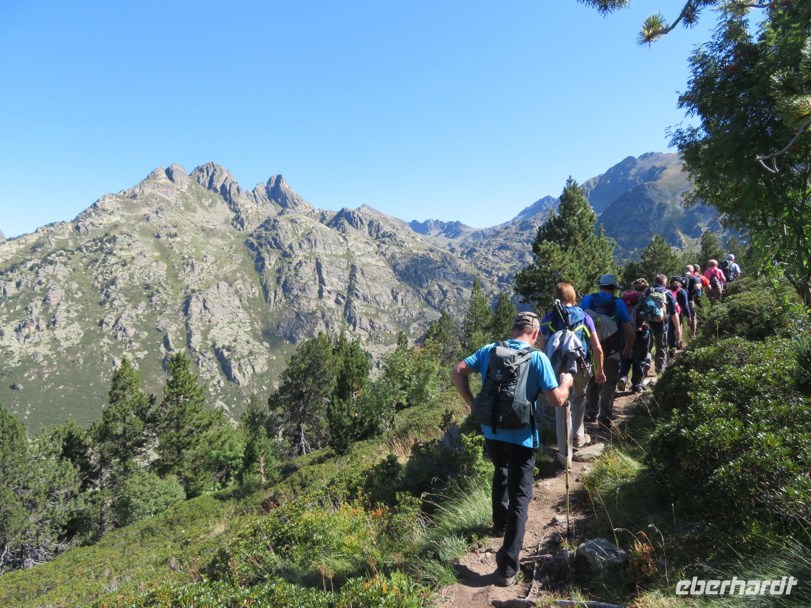 Unsere erste Wanderung führt uns ins Gletschertal Vall del Madriu. Als UNESCO-Welterbe ist das imposante Tal weitestgehend naturbelassen. Nach einem ersten Anstieg zum Coll Jovell wandern wir auf einem Höhenweg hinein ins Tal durch dichten Kiefernwald und über riesige Geröllfelder. Bei der Schutzhütte am Bach genießen wir die herrliche Bergwelt und unser Picknick. Am Fluss entlang wandern wir zu einer alten Siedlung in typischer Bauweise mit Granit und Schiefer-Dächern. Mit Land- und Weidewirtschaft sowie Eisengewinnung verdiente man sich einst seinen Unterhalt und lebte bescheiden im Einklang mit der Natur. Der Wanderauftakt ist gelungen und so kehren wir abschließend zufrieden auf ein Bierchen ein.
