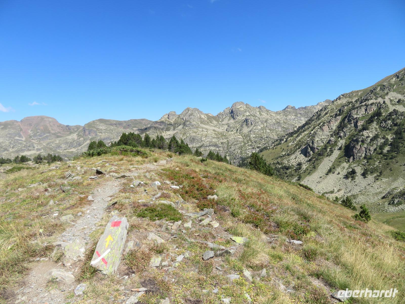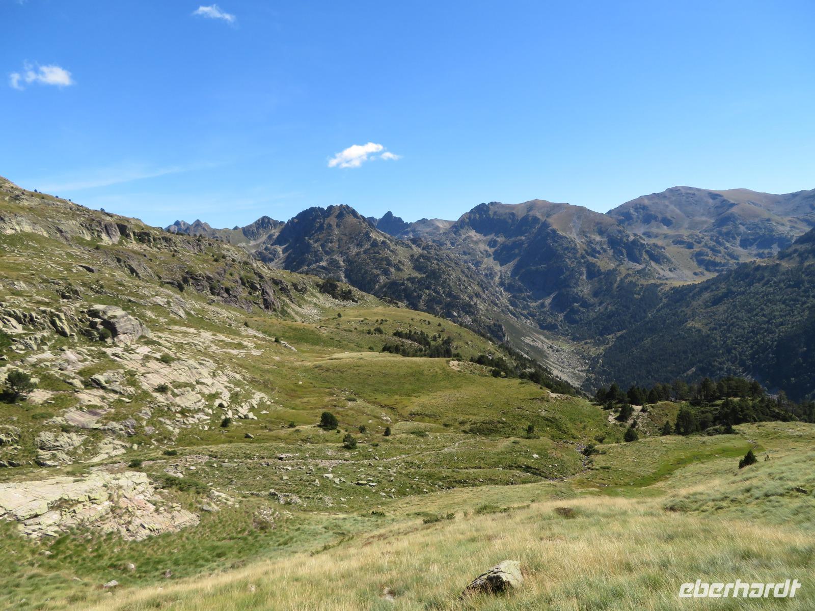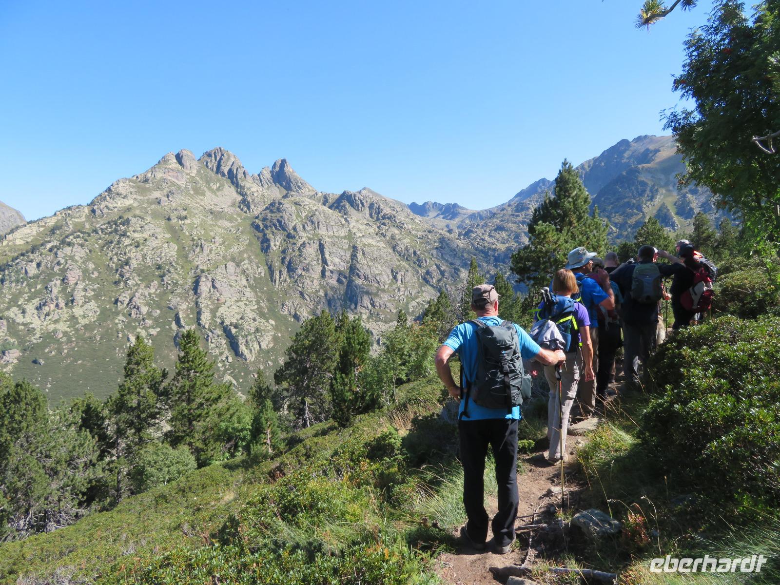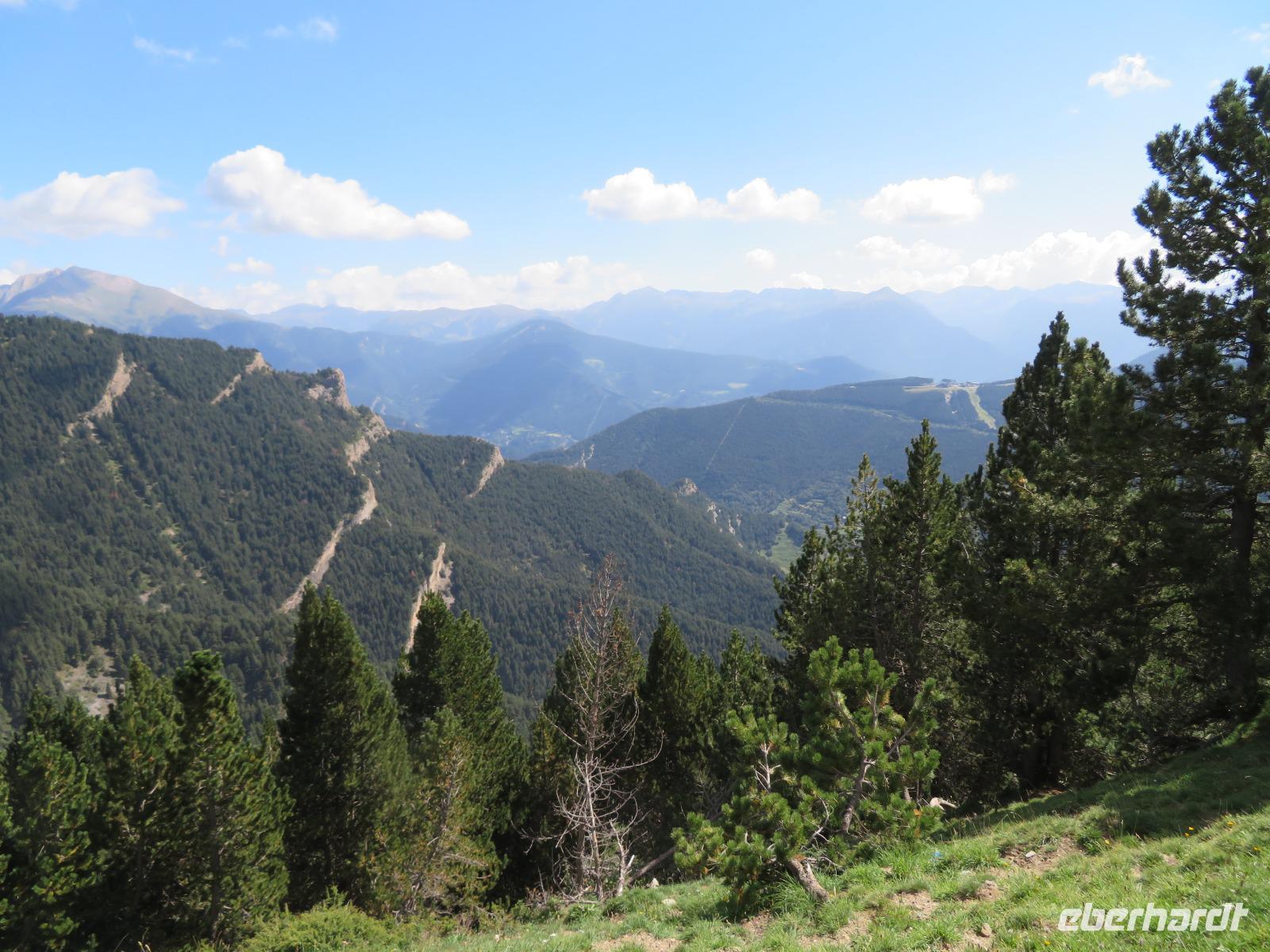 Unsere erste Wanderung führt uns ins Gletschertal Vall del Madriu. Als UNESCO-Welterbe ist das imposante Tal weitestgehend naturbelassen. Nach einem ersten Anstieg zum Coll Jovell wandern wir auf einem Höhenweg hinein ins Tal durch dichten Kiefernwald und über riesige Geröllfelder. Bei der Schutzhütte am Bach genießen wir die herrliche Bergwelt und unser Picknick. Am Fluss entlang wandern wir zu einer alten Siedlung in typischer Bauweise mit Granit und Schiefer-Dächern. Mit Land- und Weidewirtschaft sowie Eisengewinnung verdiente man sich einst seinen Unterhalt und lebte bescheiden im Einklang mit der Natur. Der Wanderauftakt ist gelungen und so kehren wir abschließend zufrieden auf ein Bierchen ein.