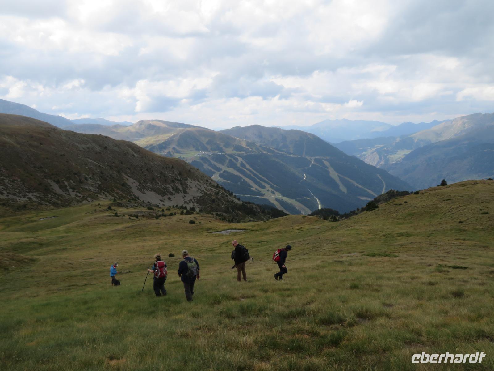 Vom Himmel lacht die Sonne bereits am Morgen und wir wollen den schönen Tag natürlich aktiv nutzen. Direkt von unserem Hotel wandern wir los ins Tal von Incles. Der Wanderweg führt zunächst durch ein Waldstück, wo wir eifrig auf der Suche nach Pilzen sind. Die Tour entwickelt sich zu einer echten Pilzwanderung! Sobald wir die Baumgrenzen erreicht haben, bieten sich uns großartige Ausblicke auf die umliegenden Berge. Nur ein paar Kühe und vereinzelt einige Wanderer kreuzen unseren Weg hinauf zum Bergsee. Vor dieser fantastischen Kulisse genießen wir unser Picknick und sammeln nochmal Kräfte für den steilen Aufstieg zum Kamm Port Dret. Der Mühe Lohn sind herrliche Panoramen auf die gewaltige Bergwelt der Pyrenäen. Auf unserer Tour machen wir auch Bekanntschaft mit Andorras Fauna: die Murmeltiere bekommen wir nur zu Gehör, aber Ziegen und Gämse bekommen wir auch zu Gesicht. Unsere tierische Begleitung Selene sprintet den Gämsen hinterher, aber kehrt dann wieder brav zu Herrchen zurück. Vom Kamm geht es schließlich nur noch bergab - über Wiesen und entlang eines kleinen Baches wieder hinein in den Wald, wo wir nochmal die Augen offen halten nach Pilzen. Am Ende des Tages haben wir drei volle Tüten mit Steinpilzen im Gepäck. Mit gut 700 Höhenmetern Auf- und Abstieg haben wir uns das Zielbier mehr als verdient. Prost! Und das Abendessen schmeckt ebenfalls nochmal besser.
