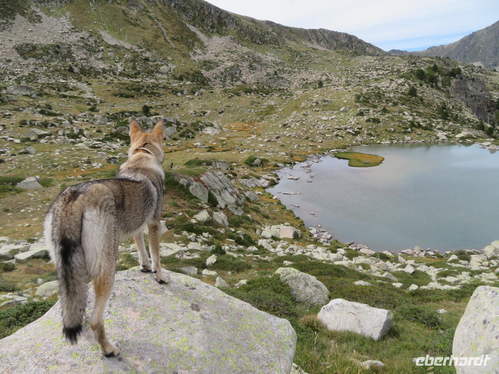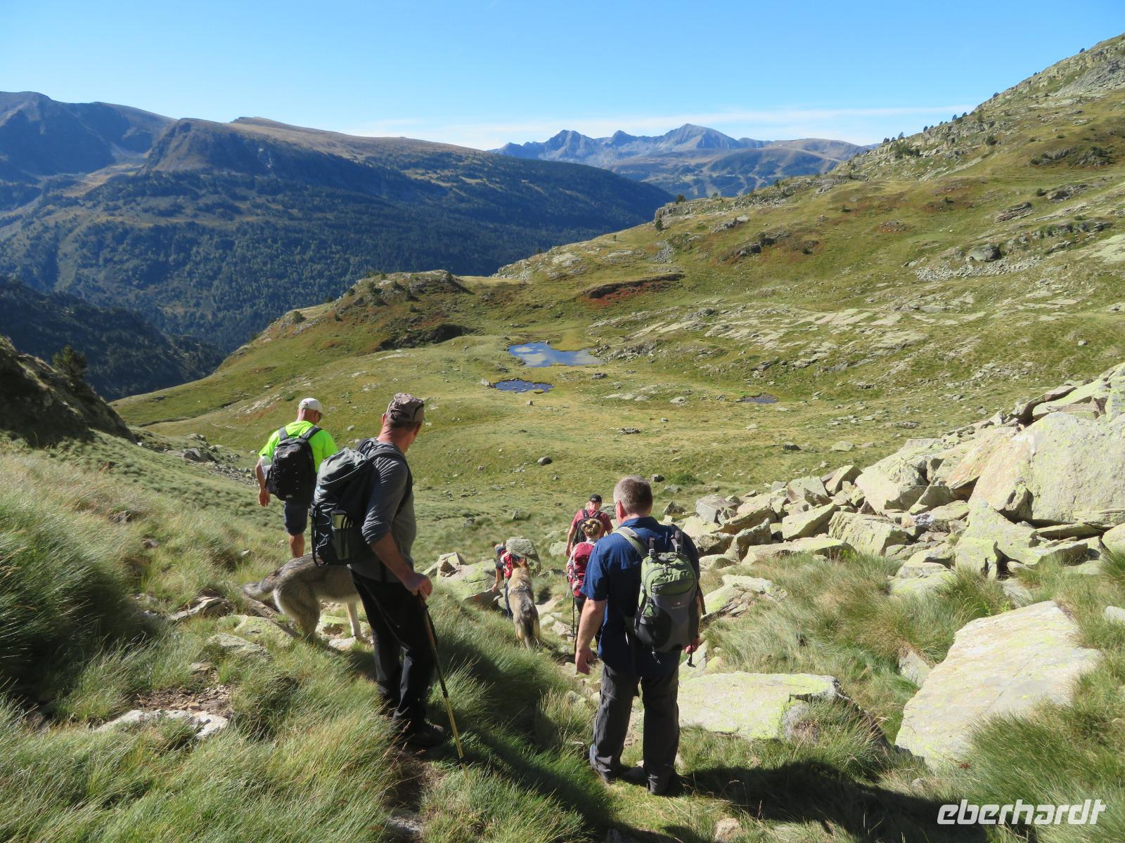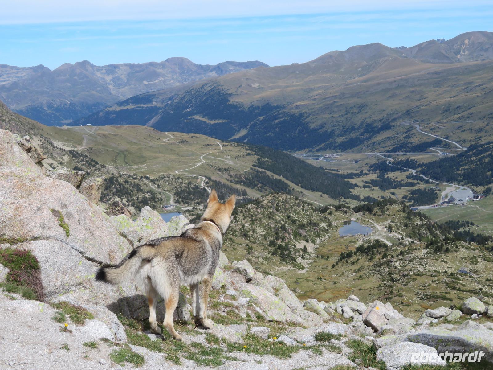 An unserem letzten Wandertag werden wir nochmal zu Gipfelstürmern! Im Winter ist Grau Roig ein Eldorado für Skifahrer und für uns ist es heute ein herrliches Wandergebiet. Noch einmal begleiten uns Selene und Nuuk und bereiten uns viel Freude, wenn sie miteinander rumtoben. Als Marco uns zu Beginn den Gipfel in der Ferne zeigt, können wir noch nicht glauben, dass wir später dort oben stehen werden. Über Stock und Stein arbeiten wir uns Stück für Stück hinauf bis uns schließlich die Bergwelt der Pyrenäen zu Füßen liegt. Wir haben es auf den Montmalús auf 2.781 Meter geschafft und können ganz stolz sein. Oben gibt es ein Picknick mit Höhenluft und viele Gipfelfotos. Aber das soll es natürlich noch nicht gewesen sein - wir müssen auch wieder runter. Und hinab geht es durch eine wilde Hochgebirgslandschaft, über Wiesen und vorbei an mehreren Seen bis wir schließlich den Ausgangspunkt an der Talstation erreichen. Es war eine wunderbare Abschlusstour, die herausfordernd, aber auch ganz besonders aussichtsreich war. In unserer "Stammkneipe" verabschieden wir uns von unserem Wanderführer Marco, der uns mit ausgesprochen viel Freude und Wissen durch die Berge Andorras geleitet hat. Vielen Dank für die tollen Wanderausflüge! Und heute sind sogar unsere beiden tierischen Begleiter müde.