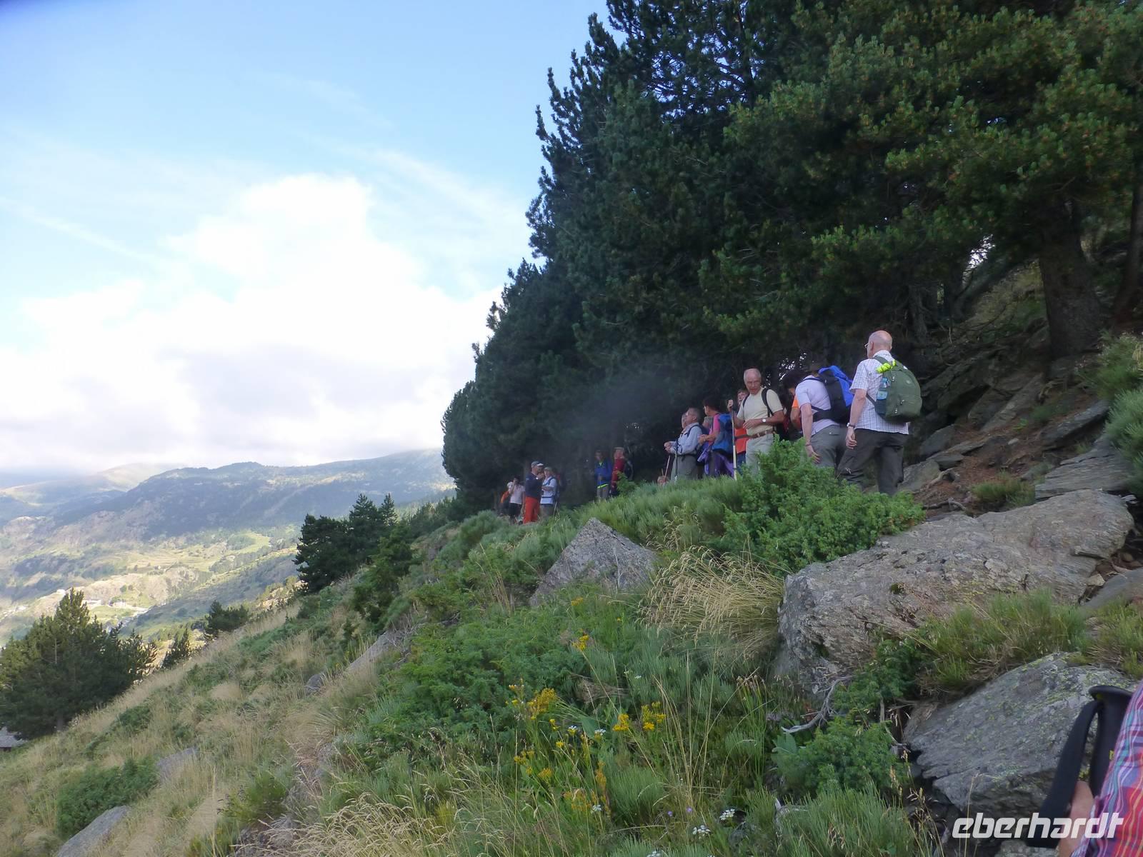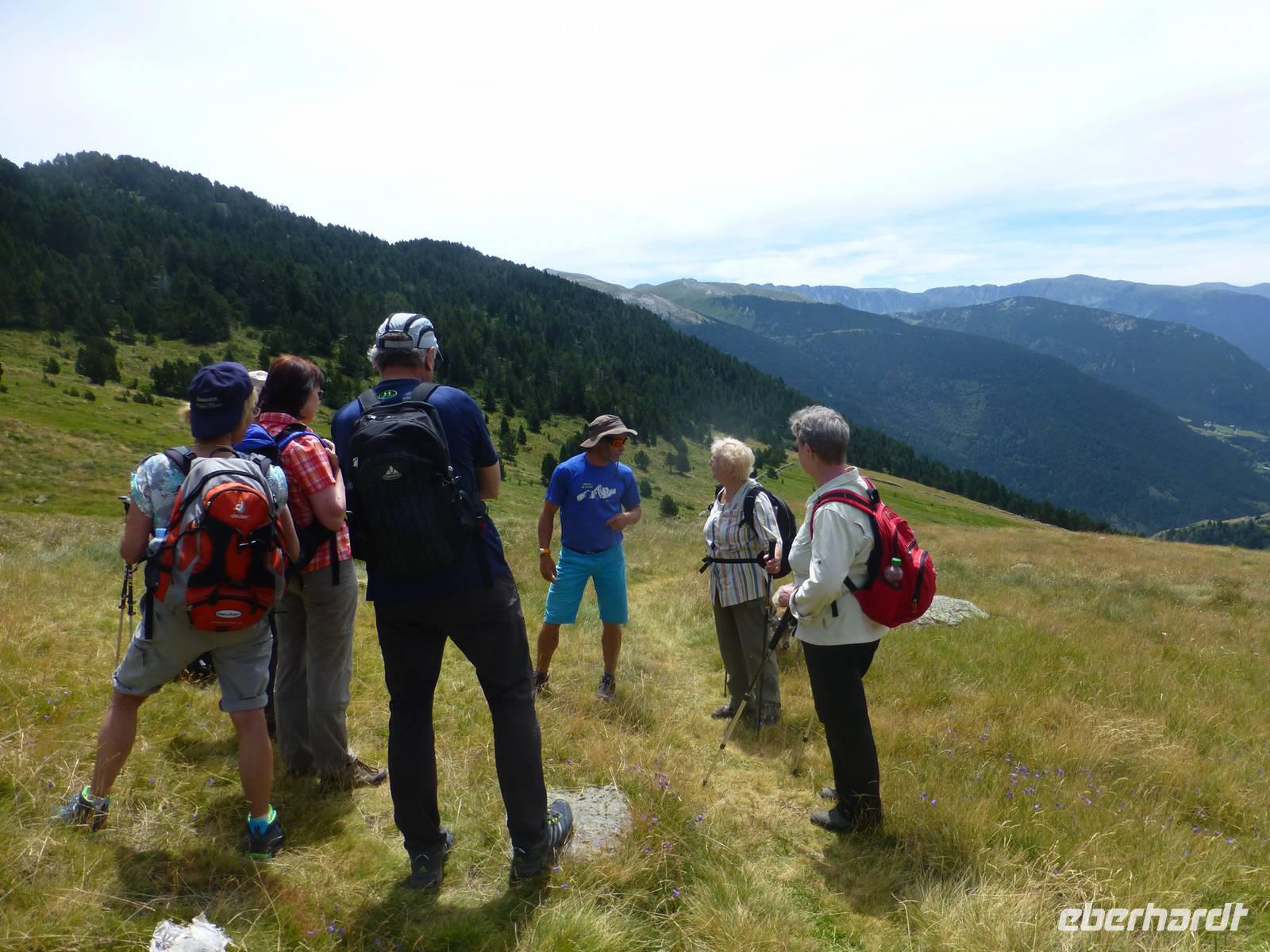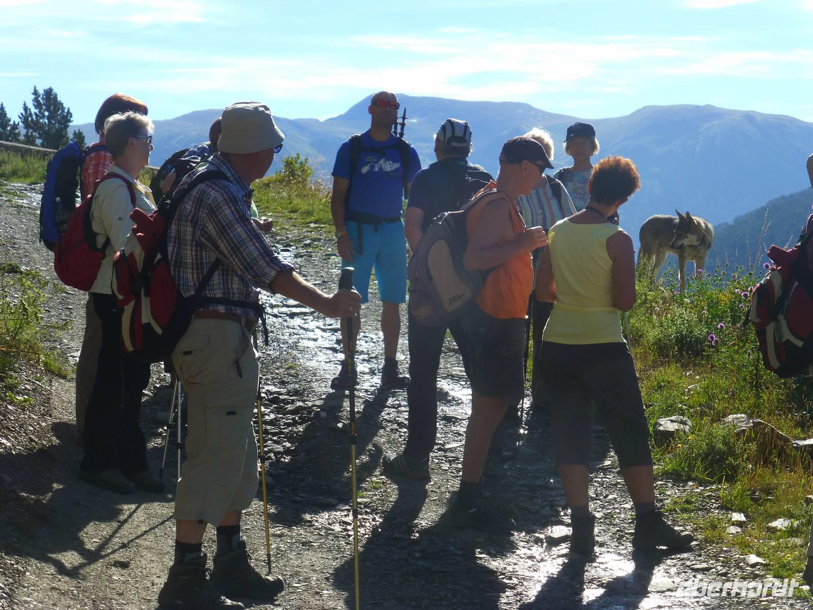 Die Intensiv-Wanderer hatten heute einen wanderfreien Tag und erlebten die Fahrt nach Ordino, Pal und Andorra La Vella. Nach dem Frühstück fuhren wir mit Marco und seinem Hund Nuc ein Stück nach Canillo. Die Wanderung begann gemütlich bei schönstem Sommerwetter und führte entlang des kleinen Flüsschens und über Blumenwiesen stetig bergauf. An einer alten Übernachtungshütte machten wir Mittagsrast und ein erstes Gruppenfoto. Die Ausblicke in die Berge und Täler waren beeindruckend. Nach der Pause stiegen wir gemütlich wieder ins Tal hinab, immer das grandiose Panorama vor Augen. Unterwegs begegneten uns auch immer wieder Tabakfelder, manche winzig klein und jeden Fleck ausnutzend. Im kleinen Ort Els Plans auf 1835 m Höhe erwartete uns bereits wieder der Bus zur Rückfahrt. Zurück im Hotel blieb noch genügend freie Zeit für Schwimmbad, Gondelfahrt oder einfach zum Erholen, bevor uns das Abendessen wieder rief.