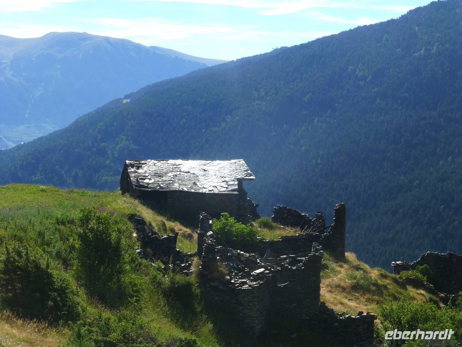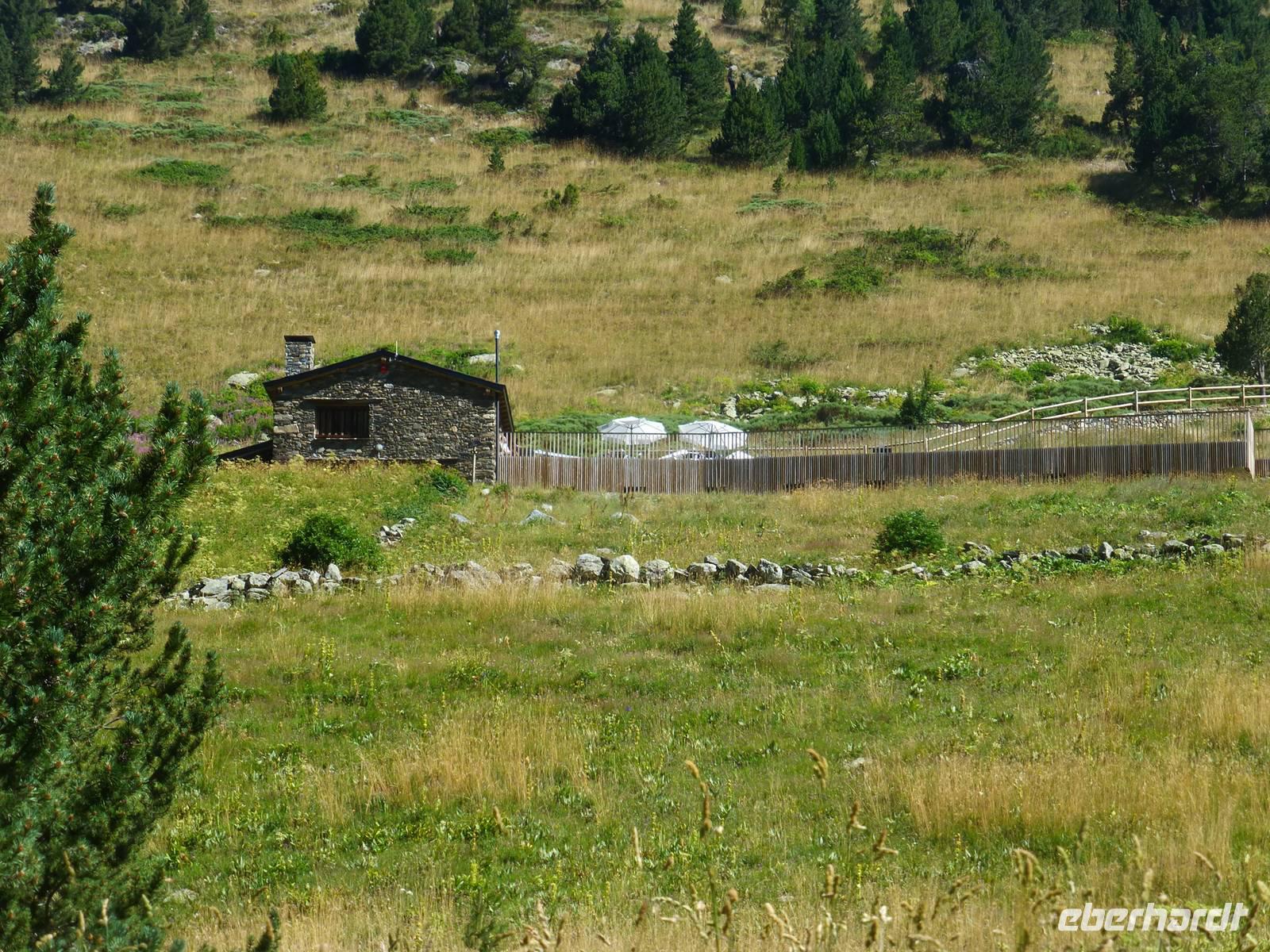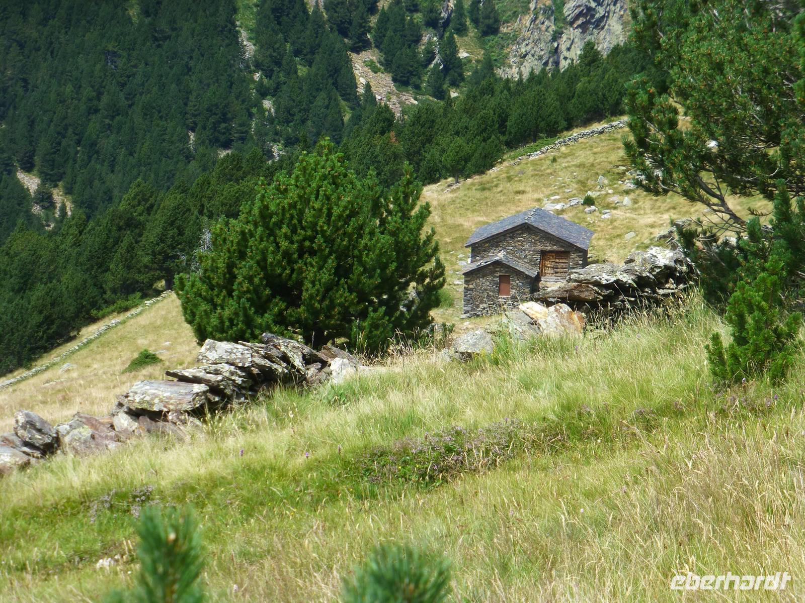 Die Intensiv-Wanderer hatten heute einen wanderfreien Tag und erlebten die Fahrt nach Ordino, Pal und Andorra La Vella. Nach dem Frühstück fuhren wir mit Marco und seinem Hund Nuc ein Stück nach Canillo. Die Wanderung begann gemütlich bei schönstem Sommerwetter und führte entlang des kleinen Flüsschens und über Blumenwiesen stetig bergauf. An einer alten Übernachtungshütte machten wir Mittagsrast und ein erstes Gruppenfoto. Die Ausblicke in die Berge und Täler waren beeindruckend. Nach der Pause stiegen wir gemütlich wieder ins Tal hinab, immer das grandiose Panorama vor Augen. Unterwegs begegneten uns auch immer wieder Tabakfelder, manche winzig klein und jeden Fleck ausnutzend. Im kleinen Ort Els Plans auf 1835 m Höhe erwartete uns bereits wieder der Bus zur Rückfahrt. Zurück im Hotel blieb noch genügend freie Zeit für Schwimmbad, Gondelfahrt oder einfach zum Erholen, bevor uns das Abendessen wieder rief.