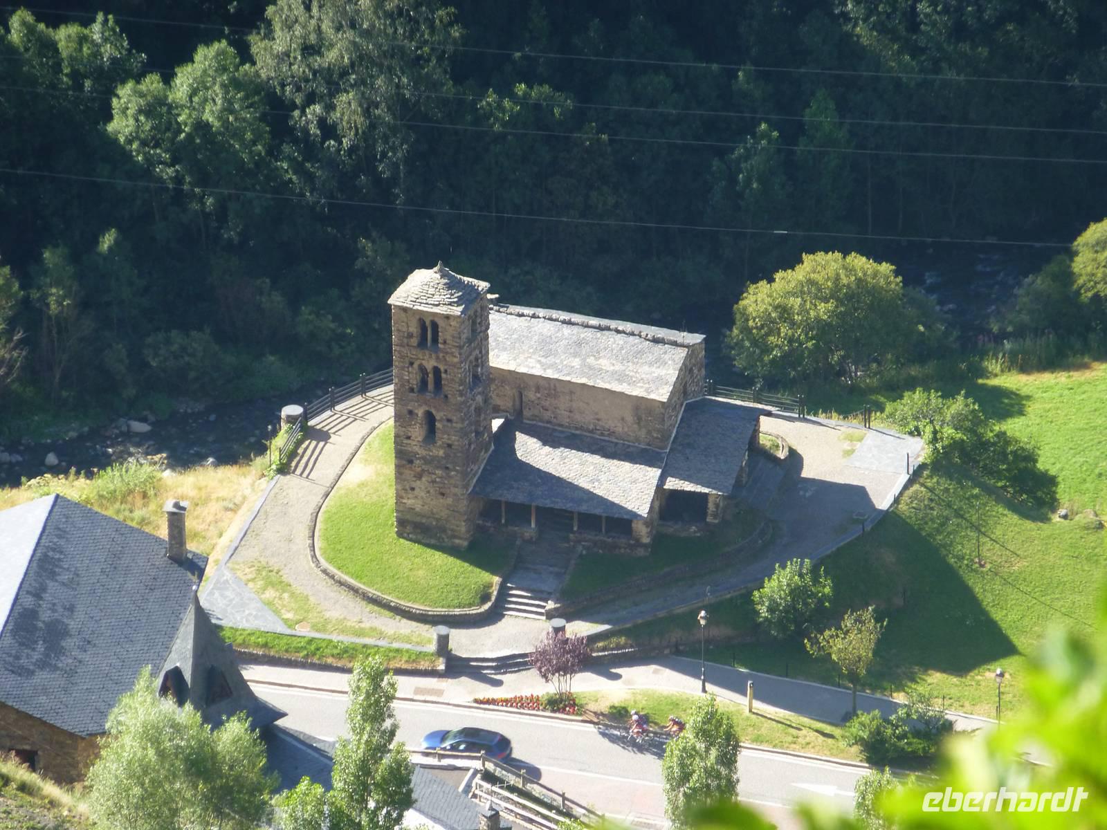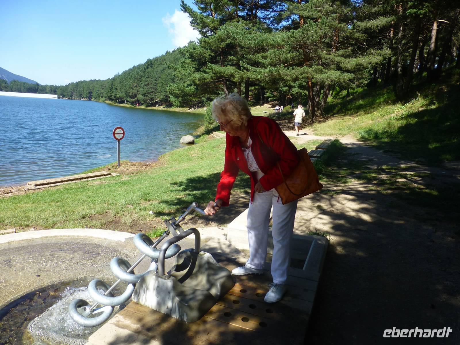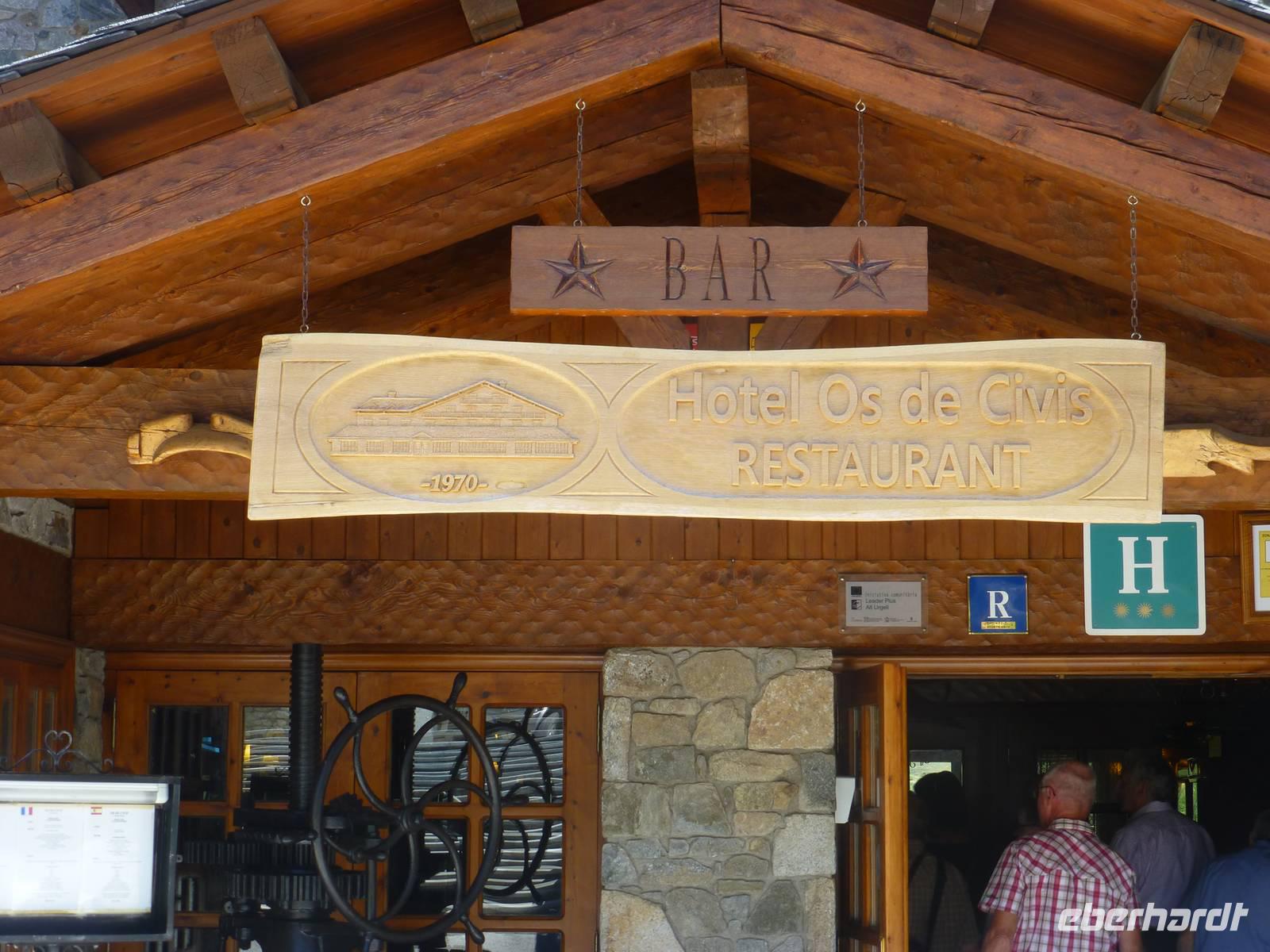 Während es für die Intensiv-Wanderer mit Marco heute nach Ransol ging, starteten wir mit Helga und Vincent pünktlich am Hotel. Wir fuhren zur Kirche Mertixell, welche nach einem Brand in den siebziger Jahren ganz modern und in die Natur eingepasst, wieder aufgebaut wurde. Sie hat den höchsten Glockenturm (35 m) Andorras und liegt 1535 m hoch. Gleichzeitig befindet sich hier der Mittelpunkt des Landes. Mertixell bedeutet Mittagssonne. Weiter ging die Fahrt mit Halt an der alten romanischen Kirche Sant Miquel d´Engolasters bis zum See. Der größte Stausee wurde 1991 gebaut, einer der 56 andorranischen Bergseen wird hier angestaut. Nach einer kurzweiligen Seeumrundung ging es mit dem Bus bergab bis zur spanischen Grenze auf 900 m. Wir wollten in die spanische Enklave Os de Civic, welche 1600 m hoch liegt und 108 Einwohner hat. Der Ort ist nur über Spanien erreichbar. Hier gab es die Möglichkeit, typischen Käse, Wurst und Mitbringsel zu kaufen, danach ging es zum Mittagessen in ein andorranisch-spanisches Restaurant. Das Essen war sehr reichlich, 2 Vorspeisen, dann Suppe, Fleisch und Eis zum Nachtisch. Alles „gewürzt" mit Portwein, Sangria, viel Wein und Crema.