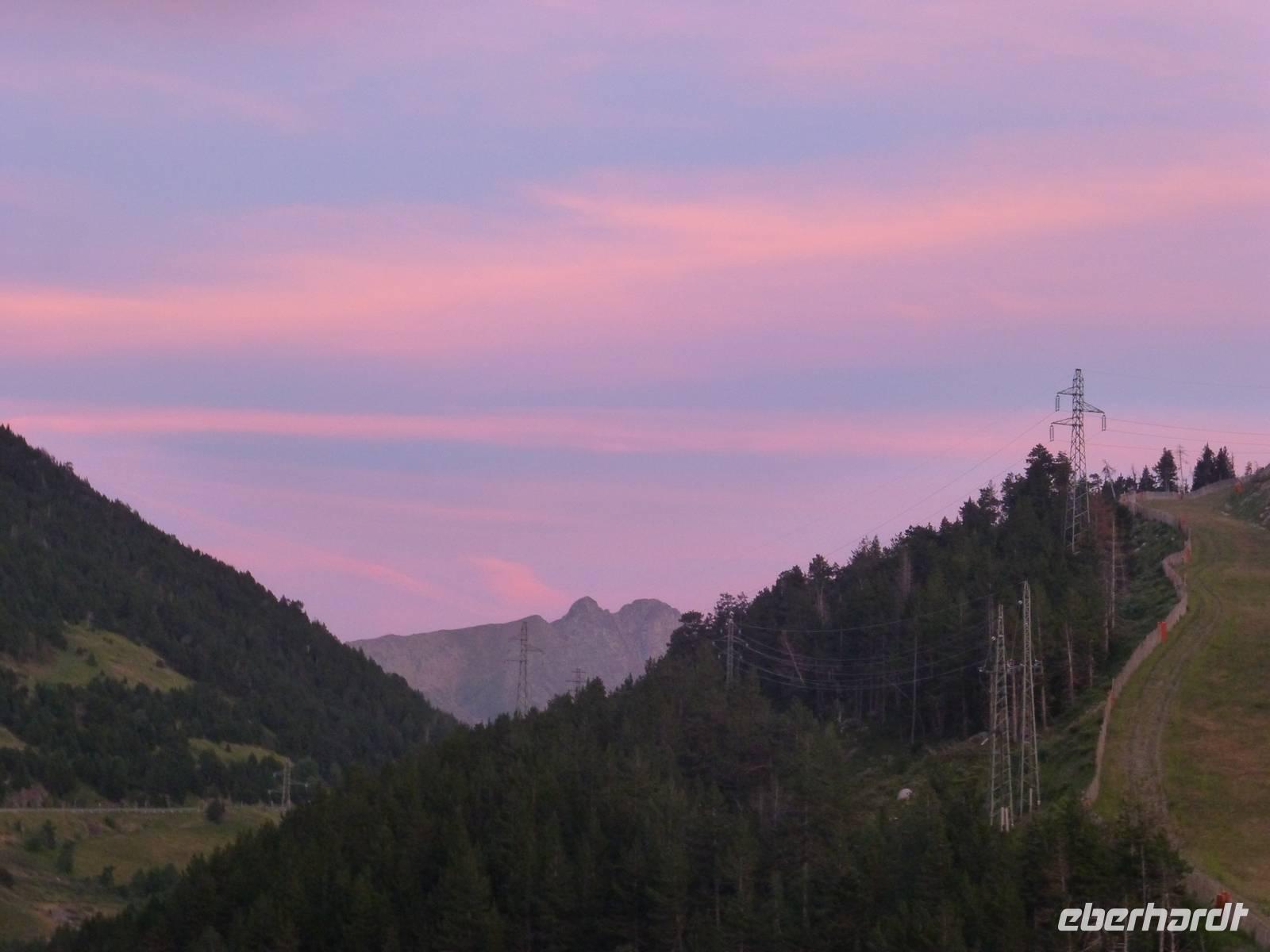 Die Dresdner Fluggäste trafen sich um 13 Uhr in der Abflughalle. Nach dem Einchecken und einem Snack an der Bistro-Bar ging der Flug nach Barcelona pünktlich los.Dort gelandet, warteten wir auf die restlichen Fluggäste. Leider war der Flug aus Berlin-Tegel etwas verspätetet, sodass wir uns mit unserem Wanderführer Marco erst um 20 Uhr treffen konnten. Die Reise nach Soldeu (bedeutet Sonnengott) begann. Nach ca. 1-stündiger Fahrt machten wir in La Puntanella eine Pause, bei der wir die Lunchpakete verspeisten und einen sehr schönen Sonnenuntergang erlebten. Bei der Weiterfahrt erzählte Marco so einiges über Land und Leute, wir bewunderten die Felsenformationen von Montserrat und erfuhren schon die wichtigsten Programmpunkte der nächsten Tage. Der Zwergstaat Andorra hat eine Fläche von 268 km², die größte Entfernung beträgt 40 km und um das Land zu Fuß zu erkunden, gibt es einen Hüttenweg, welcher in 8 Tagen erlaufen werden kann. Gemeinsam in der Gruppe waren auch die Gäste, welche die Reise Andorra - Intensiv gebucht hatten. Gegen Mitternacht kamen wir im 4-Sterne-Hotel „Sport Village" an und bezogen unsere Zimmer.