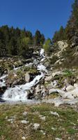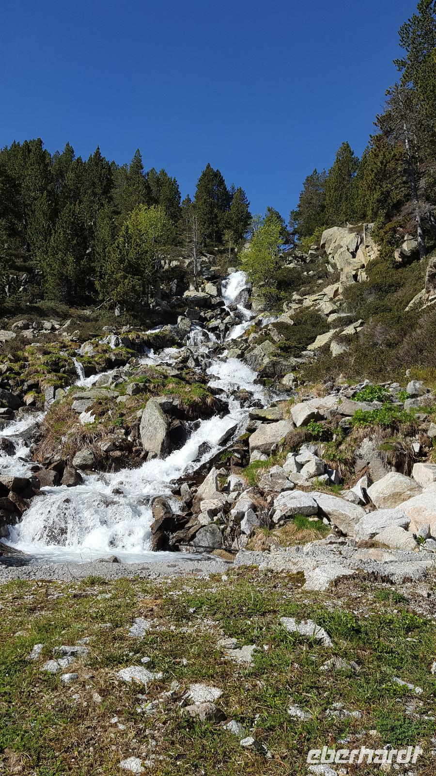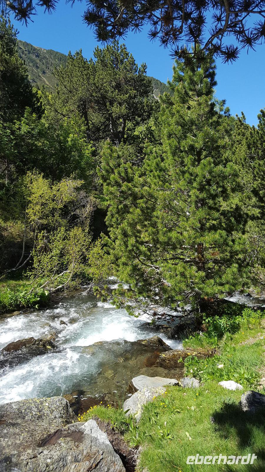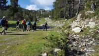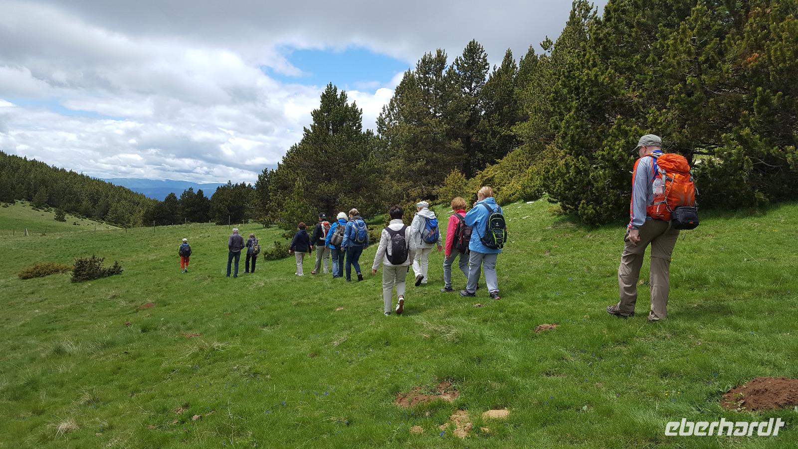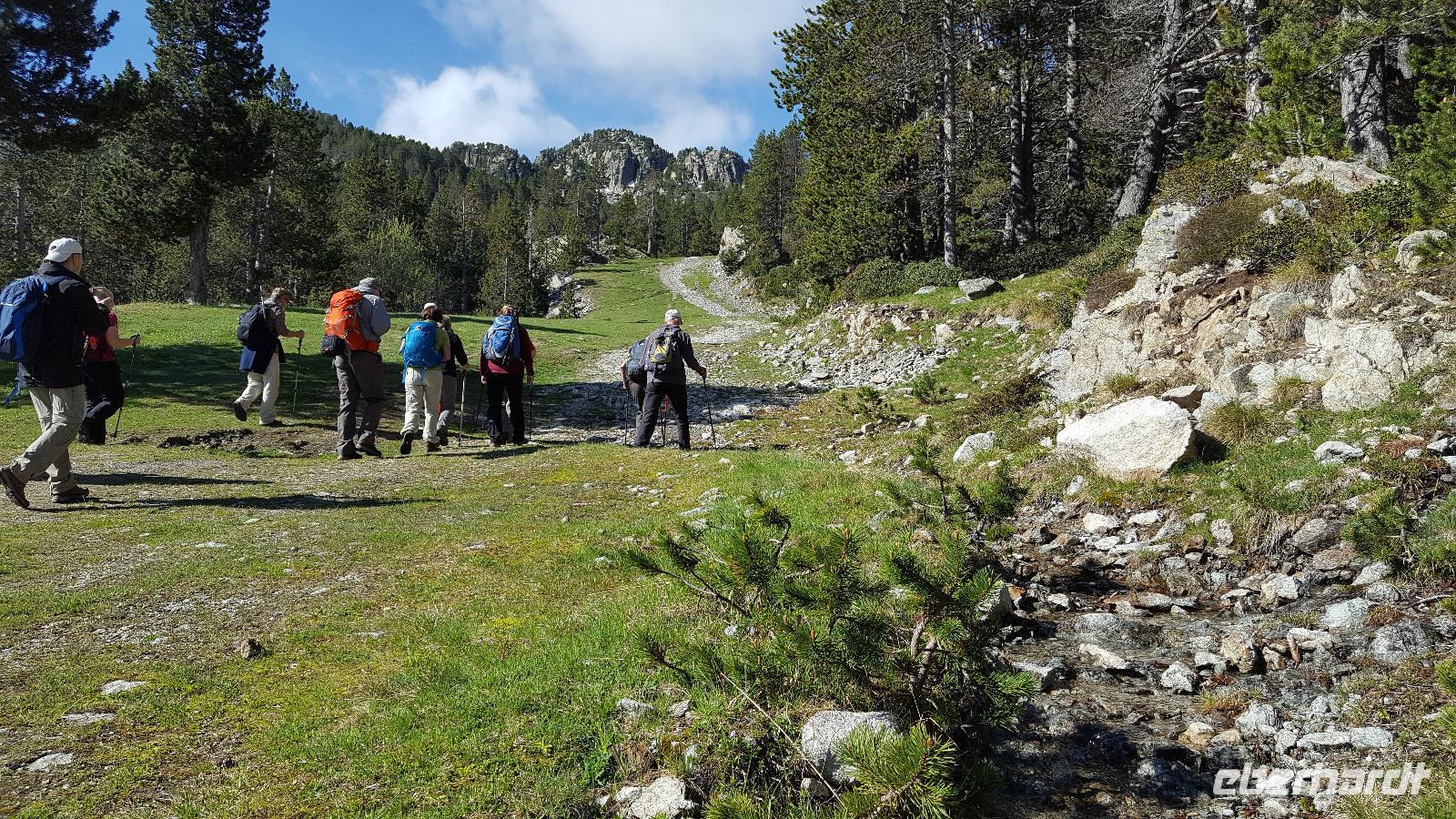 Der erste Teil der Tour war ein etwas beschwerlicher Aufstieg zum botanischen Garten, ein sehr liebevoll gestalteter Alpiner Garten. Wir gingen stetig am Gebirgsfluss bergauf und überquerten einige Wiesen mit unzähligen Alpenblumen. Dominierend waren Narzissen, Anemonen und Vergissmeinnicht. Besenginster, Birken und der Duft der Schwarzkiefer beherrschten unseren Wanderweg. Mit 10 Wanderfreunden erreichten wir das Rifugi de Sorteny und ließen uns den Cappuccino in der Sonne munden. Es folgte ein weiterer kleiner Aufstieg bis wir ein Plateau erreichten mit Blick auf den Portella de la Cebo. Der Abstieg verlief gemächlich durch Kiefern- und Birkenwald. Der Gebirgsfluss plätscherte rechts unseres Weges entlang und sorgte immer für Abwechslung.