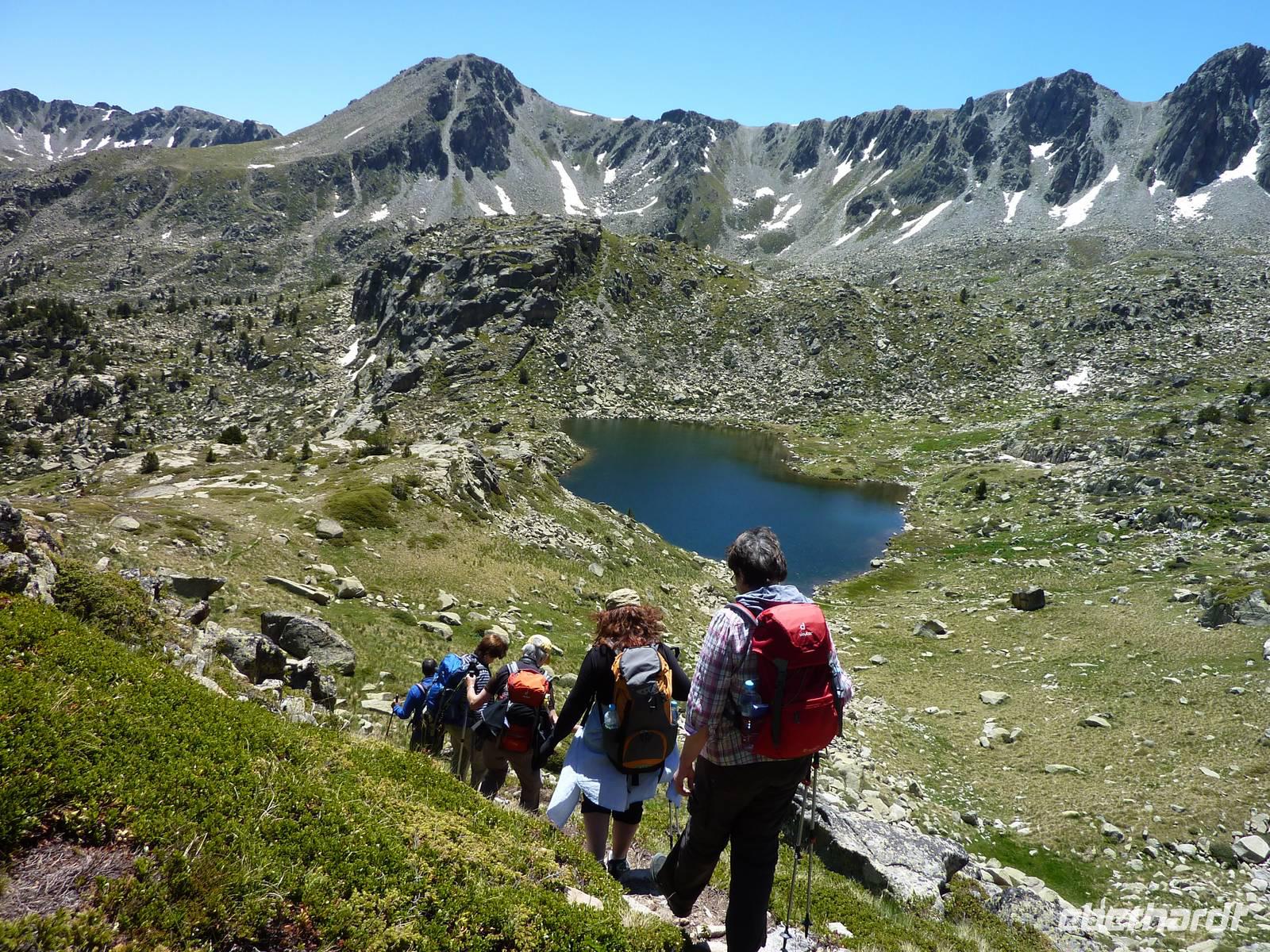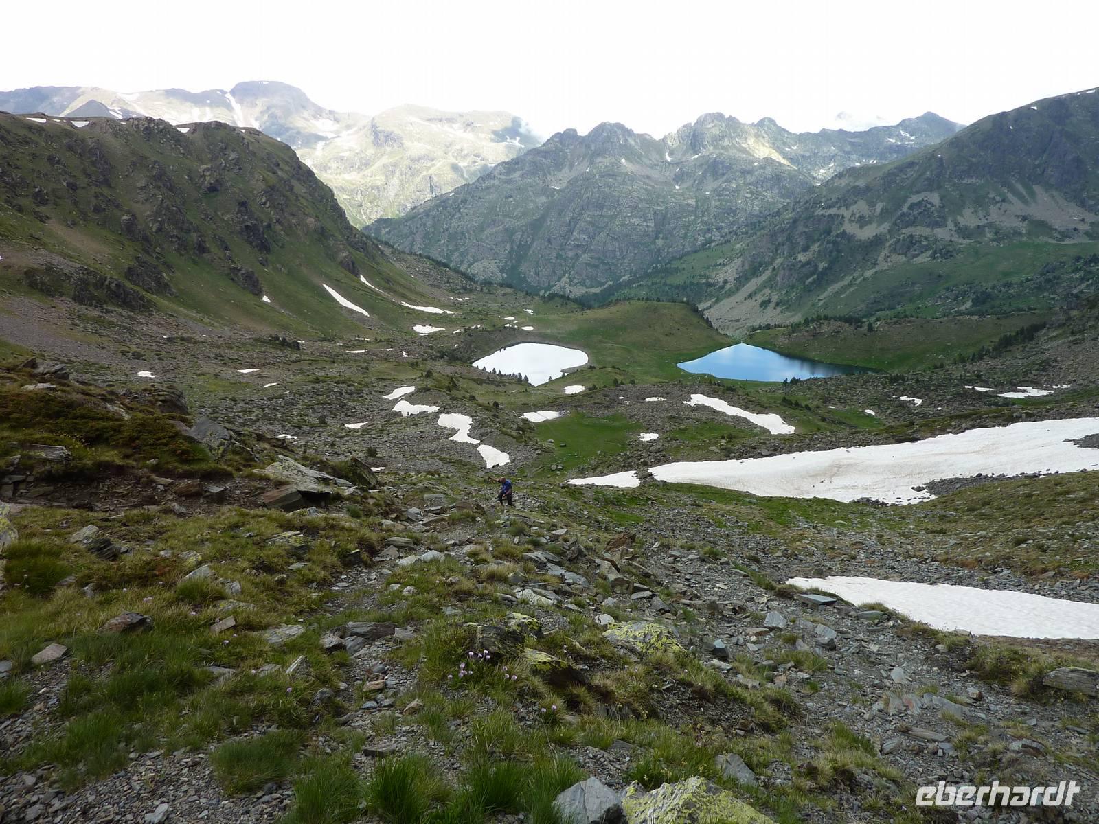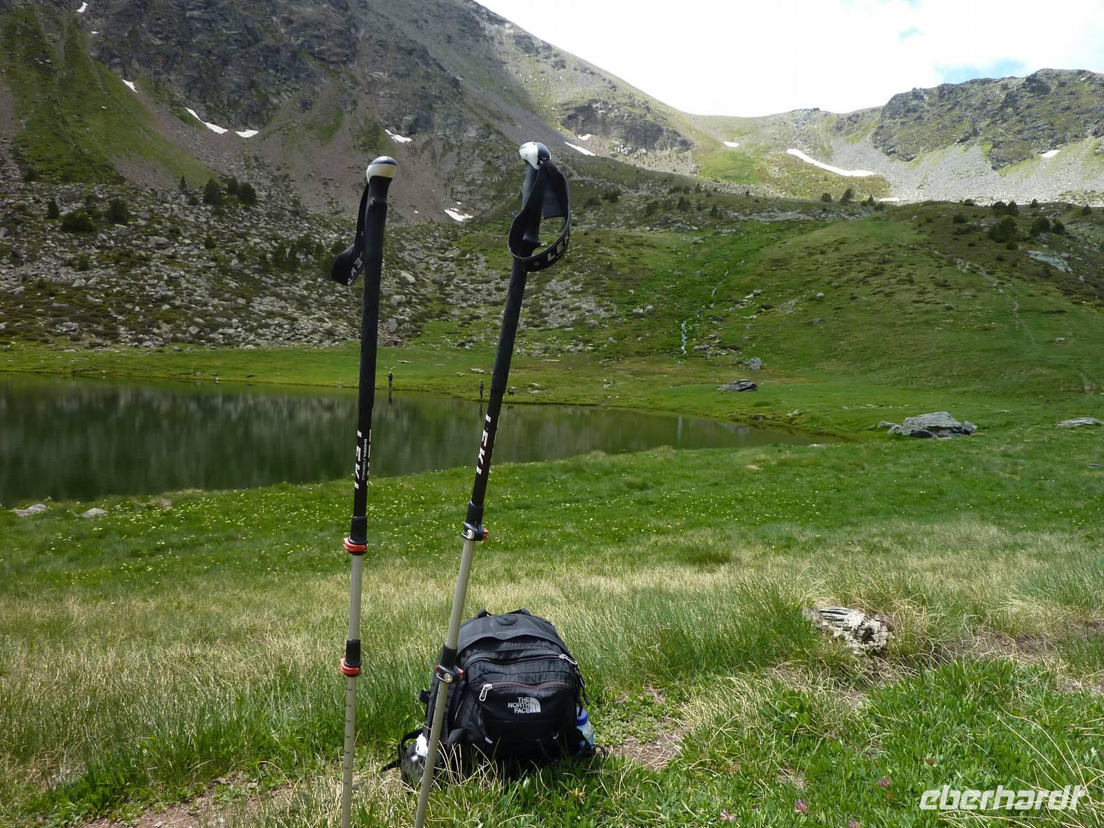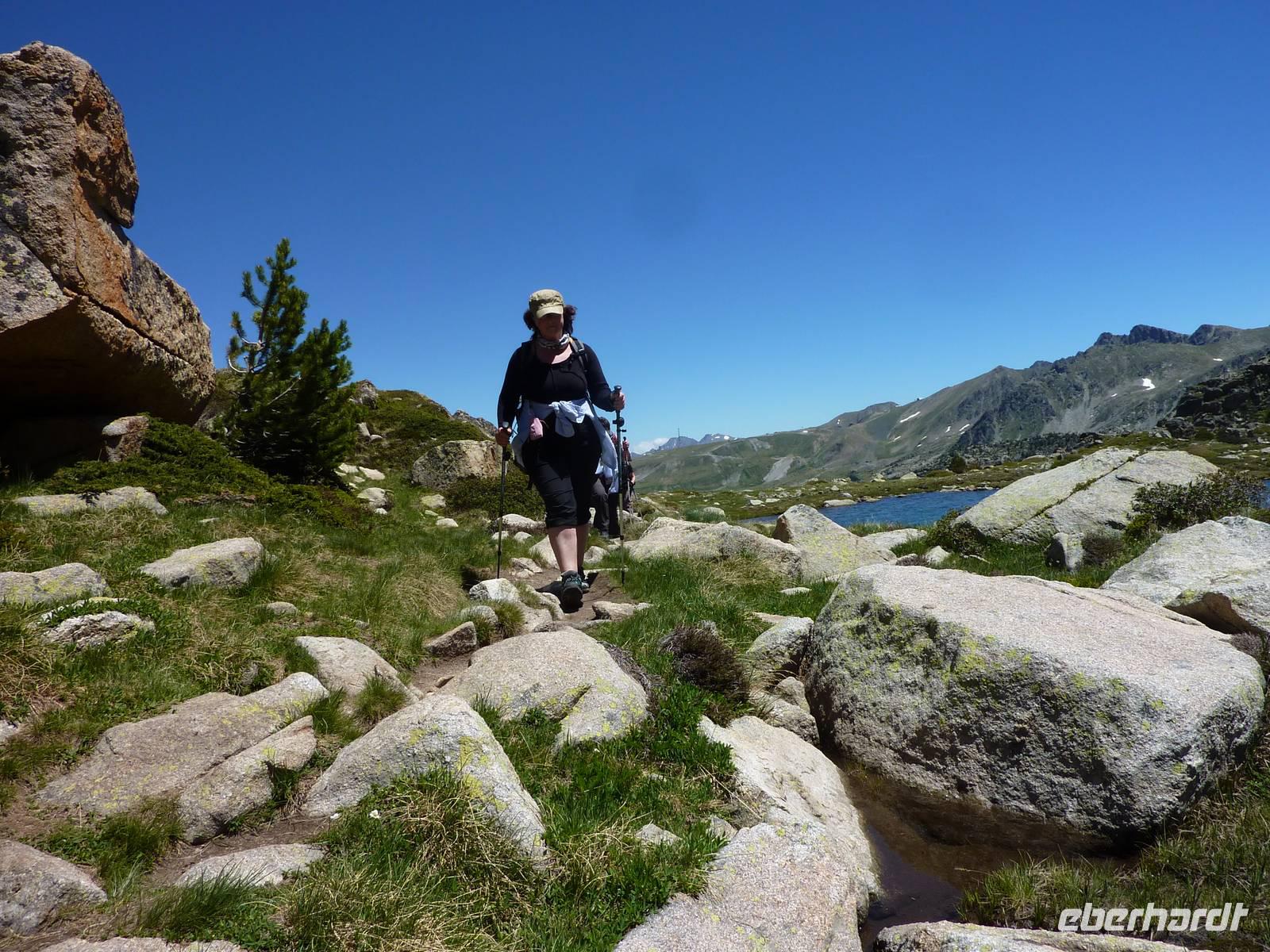 Hektik und Stress ließen wir heute weit hinter uns, denn wir wanderten in das romantische Tal von Incles. Zunächst verließen wir das Dorf Soldeu über einen ersten, recht steilen Anstieg. Danach wurde der Weg angenehm seicht. Links und rechts säumten Alpenrosen den Weg und die ersten blüten bereits. Gegen die Mittagszeit erreichten wir die Seen von Siscaro und Baix und legten dort eine Rast ein. Denn nun stand noch ein Anstieg auf den Pass Port Dret bevor, der nicht ganz ohne werden sollte. Aber alle bissen die Zähne zusammen und erreichten schließlich ganz bravorös den Pass unhd genossen den Ausblick. Dies habe ich bisher noch mit keiner Gruppe geschafft, dass alle Teilnehmer diesen doch recht beschwerlichen Weg auf sich nahmen. Es folgte ein seichter Abstieg, zunächst jedoch über ein Schneefeld und Marco zeigte uns, wie man dieses gelant überquert.. naja.. wir haben es vorgezogen um das Schneefeld herum zu gehen.. Wieder ein schöner Tag.