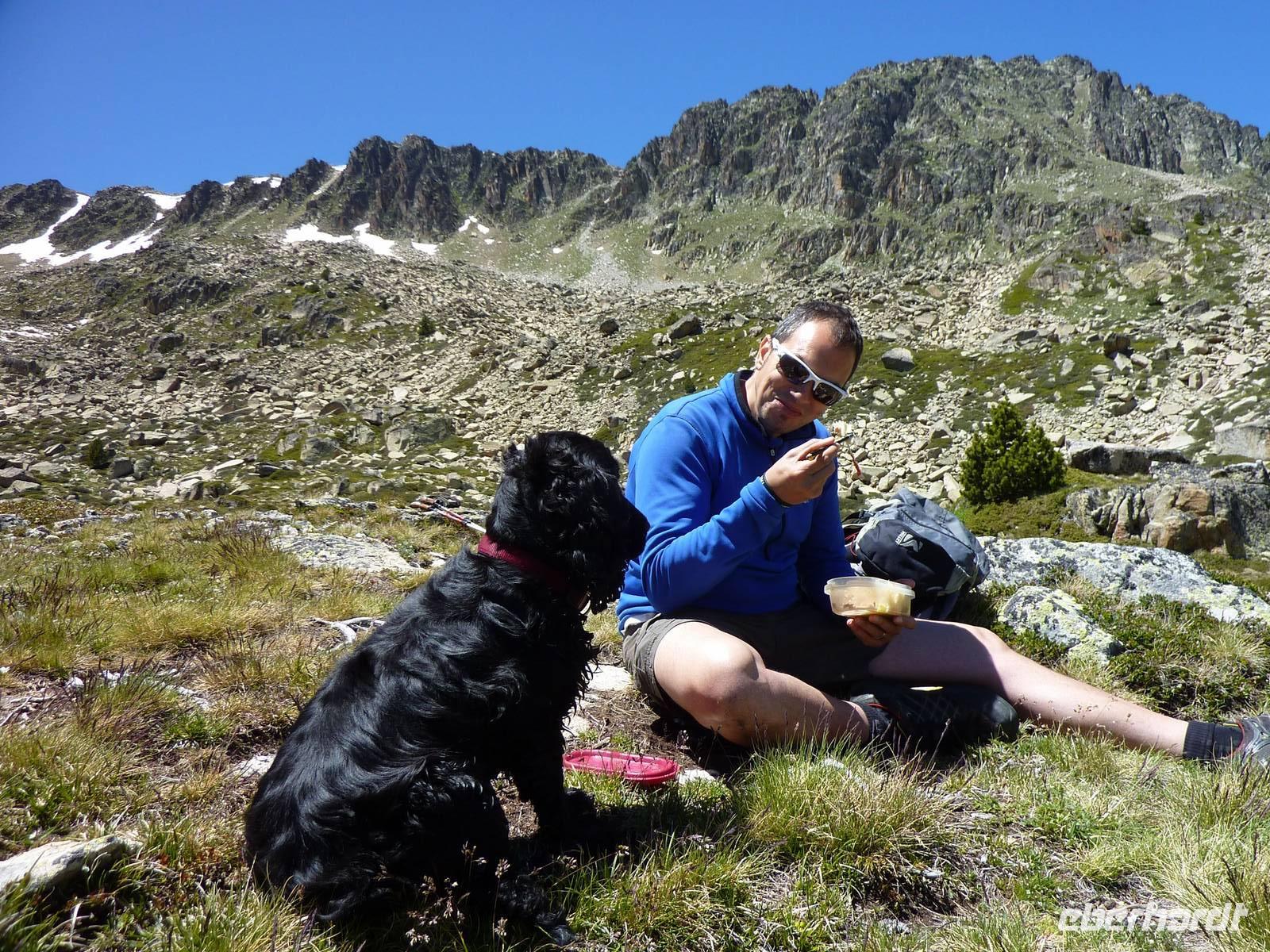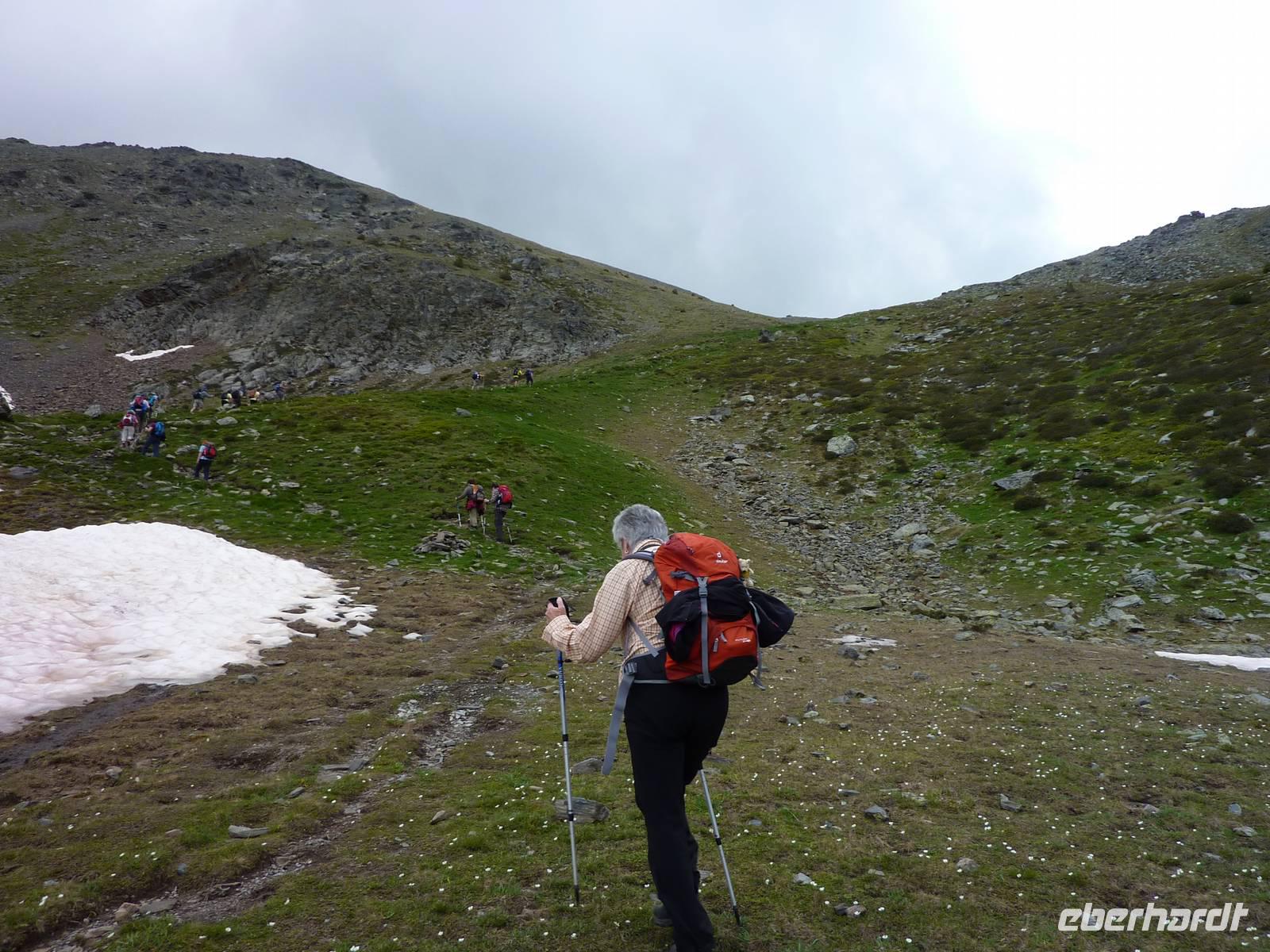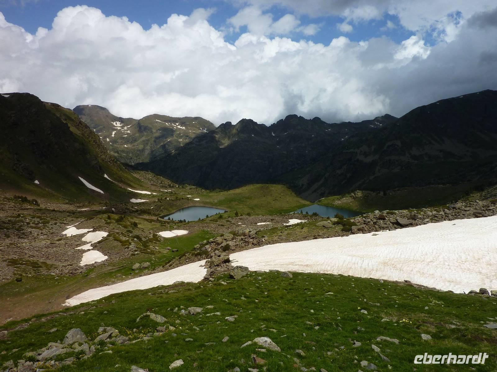 Hektik und Stress ließen wir heute weit hinter uns, denn wir wanderten in das romantische Tal von Incles. Zunächst verließen wir das Dorf Soldeu über einen ersten, recht steilen Anstieg. Danach wurde der Weg angenehm seicht. Links und rechts säumten Alpenrosen den Weg und die ersten blüten bereits. Gegen die Mittagszeit erreichten wir die Seen von Siscaro und Baix und legten dort eine Rast ein. Denn nun stand noch ein Anstieg auf den Pass Port Dret bevor, der nicht ganz ohne werden sollte. Aber alle bissen die Zähne zusammen und erreichten schließlich ganz bravorös den Pass unhd genossen den Ausblick. Dies habe ich bisher noch mit keiner Gruppe geschafft, dass alle Teilnehmer diesen doch recht beschwerlichen Weg auf sich nahmen. Es folgte ein seichter Abstieg, zunächst jedoch über ein Schneefeld und Marco zeigte uns, wie man dieses gelant überquert.. naja.. wir haben es vorgezogen um das Schneefeld herum zu gehen.. Wieder ein schöner Tag.