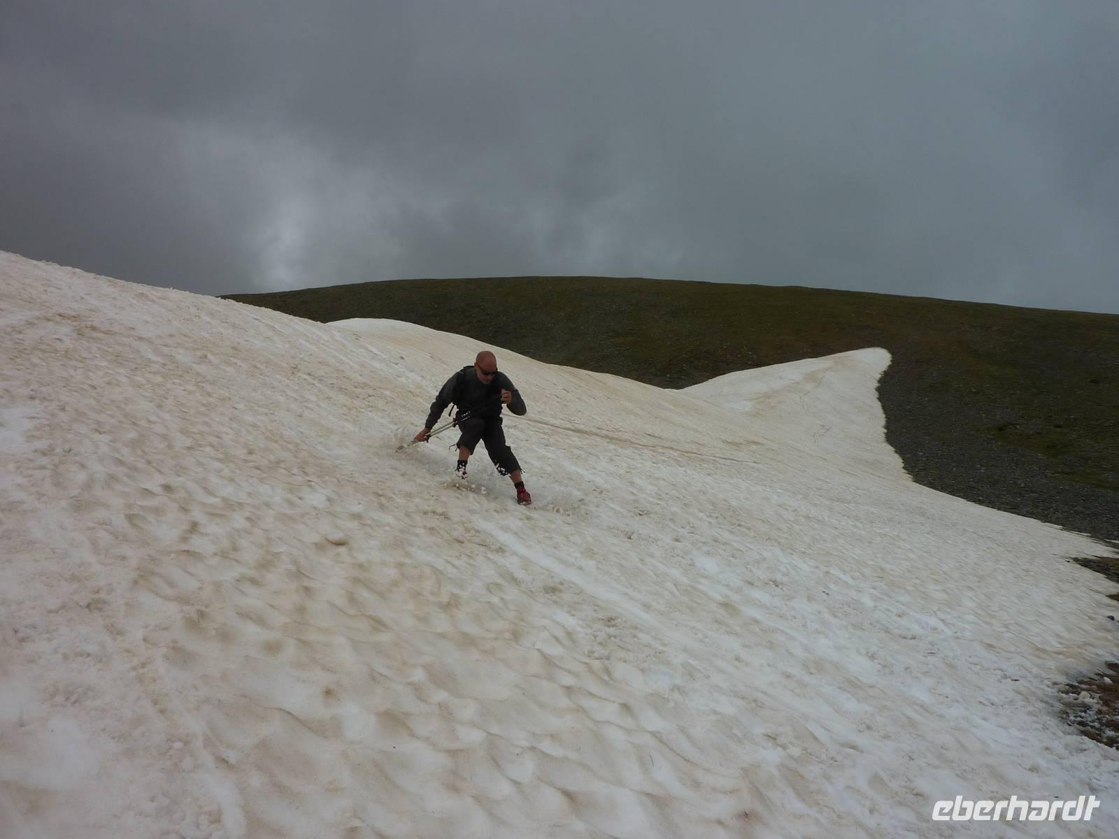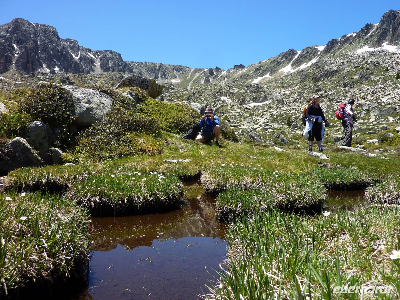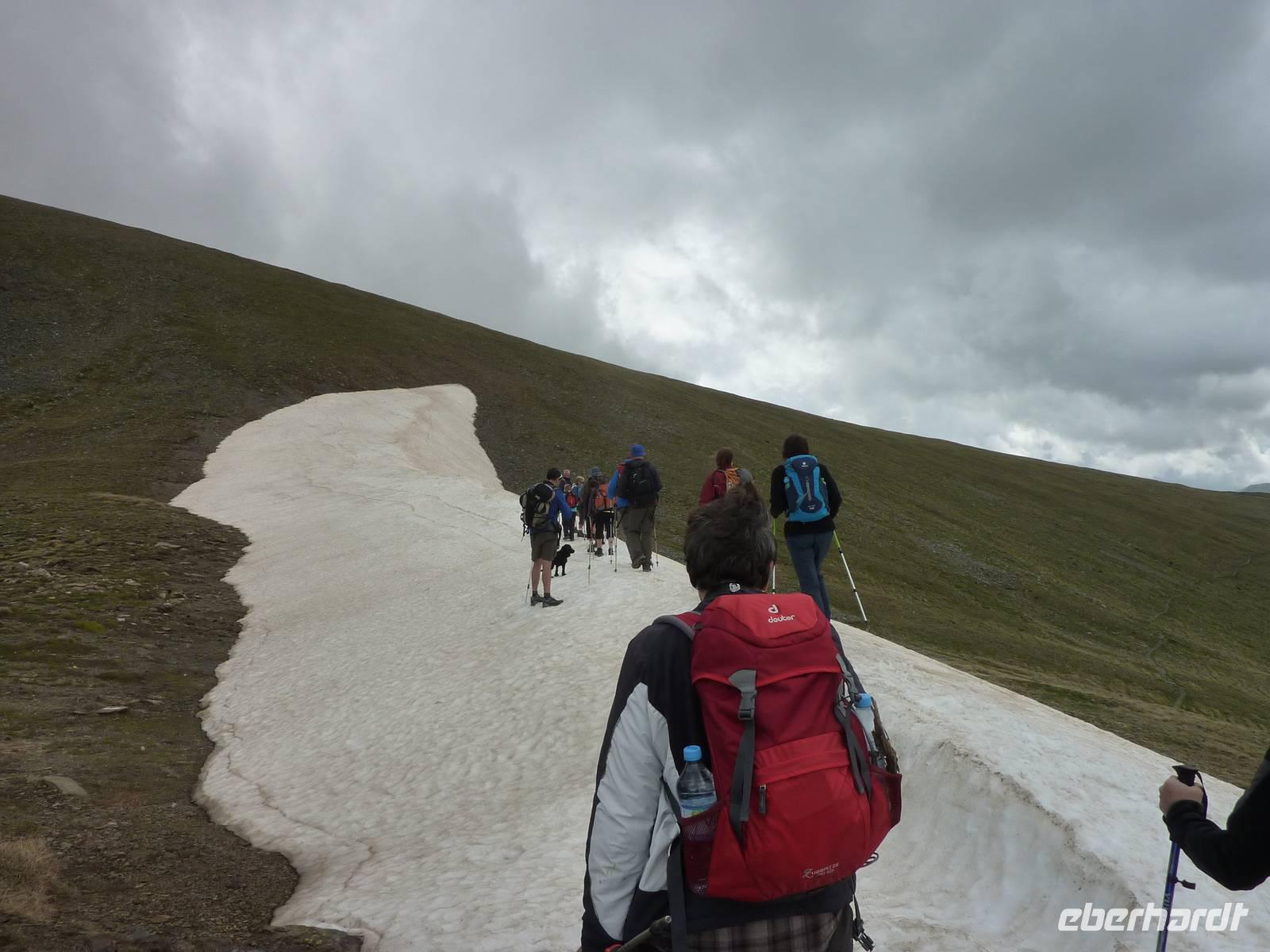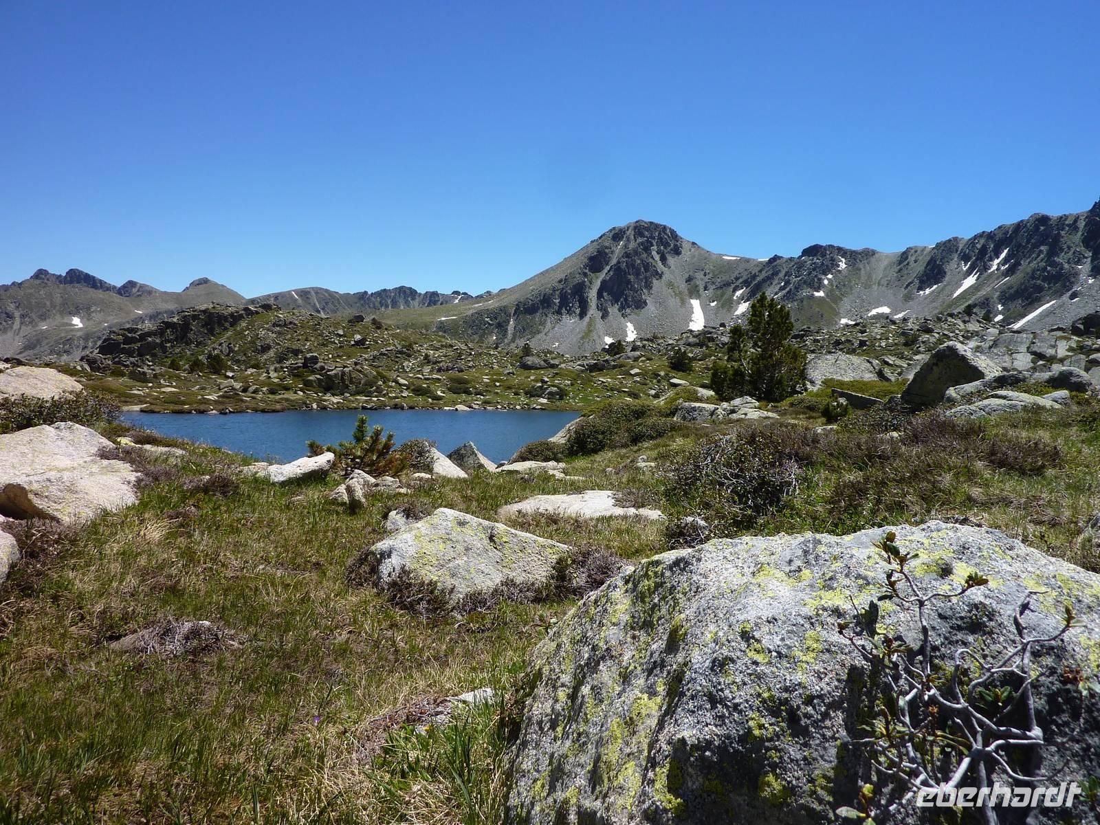 Hektik und Stress ließen wir heute weit hinter uns, denn wir wanderten in das romantische Tal von Incles. Zunächst verließen wir das Dorf Soldeu über einen ersten, recht steilen Anstieg. Danach wurde der Weg angenehm seicht. Links und rechts säumten Alpenrosen den Weg und die ersten blüten bereits. Gegen die Mittagszeit erreichten wir die Seen von Siscaro und Baix und legten dort eine Rast ein. Denn nun stand noch ein Anstieg auf den Pass Port Dret bevor, der nicht ganz ohne werden sollte. Aber alle bissen die Zähne zusammen und erreichten schließlich ganz bravorös den Pass unhd genossen den Ausblick. Dies habe ich bisher noch mit keiner Gruppe geschafft, dass alle Teilnehmer diesen doch recht beschwerlichen Weg auf sich nahmen. Es folgte ein seichter Abstieg, zunächst jedoch über ein Schneefeld und Marco zeigte uns, wie man dieses gelant überquert.. naja.. wir haben es vorgezogen um das Schneefeld herum zu gehen.. Wieder ein schöner Tag.