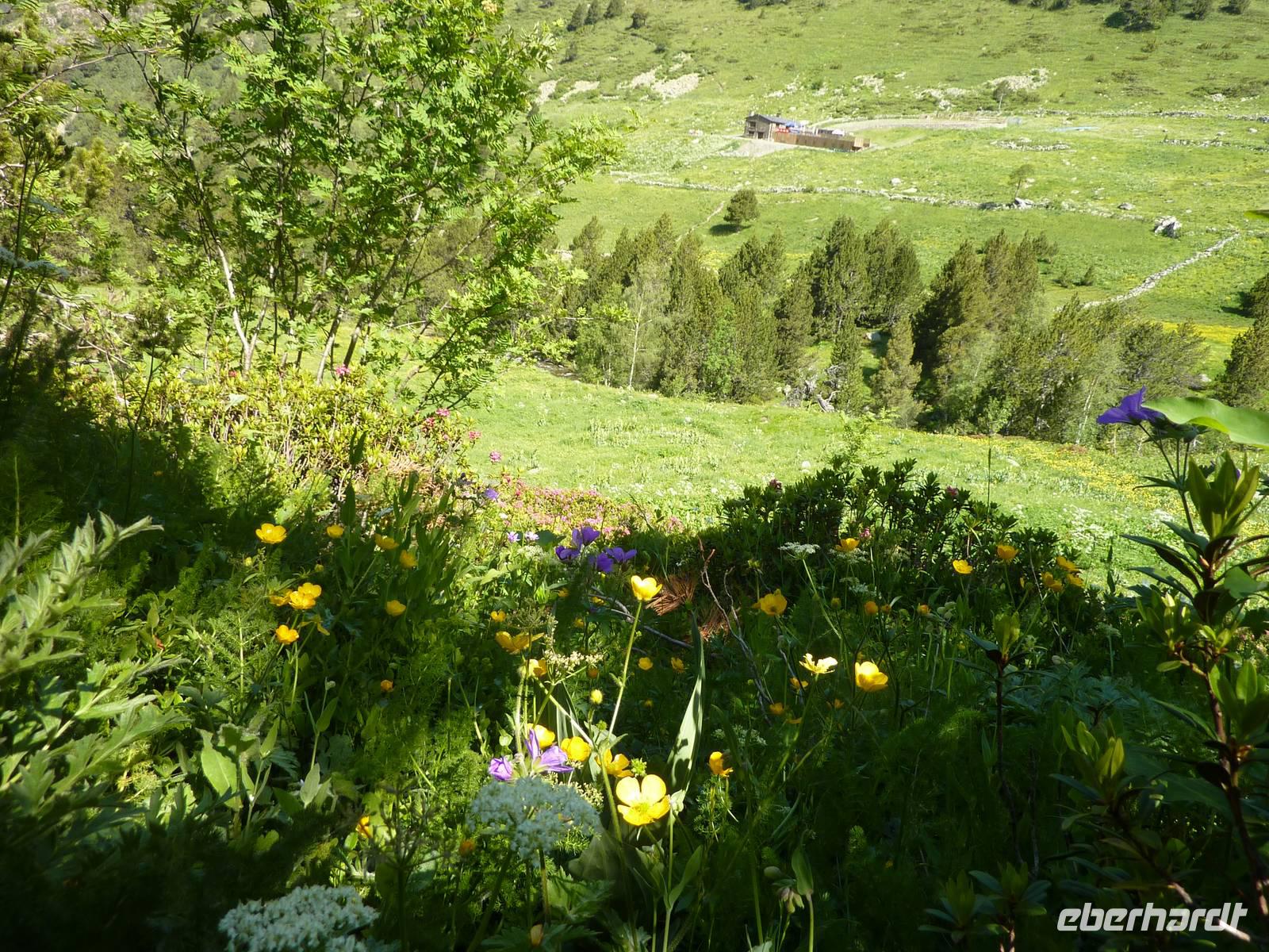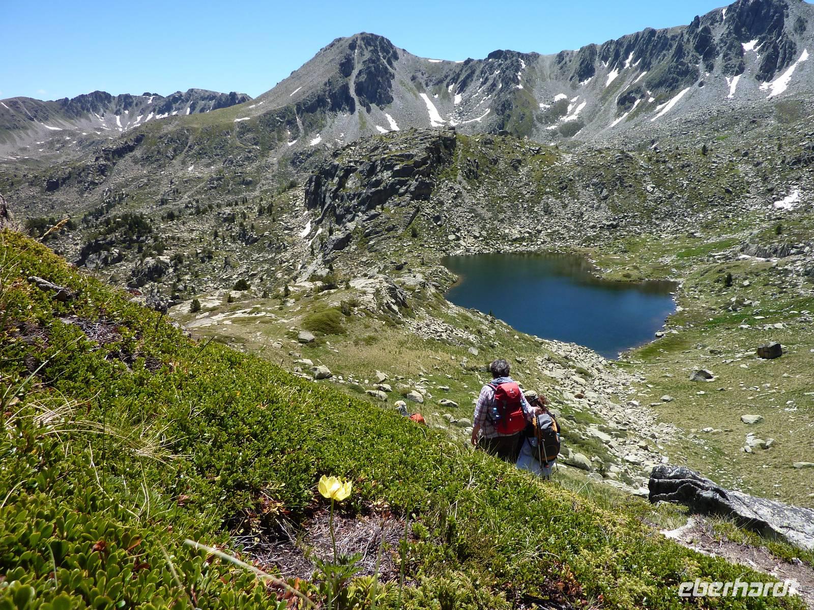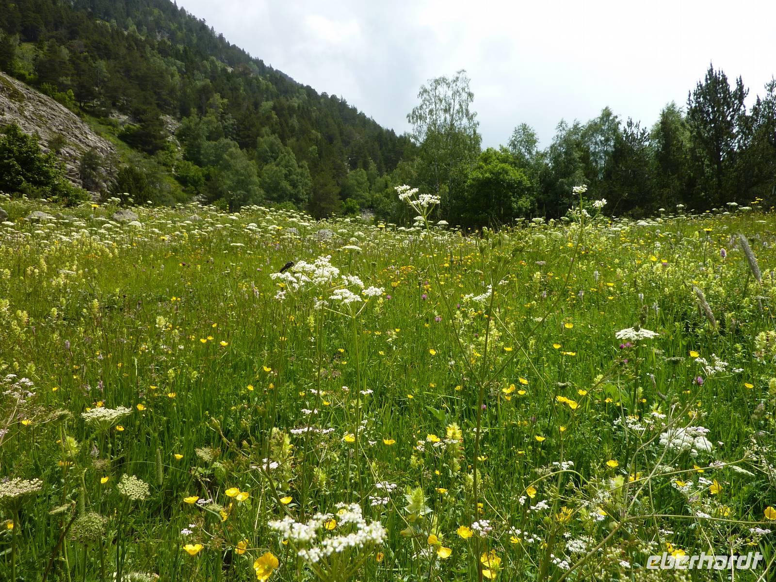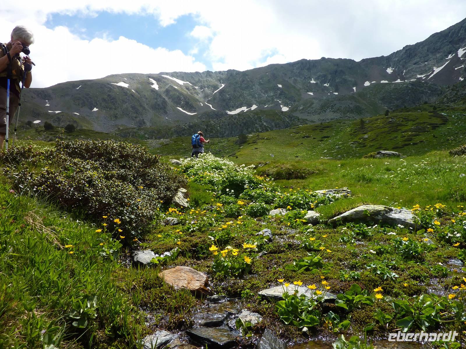 Und wie sollte es anders sein, heute stand mein Lieblingstal auf dem Plan, der Sorteny-Park, welcher 1999 zum Naturpark erklärt wurde und ca. 1.080 Hektar Land umfasst. In diesem Naturpark findet man über 700 Arten von Pflanzen und Blumen, wovon 50 sogar die einzigen in den Pyrenäen sind. Der Park wurde ebenfalls zum UNESCO Weltnaturerbe gekürt. Ein kleiner Botanischer Garten am Anfang des Naturparks gab uns auf kleiner Fläche einen Eindruck der atemberaubenden Vielzahl an Pflanzen und Blumen dieser Region. Anschließend wanderten wir zum Estanyo See, welcher sich auf 2.350 Metern Höhe befindet. Zahlreiche Blumen säumten wieder den Weg und ließen das eine oder andere Herz unserer Wanderer höher schlagen. Die Sportler unter uns, setzen wieder noch einen drauf und erklommen zusätzlich einen Pass, während wir Genießer eine ausgiebige Rast bei Sonnenschein am See zelebrierten. Auf dem Rückweg passierren wir die Schutzhütte "Regugi de Sorteny", dort kehrten wir noch ein und verabschiedeten uns von unseren beiden Wanderführern Marco und Ignazi.