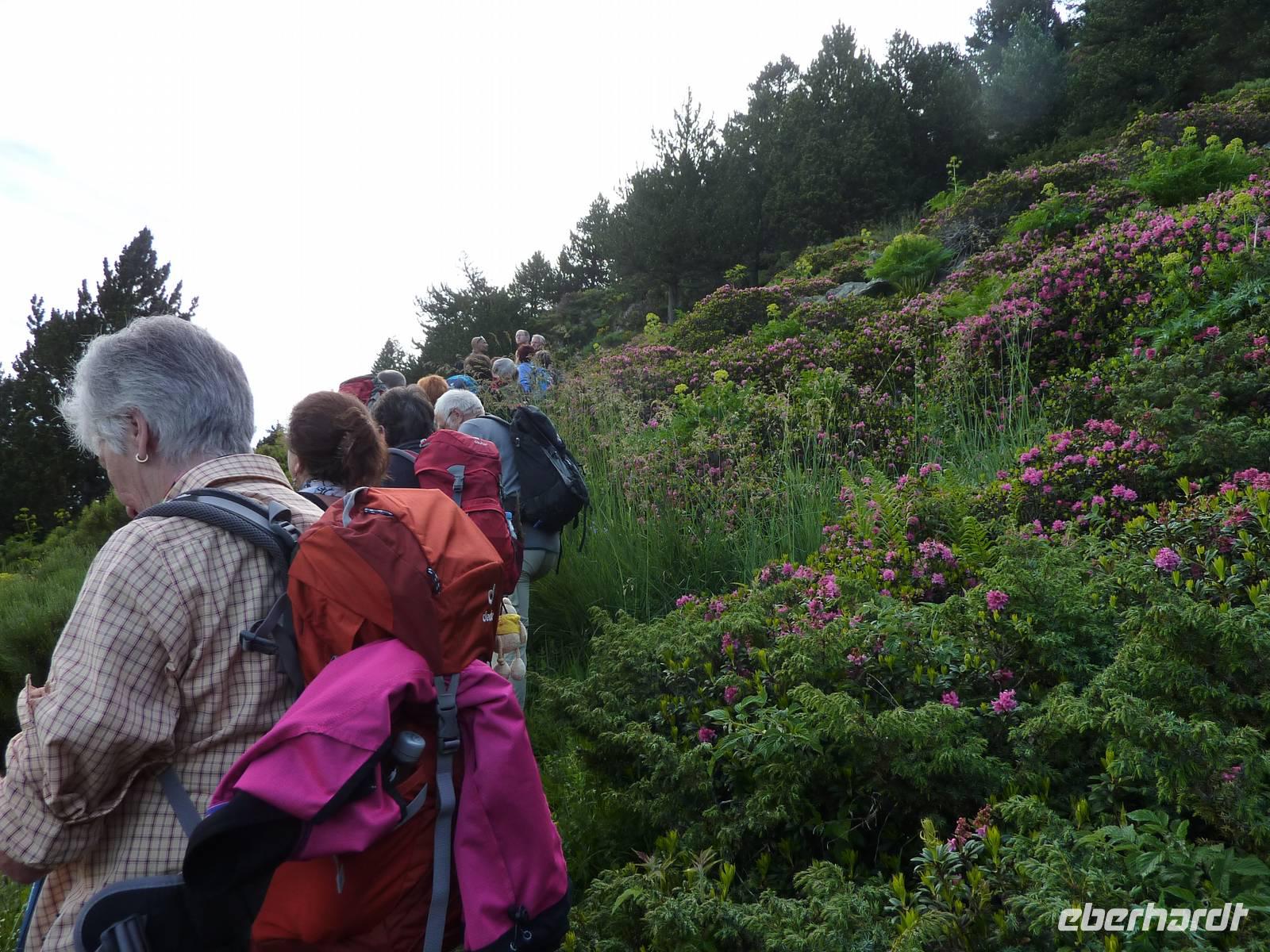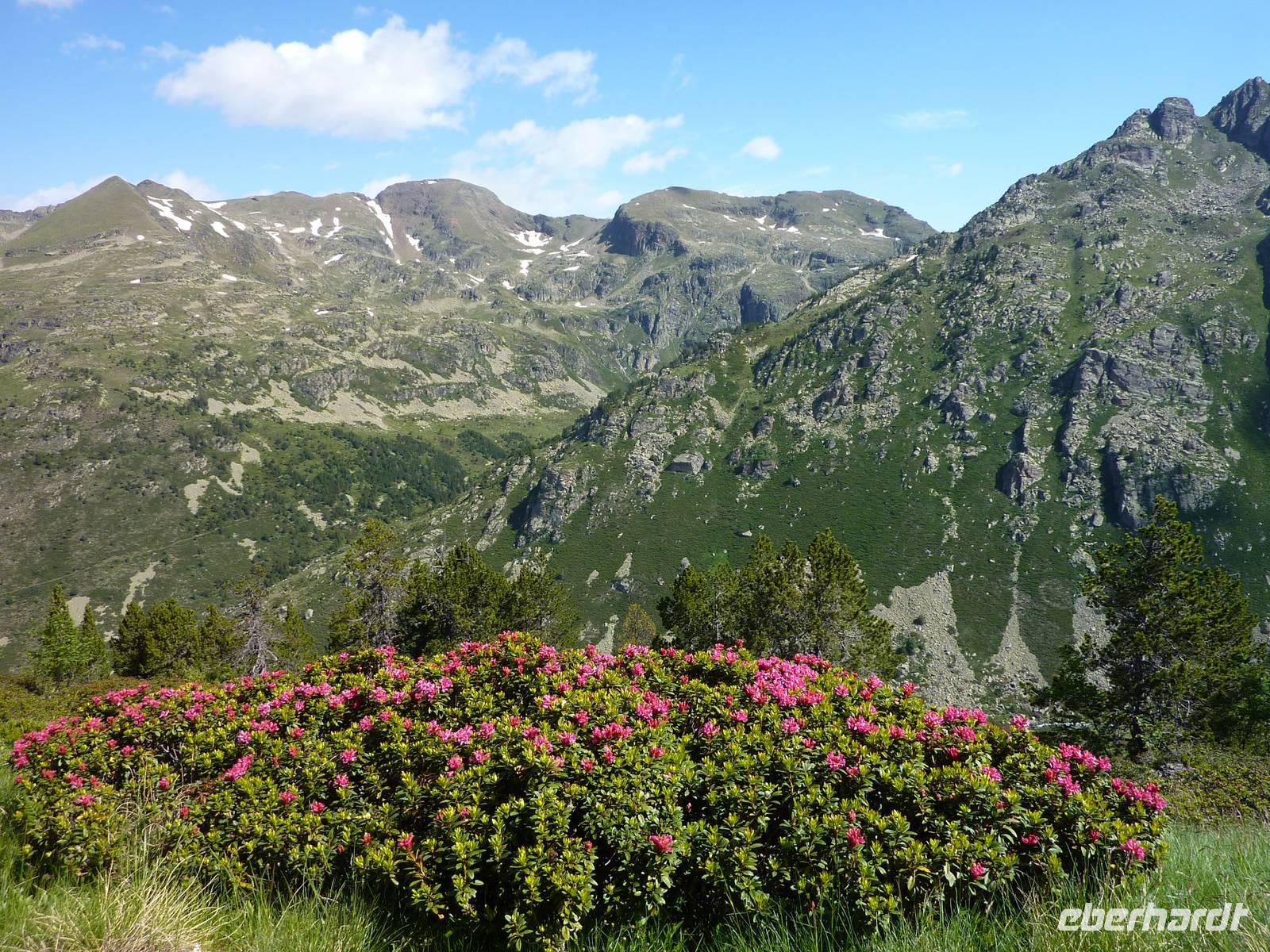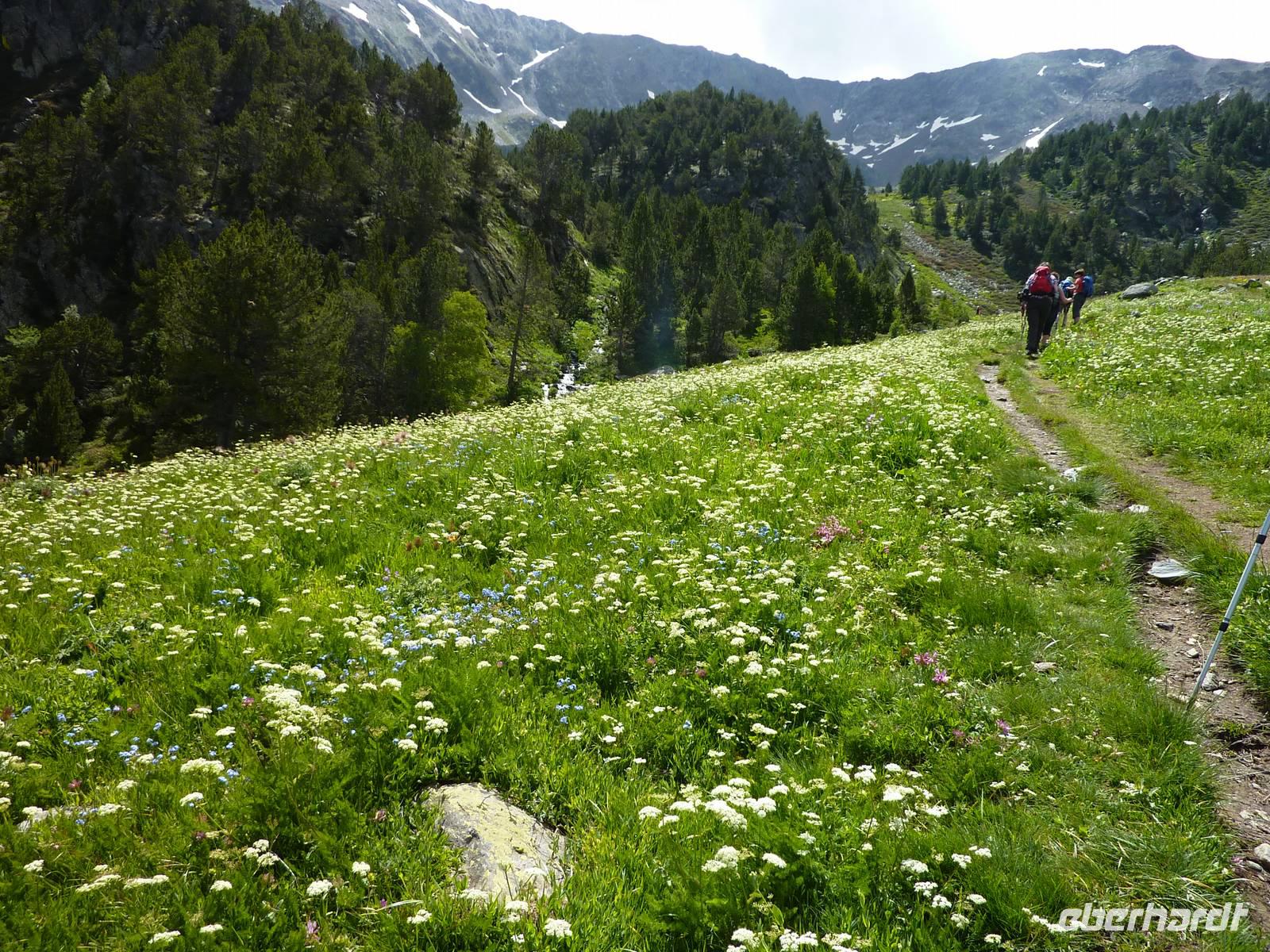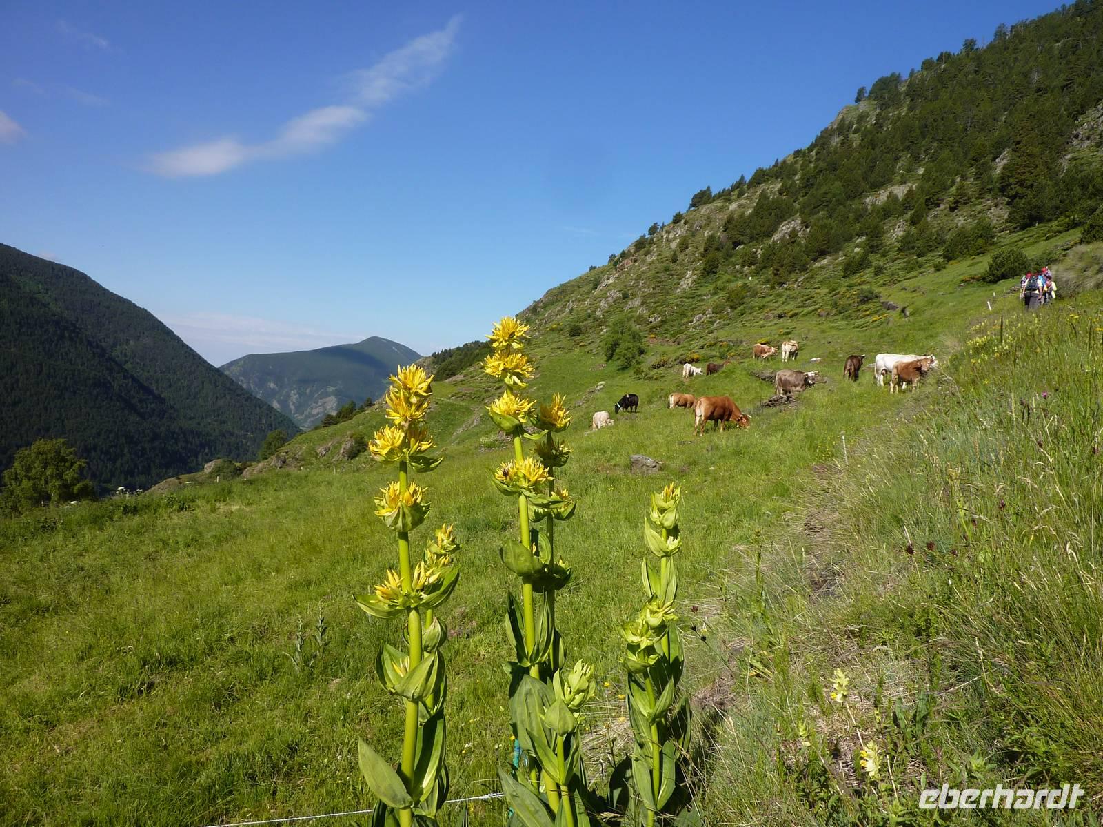 Und wie sollte es anders sein, heute stand mein Lieblingstal auf dem Plan, der Sorteny-Park, welcher 1999 zum Naturpark erklärt wurde und ca. 1.080 Hektar Land umfasst. In diesem Naturpark findet man über 700 Arten von Pflanzen und Blumen, wovon 50 sogar die einzigen in den Pyrenäen sind. Der Park wurde ebenfalls zum UNESCO Weltnaturerbe gekürt. Ein kleiner Botanischer Garten am Anfang des Naturparks gab uns auf kleiner Fläche einen Eindruck der atemberaubenden Vielzahl an Pflanzen und Blumen dieser Region. Anschließend wanderten wir zum Estanyo See, welcher sich auf 2.350 Metern Höhe befindet. Zahlreiche Blumen säumten wieder den Weg und ließen das eine oder andere Herz unserer Wanderer höher schlagen. Die Sportler unter uns, setzen wieder noch einen drauf und erklommen zusätzlich einen Pass, während wir Genießer eine ausgiebige Rast bei Sonnenschein am See zelebrierten. Auf dem Rückweg passierren wir die Schutzhütte "Regugi de Sorteny", dort kehrten wir noch ein und verabschiedeten uns von unseren beiden Wanderführern Marco und Ignazi.
