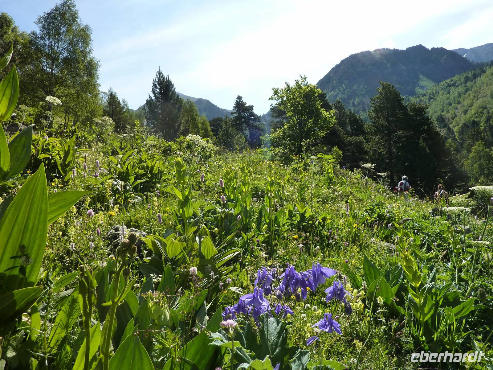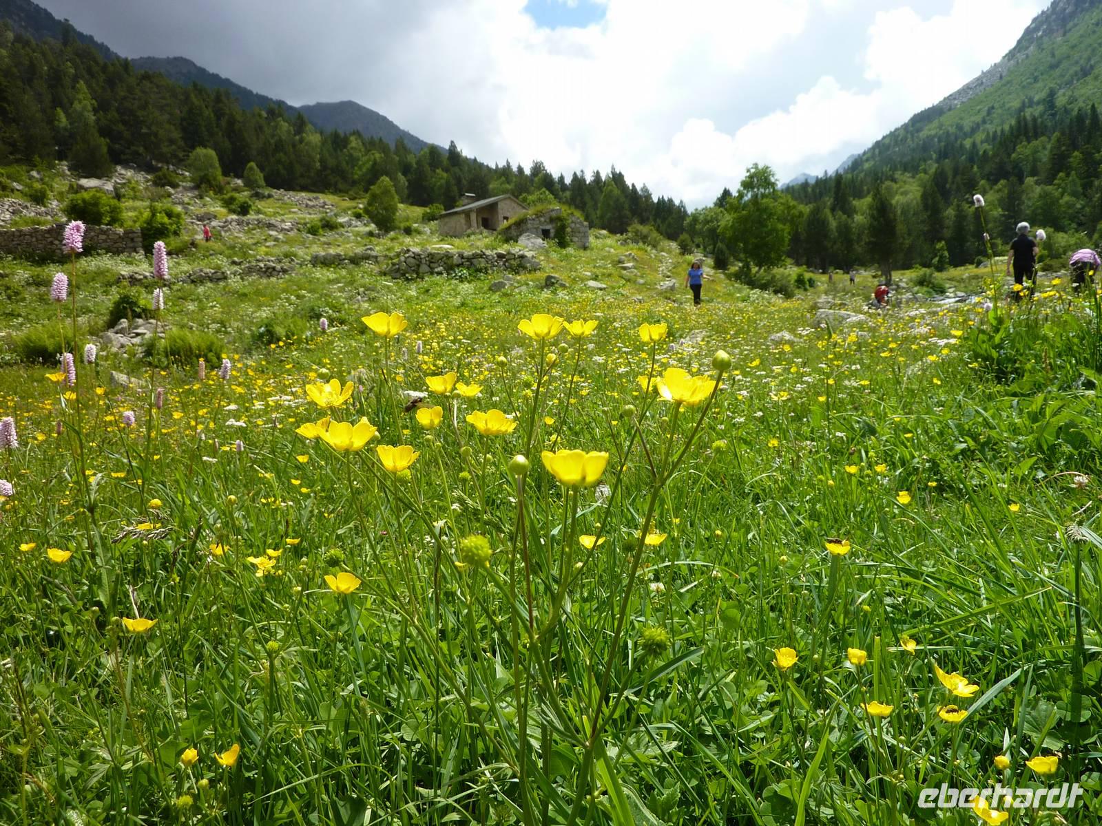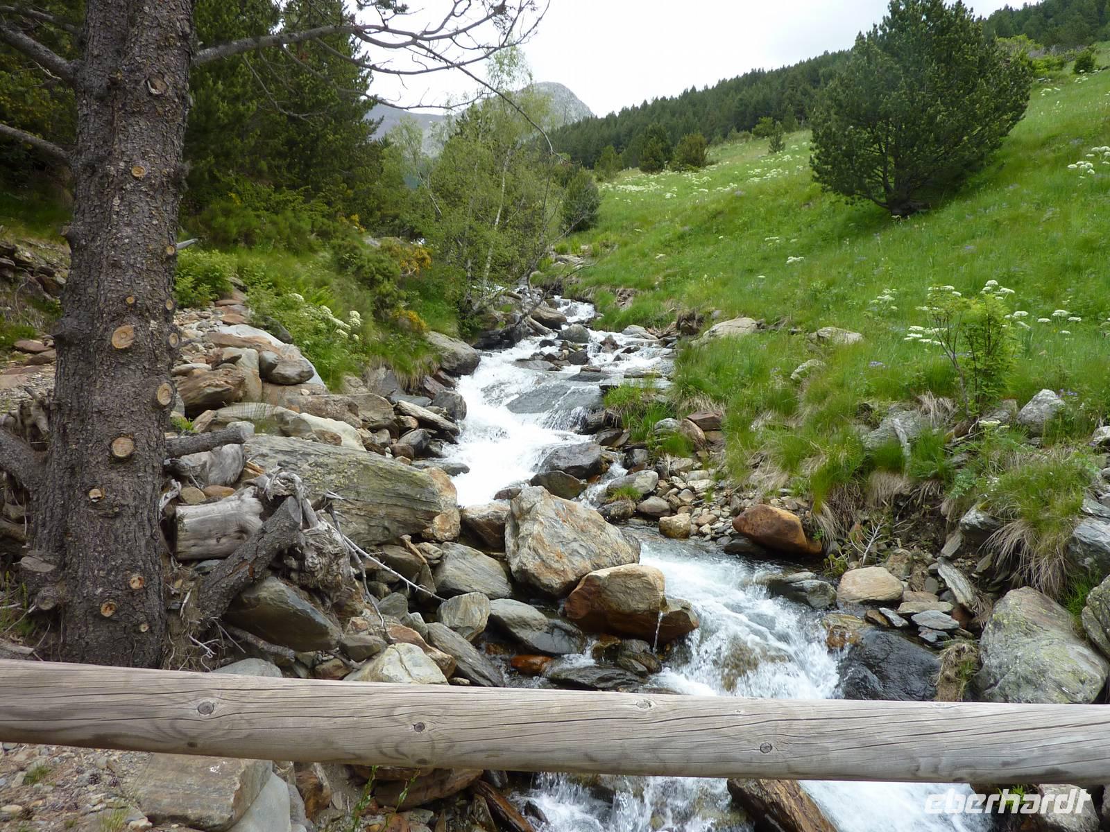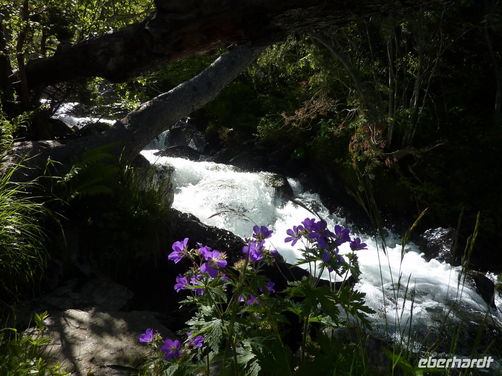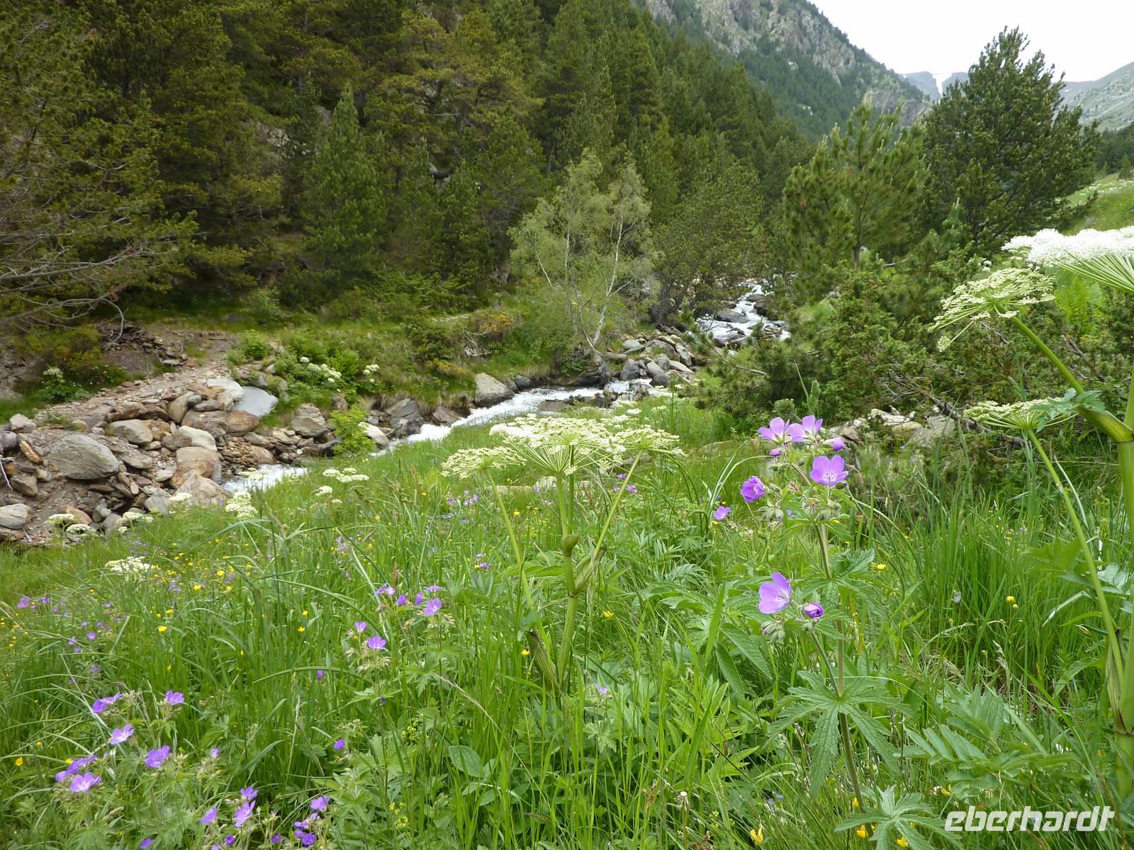 Jedenfalls fanden wir hier Einsamkeit und Ruhe in einem prächtigen Naturpanorama. Der Weg führte uns durch dichte Wälder und über idyllische Talwiese, entlang des kleinen gleichnamigen Bergflüsschens, der sich mal sanft mäandernd und plätschernd, mal als schäumender Sturzbach präsentiert. Wunderschön..
