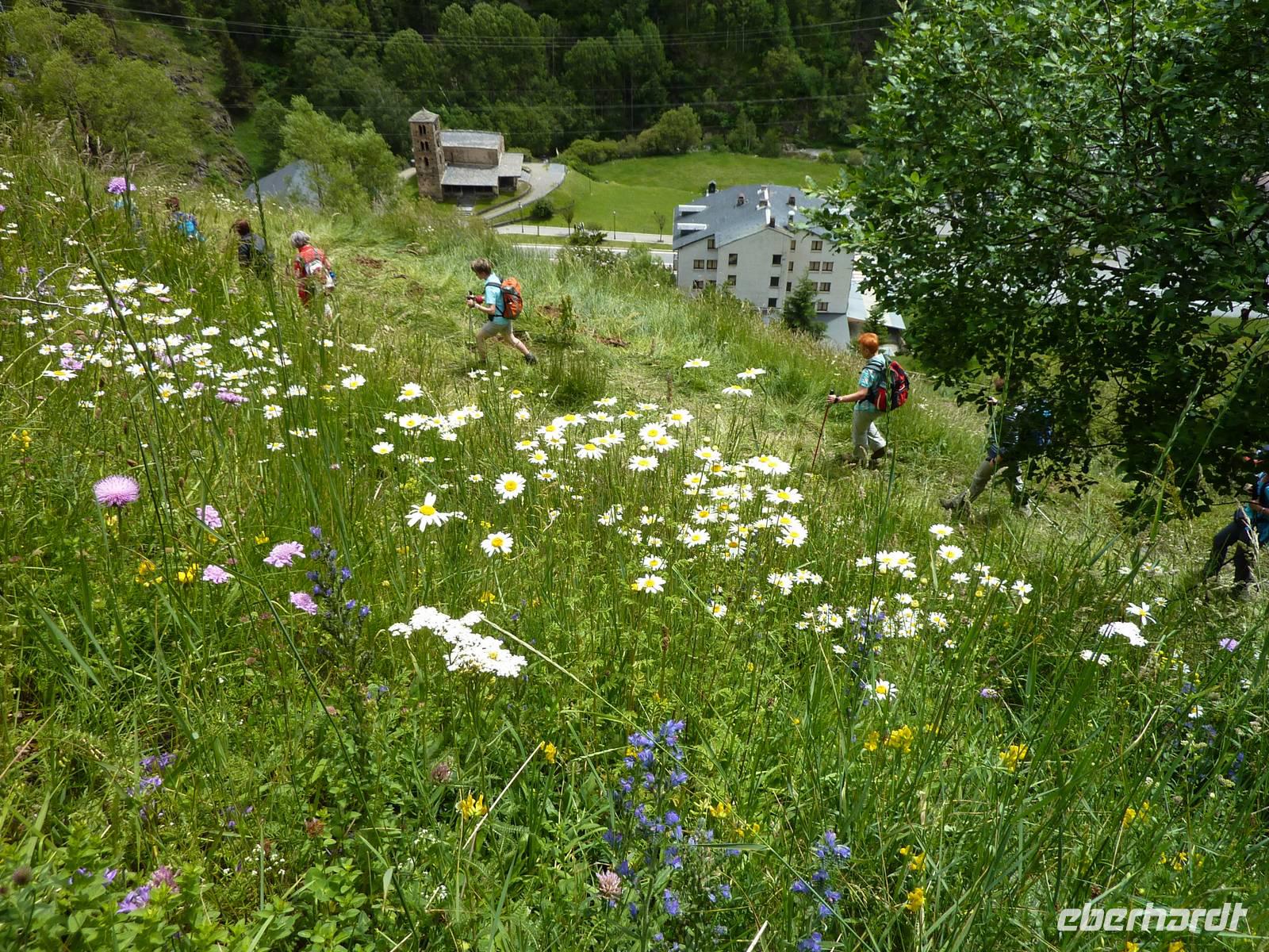 Heute stand die Wanderung in das ruhige und malerische Vall del Riu am Fuße des 2.915 Meter hohen Pic de l'Estanyo, einem der höchsten Berge Andorras auf dem Programm.. Wir teilten uns wieder in zwei Gruppen. Es zeichnete sich ab, dass das Wetter sich nicht bis zum Nachmittag halten würde, es war Regen und Gewitter angesagt. Also versuchten einige Wanderer mit einem etwas zügigeren Tempo voranzugehen, um den Bergsee unterhalb des Gipfels "Pic de l'Estanyo" zu erreichen. Leider zogen die Wolker doch schneller heran als erwartet und so entschied Marco unser Wanderführer, doch besser wieder den Rückweg anzutreten. Unterwegs trafen wir dann auch auf die andere Gruppe und nach einer ausgiebigen Rast, machten wir uns an den Abstieg entlang eines wunderschönen Weges. Die Wolken verzogen sich wieder und die Sonne wärme uns den Rücken. Schließlich endete der Weg in Canillo an der Kirche „Sant Joan de Casellers".