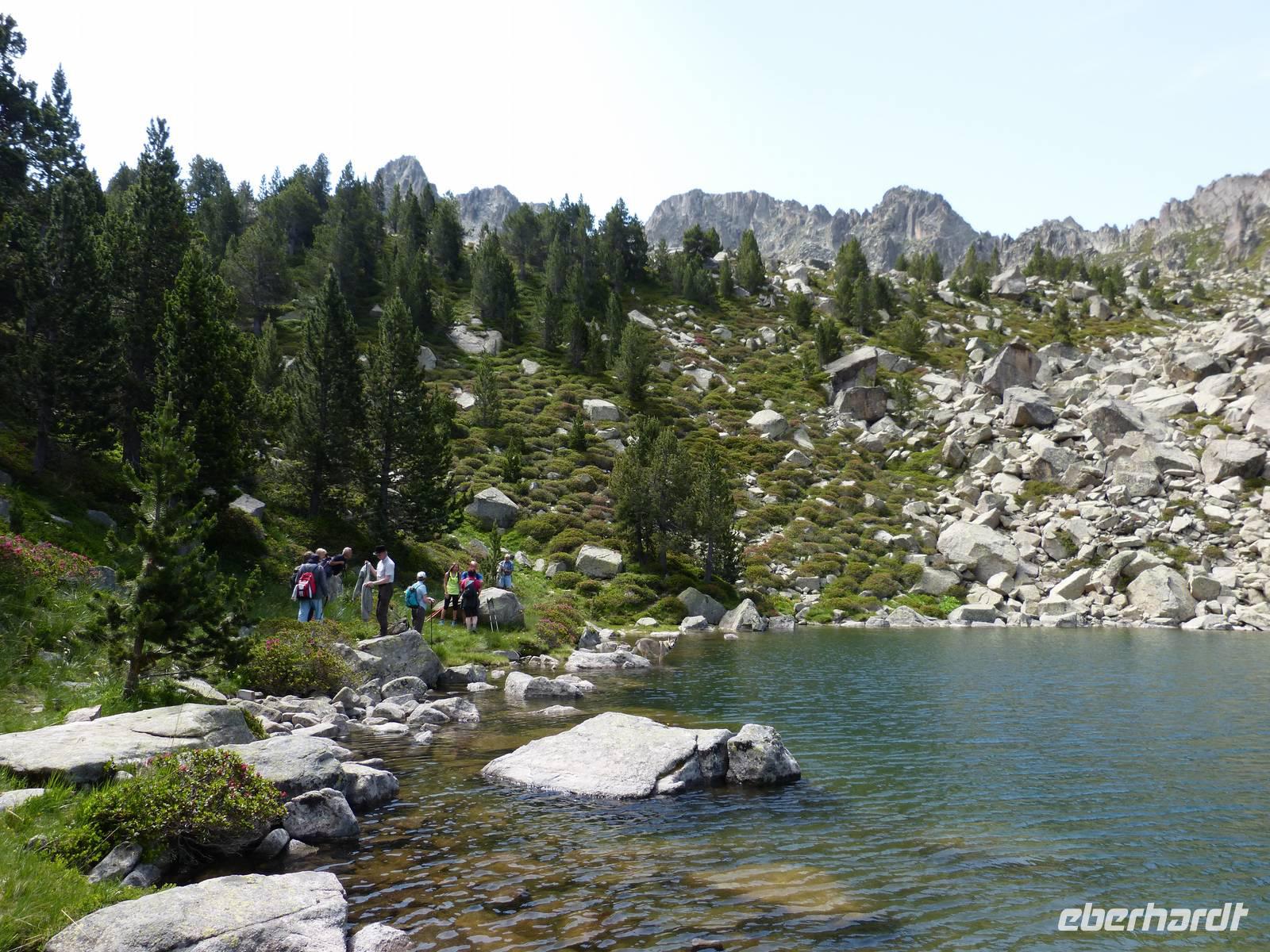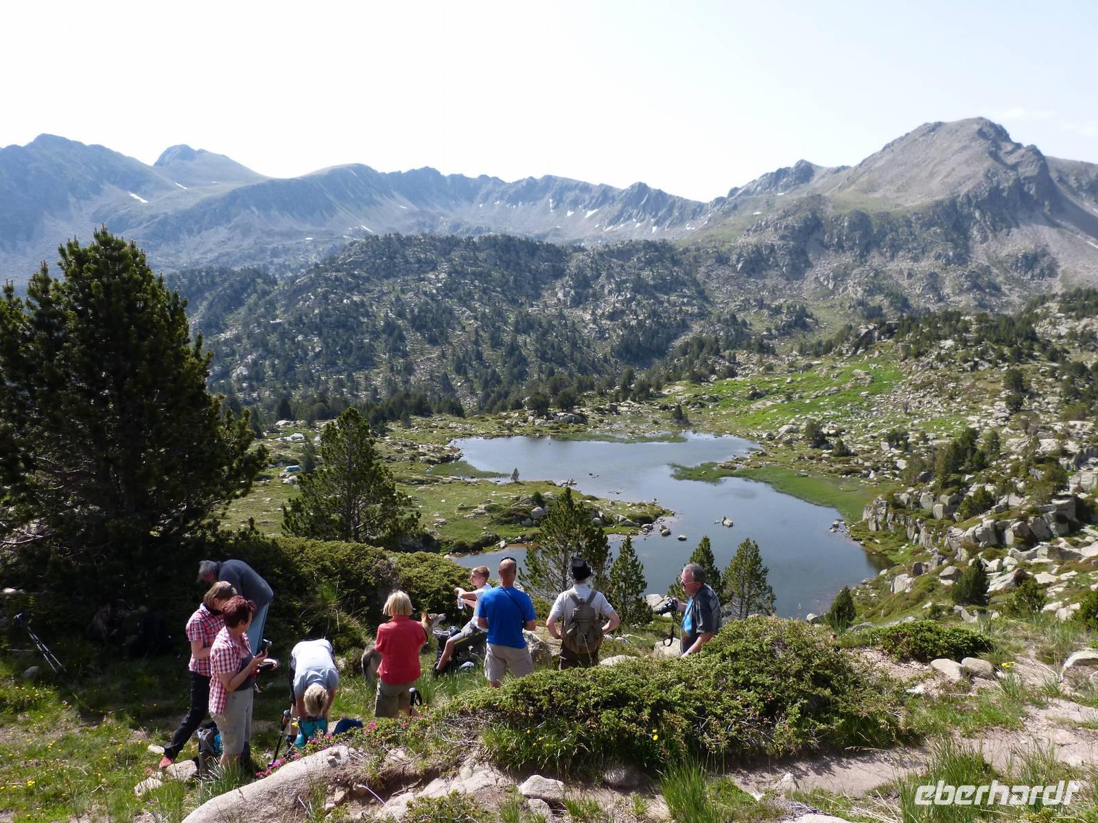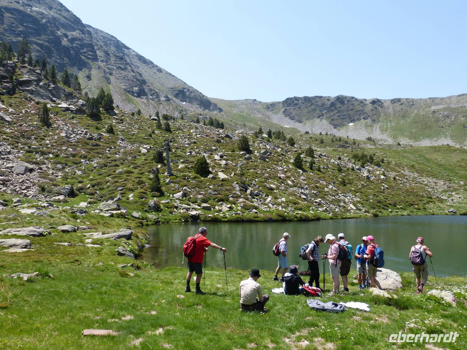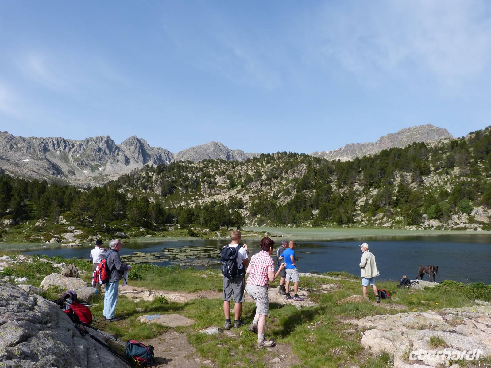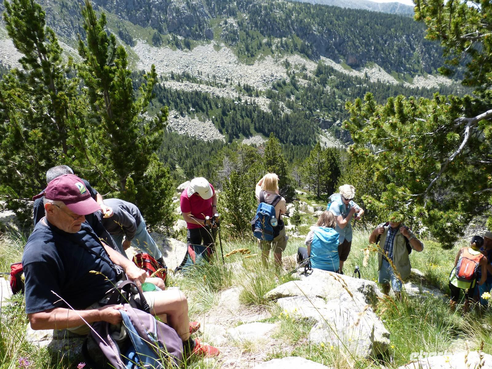 Da auch für den heutigen Tag wieder traumhaftes Wetter mit strahlendem Sonnenschein angekündigt war, vertrauten wir Marco und unternahmen eine andere Wanderung als ausgeschrieben. Wir entschieden uns für mehr Höhenmeter, sodass die Luft etwas frischer als in niedrigeren Höhen war. Wir fuhren mit dem Bus zu erst nach Encamp und folgten von hier einer Serpentine in die Berge. Ab einer Höhe von 1900m setzten wir unseren Weg, heute zusammen mit Marta, Marcos Freundin, zu Fuß fort. Wir begannen mit einem Anstieg im Schatten und folgten einem schmalen Weg direkt durch einen Kiefernwald. Weiter oben kamen wir dann an einem Flußlauf vorbei und der gesamte Weg wurde feuchter, Achtung bei der Wahl der richtigen Steine war gefragt! Dann ging es noch ein wenig über Stock und Stein und ein selbst für Andorraner teils unbekannter Bergsee war unser Ziel für die heutige Mittagsrast. Einige Mutige erfrischten sich im kühlen Nass oder ließen sich etwas Bärwurz schmecken. Dann ging es aber auch schon weiter und nach Ankunft an einer Berghütte, entschieden wir gemeinsam noch höher zu weiteren Bergseen zu steigen. Wir legten insgesamt einen Höhenunterschied von 816m zurück und waren von der wunderschönen Aussicht beeindruckt. Am späten Nachmittag kamen wir dann wieder ins Hotel zurück und ließen den Abend gemütlich bei leckerem Essen und einem Glas Wein oder Bier ausklingen. Natürlich durfte einen witzige Erzählung von Manfred nicht fehlen. :)