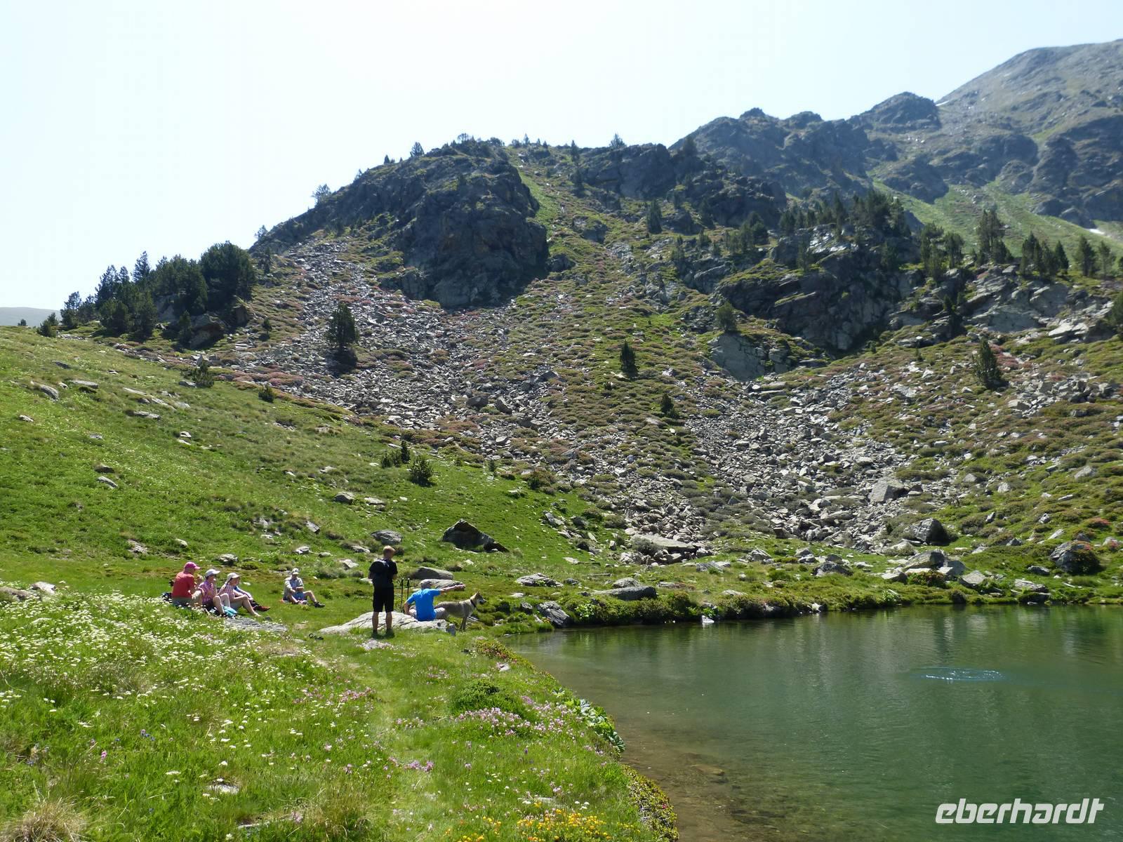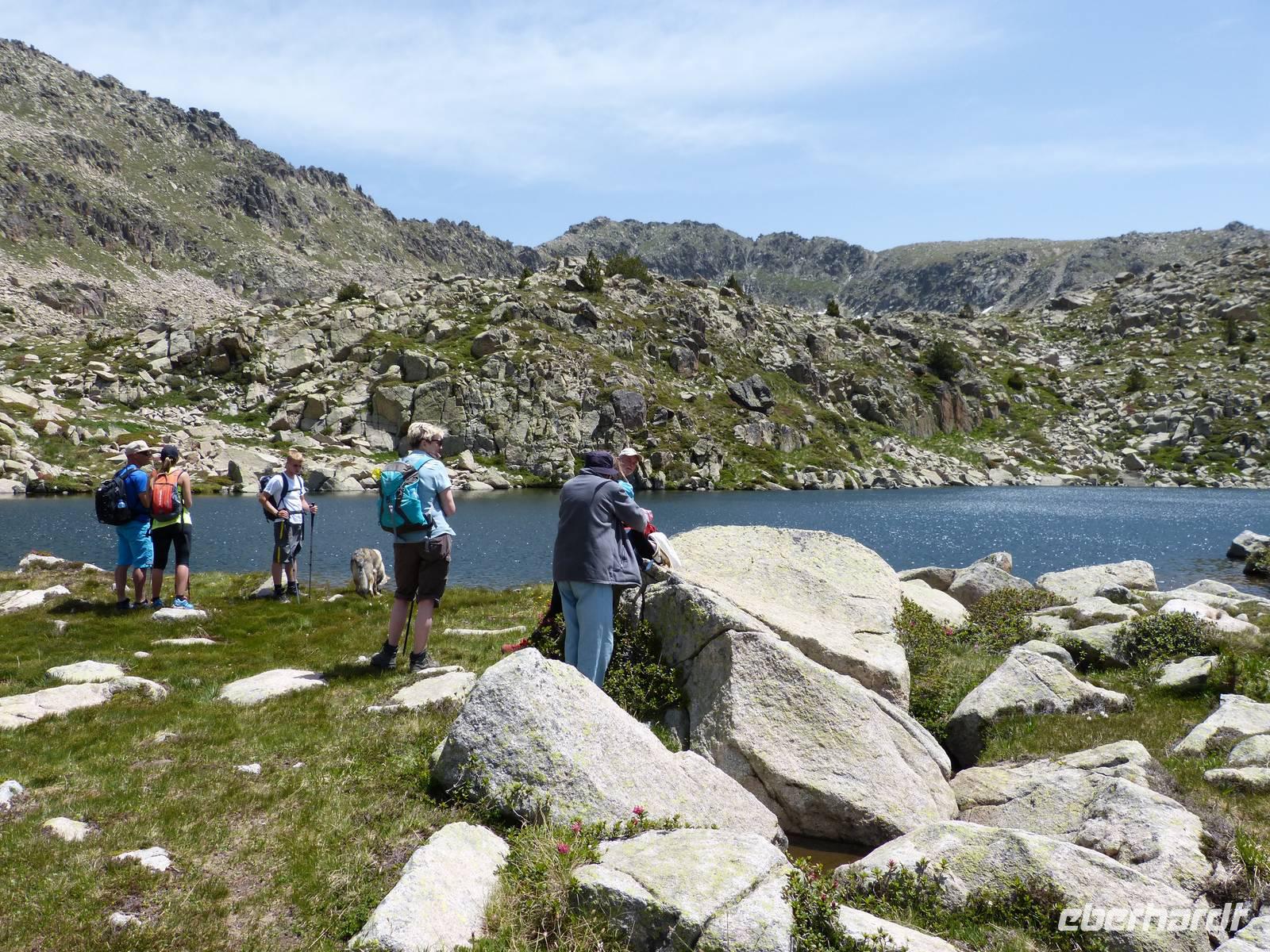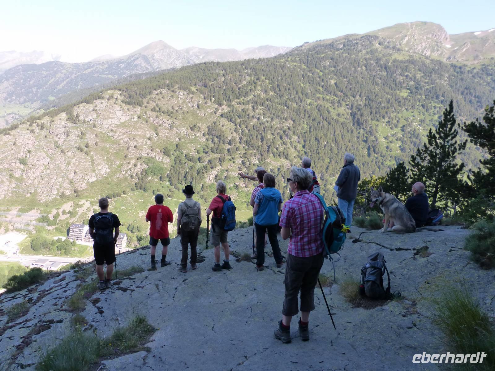 Unsere heutige Tour begann direkt am Hotel und führte uns durch die wunderschöne Natur Andorras. Auch hatten wir ab heute treue Begleiter an unserer Seite- Rika und Luc, die beiden Hunde von Marco kamen mit auf Wanderschaft. Bei einem ersten Anstieg im Schatten, streiften wir durch das satte Grün des Waldes und kamen schließlich zu einem Pfad mit einem wunderschönen Panorama auf das Tal von Incles. Von hier ging es weitere Meter nach oben, und unsere Anstrengung wurde durch eine entspannte Mittagspause an dem Bergsee von Siscaro entlohnt. Nach dem Mittag verabschiedeten wir uns vorerst von Manfred, da dieser mit Joel zusammen, den etwas entspannteren aber genauso wunderschönen Weg direkt ins Tal von Incles vor zog. Der Rest der Gruppe stieg weiter auf, und erlebte einen atemberaubenden Rundum-Blick auf die Bergwelt von Andorra. Der Abstieg verlief dann ähnlich - Trittsicherheit war gefragt und der ein oder andere Gebirgsbach kreuzte unseren Weg. Am Hotel kamen wir dann kurz versetzt am Nachmittag an. Wir genossen die letzten Sonnenstunden des Tages bei einer Tasse Kaffee, suchten eine Erfrischung im Pool oder nutzten die am Haus gelegene Seilbahn um ein kühles Bier mit toller Aussicht zu genießen.