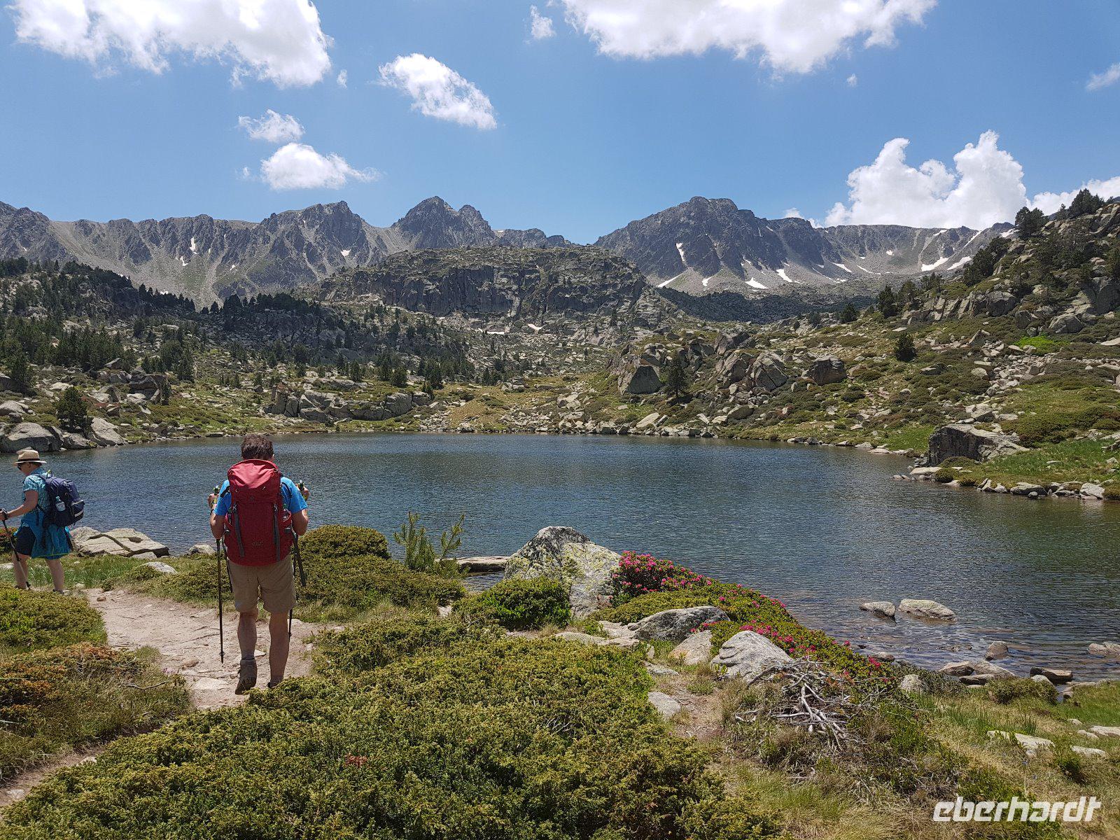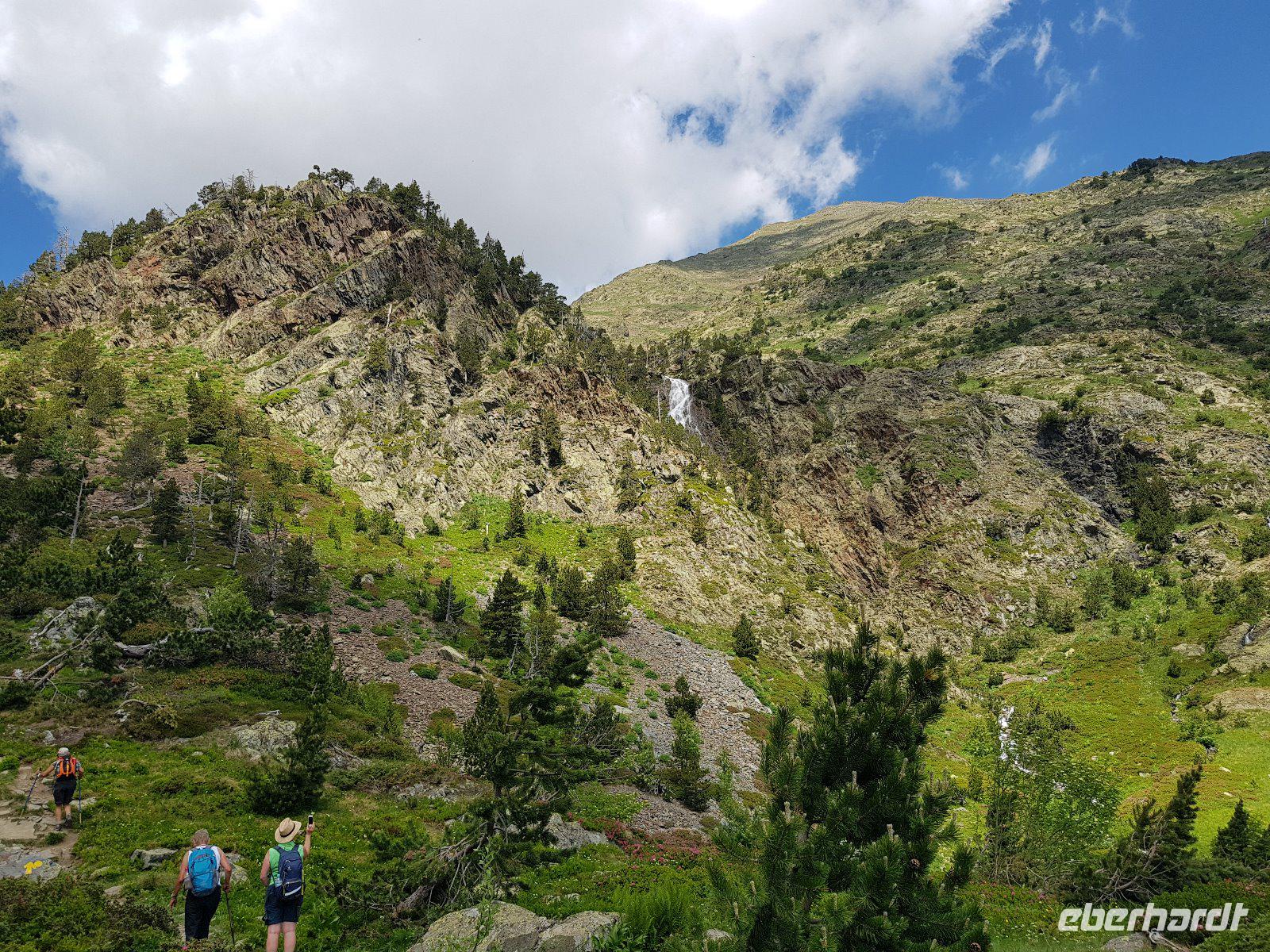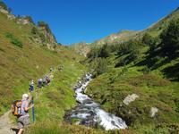 Am letzten Tag unserer erlebnisreichen Reise wollen wir in Nordwesten am Fuße des höchsten Gipfels in Andorra wandern - dem Comapedrosa (2.943 m). Wir starten oberhalb von Arinsal und es geht stetig bergauf, entlang von Wasserfällen, die vom Comapedrosa gespeißt werden. Sehr romantisch, vor allem bei dem herrlichen Wetter und den wunderschönen Alpenrosen, die uns immer wieder begleiten. Nach dem Anstieg auf ca. 2.300 m erreichen wir eine Schutzhütte, die an einem Bergsee gelegen ist. Die ganz mutigen unter uns (so auch Marco) nutzen diese willkommene Abkühlung für eine kurze runde baden und schwimmen. Alle anderen konnten natürlich auch nur die Füße reinstrecken. Nach dieser langen und gemütlichen Mittagspause geht es den gleichen Weg zurück. Nach dem Abstieg genehmigen wir uns nochmal eine kühle Erfrischung auf der Terrasse eines netten andorranischen Restaurants. Wir lassen unseren letzten Wandertag ausklingen.