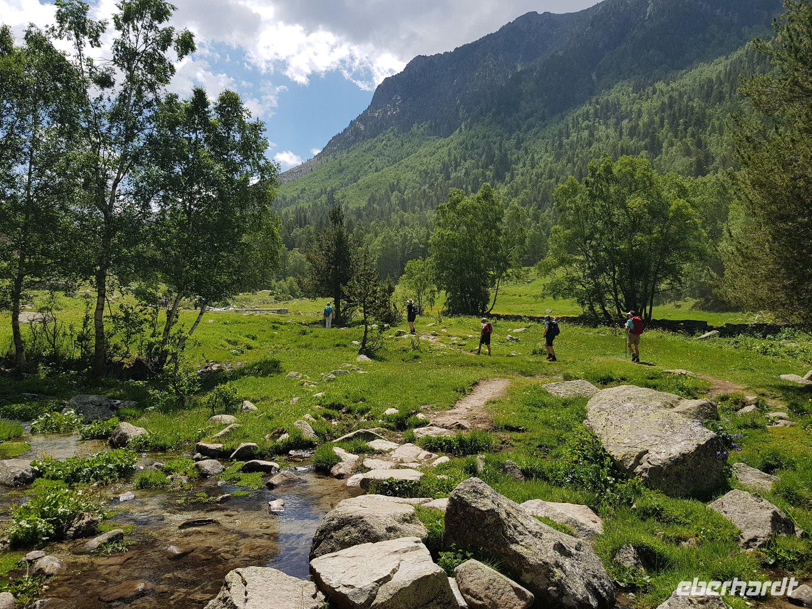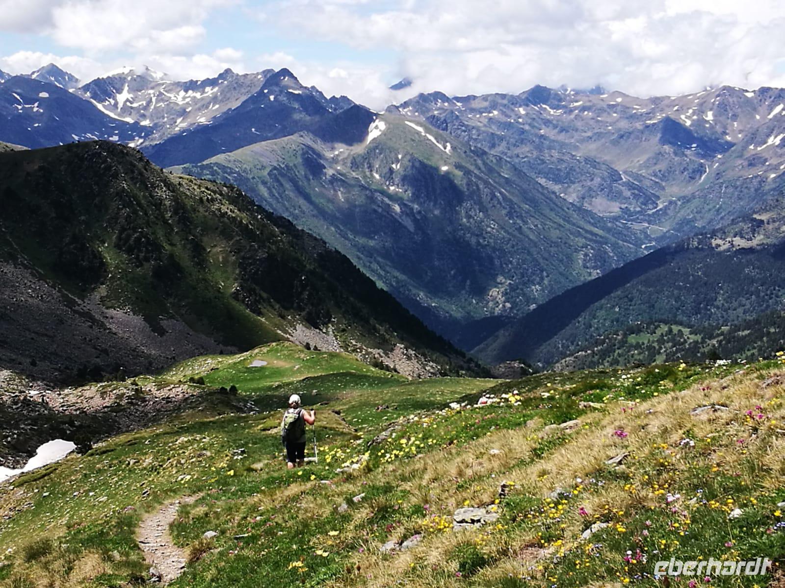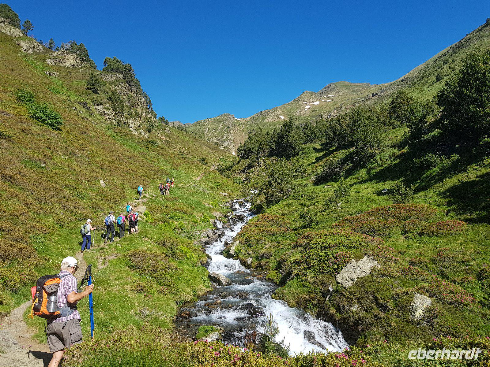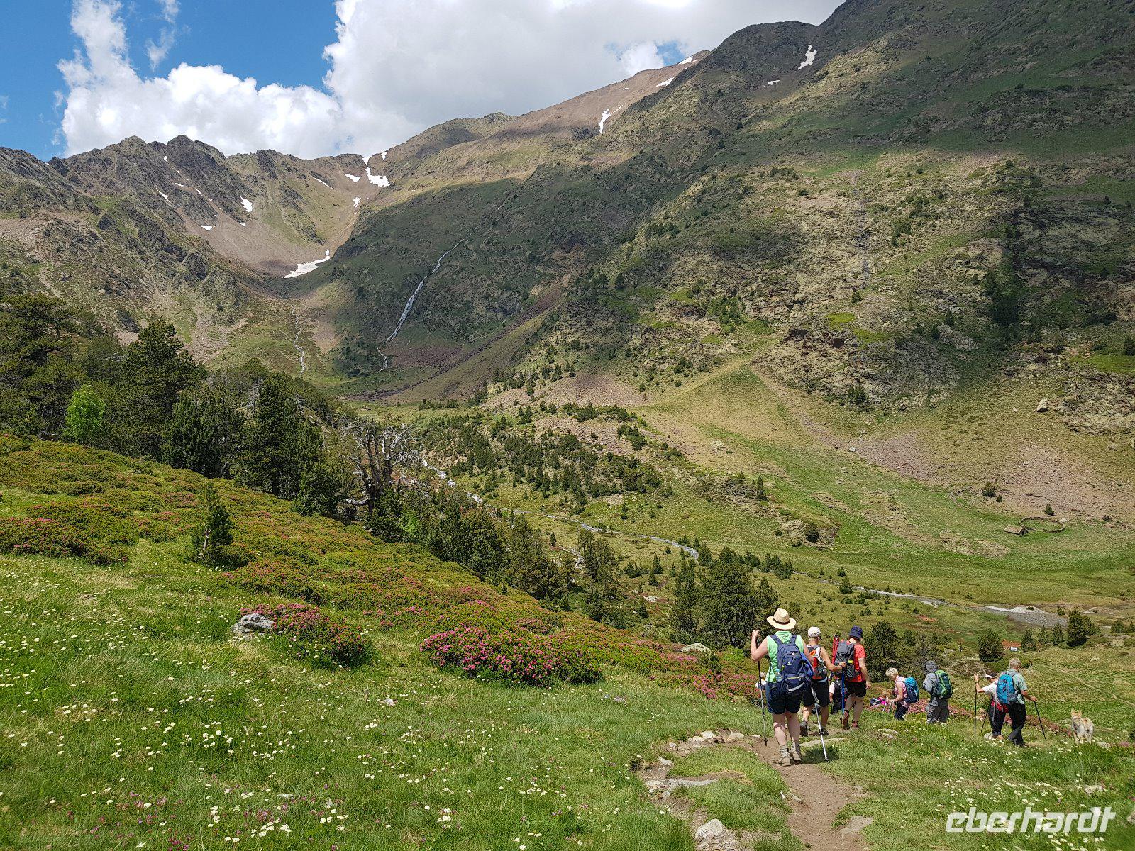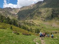 Die Wanderung am heutigen Tag ist fast schon eine botanische Exkursion - die Pflanzenvielfalt im Tal von Incles ist schlicht überwältigend zu dieser Jahreszeit. Es erwarten uns Alpenrosen, Trollblumen, Enzian in blau und gelb, diverse Hornklee Sorten, wilder Thymian und vieles mehr. Wir starten praktischerweise direkt an unserem Hotel, zunächst über einen ersten steilen Anstieg Richtung Vall d' Incles. Danach kurz verschnaufen und entspannt weiter durch eine schöne Waldpassage. Dann geht es wieder bergauf Richtung Siscaro Tal, mit seinen beiden Bergseen Siscaro und Baix. Beide von unglaublicher blauer Farbe und glasklaren Wasser. Wir wollen aber noch weiter hoch hinaus auf knapp 2.500 m auf den Kamm des Port Dret. Dafür entscheiden wir uns für die anspruchsvolle Variante - einen steilen Anstieg, der mit einem atemberaubenden Blick über das Siscaro Tal belohnt wird. Den Abstieg machen wir dann direkt über Bergwiesen ganz entspannt zurück zum Hotel, wo der Ginster noch so herrlich duftet. Wir beenden den Tag gemeinsam bei einem schönen Heiß- oder Kaltgetränk.