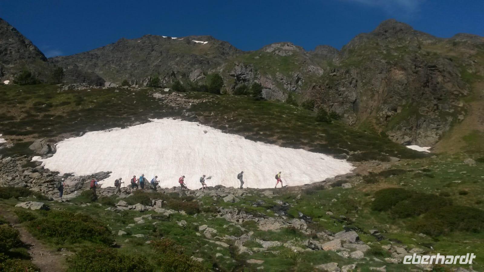 Wir starten heute Richtung französische Grenze südwestlich von Soldeu bis in das Skigebiet von Grandvalira/ Grau Roig. Von hier starten wir unsere Rundwanderung hinauf zu malerischen Bergseen. Insgesamt gibt es in der Region von Pessons 15 große und kleine Bergseen. Wir versuchen mitzuzählen, aber irgendwann verliert man einfach den Überblick - viel zu schön ist die Landschaft, die sich uns bietet. Glasklare Bergseen vor einem riesigen Bergpanorama und hinter jeden weiteren kleinen Anstieg versteckt sich schon der nächste See. So schreiten wir voran bis wir uns entscheiden müssen - eine Gruppe wagt den letzten Aufstieg von ca. 100 Höhenmetern bis zum letzten See am Fuße des Pic de Montemalus (2.781 m) während die andere bereits mit dem Picknick am vorletzten Bergsee startet. Für die Wanderer, die noch Energie hatten, hat sich der Ausblick von 2.500 m auf die Seenplatte von Pessons auf jeden Fall gelohnt. Nach einer kurzen Mittagspause starten beide Gruppen wieder zurück entlang an weiteren Seen bis zur Berghütte von Pessons, wo wir auf ein kühles Getränk einkehren. Anschließend geht es auf den „Skipisten" Tal abwärts, wo bereits unser Bus auf uns wartet. Es war eine wirklich wunderschöne Wanderung im Kessel von Pessons.