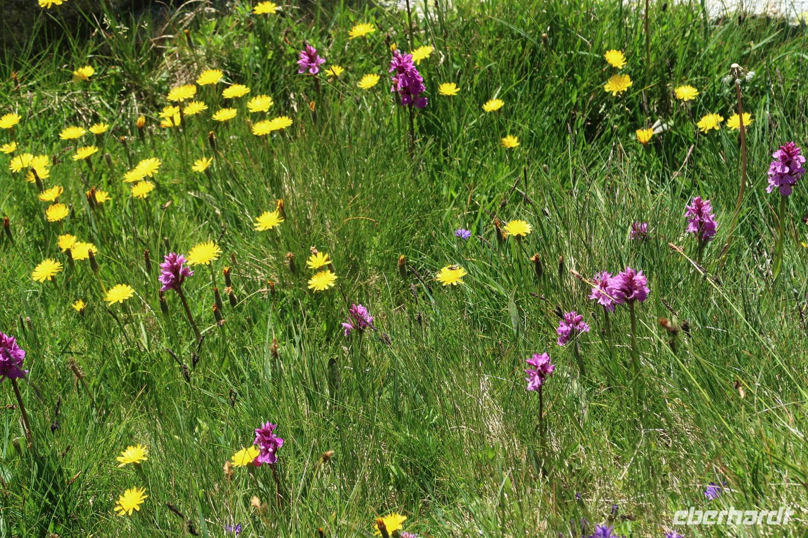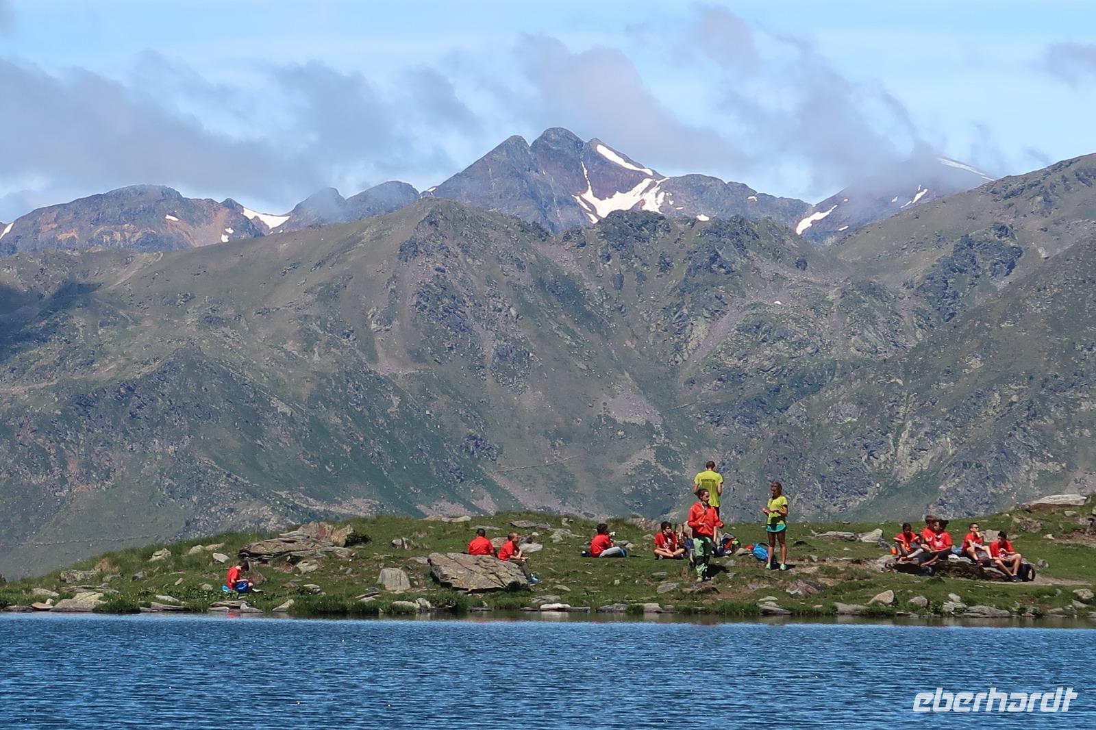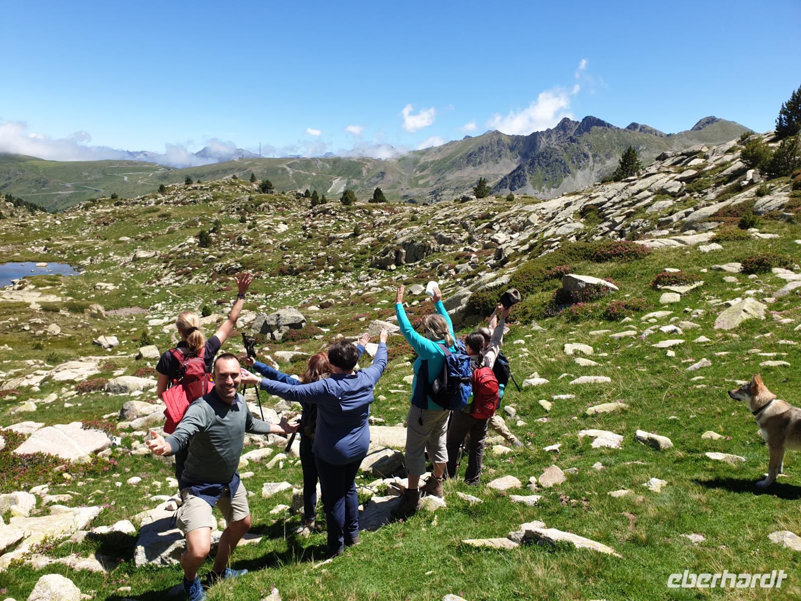 Nach dem Frühstück begaben wir uns auf unsere für diese Reise letzte Wanderung. Wir fuhren zu nächst nach Ordino und von hier weiter zum Eingang des Sorteny Parks, einem der beliebtesten Wandergebiete in Andorrra. Heute steht eine Gipfelbesteigung auf unserem Wanderprogramm. Unser Chauffeur bringt uns zunächst zum Rialbparkplatz auf 1.800 Metern. Wir starteten unsere Tour mit einem breiteren Weg und hielten zudem an einem kleinen Botanischen Garten, welcher vor allem die Artenvielfalt der Pflanzen dieser Region darstellte. Im Anschluss liefen wir wieder an einem kleinen Bach entlang und ein Anstieg von knapp 400m lag vor uns. Vorbei an wunderschönen Bergwiesen ging es zu einem herrlich gelegenen Bergsee in 2350m Höhe. Ab hier ist die Wanderung anspruchsvoll und einige Gäste bleiben lieber hier mit Benjamin, wo die Möglichkeit zum Baden in dem Bergsee zur Wahl ist und der ein oder andere wagte die Erfrischung.