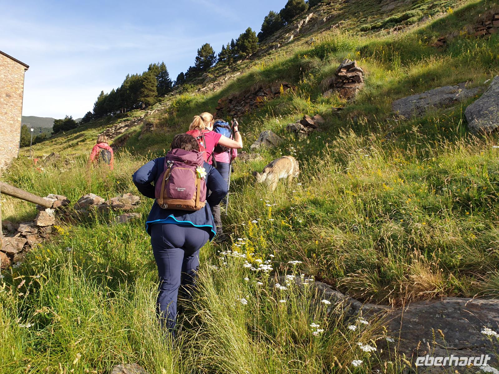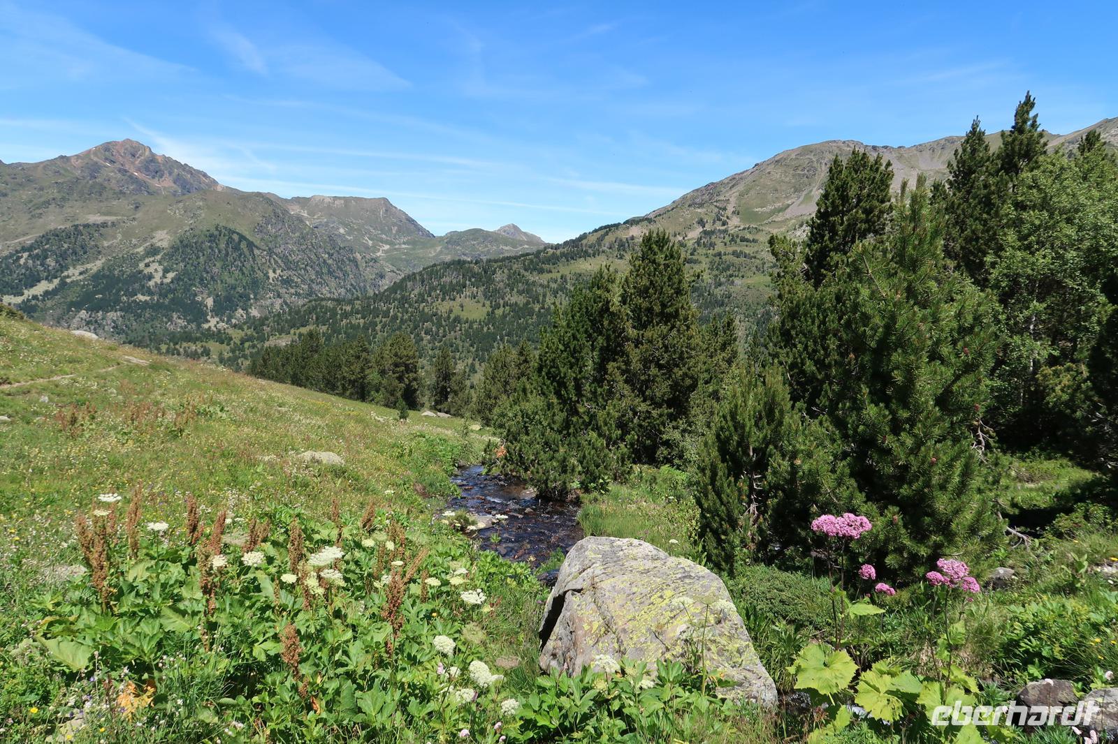 Diese 12 km moderate bis anspruchsvolle Wanderung führt uns durch dichte Wälder aus Kiefern, Pinien und Birken hinauf zu großartigen Aussichtspunkten. Die Wanderung startet nicht weit vom Engolasters See auf 1.600 Meter. Es folgt ein erster Aufstieg bis zum Coll Jovell Pass auf 1.780 Meter. Nach dem ersten Aufstieg des Tages verschnaufen wir schon beim Panorama Blick und steigen langsam ab in das Tal Madriu. Auf Weg wandern wir gemächlich an der alten Siedlung Ramio vorbei. Weiter folgen Sie einem Höhenweg mit kleinen Auf- und Abstiegen bis zur Fontverd-Berghütte. Hier machen wir an der neu renovierten Fontverd Berghütte eine Pause und genießen die Ruhe und das Rauschen des Flusses. Einige mutige strecken sogar die Füße hinein, was eine gute Abkühlung bringt.
