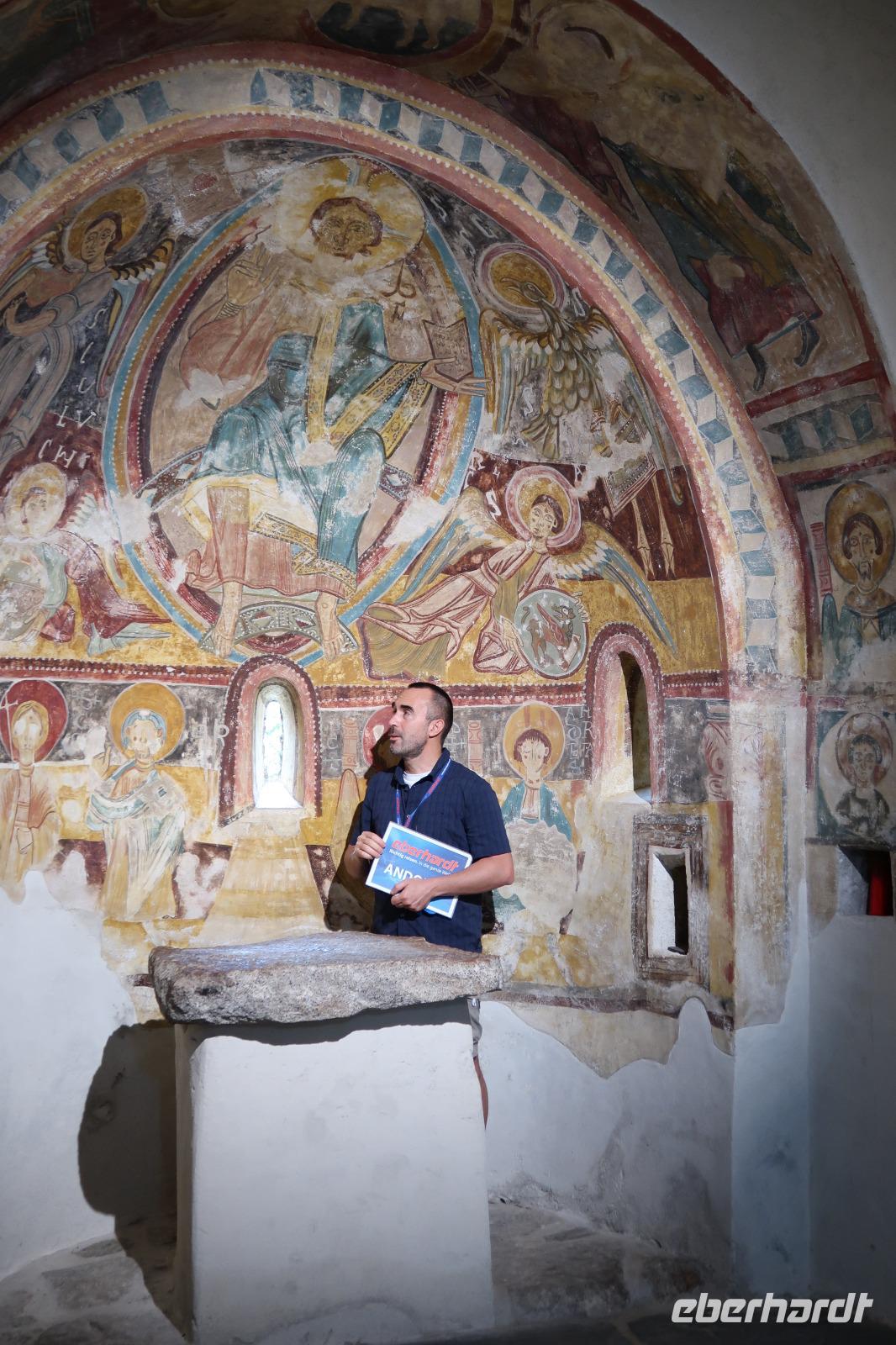 Unsere Wanderung führt uns durch das von der UNESCO zum Weltnaturerbe ernannte Gletschertal Vall del Madriu, das auf engem Raum ein Bild davon gibt, wie die Menschen in der Vergangenheit und heute im Einklang mit der Natur unter den kargen Bedingungen der Pyrenäen lebten und leben. Einsamkeit und Ruhe finden Sie hier in Kombination mit einem prächtigen Naturpanorama. Wir halten erstmal bei der kleine Kirche Sant Miquel d'Engolasters, wo Marco uns heute schon kurz einen kleinen Vorgeschmack auf unsere bevorstehende Wanderwoche. Wir kommen auf eine Aussichtsplattform von der aus wir in das Tal von Andorra La Vella - der Hauptstadt blicken können.