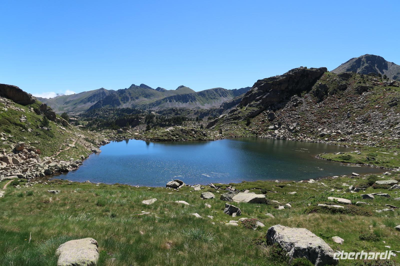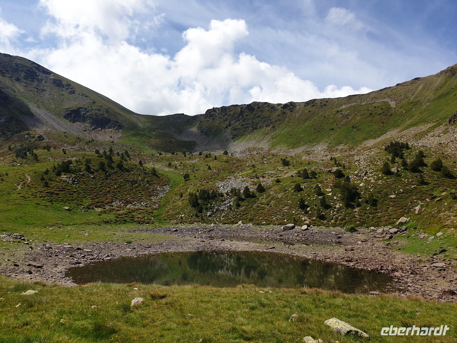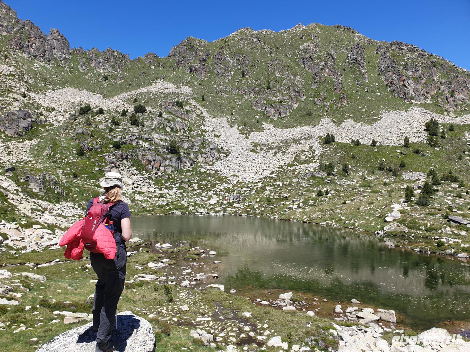 Heute holte uns erneut Emilio vom Hotel ab und wir fuhren bergauf, bis wir im Skigebiet Grau Roig ankamen. Das Skigebiet ist besonders bei Skifahrern beliebt, doch auch im Sommer bietet es mannigfaltige Eindrücke und Natur pur. Von hier startete unsere Tour entlang der malerischen Bergseen von Andorra. Es ist eine Rundwanderung hinauf zu malerischen Bergseen. Insgesamt gibt es in der Region von Pessons 15 große und kleine Bergseen. Wir folgten für eine kurze Weile der Skistrecke und bogen dann rechts auf einen Waldweg ab. Über Stock und Stein ging es bergauf durch einen Kiefernwald und es dauerte nicht lang, bis wir am ersten Bergsee, dem Estany dels Pessons, ankamen. Wir wandern zunächst bis zum See Estany Primer, wo sich die Gruppe aufteilen könnte. Aber da heute unsere letzte Wanderung ist und da Gipfelbesteigung schon hinter uns ist, wollen wir alle uns weniger anstrengen und einfach zu den verschiedenen Seen unterhalb der Pessons-Berge wandern. Hier könnten wir bis zu 15 Bergseen passieren. Wir versuchen mitzuzählen, aber irgendwann verliert man einfach den Überblick - viel zu schön ist die Landschaft, die sich uns bietet. Glasklare Bergseen vor einem riesigen Bergpanorama und hinter jeden weiteren kleinen Anstieg versteckt sich schon der nächste See.