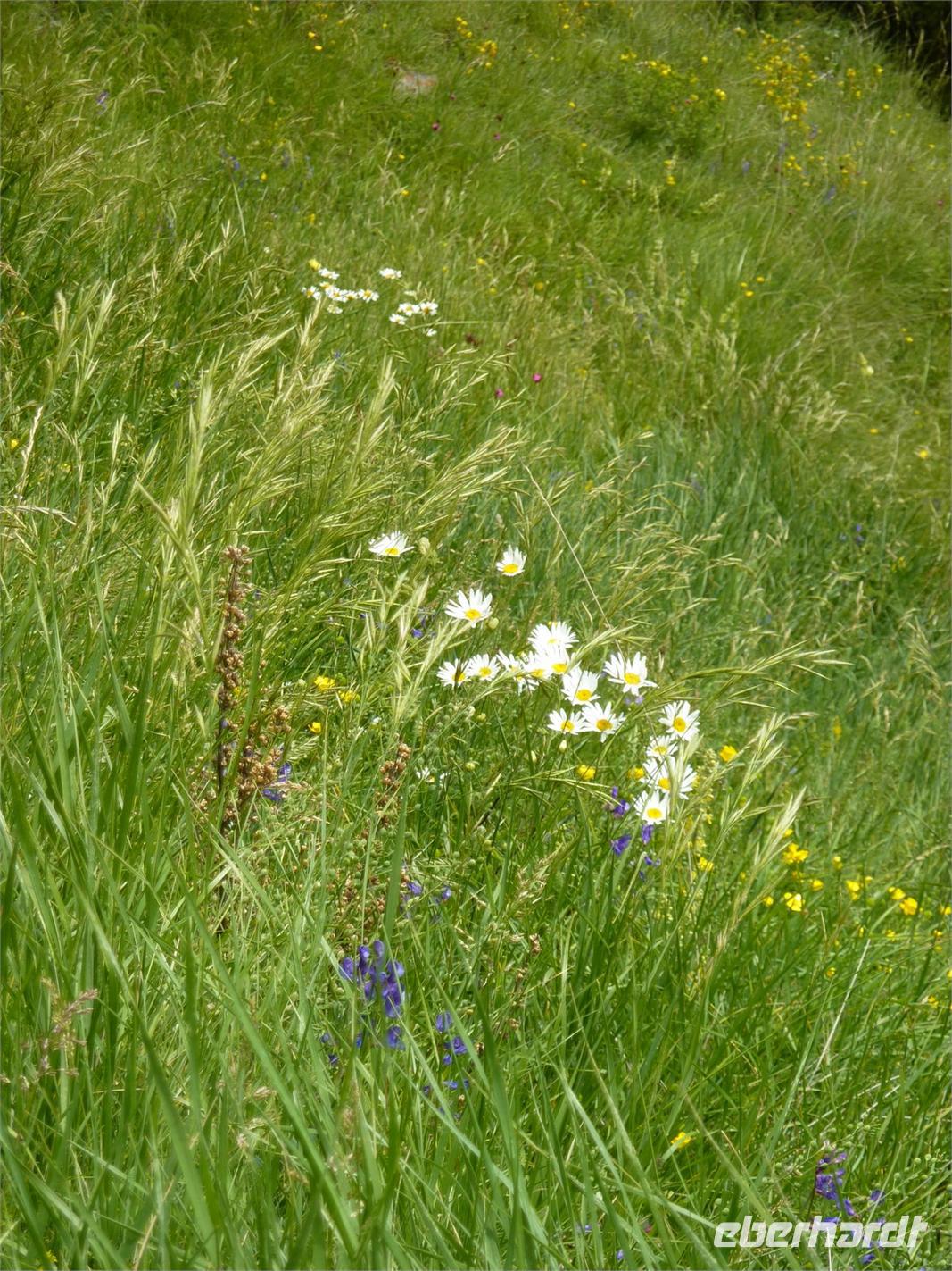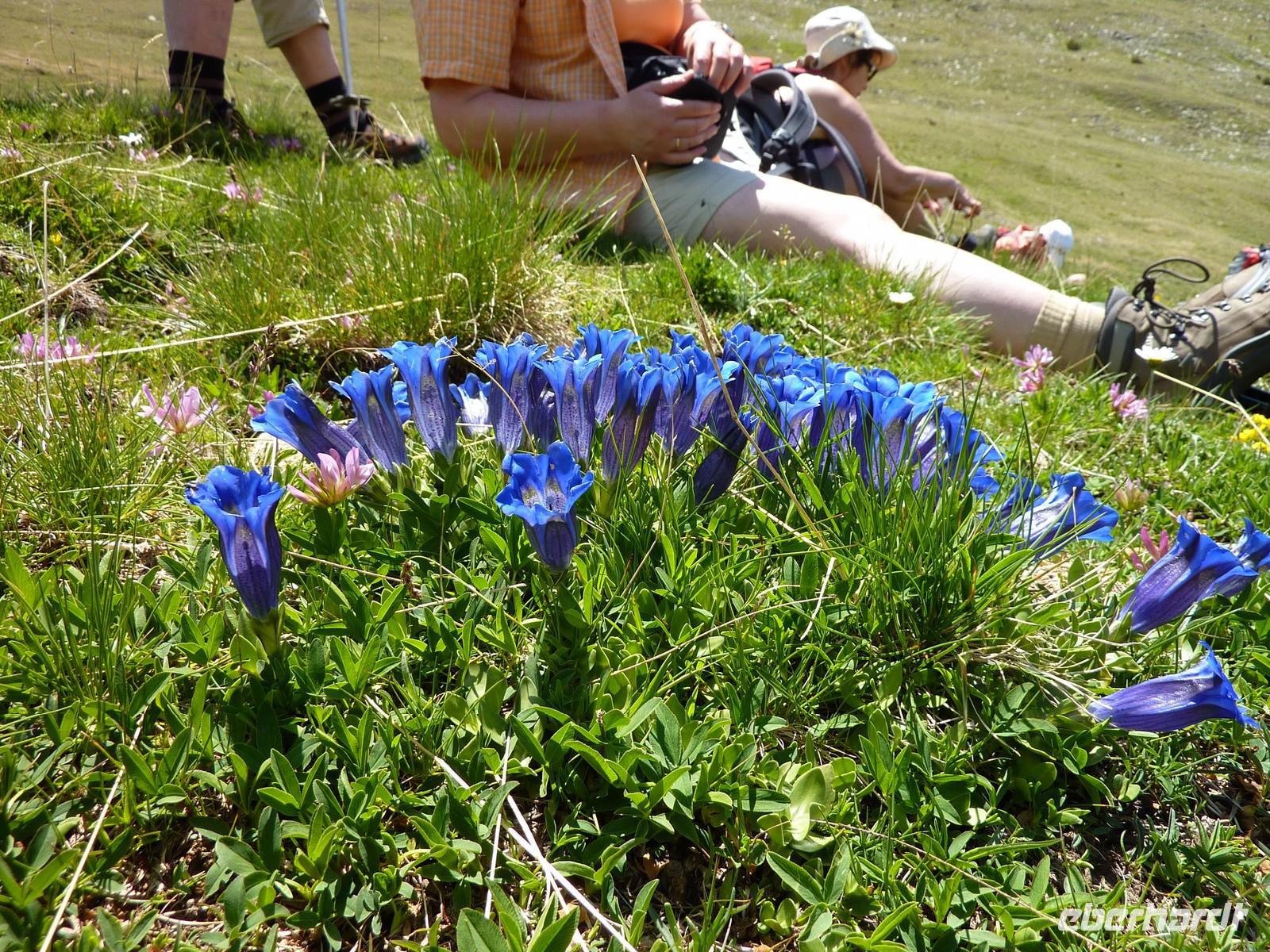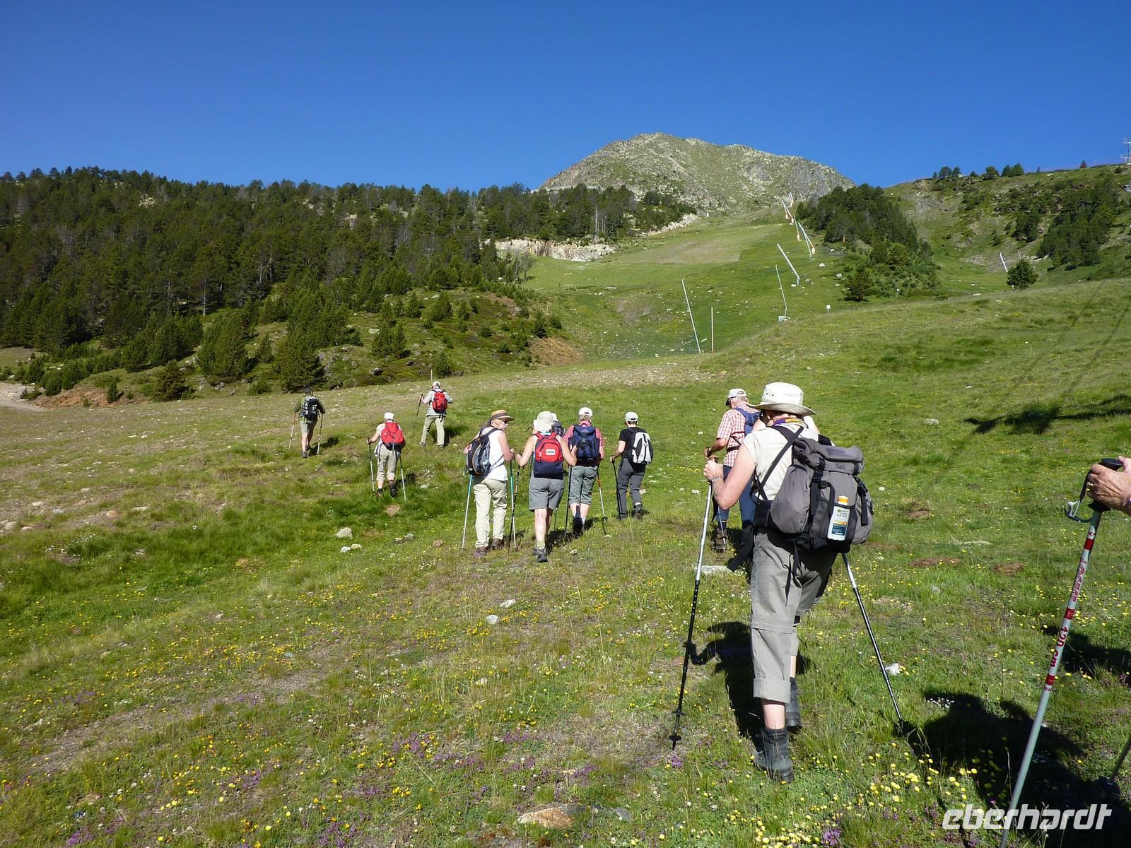 Denn fast alle Gäste hatten nun noch den Ehrgeiz den Pass zum Port Dret zu überqueren, immerhin nochmals 300 Höhenmeter. Und ich habe nicht schlecht gestaunt, das ging zeimlich zügig. Noch ein Pass-Foto und über sanfte Wiesen, zum Teil mit Enzian bestanden, stiegen wir schließlich wieder ab nach Soldeu.