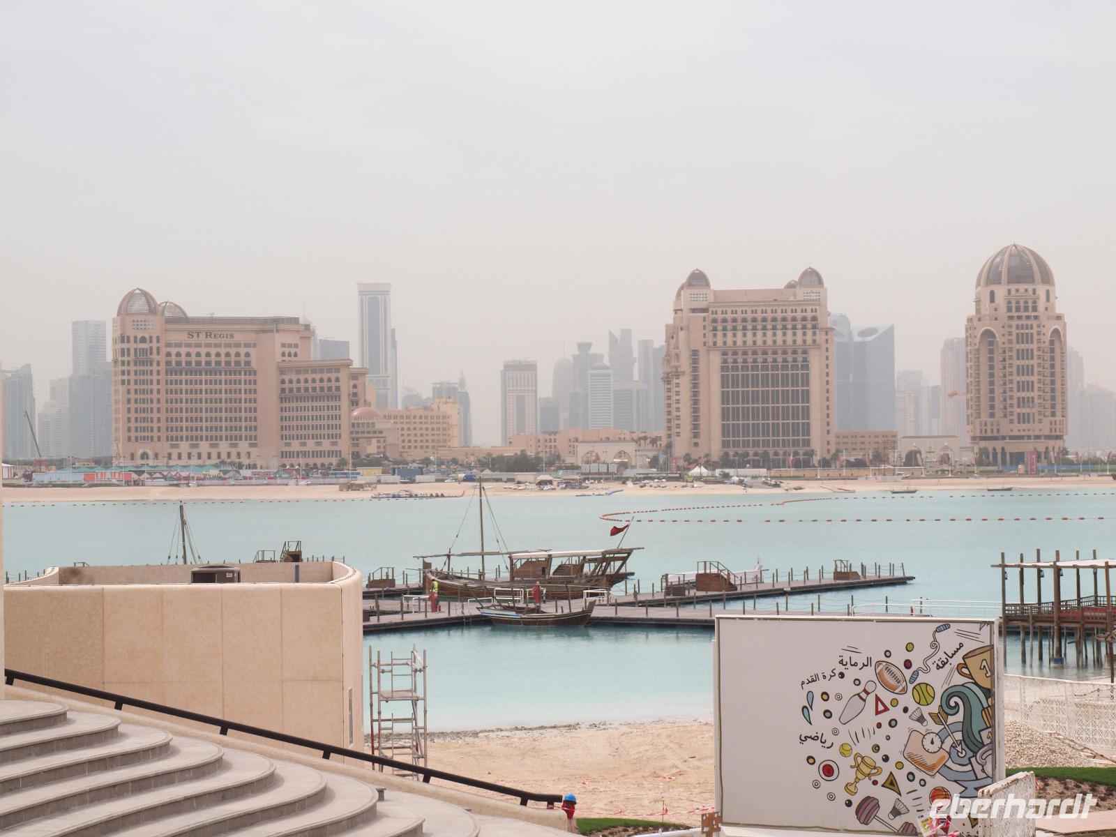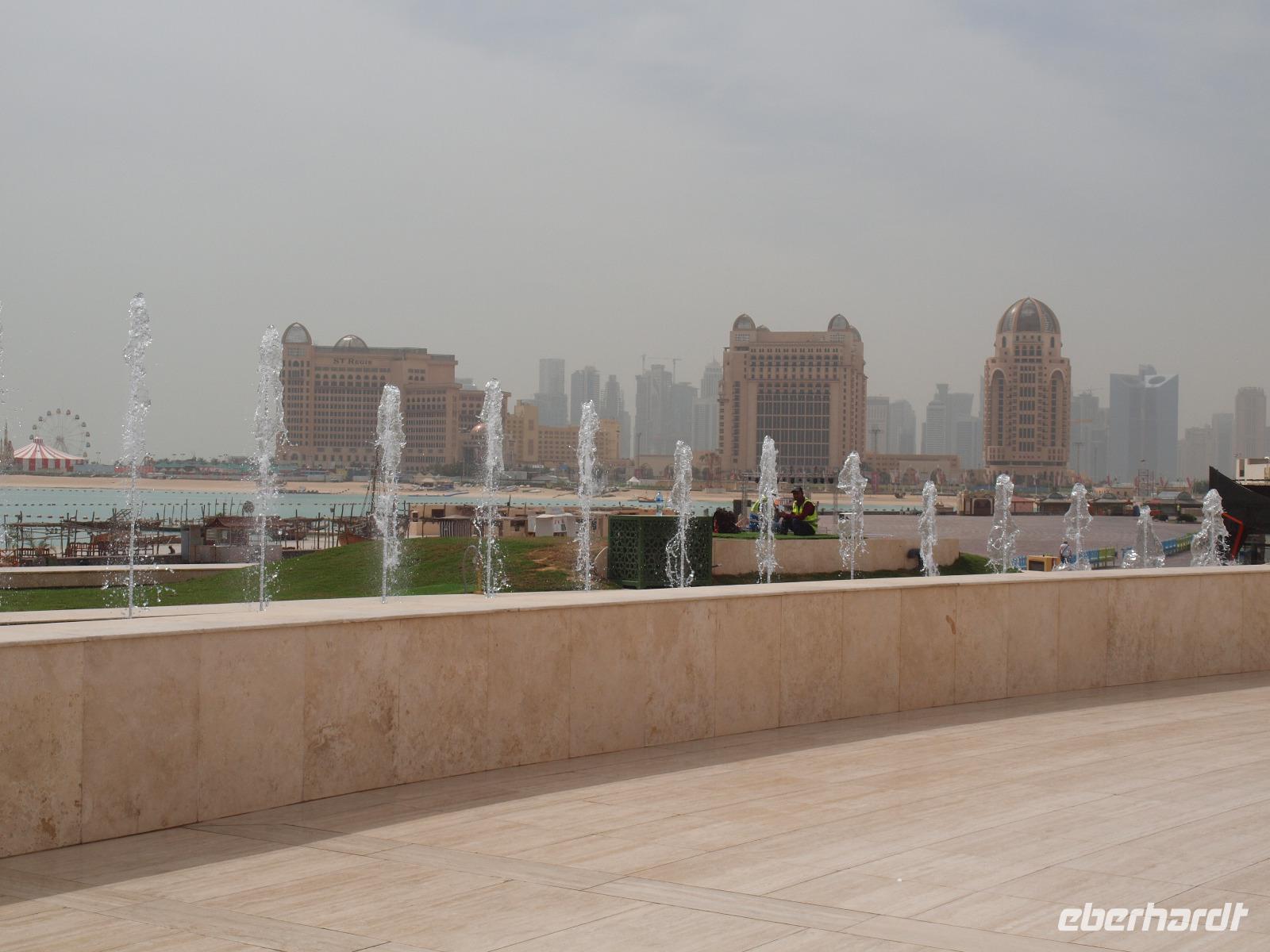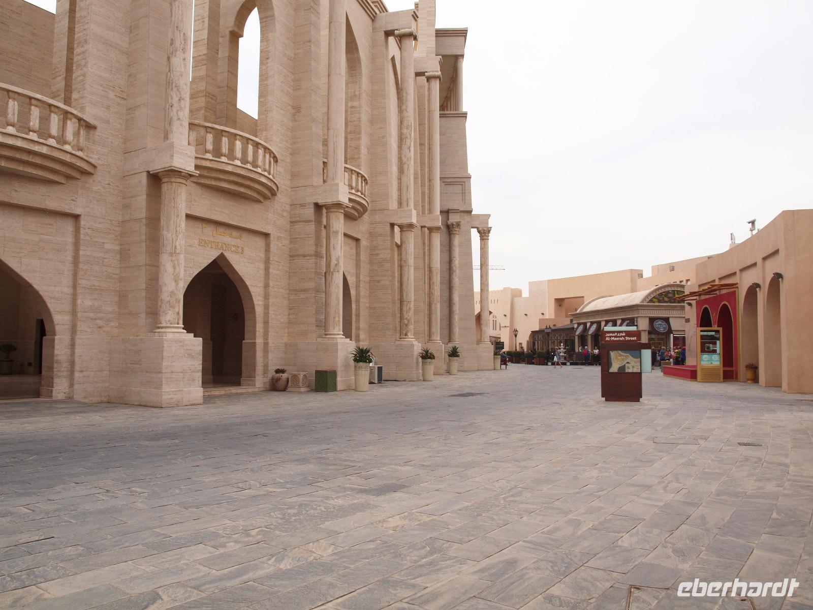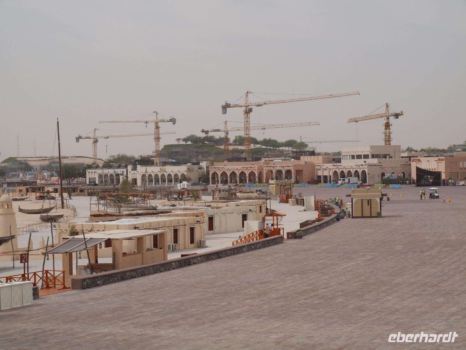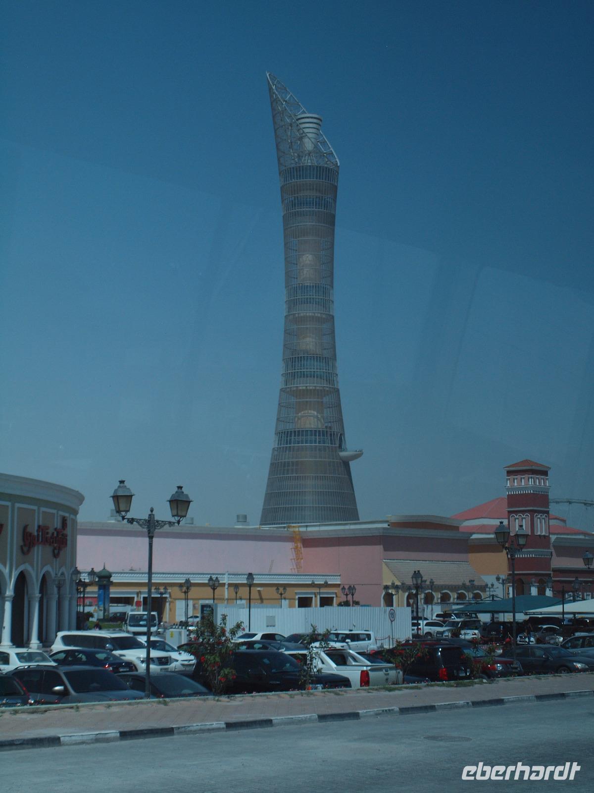 Ein neuer Tag beginnt und ein neuer Reiseleiter, Ayman, nimmt uns heute mit auf Erkundungstour rund um Doha. Wir beginnen im neuen Stadtteil, Katara. Hier entsteht eine Art Kulturdorf. Man möchte in Katara der Geschichte des Landes auf die Spur kommen. Damit sich auch im heißen Sommer die Touristen hier wohlfühlen, hat man sogar Klimaanlagen in den Straßen eingebaut... Vom historischen zum brandneuen Modernen - wir fahren nach Gegenüber, auf die Perle. Hier entsteht auch ein neuer Stadtteil, Lusail. Hier schlendern wir entlang des Yachthafens und der teuren Boutiquen und Autoläden und schnuppern etwas die Luft der Reichen und Schönen von Doha. Es ist nahezu verrückt was hier in den letzten Jahren entstanden ist und auch noch entstehen wird. Wir wissen ja aber, Katar ist das reichste Land in den Golfstaaten und alles was wir sehen ist zu 80% Importware, selbst der Zement für die zahlreichen Baustellen ist importiert... Von Lusail aus trennen uns ein paar Kilometer zum Torch Tower. Hier wird im Moment am neuen Fußballstadion gebaut, Das Khalifa Stadion soll das Größte der insgesamt neun Stadien werden. In unmittelbarer Nähe zum Stadion befindet sich die Villagio Mall. Wir laufen durch die Mall hindurch um auf der anderen Seite, am Torch Tower, raus zu kommen. Die Mall selbst hat viele Highlights zu bieten, unter anderem einen Freizeitpark mit Achterbahn und direkt daneben eine Eislaufbahn. Es ist uns ein wahres Vergnügen hier zu sein.