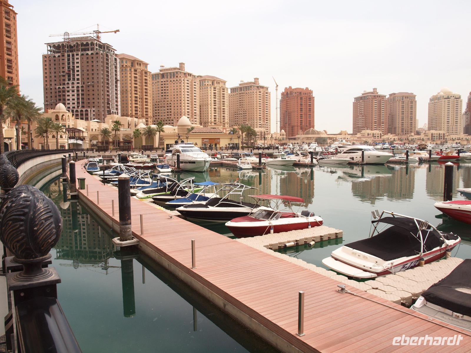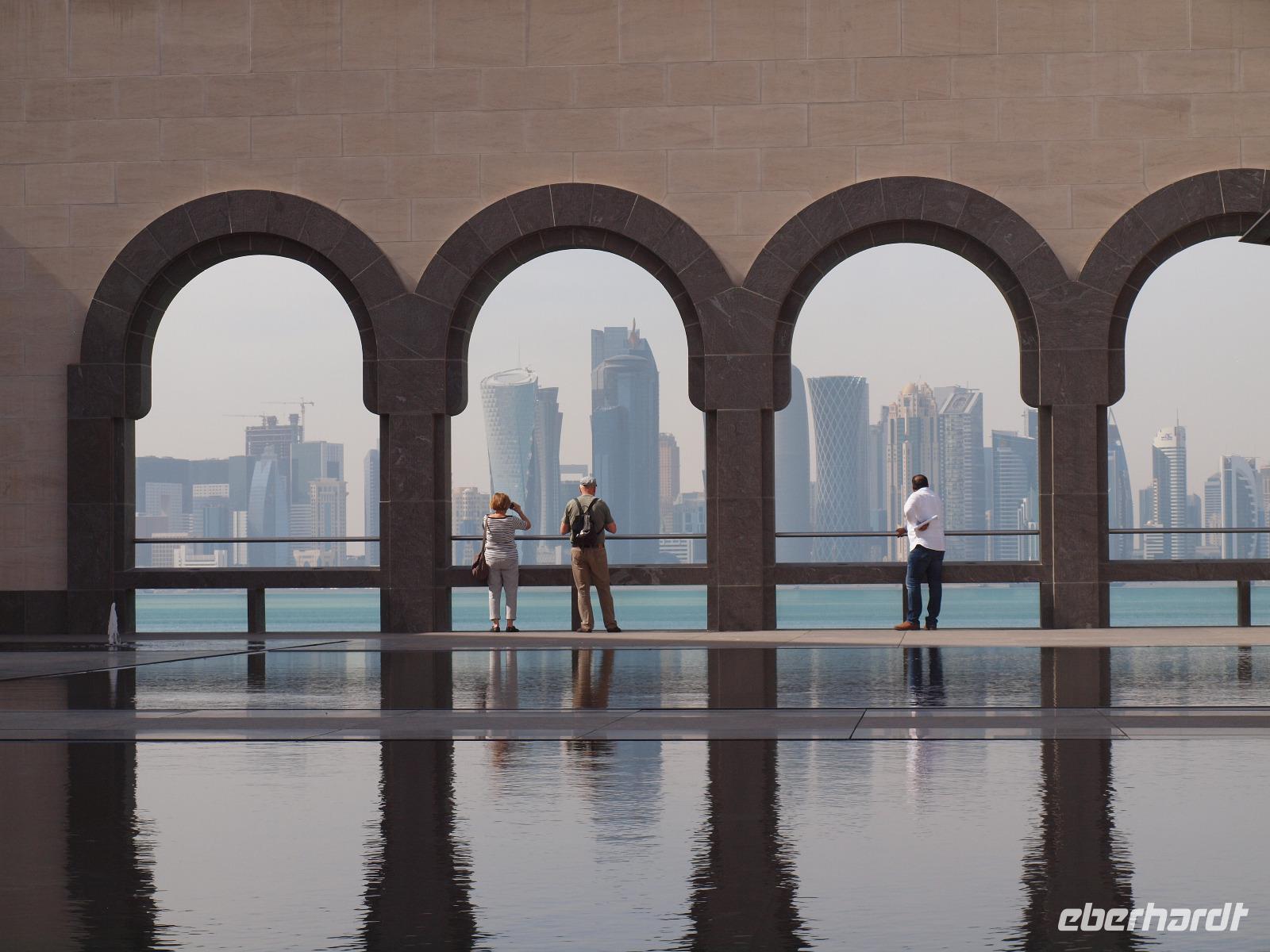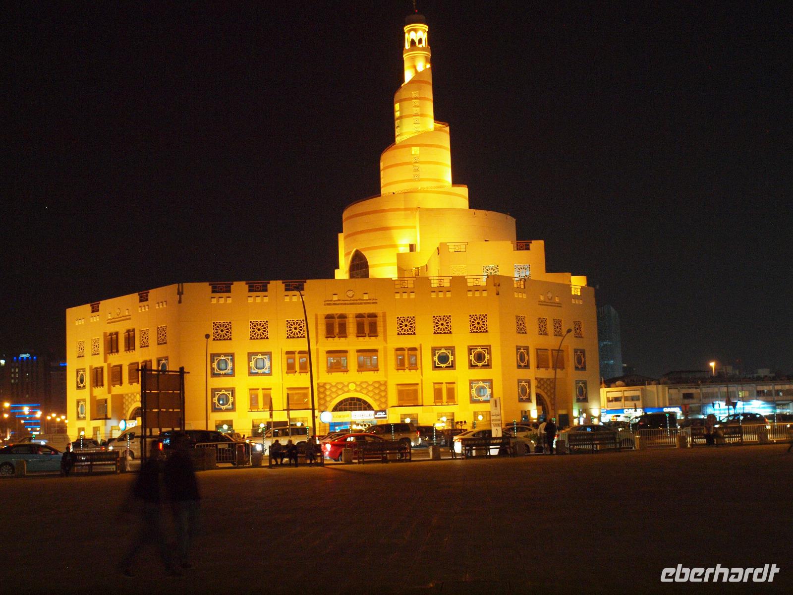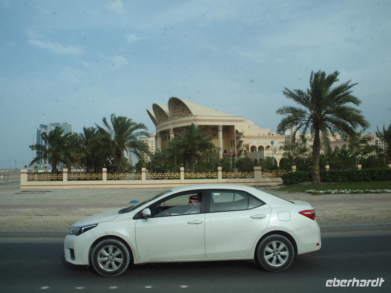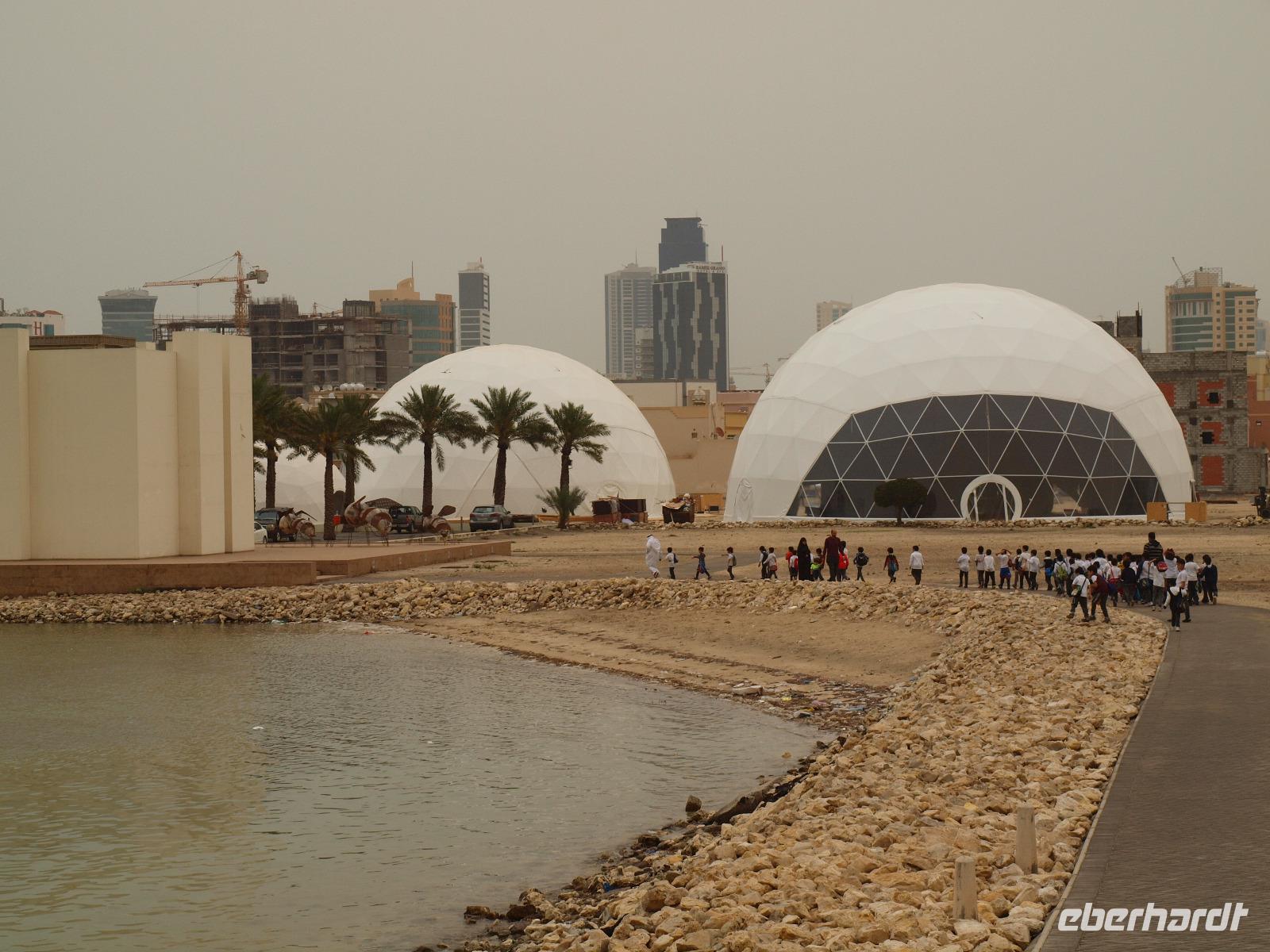Ein neuer Tag beginnt und ein neuer Reiseleiter, Ayman, nimmt uns heute mit auf Erkundungstour rund um Doha. Wir beginnen im neuen Stadtteil, Katara. Hier entsteht eine Art Kulturdorf. Man möchte in Katara der Geschichte des Landes auf die Spur kommen. Damit sich auch im heißen Sommer die Touristen hier wohlfühlen, hat man sogar Klimaanlagen in den Straßen eingebaut... Vom historischen zum brandneuen Modernen - wir fahren nach Gegenüber, auf die Perle. Hier entsteht auch ein neuer Stadtteil, Lusail. Hier schlendern wir entlang des Yachthafens und der teuren Boutiquen und Autoläden und schnuppern etwas die Luft der Reichen und Schönen von Doha. Es ist nahezu verrückt was hier in den letzten Jahren entstanden ist und auch noch entstehen wird. Wir wissen ja aber, Katar ist das reichste Land in den Golfstaaten und alles was wir sehen ist zu 80% Importware, selbst der Zement für die zahlreichen Baustellen ist importiert... Von Lusail aus trennen uns ein paar Kilometer zum Torch Tower. Hier wird im Moment am neuen Fußballstadion gebaut, Das Khalifa Stadion soll das Größte der insgesamt neun Stadien werden. In unmittelbarer Nähe zum Stadion befindet sich die Villagio Mall. Wir laufen durch die Mall hindurch um auf der anderen Seite, am Torch Tower, raus zu kommen. Die Mall selbst hat viele Highlights zu bieten, unter anderem einen Freizeitpark mit Achterbahn und direkt daneben eine Eislaufbahn. Es ist uns ein wahres Vergnügen hier zu sein.