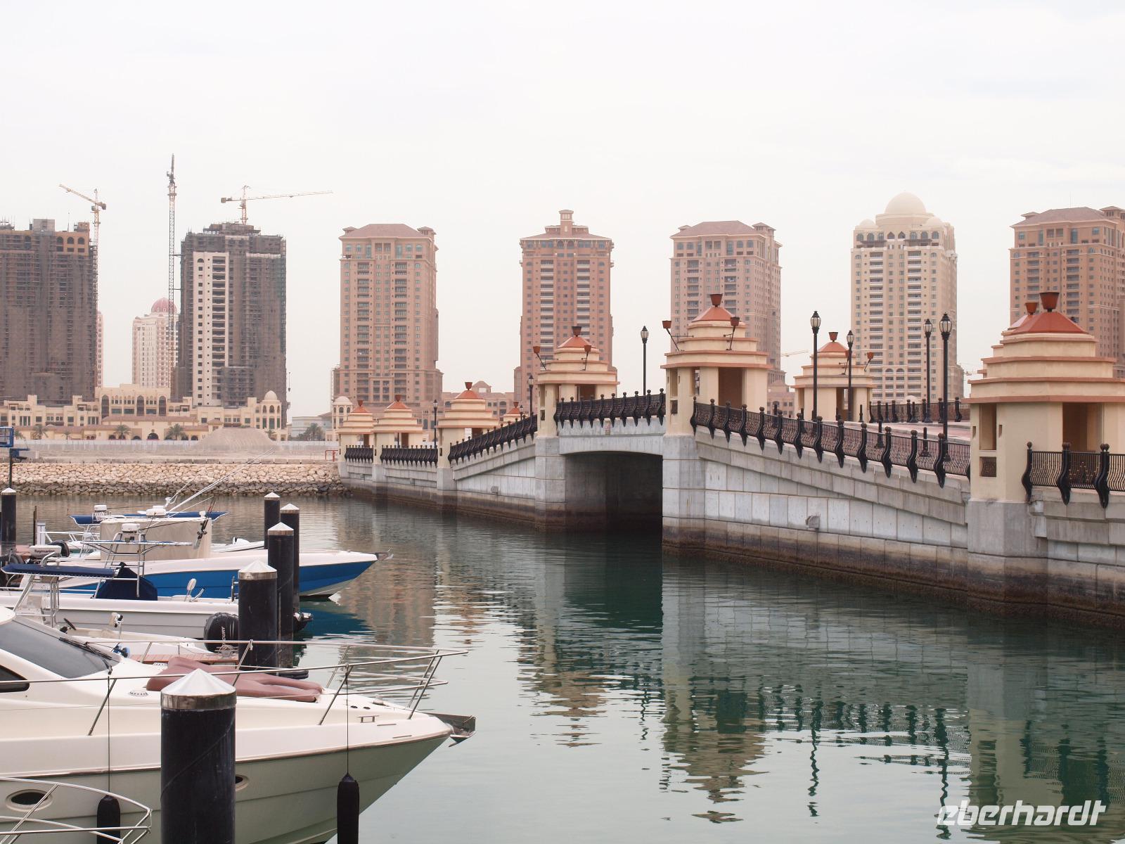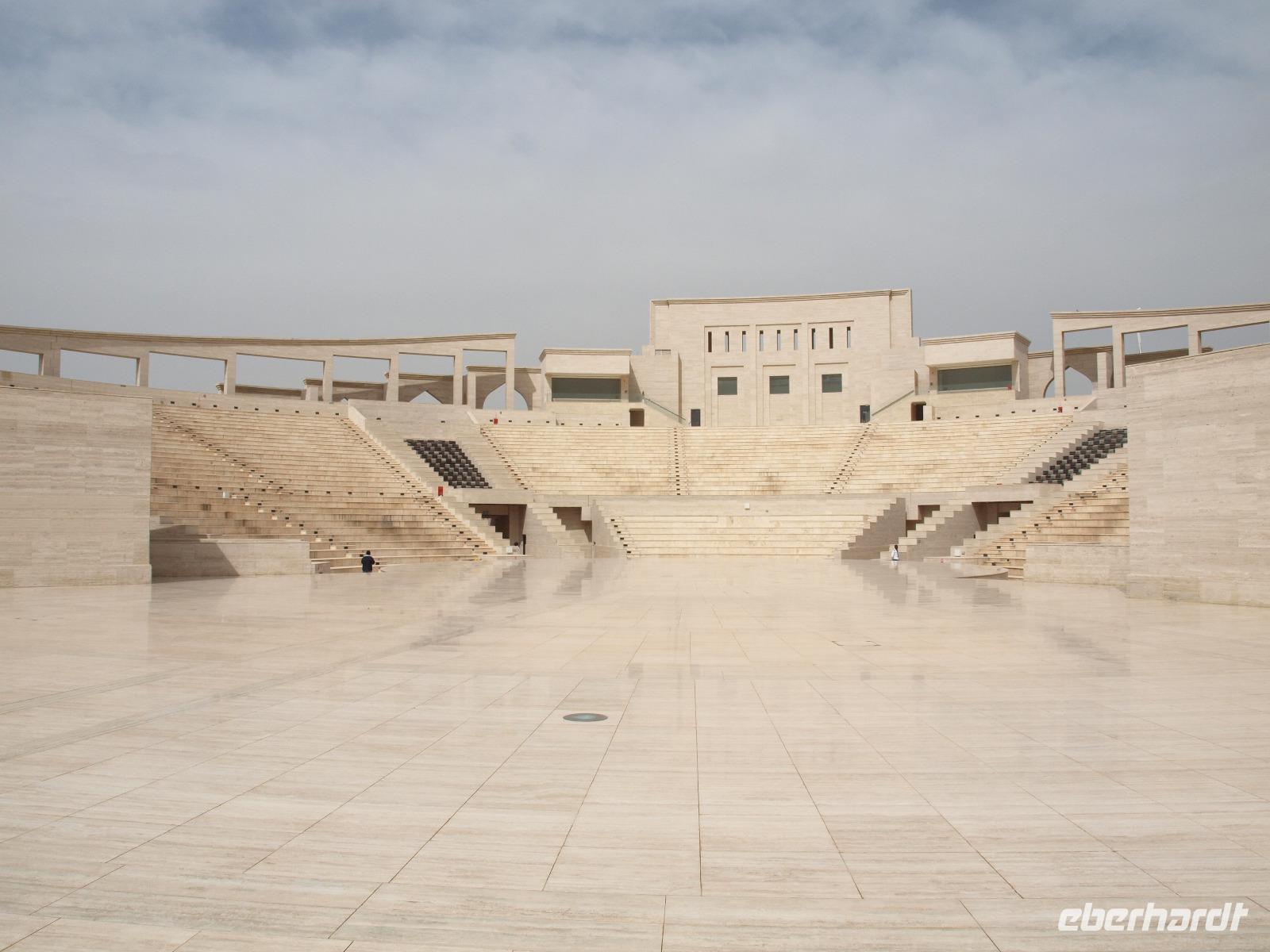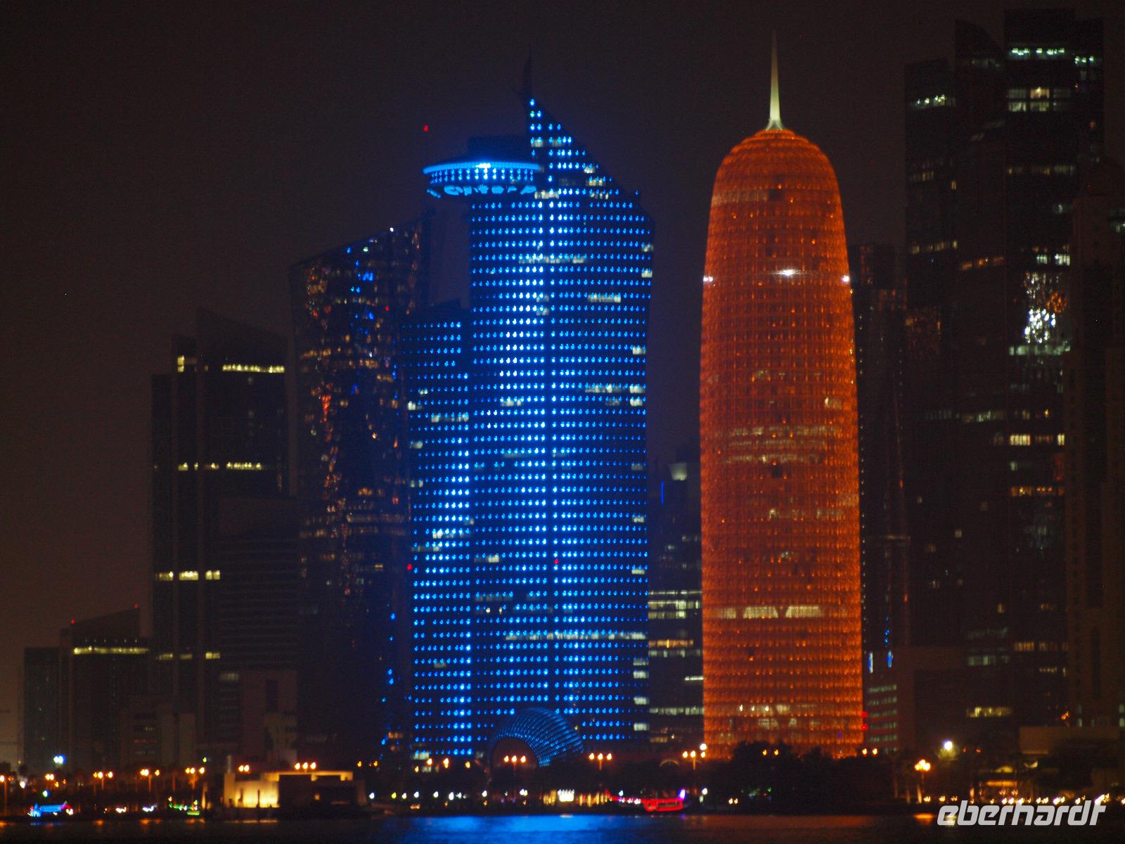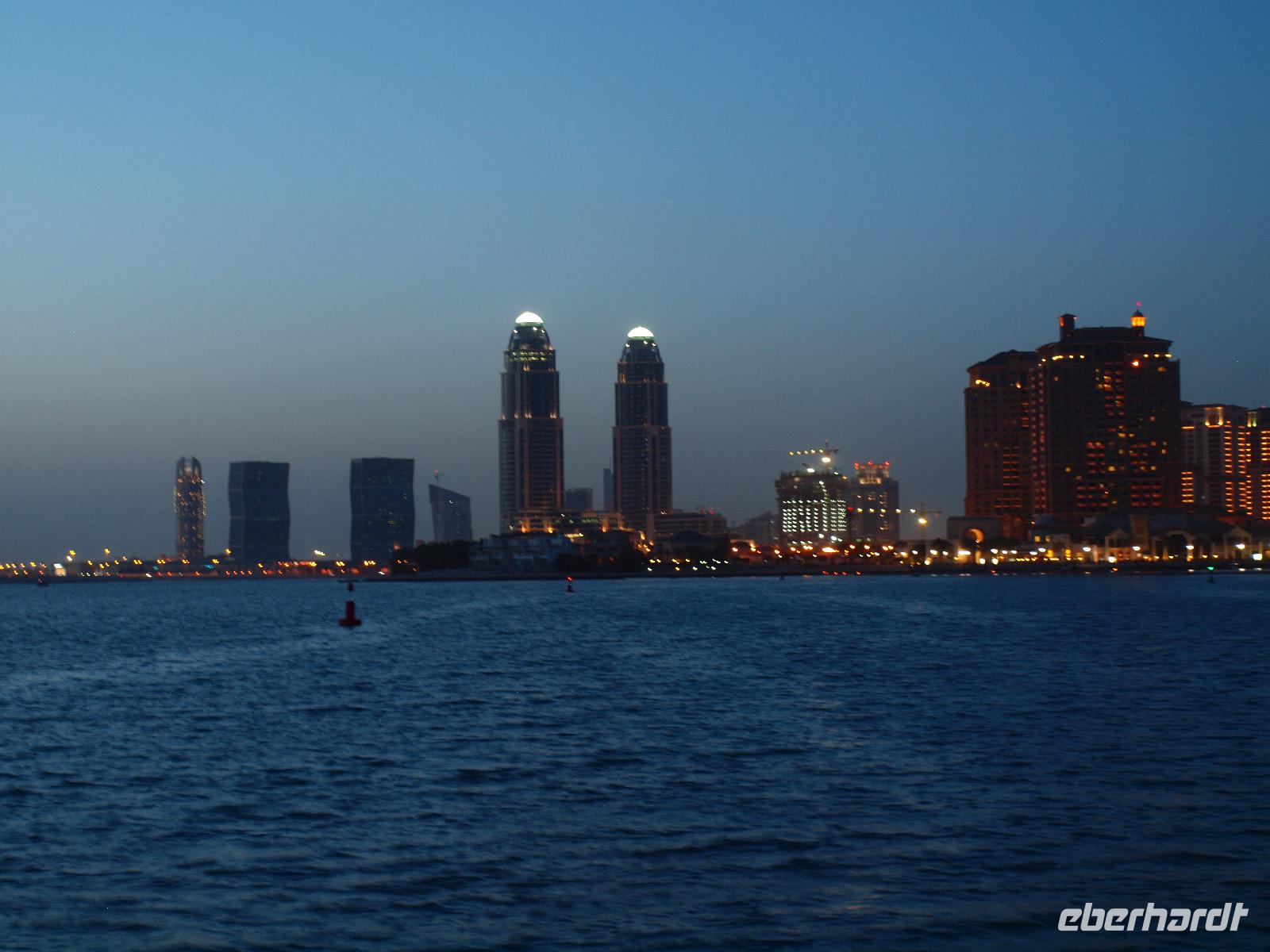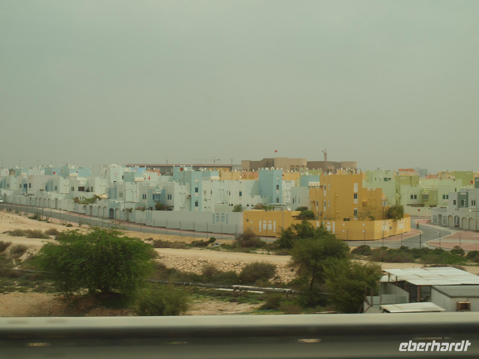 Ein neuer Tag beginnt und ein neuer Reiseleiter, Ayman, nimmt uns heute mit auf Erkundungstour rund um Doha. Wir beginnen im neuen Stadtteil, Katara. Hier entsteht eine Art Kulturdorf. Man möchte in Katara der Geschichte des Landes auf die Spur kommen. Damit sich auch im heißen Sommer die Touristen hier wohlfühlen, hat man sogar Klimaanlagen in den Straßen eingebaut... Vom historischen zum brandneuen Modernen - wir fahren nach Gegenüber, auf die Perle. Hier entsteht auch ein neuer Stadtteil, Lusail. Hier schlendern wir entlang des Yachthafens und der teuren Boutiquen und Autoläden und schnuppern etwas die Luft der Reichen und Schönen von Doha. Es ist nahezu verrückt was hier in den letzten Jahren entstanden ist und auch noch entstehen wird. Wir wissen ja aber, Katar ist das reichste Land in den Golfstaaten und alles was wir sehen ist zu 80% Importware, selbst der Zement für die zahlreichen Baustellen ist importiert... Von Lusail aus trennen uns ein paar Kilometer zum Torch Tower. Hier wird im Moment am neuen Fußballstadion gebaut, Das Khalifa Stadion soll das Größte der insgesamt neun Stadien werden. In unmittelbarer Nähe zum Stadion befindet sich die Villagio Mall. Wir laufen durch die Mall hindurch um auf der anderen Seite, am Torch Tower, raus zu kommen. Die Mall selbst hat viele Highlights zu bieten, unter anderem einen Freizeitpark mit Achterbahn und direkt daneben eine Eislaufbahn. Es ist uns ein wahres Vergnügen hier zu sein.