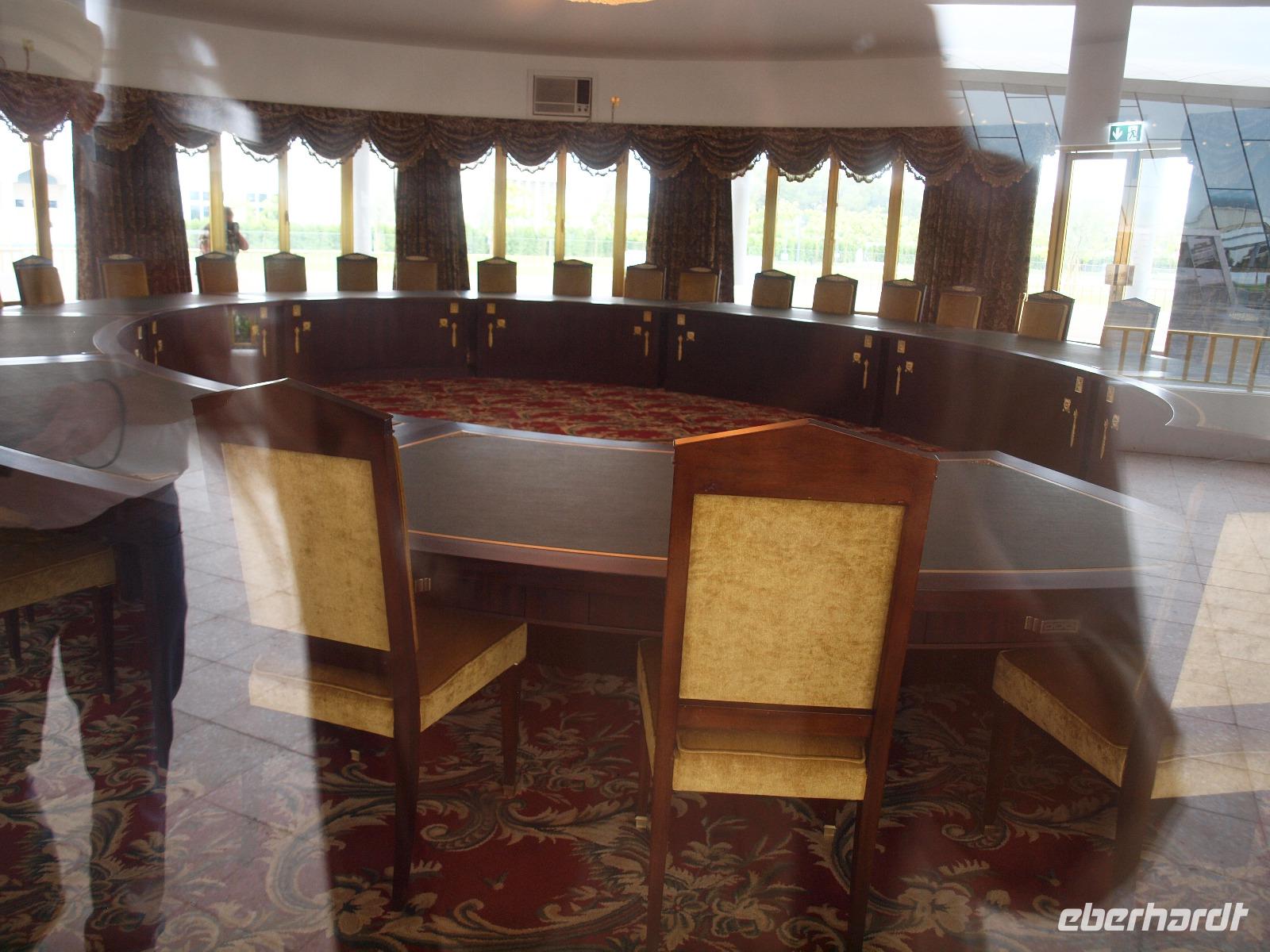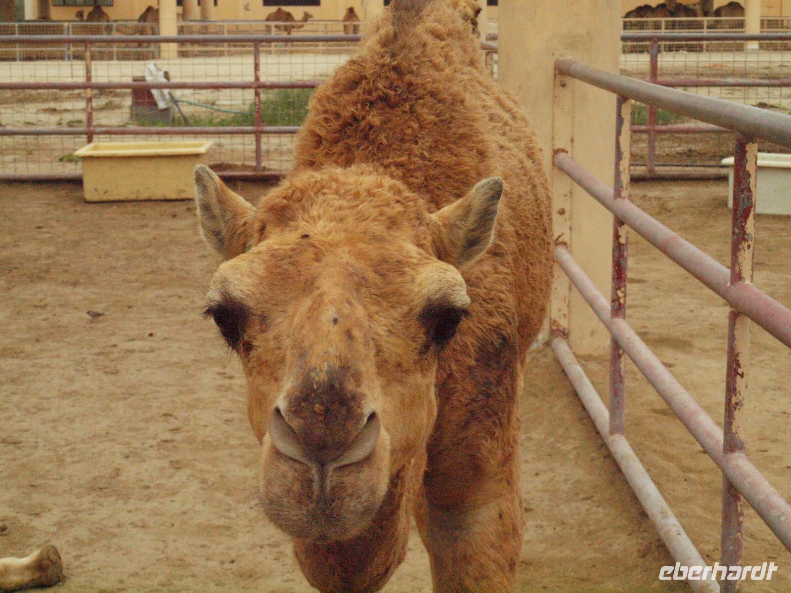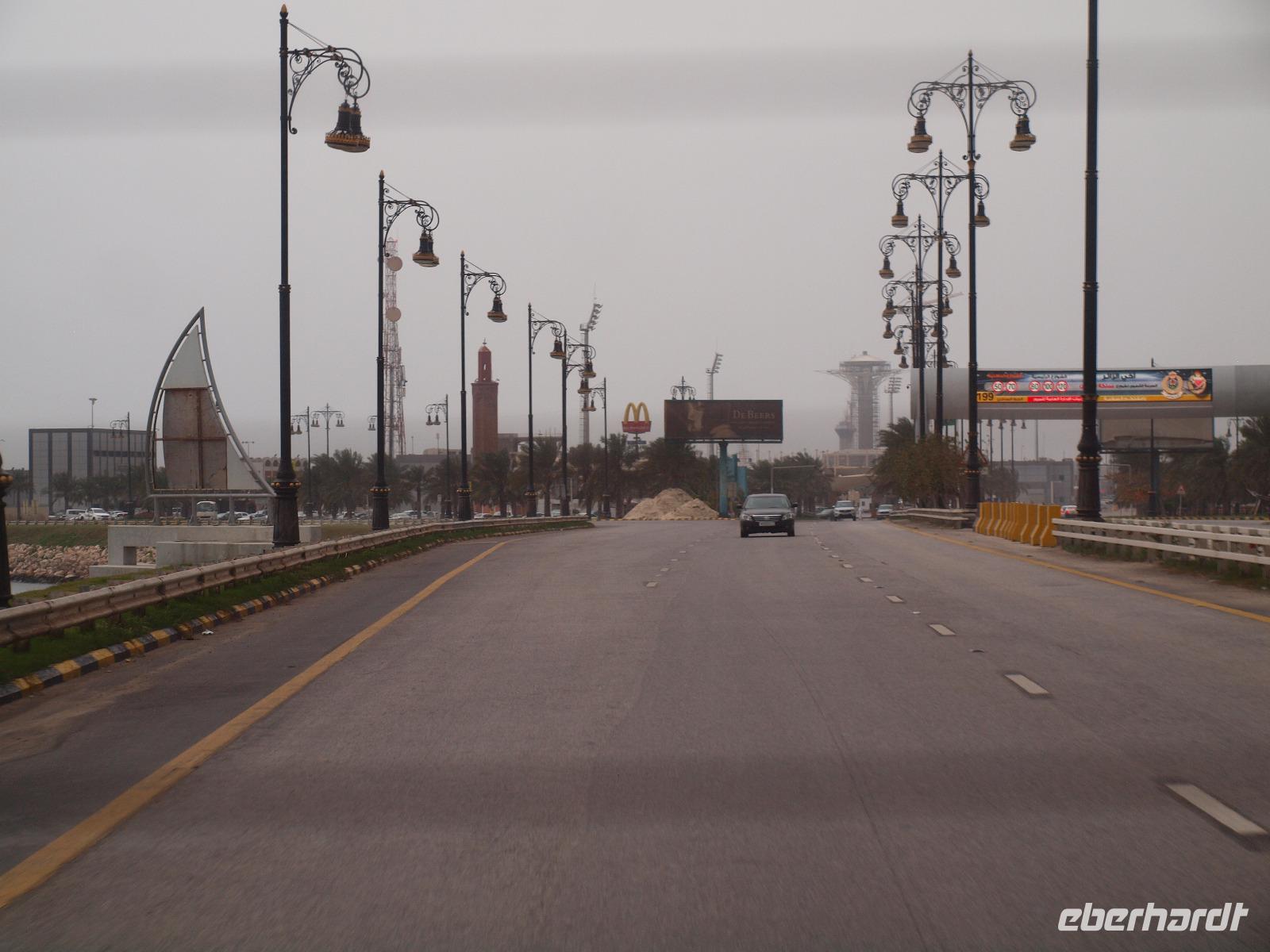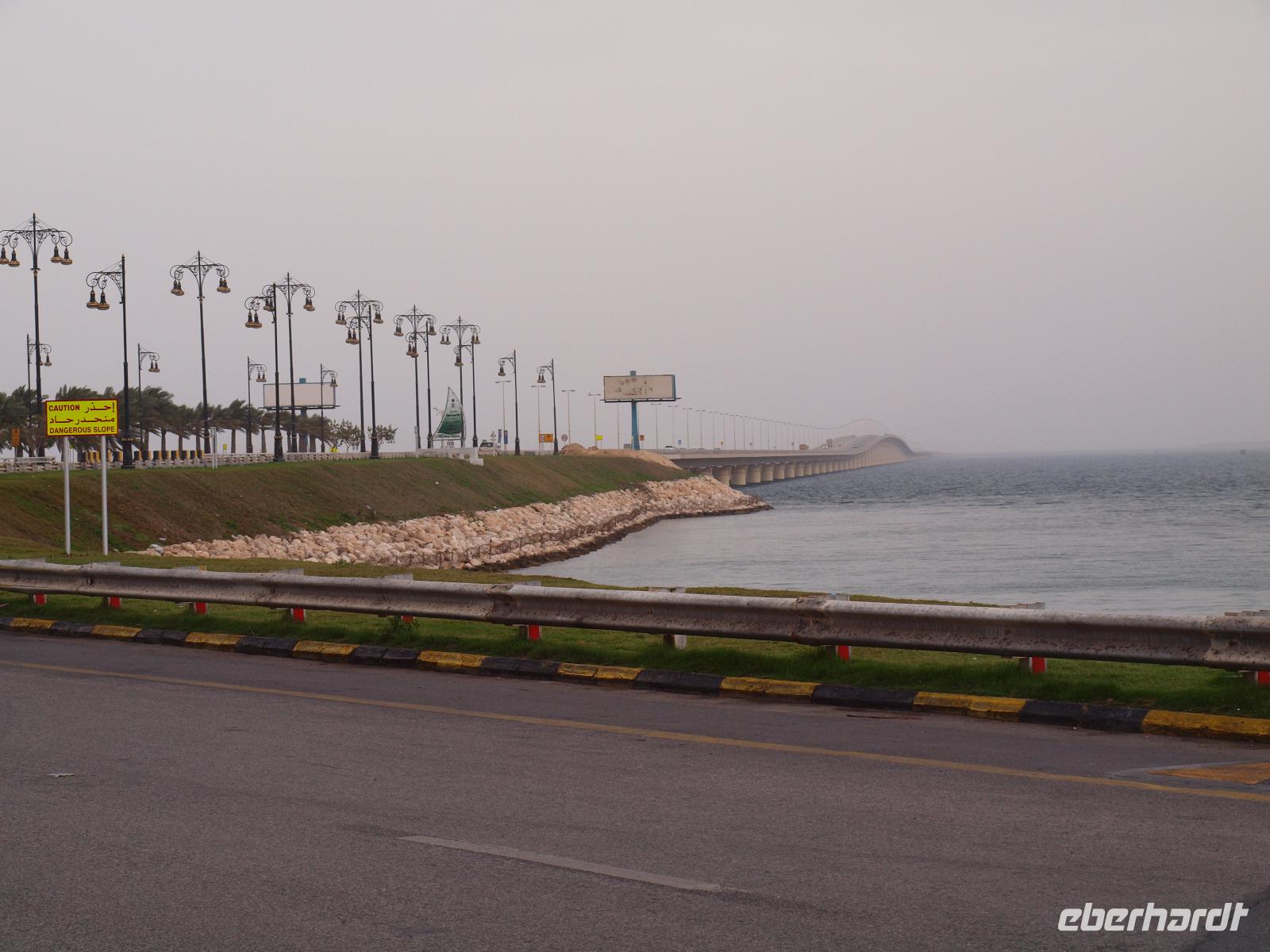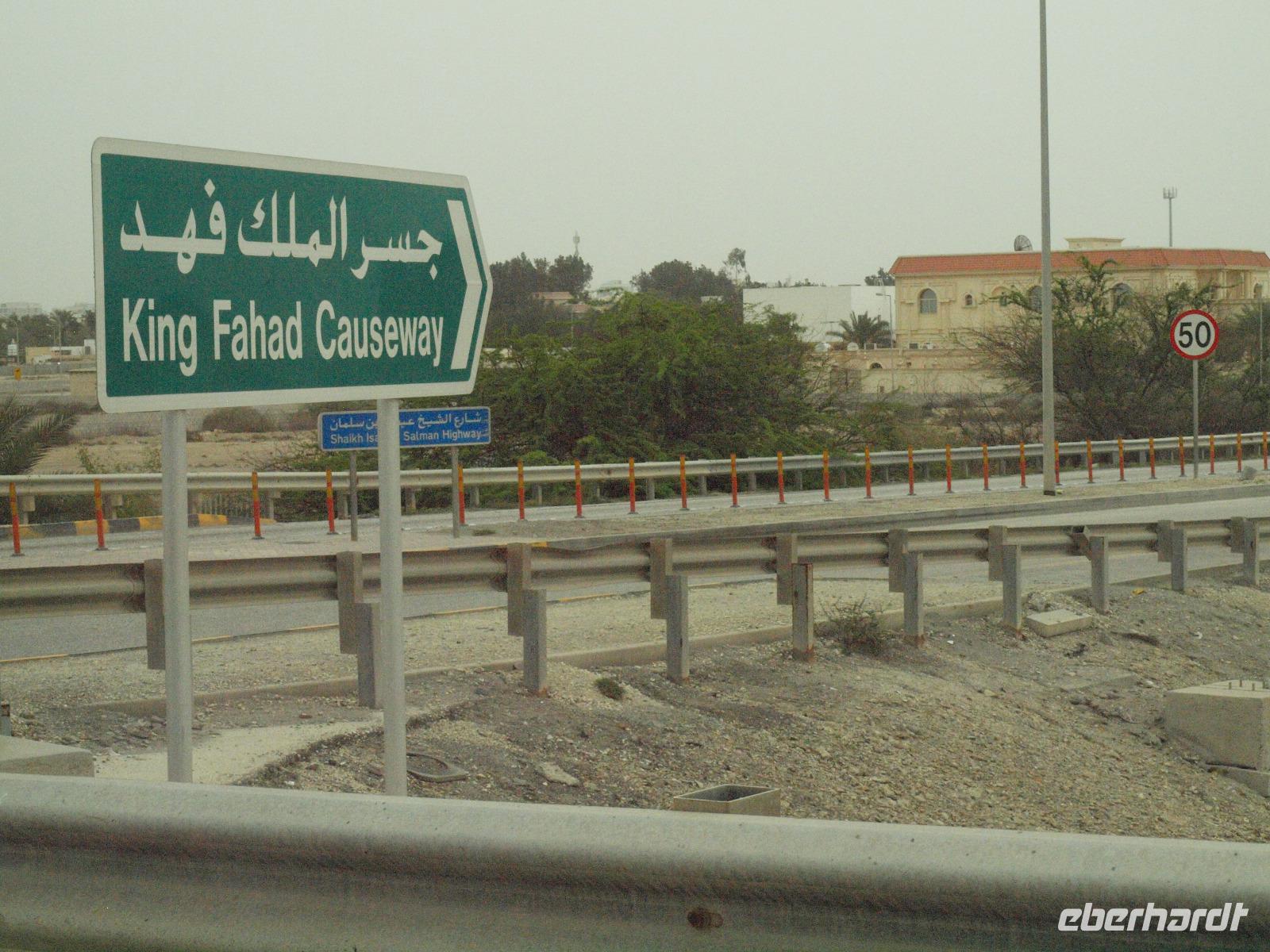 Am späten Vormittag treffen wir uns in der Lobby wieder um unsere erste Besichtigungstour zu unternehmen. Auch Alfred ist wieder in der Lobby und stellt uns unsere Reiseleiterin für die nächsten Tage vor. Silvia, die Auswanderin aus der deutsch-französischen Schweiz empfängt uns herzlich und heißt uns noch einmal Willkommen. Wir beginnen die Tour mit der Fahrt zur Formel-1-Rennstrecke von Bahrain. Nach einem kurzen Abstecher in die Ausstellungs- und Verkaufsräume fahren wir weiter zu den königlichen Kamelställen. Hier leben knapp 500 Tiere und gelten als das Lieblingshobby der Königsfamilie... Nach den Wüstenschiffen begeben wir uns auf die große Brücke, den King Fahad Causeway, er verbindet Bahrain mit Saudi Arabien und genau auf der Hälfte der Brücke befindet sich die Grenze der zwei Staaten.