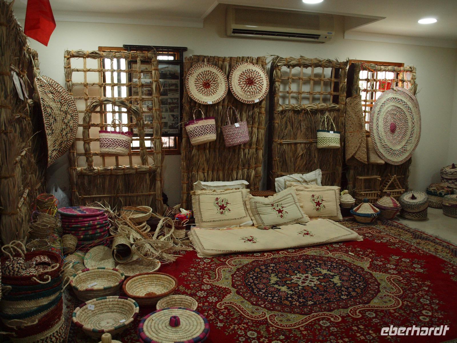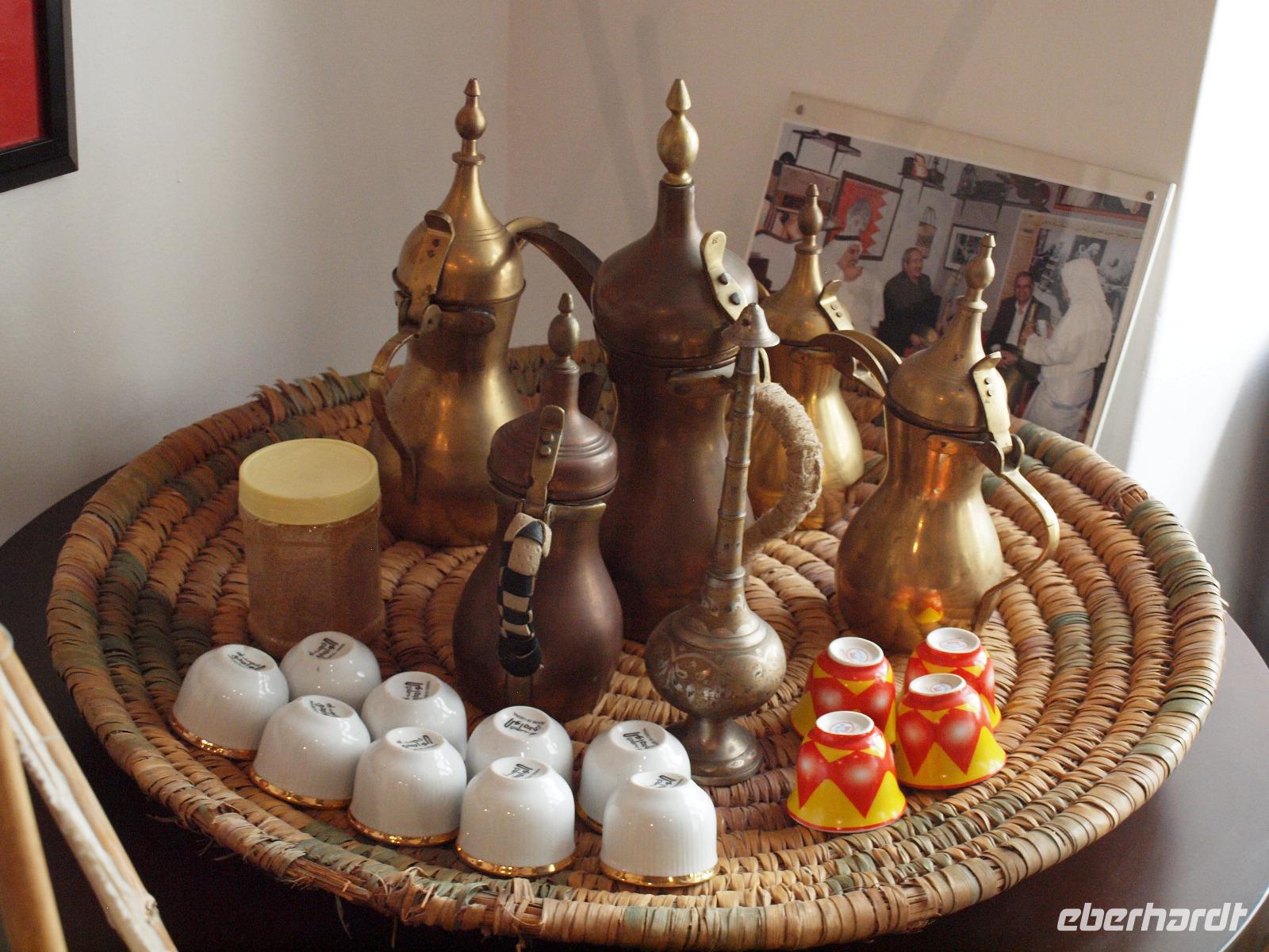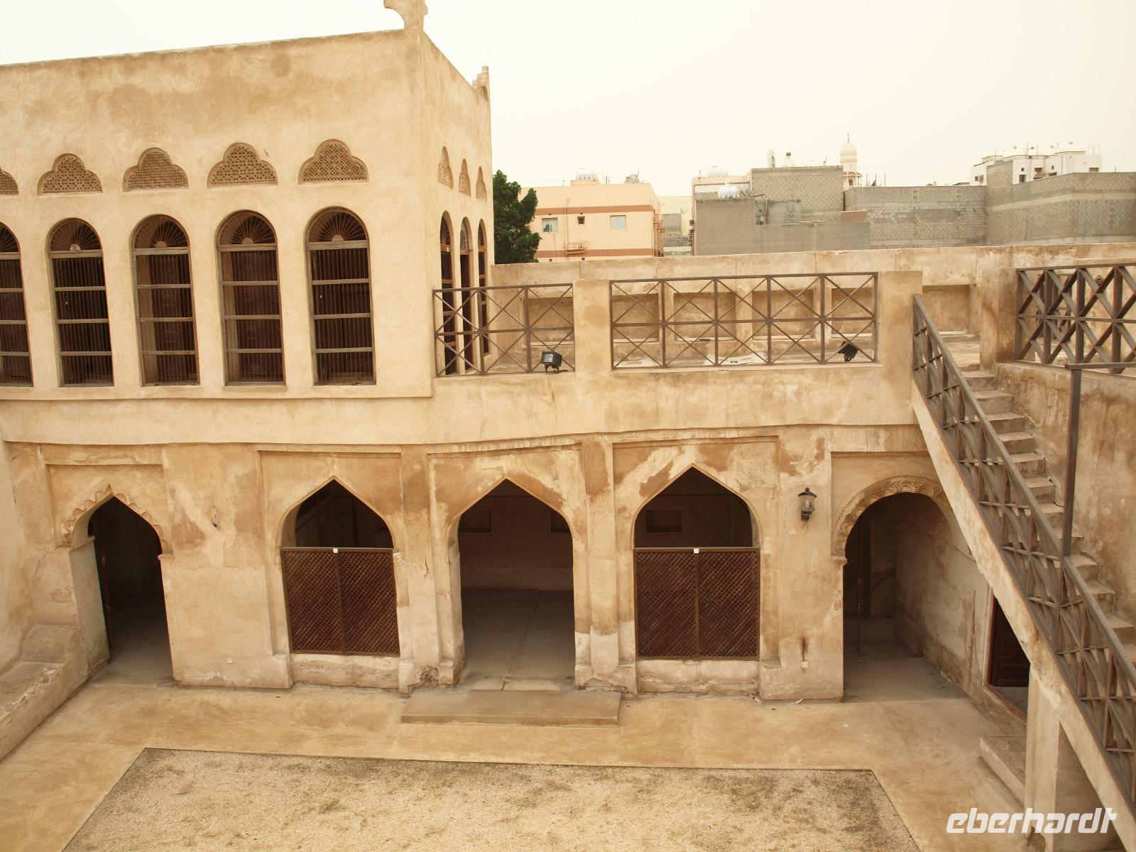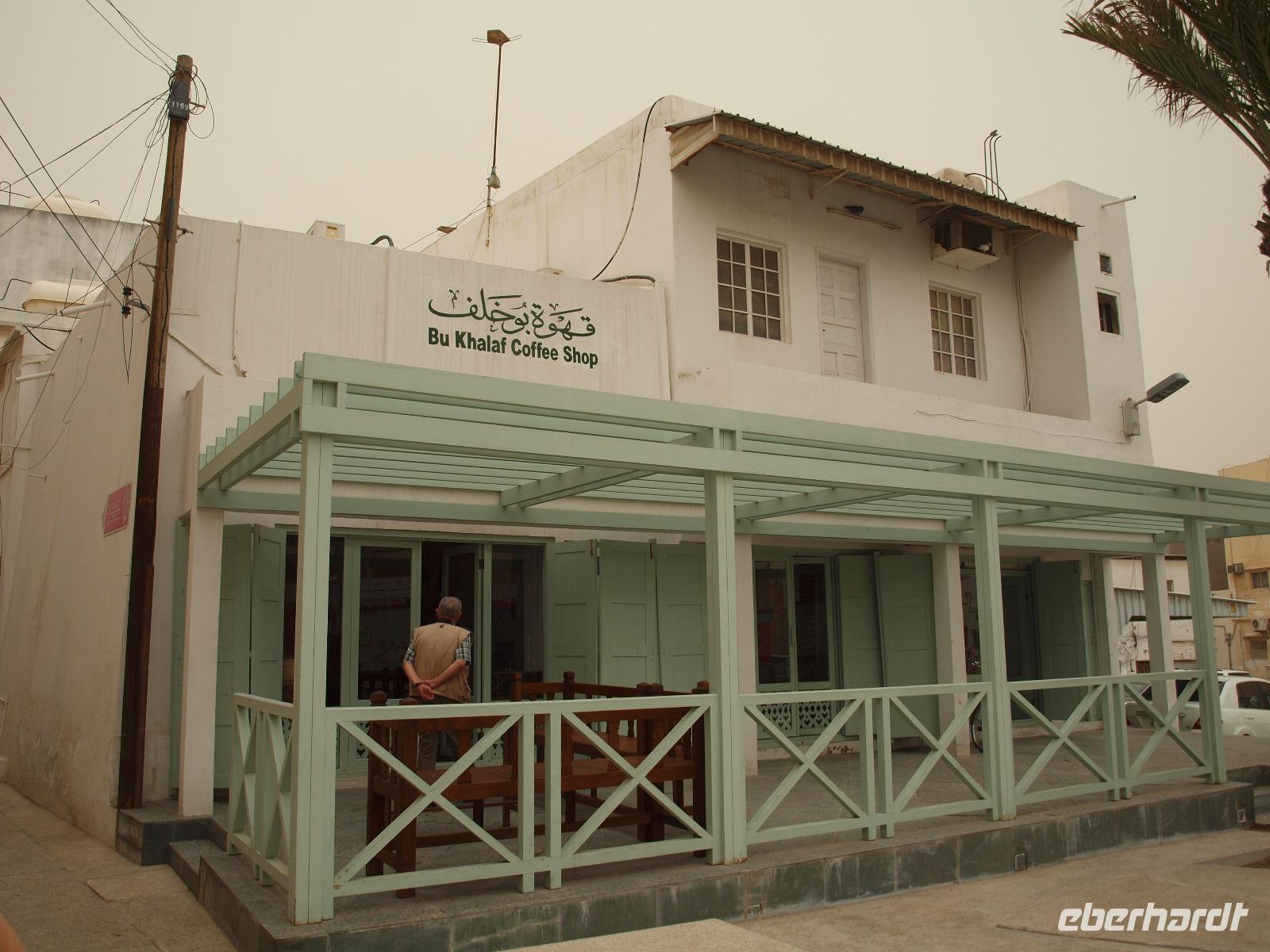 Unser Sprung in die Vergangenheit Bahrains ist noch zu Ende. Wir besichtigen nun das Sheikh Isa bin Ali Haus. Hier lebte einst der Ur-Ur-Großvater des heutigen Königs. Das Haus ist mit 4 Innenhöfen und eigener „Klimaanlage" ausgestattet, genug Platz für den einstigen Herrscher und seine Familie mit Dienstboten. Von hier aus ist es nicht weit bis zum nächsten Stopp. Wir statten dem Besitzer des ältesten Coffeeshops einen Besuch ab, hier erklärt uns Silvia auch noch einmal wie man hier in den Golfstaaten den arabischen Kaffee trinkt. Ein paar Meter weiter entsteht das „neue" historische Viertel. Viele Häuser werden renoviert und erhalten einen neuen Glanz. Direkt um die Ecke gibt es auch einen kleinen Bäcker, der auf alte Art Brote herstellt. Wir nutzen die Gelegenheit und kosten sein Produkt, es wird von uns allen für gut befunden.
