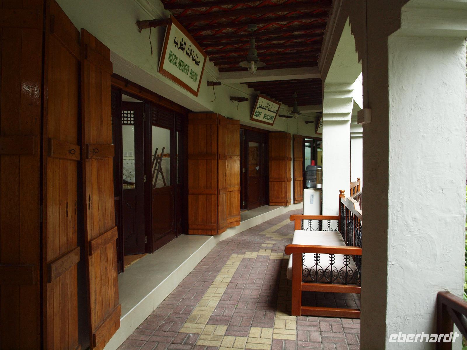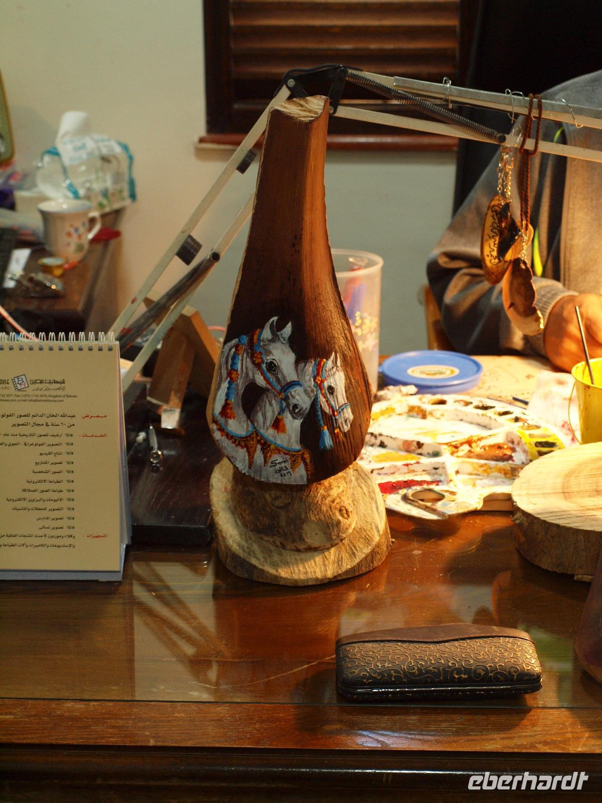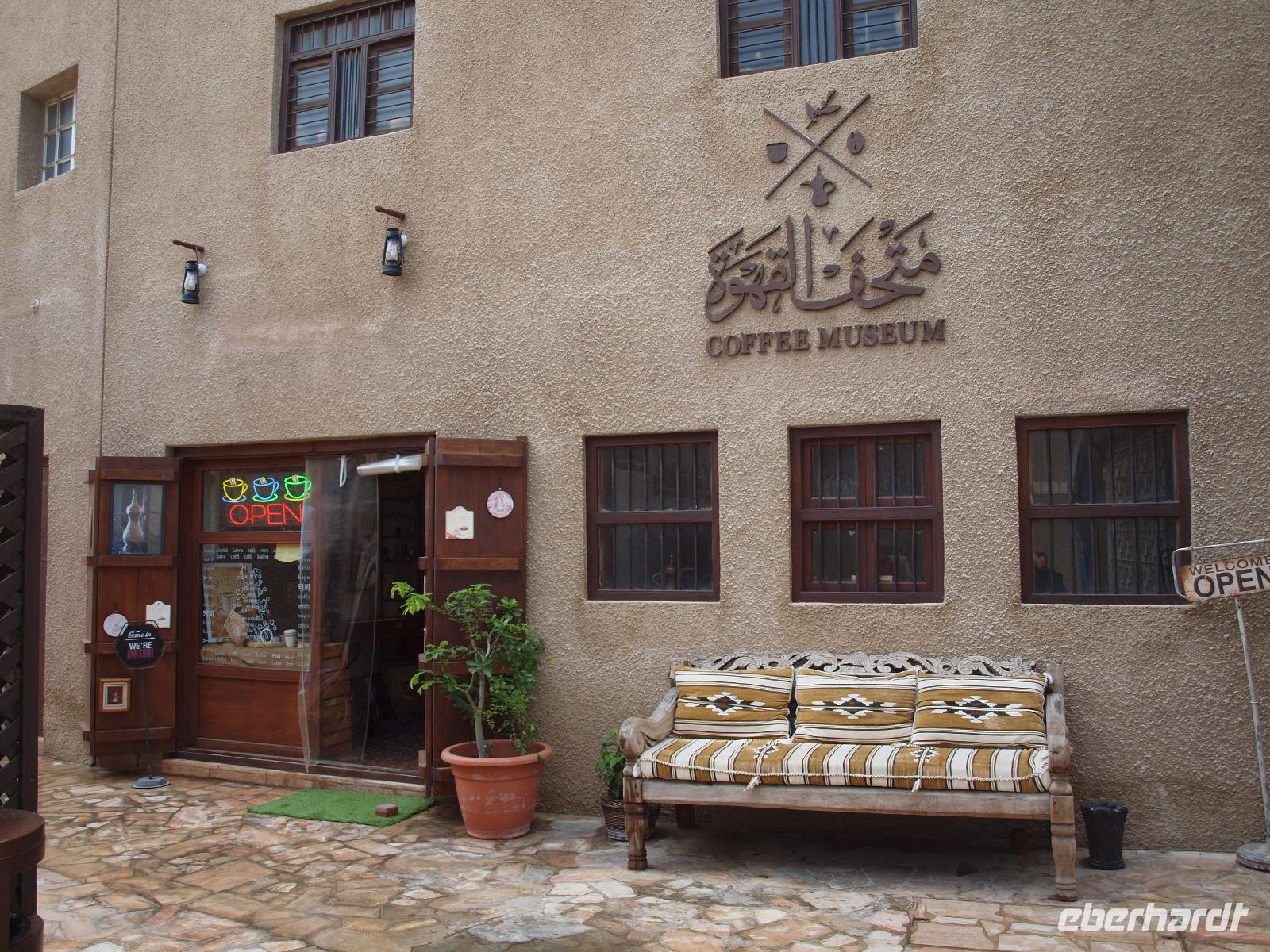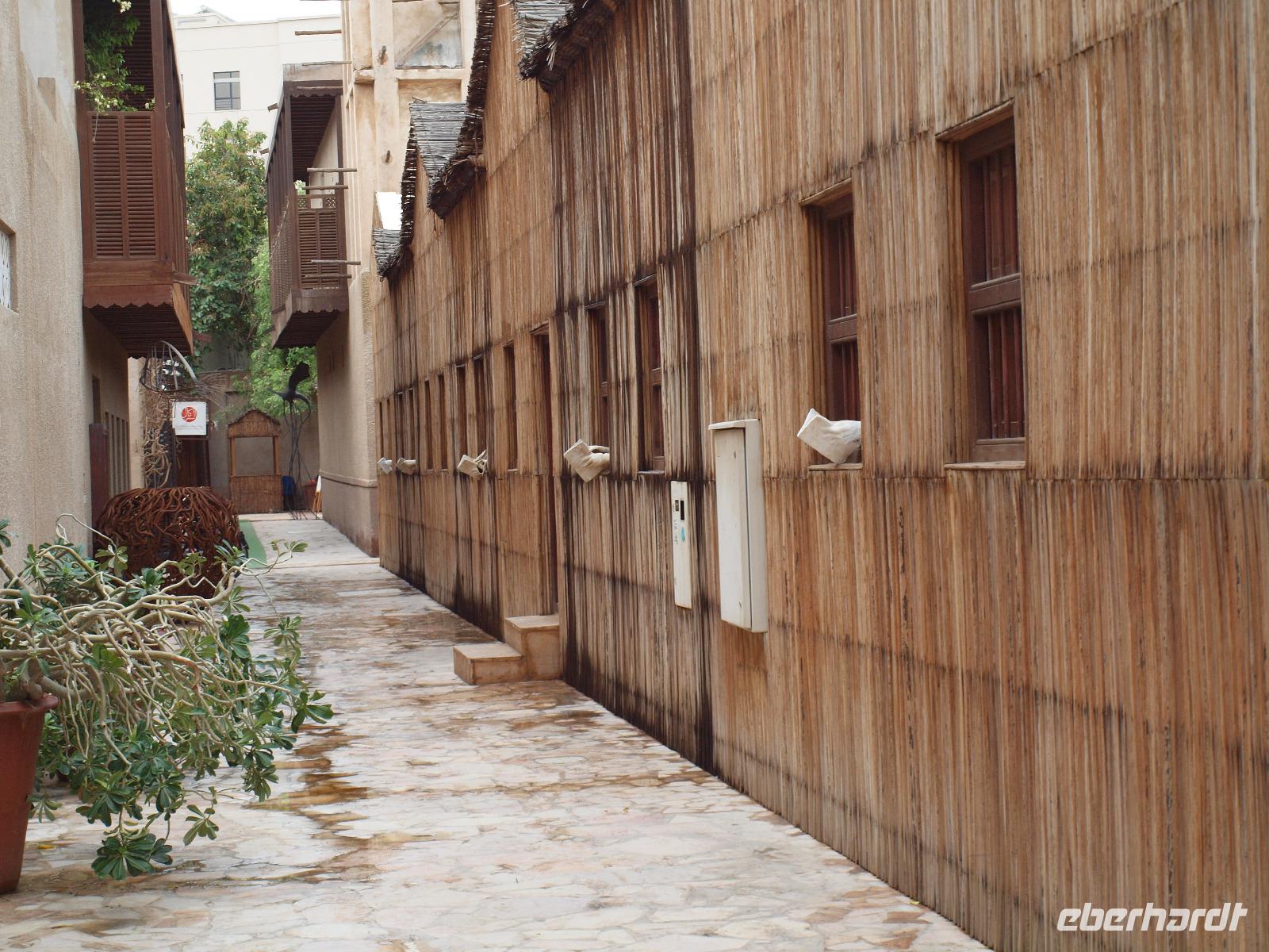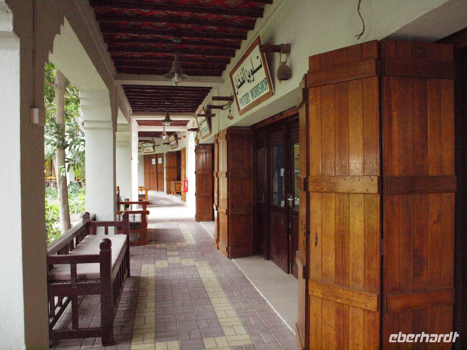 Unser Sprung in die Vergangenheit Bahrains ist noch zu Ende. Wir besichtigen nun das Sheikh Isa bin Ali Haus. Hier lebte einst der Ur-Ur-Großvater des heutigen Königs. Das Haus ist mit 4 Innenhöfen und eigener „Klimaanlage" ausgestattet, genug Platz für den einstigen Herrscher und seine Familie mit Dienstboten. Von hier aus ist es nicht weit bis zum nächsten Stopp. Wir statten dem Besitzer des ältesten Coffeeshops einen Besuch ab, hier erklärt uns Silvia auch noch einmal wie man hier in den Golfstaaten den arabischen Kaffee trinkt. Ein paar Meter weiter entsteht das „neue" historische Viertel. Viele Häuser werden renoviert und erhalten einen neuen Glanz. Direkt um die Ecke gibt es auch einen kleinen Bäcker, der auf alte Art Brote herstellt. Wir nutzen die Gelegenheit und kosten sein Produkt, es wird von uns allen für gut befunden.