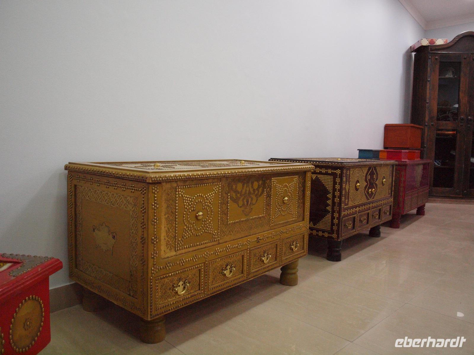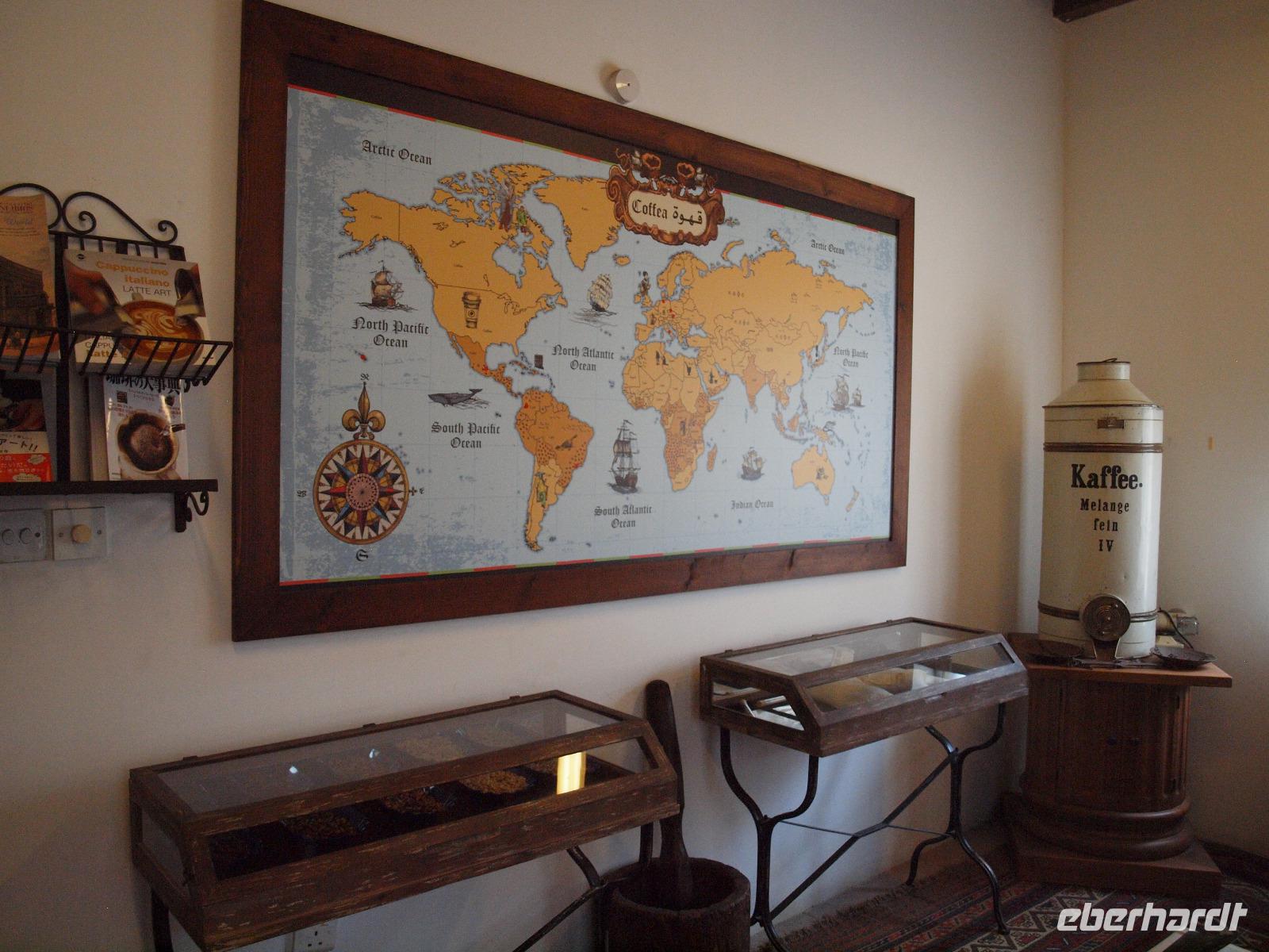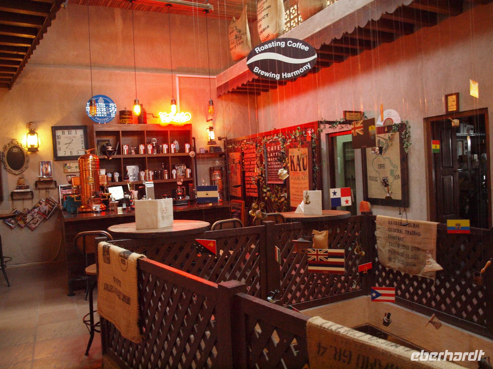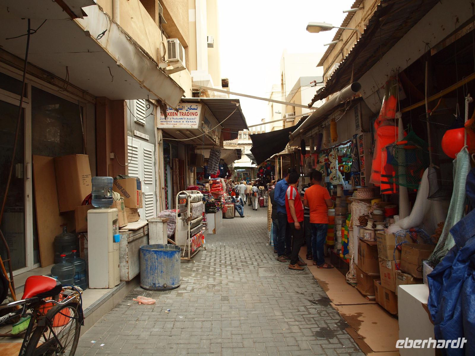 Unser Sprung in die Vergangenheit Bahrains ist noch zu Ende. Wir besichtigen nun das Sheikh Isa bin Ali Haus. Hier lebte einst der Ur-Ur-Großvater des heutigen Königs. Das Haus ist mit 4 Innenhöfen und eigener „Klimaanlage" ausgestattet, genug Platz für den einstigen Herrscher und seine Familie mit Dienstboten. Von hier aus ist es nicht weit bis zum nächsten Stopp. Wir statten dem Besitzer des ältesten Coffeeshops einen Besuch ab, hier erklärt uns Silvia auch noch einmal wie man hier in den Golfstaaten den arabischen Kaffee trinkt. Ein paar Meter weiter entsteht das „neue" historische Viertel. Viele Häuser werden renoviert und erhalten einen neuen Glanz. Direkt um die Ecke gibt es auch einen kleinen Bäcker, der auf alte Art Brote herstellt. Wir nutzen die Gelegenheit und kosten sein Produkt, es wird von uns allen für gut befunden.