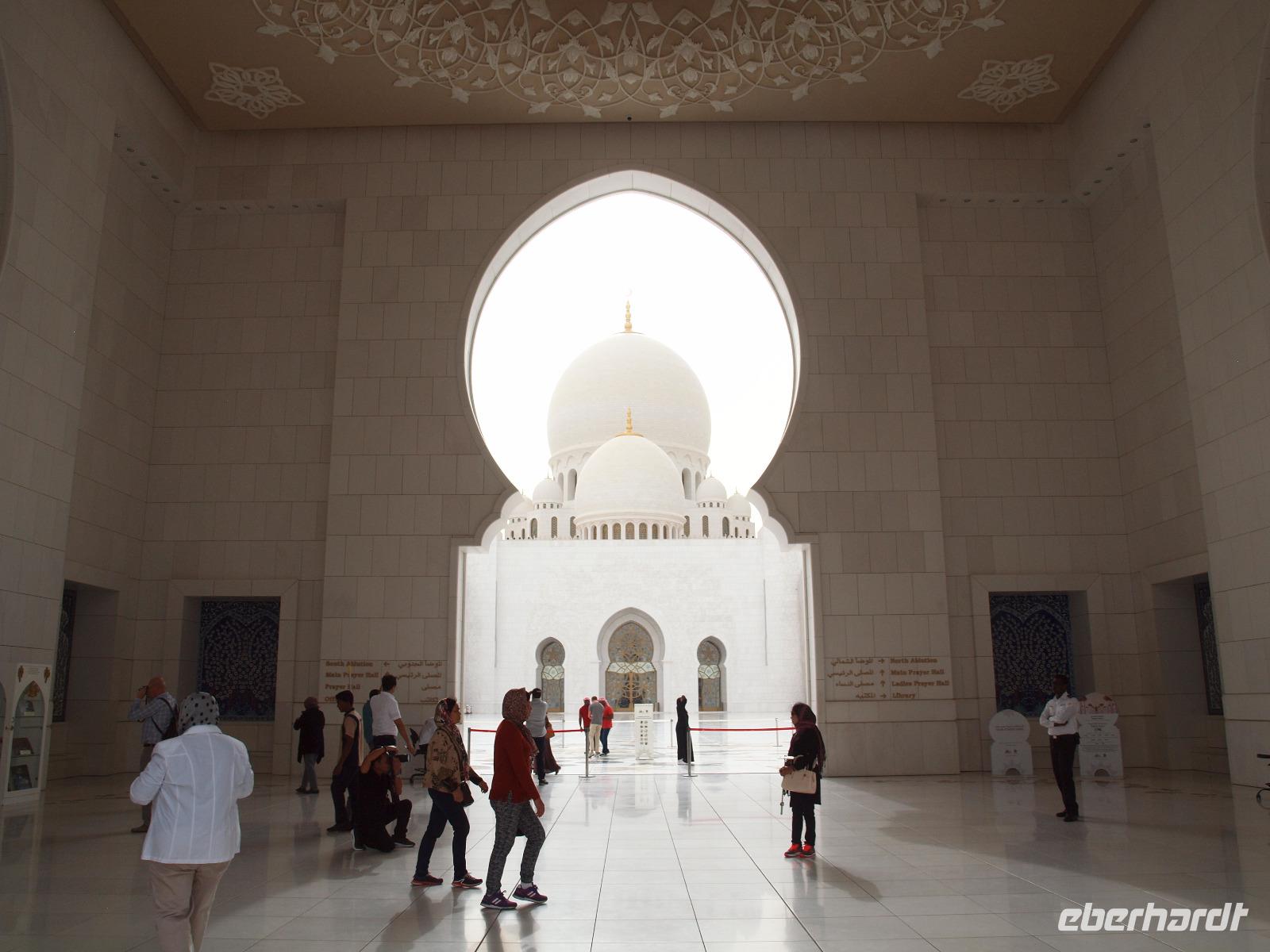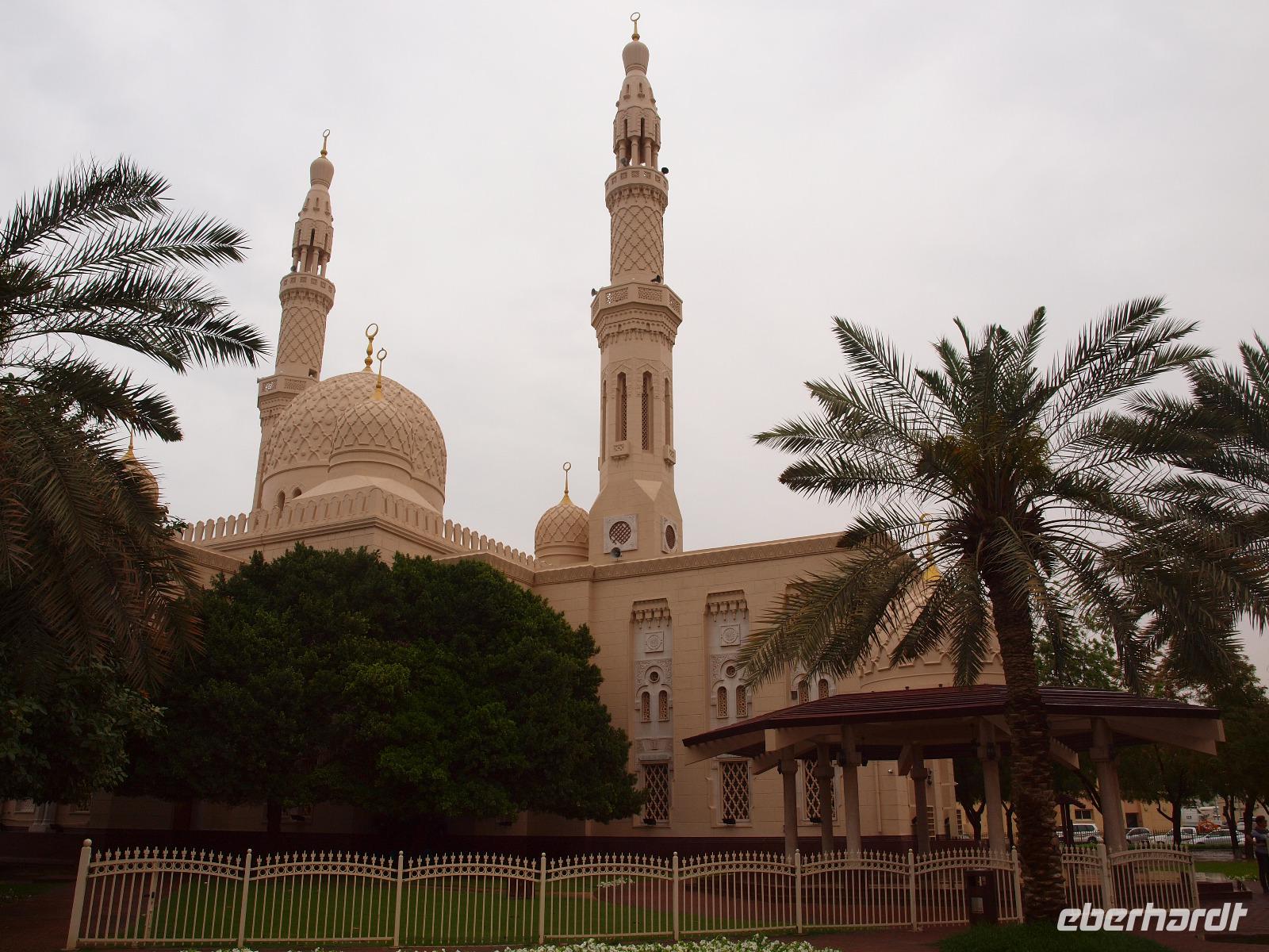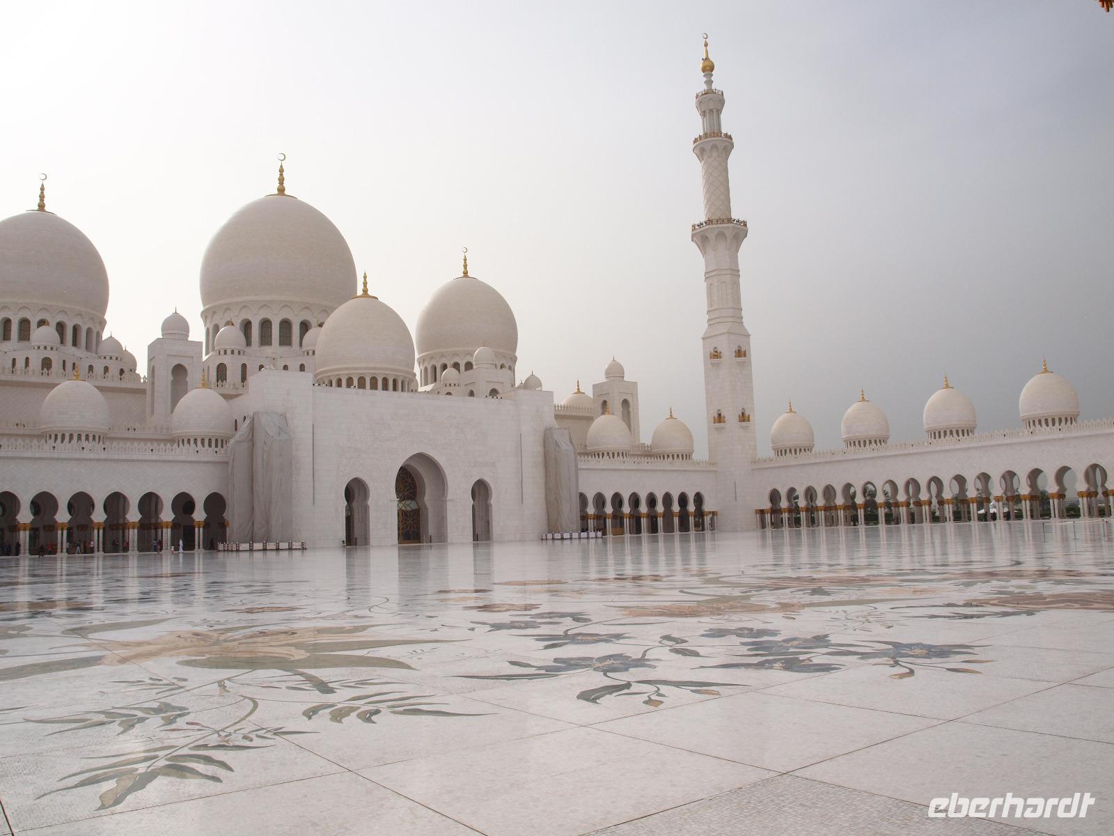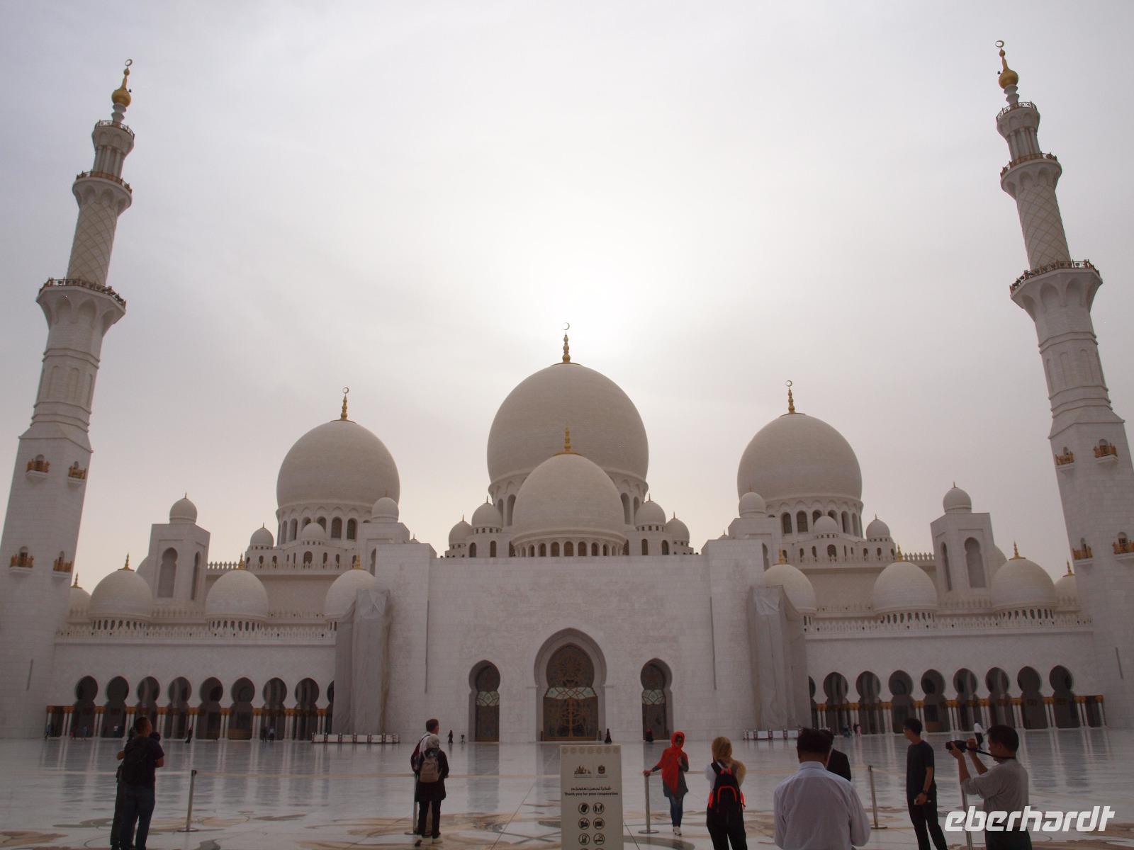 Es ist nun Zeit für eine Mittagspause... da unser nächster Stopp die große Moschee ist nehmen wir einen Italiener in der Nähe der Moschee. Für die Besichtigung der Moschee gilt nun auch ein entsprechender Dresscode: die Damen mit Kopftuch und Abaya bekleidet und die Herren mit langen Hosen, auch die Schuhe müssen wir ausziehen. Für die Führung haben wir einen Einheimischen, der uns in die Lehren des Korans einführt und uns zeigt, wie die Gläubigen beten.