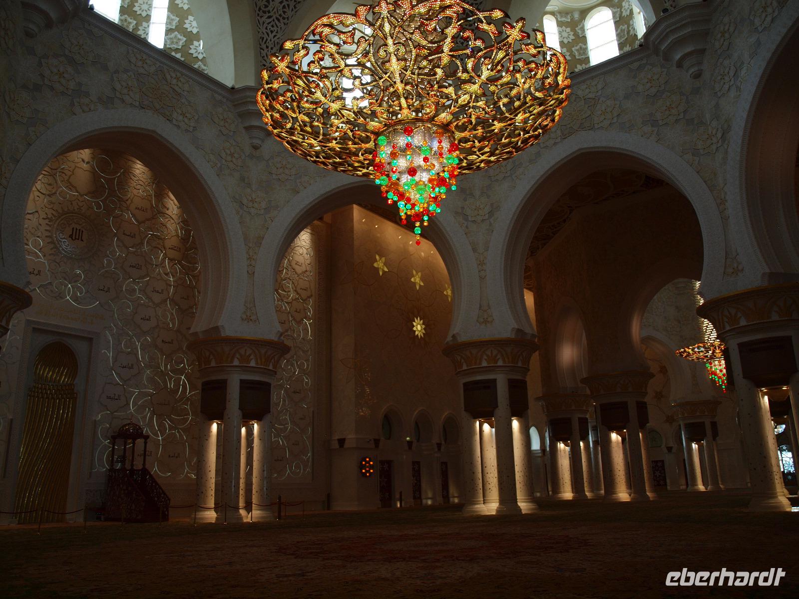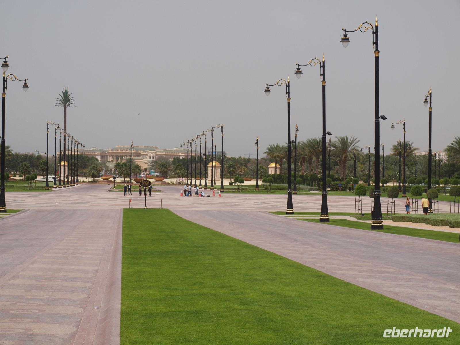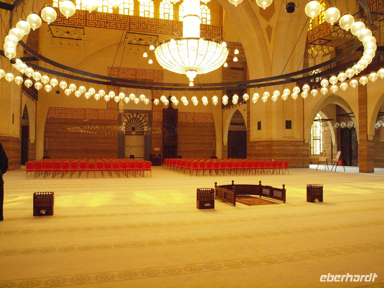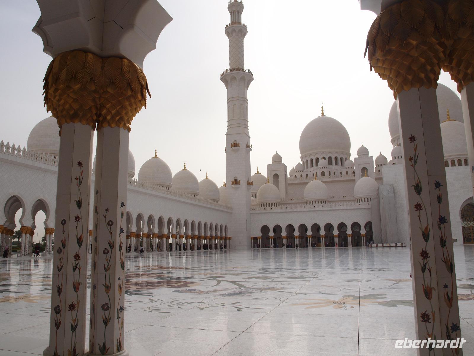 Es ist nun Zeit für eine Mittagspause... da unser nächster Stopp die große Moschee ist nehmen wir einen Italiener in der Nähe der Moschee. Für die Besichtigung der Moschee gilt nun auch ein entsprechender Dresscode: die Damen mit Kopftuch und Abaya bekleidet und die Herren mit langen Hosen, auch die Schuhe müssen wir ausziehen. Für die Führung haben wir einen Einheimischen, der uns in die Lehren des Korans einführt und uns zeigt, wie die Gläubigen beten.