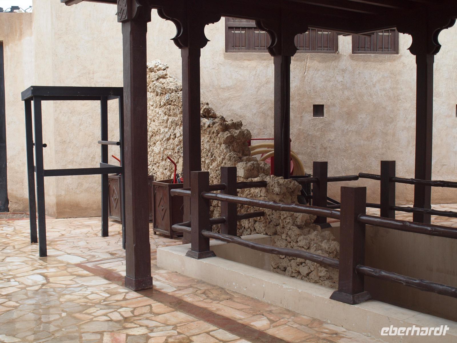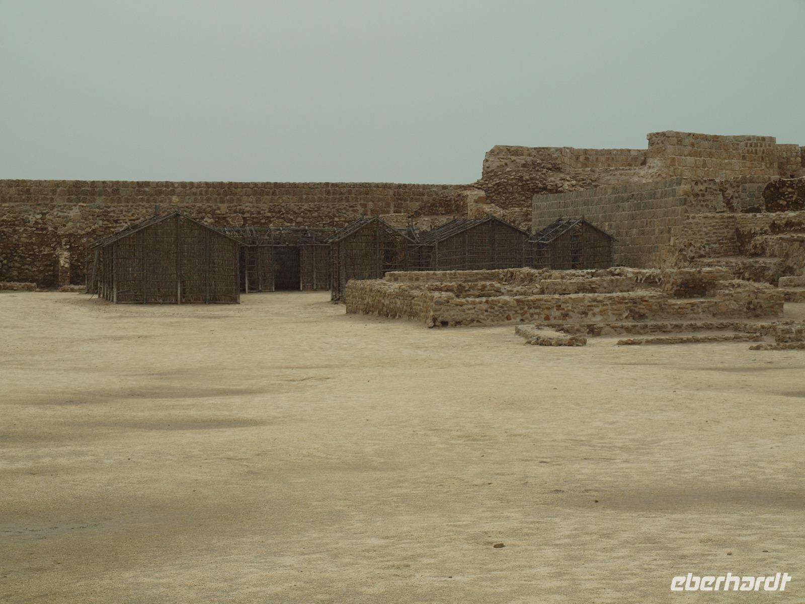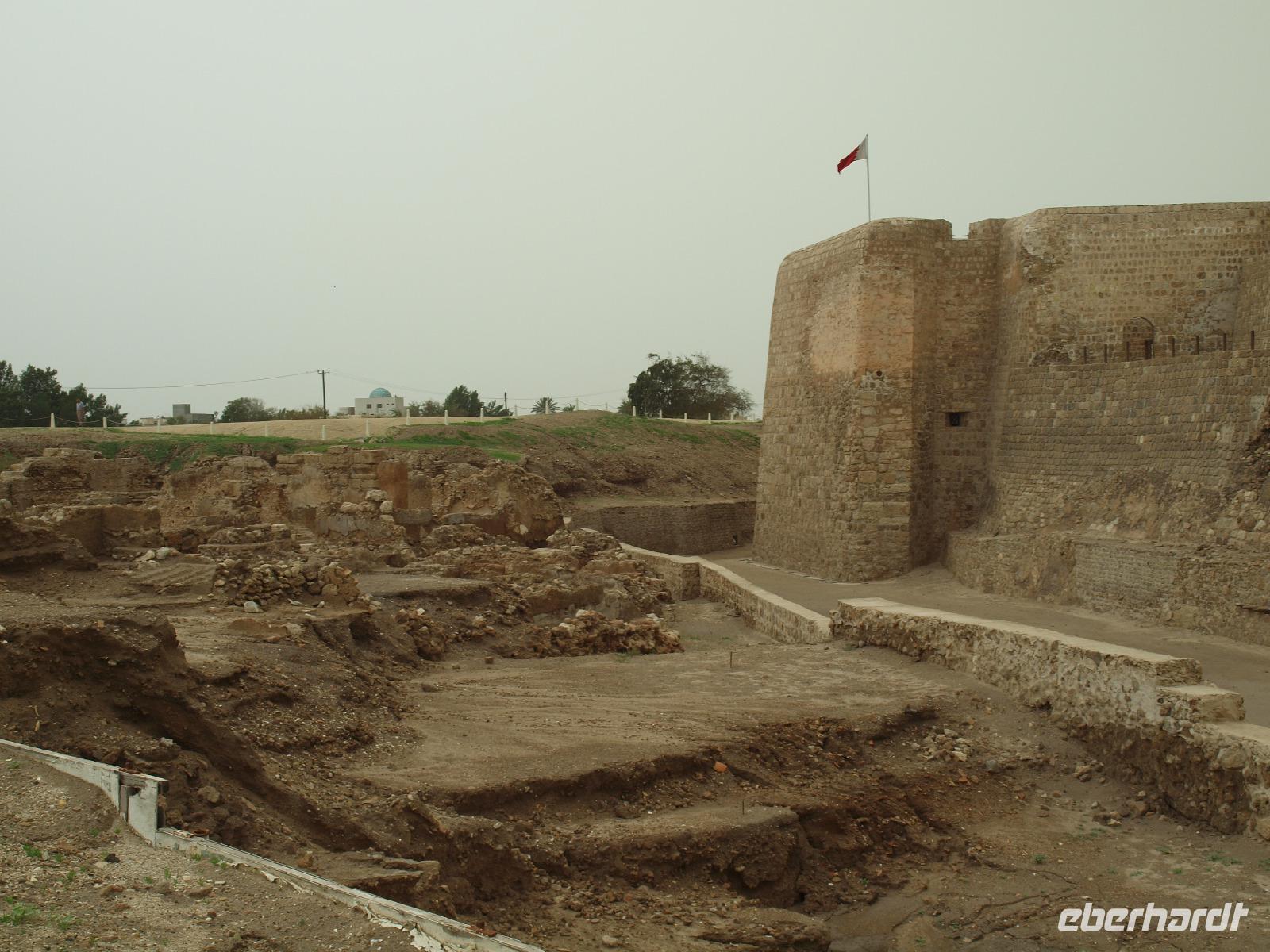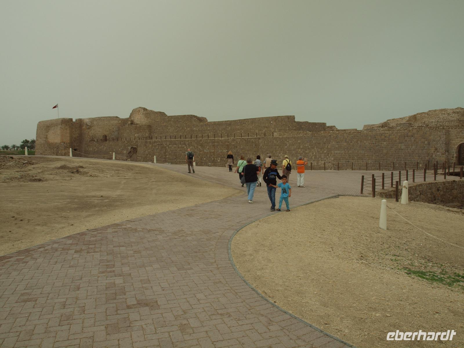 Wir beginnen nun mit der Besichtigung der alten Festung. Die Dilmunkultur (Dilmun = altes Wort für Bahrain) verwandelte die Insel in einen blühenden Garten und geschäftigen Handelsplatz. Am Meer errichteten sie die Festung. Hier befanden sich ausgedehnte Wohnanlagen, Speicherkammern und eine Stadtmauer. Wir entdecken sogar noch eine Dattelentsafteranlage. Das Fort ist ein Spiegel der verschiedenen Herrschaftsepochen, sogar die Portugiesen haben hier ihr Handwerk bewiesen und die heutigen Außenmauern errichtet.