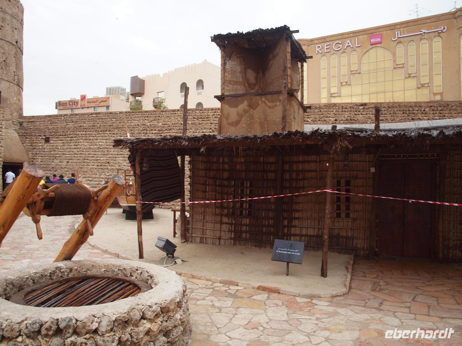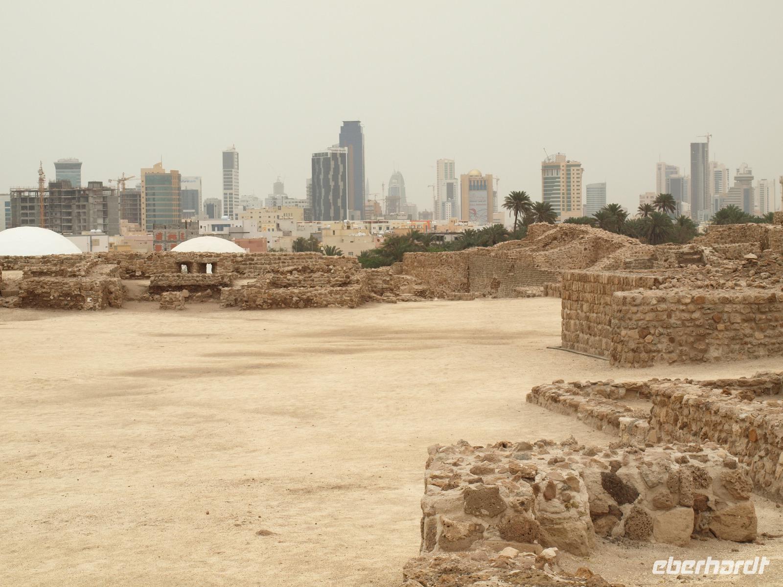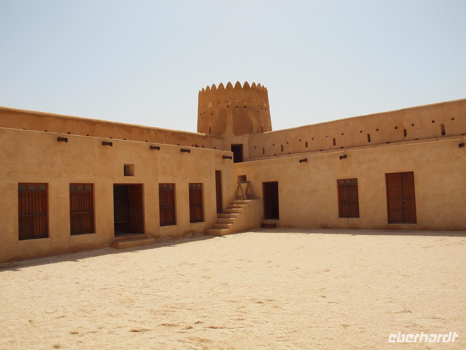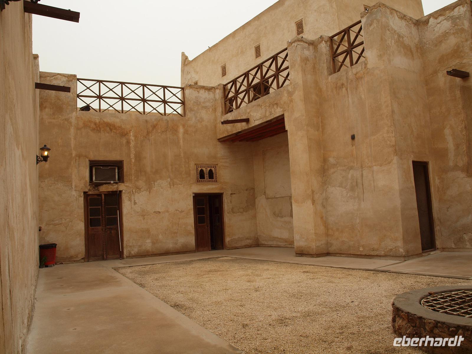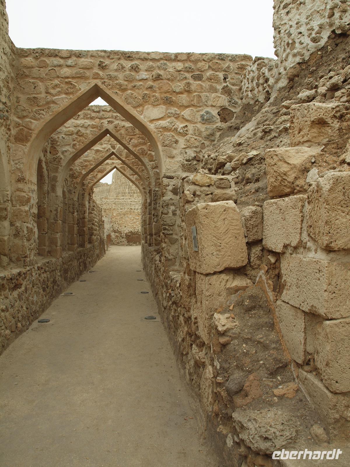 Wir beginnen nun mit der Besichtigung der alten Festung. Die Dilmunkultur (Dilmun = altes Wort für Bahrain) verwandelte die Insel in einen blühenden Garten und geschäftigen Handelsplatz. Am Meer errichteten sie die Festung. Hier befanden sich ausgedehnte Wohnanlagen, Speicherkammern und eine Stadtmauer. Wir entdecken sogar noch eine Dattelentsafteranlage. Das Fort ist ein Spiegel der verschiedenen Herrschaftsepochen, sogar die Portugiesen haben hier ihr Handwerk bewiesen und die heutigen Außenmauern errichtet.