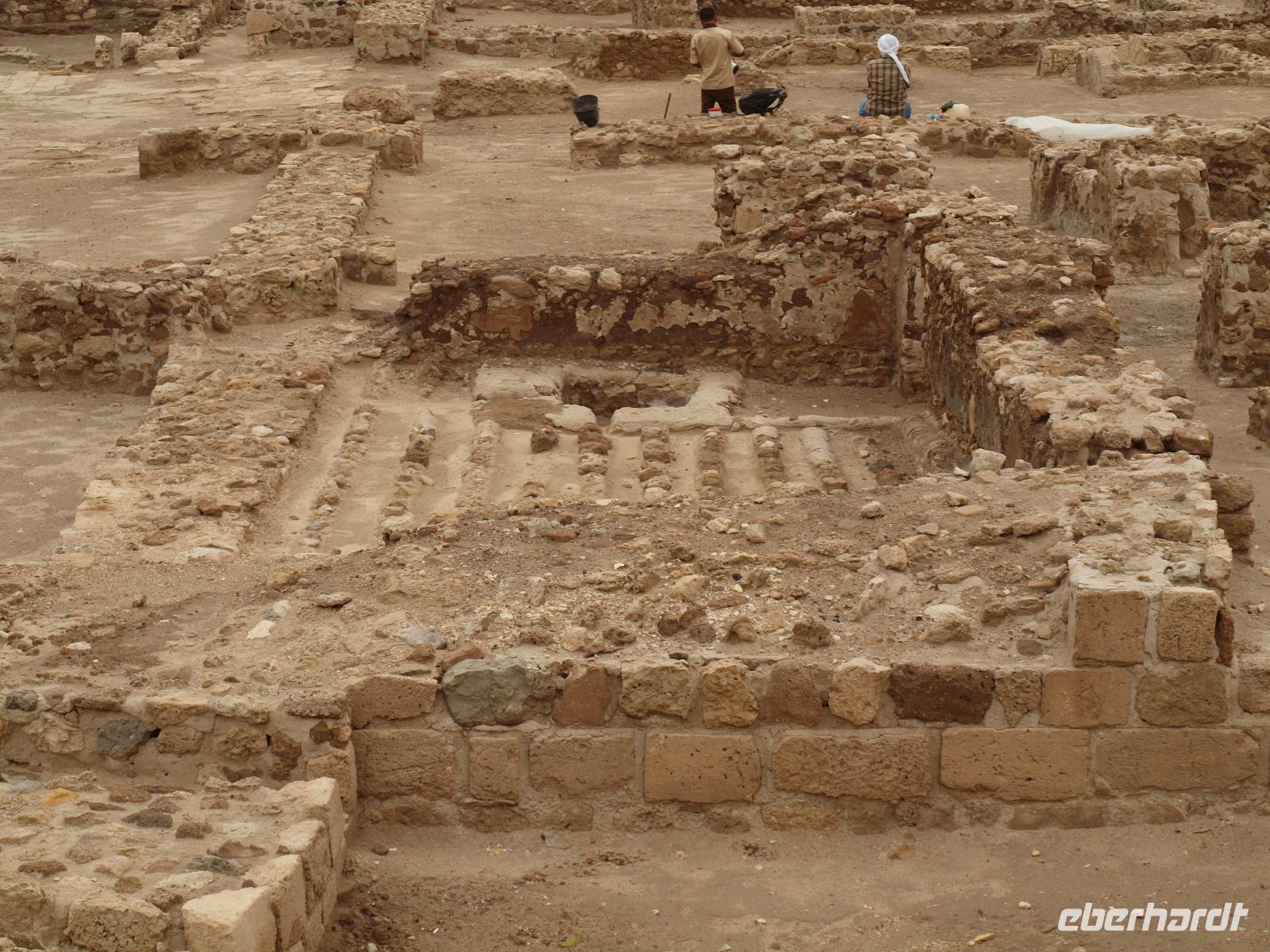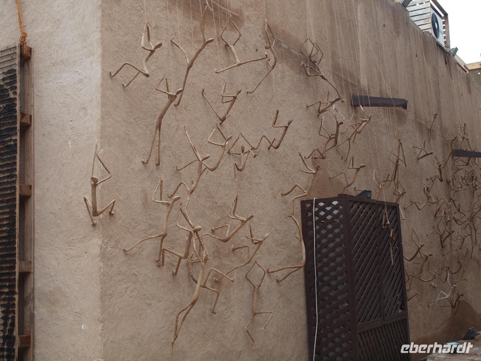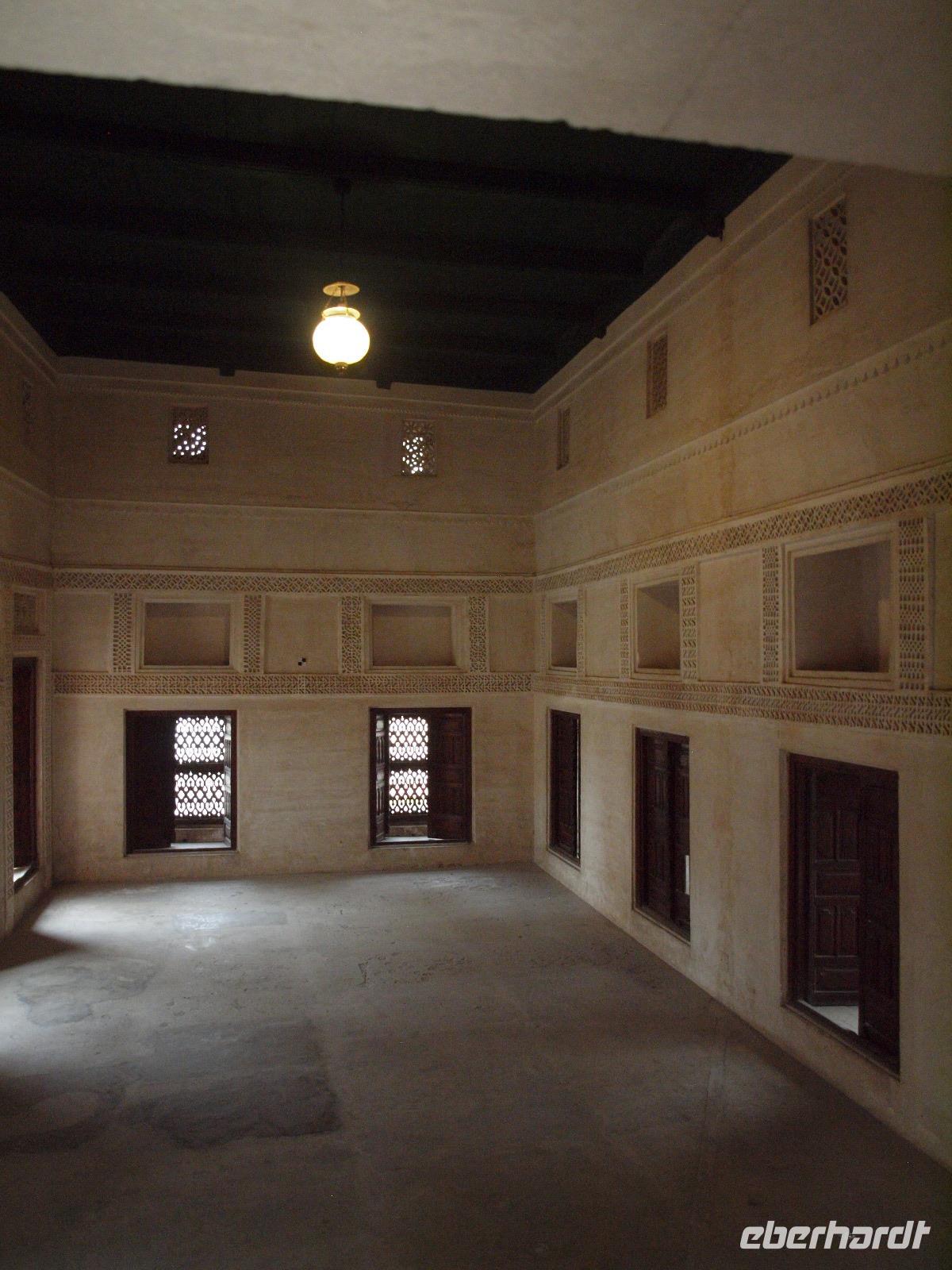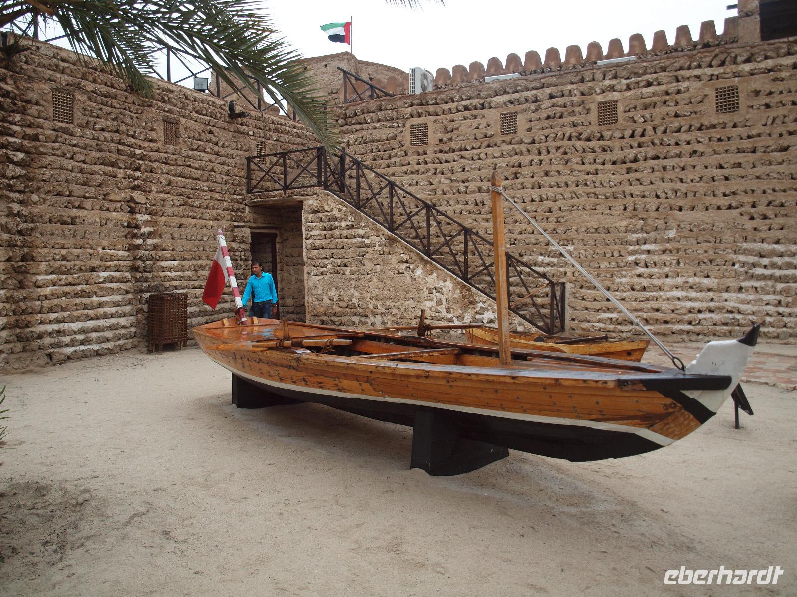 Wir beginnen nun mit der Besichtigung der alten Festung. Die Dilmunkultur (Dilmun = altes Wort für Bahrain) verwandelte die Insel in einen blühenden Garten und geschäftigen Handelsplatz. Am Meer errichteten sie die Festung. Hier befanden sich ausgedehnte Wohnanlagen, Speicherkammern und eine Stadtmauer. Wir entdecken sogar noch eine Dattelentsafteranlage. Das Fort ist ein Spiegel der verschiedenen Herrschaftsepochen, sogar die Portugiesen haben hier ihr Handwerk bewiesen und die heutigen Außenmauern errichtet.