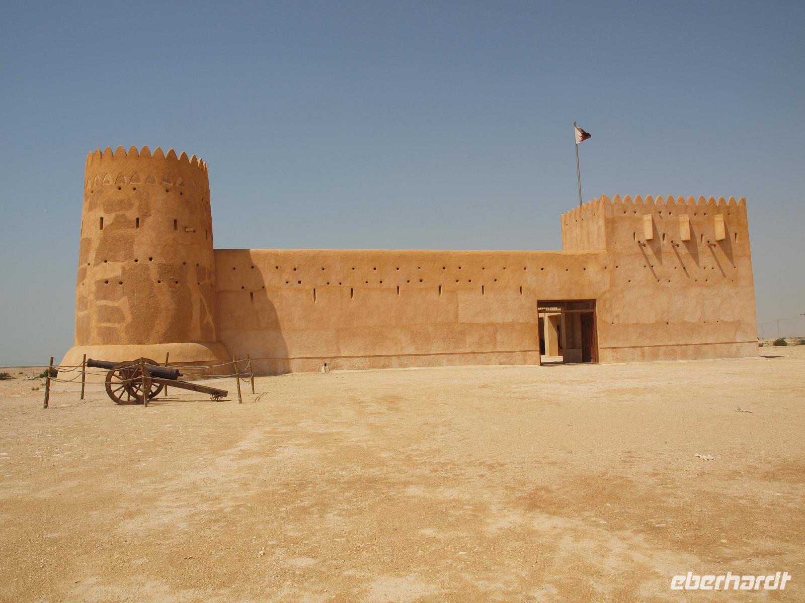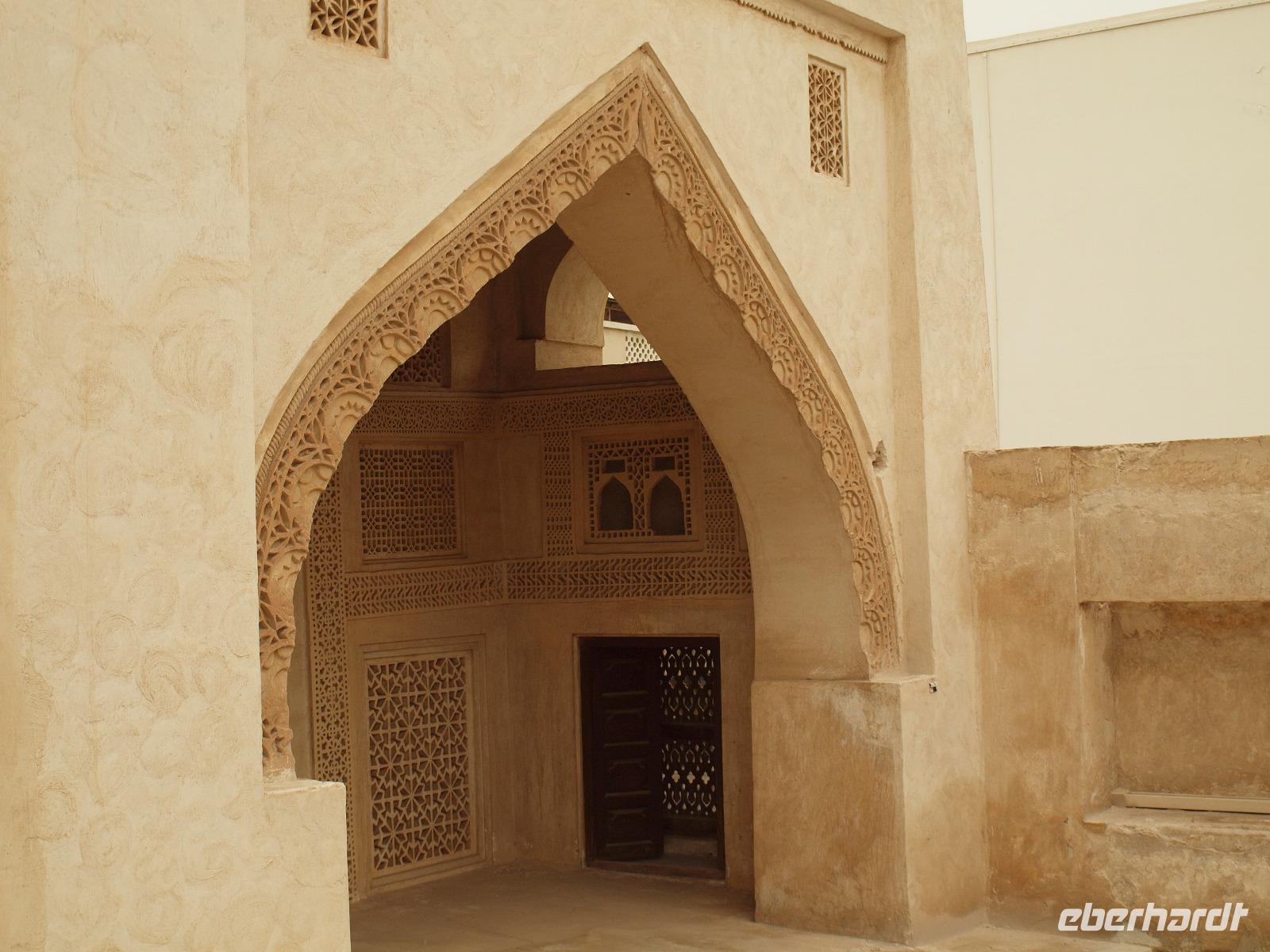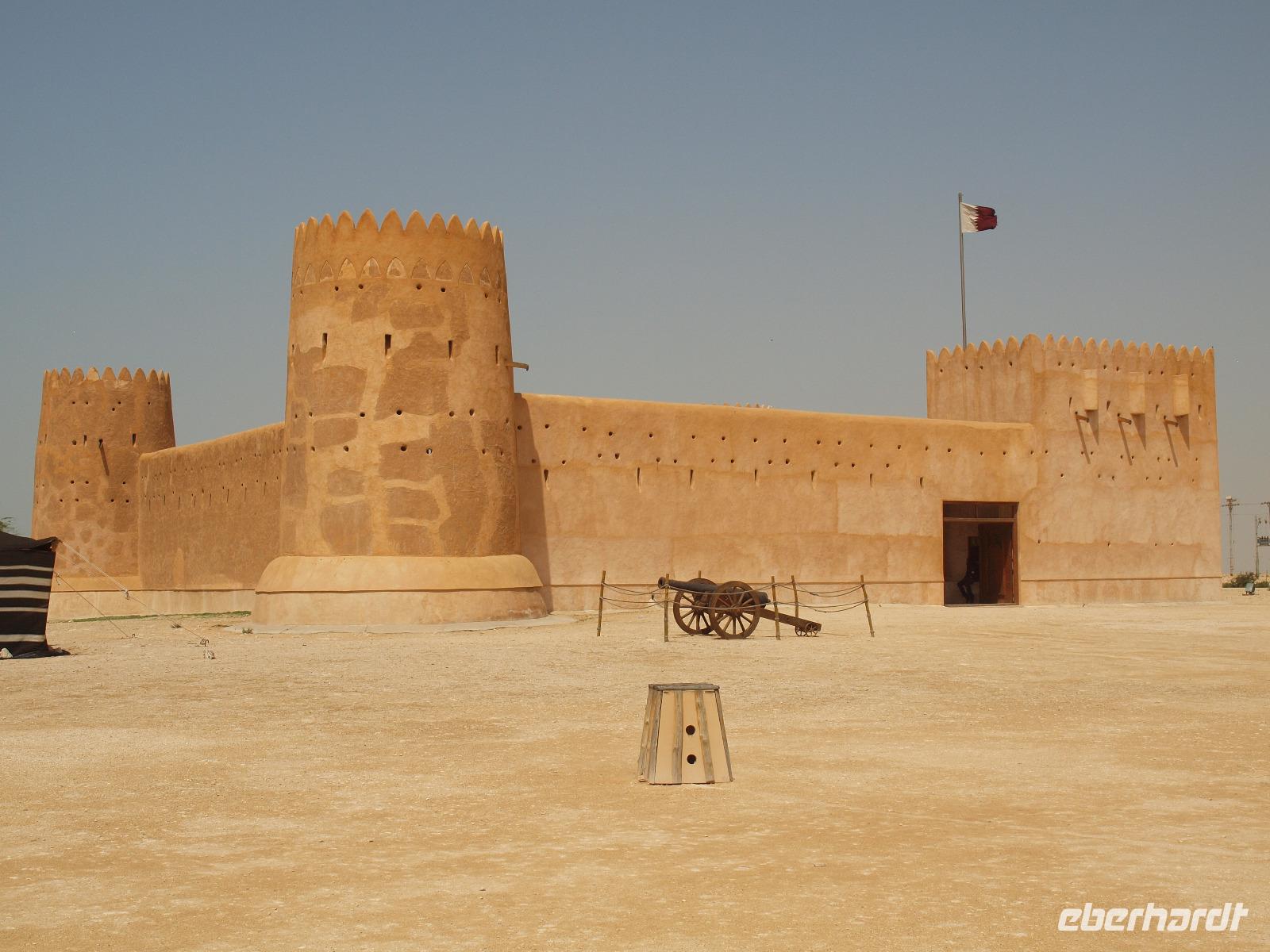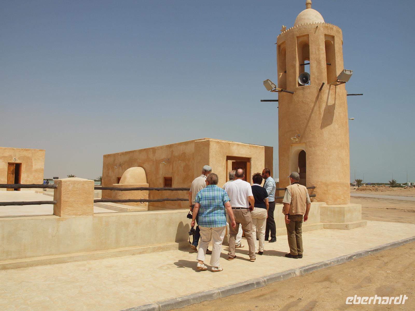Wir fahren weiter in Richtung Nationalpark, Al Thakira. Hier halten wir am Strand und können von weitem schon die Mangroven erkennen. Ein willkommener Anblick und ein guter Kontrast zur Großstadtatmosphäre in Doha. Gleich in der Nähe befindet sich eine kleine Moschee. Diese können wir sogar ohne besondere Kleiderordnung betreten, da sie sich im Moment noch in der Renovierung befindet. Von der Ostküste Katars geht es nun weiter in Richtung Nordwesten. Hier liegt noch unter viel Sand vergraben, die alte Küstenstadt Al Zubara. Wir können uns im Fort der Stadt, welches heute als kleines Museum dient, ein Bild der Geschichte der Stadt machen. Das Fort selbst diente früher der Verteidigung des Küstenabschnittes. Von Al Zubara aus machen wir noch einen Abstecher an die nördlichste Spitze von Katar, der Hafenort Al Ruwais ist ein eher verschlafener Ort und so zieht es uns eher wieder zurück in den Trubel der Großstadt. Zurück in Doha spazieren wir noch einmal über den Souk Waqif. Sahel zeigt uns den Goldsouk und später auch den Falkensouk. Ja, wirklich, ein eigener Souk für den Verkauf von Falken und deren Zubehör. Über die Bedeutung der Falken werden wir jedoch erst in Abu Dhabi mehr erfahren...