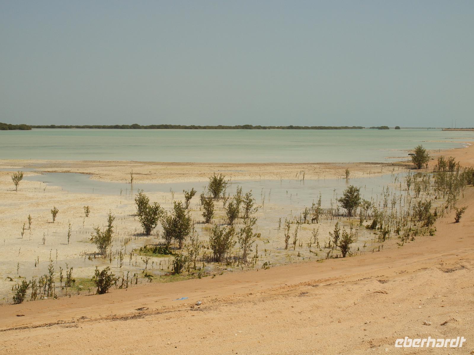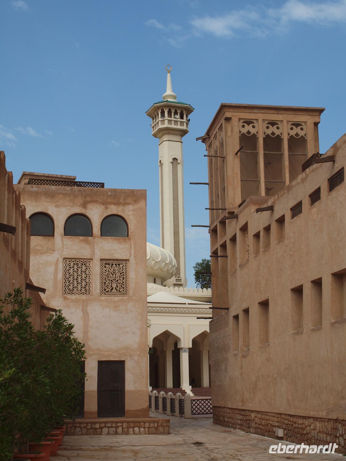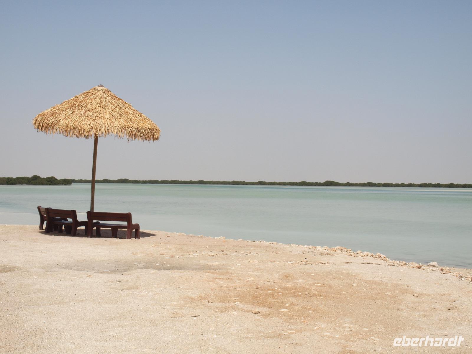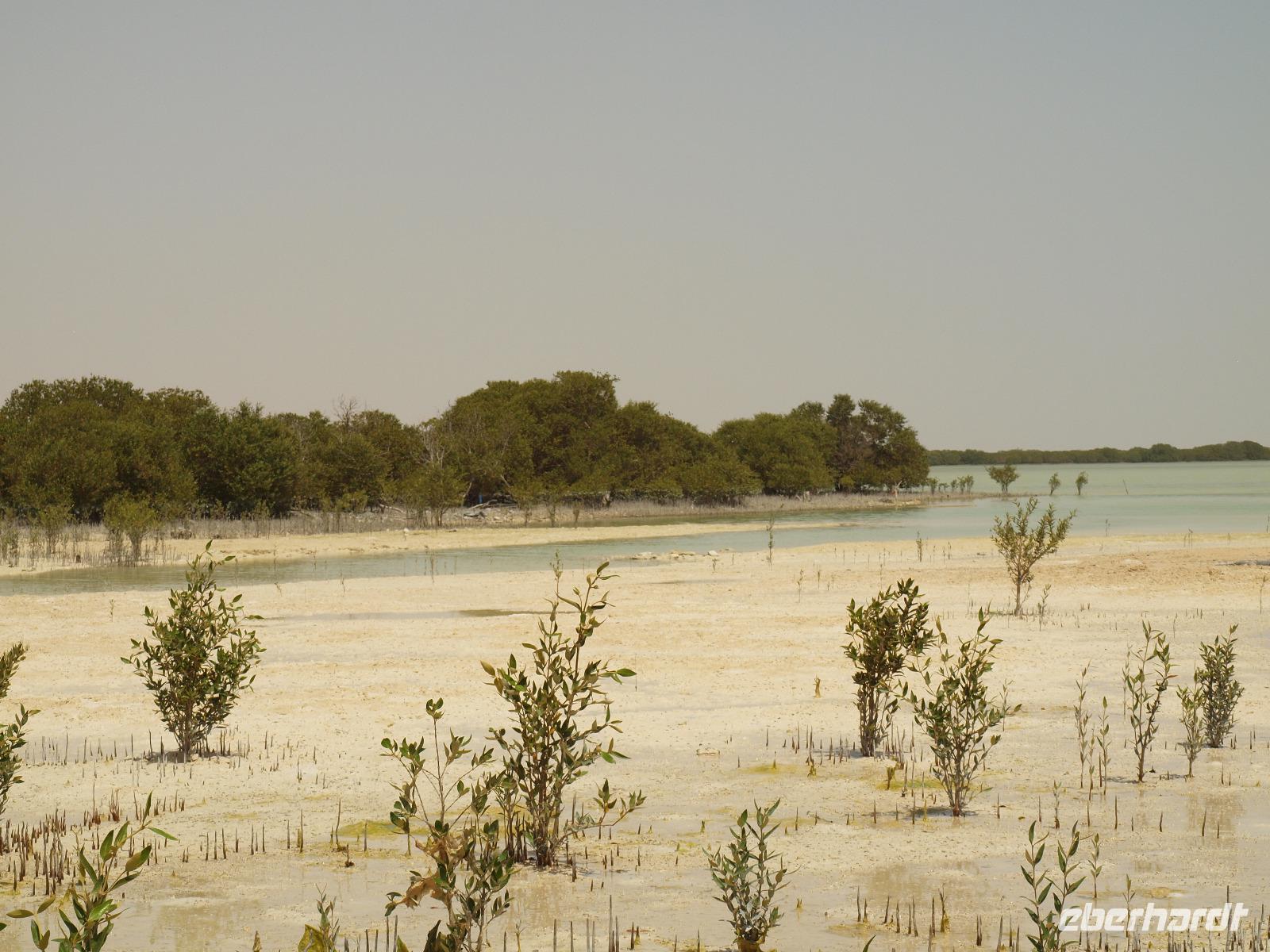 Wir fahren weiter in Richtung Nationalpark, Al Thakira. Hier halten wir am Strand und können von weitem schon die Mangroven erkennen. Ein willkommener Anblick und ein guter Kontrast zur Großstadtatmosphäre in Doha. Gleich in der Nähe befindet sich eine kleine Moschee. Diese können wir sogar ohne besondere Kleiderordnung betreten, da sie sich im Moment noch in der Renovierung befindet. Von der Ostküste Katars geht es nun weiter in Richtung Nordwesten. Hier liegt noch unter viel Sand vergraben, die alte Küstenstadt Al Zubara. Wir können uns im Fort der Stadt, welches heute als kleines Museum dient, ein Bild der Geschichte der Stadt machen. Das Fort selbst diente früher der Verteidigung des Küstenabschnittes. Von Al Zubara aus machen wir noch einen Abstecher an die nördlichste Spitze von Katar, der Hafenort Al Ruwais ist ein eher verschlafener Ort und so zieht es uns eher wieder zurück in den Trubel der Großstadt. Zurück in Doha spazieren wir noch einmal über den Souk Waqif. Sahel zeigt uns den Goldsouk und später auch den Falkensouk. Ja, wirklich, ein eigener Souk für den Verkauf von Falken und deren Zubehör. Über die Bedeutung der Falken werden wir jedoch erst in Abu Dhabi mehr erfahren...