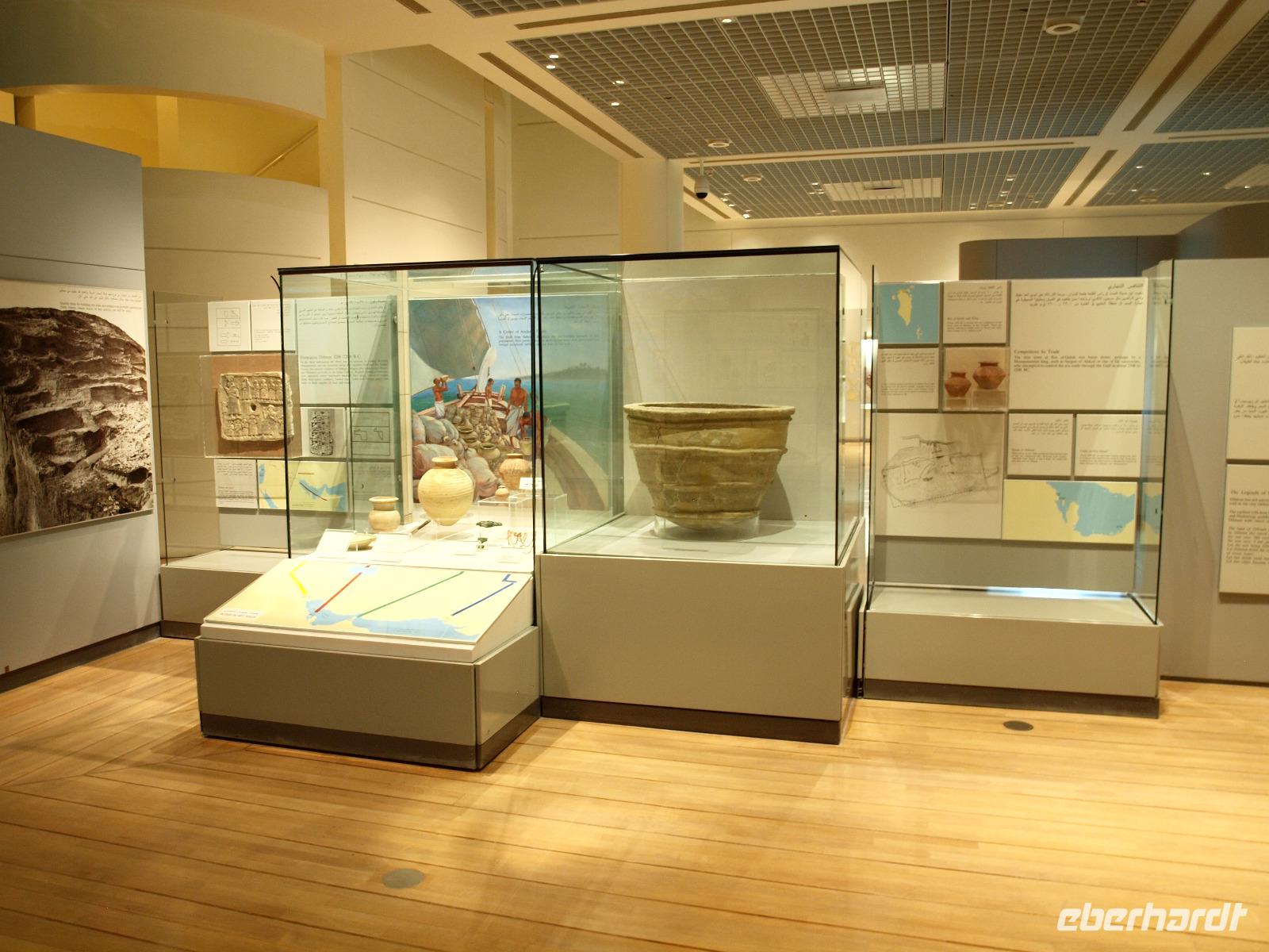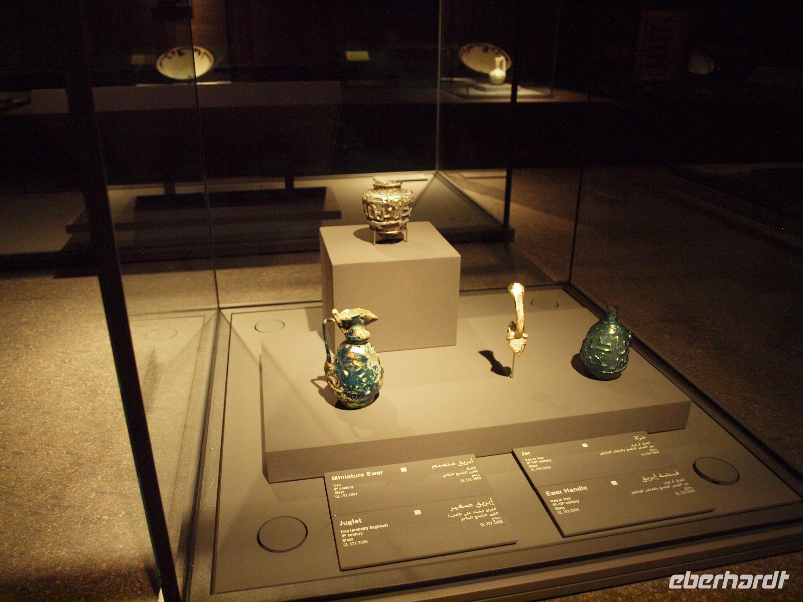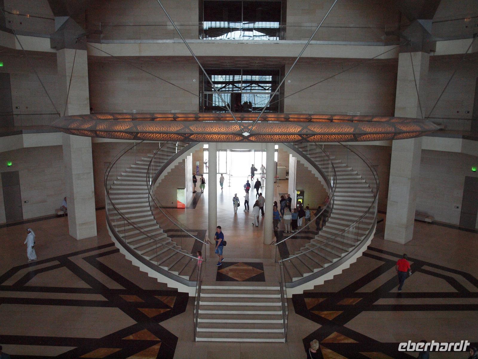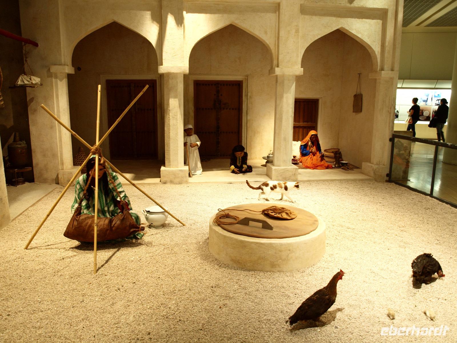 Bevor wir ins Nationalmuseum von Bahrain fahren, gehen wir noch eine Runde über den alten Souk. Hier findet man vor allem Gewürze und Süßigkeiten. Um die Geschichte des Landes noch einmal genauer zu verstehen führt uns Silvia schließlich durch das Museum. Wir bekommen einen Einblick in das Leben vor dem Ölboom. Besonders interessant ist die Ausstellung der alten Dilmun-Kultur , die Ausstellung über die langjährige Tradition der Perlentaucherei und die Schriftstücke aus alten Zeiten. Hier könnte man sicher die eine oder andere Minute länger verweilen, doch leider wartet unser Flugzeug bereits und wir müssen zurück ins Hotel um unser Gepäck zu holen. Nach einer kurzen Verschnaufpause auf den Zimmern, treffen wir uns wieder und treten die Weiterreise nach Katar an.