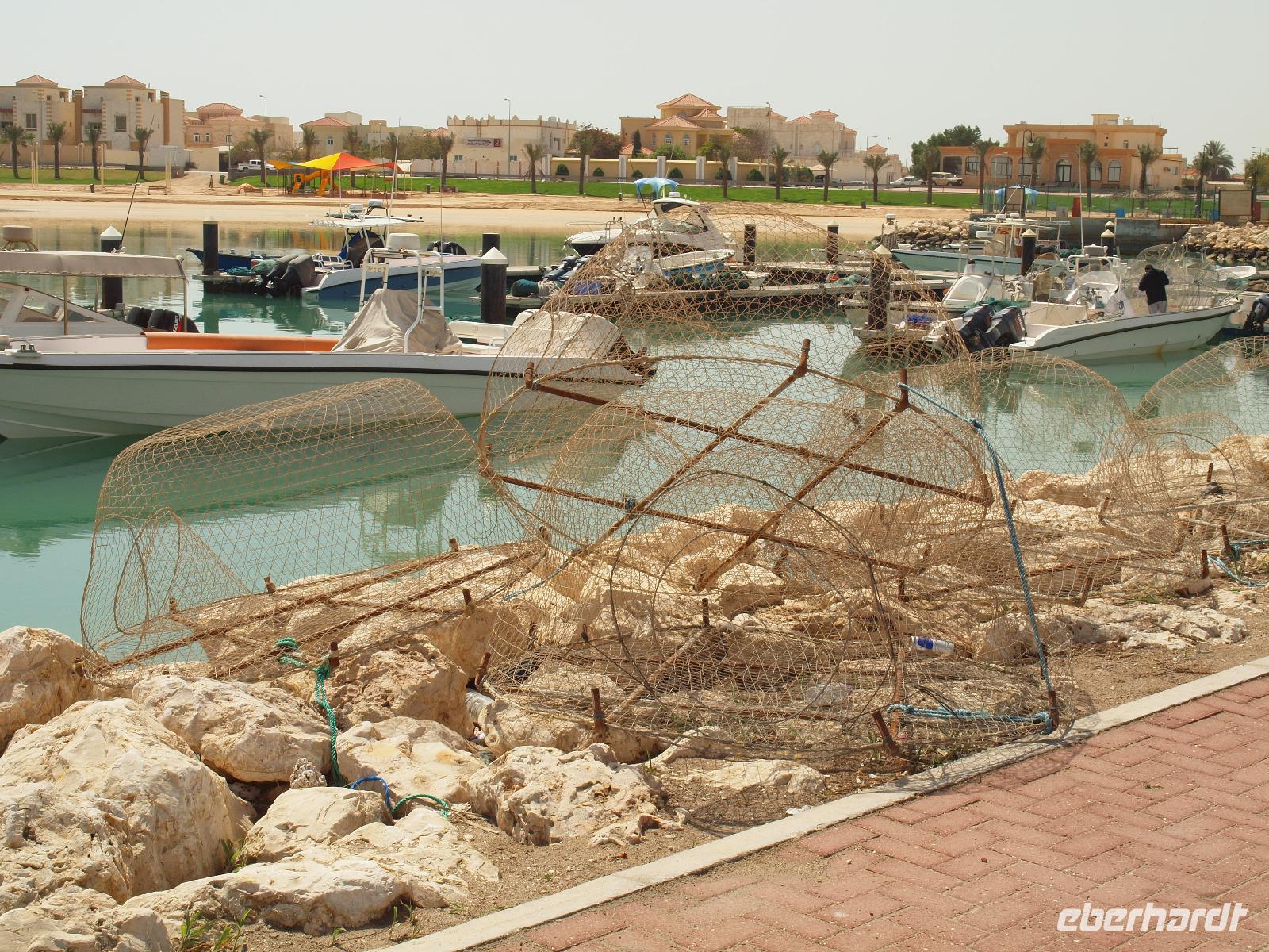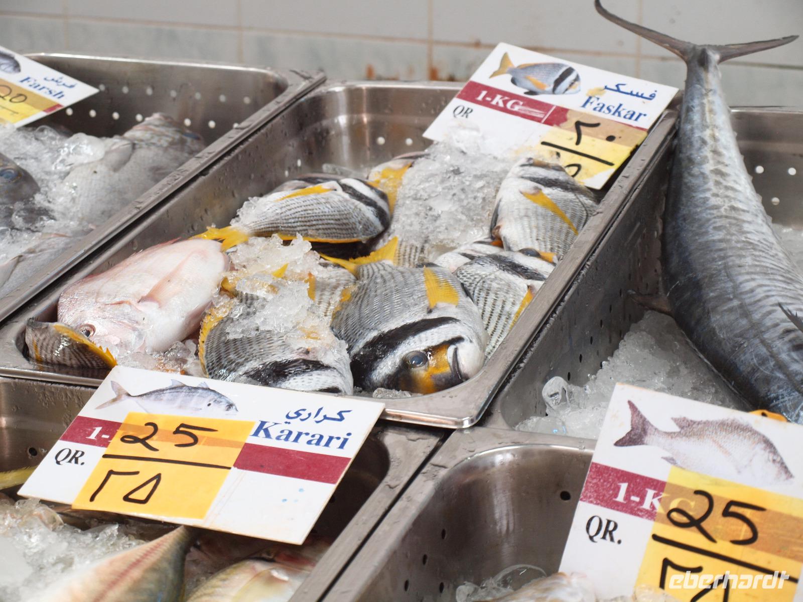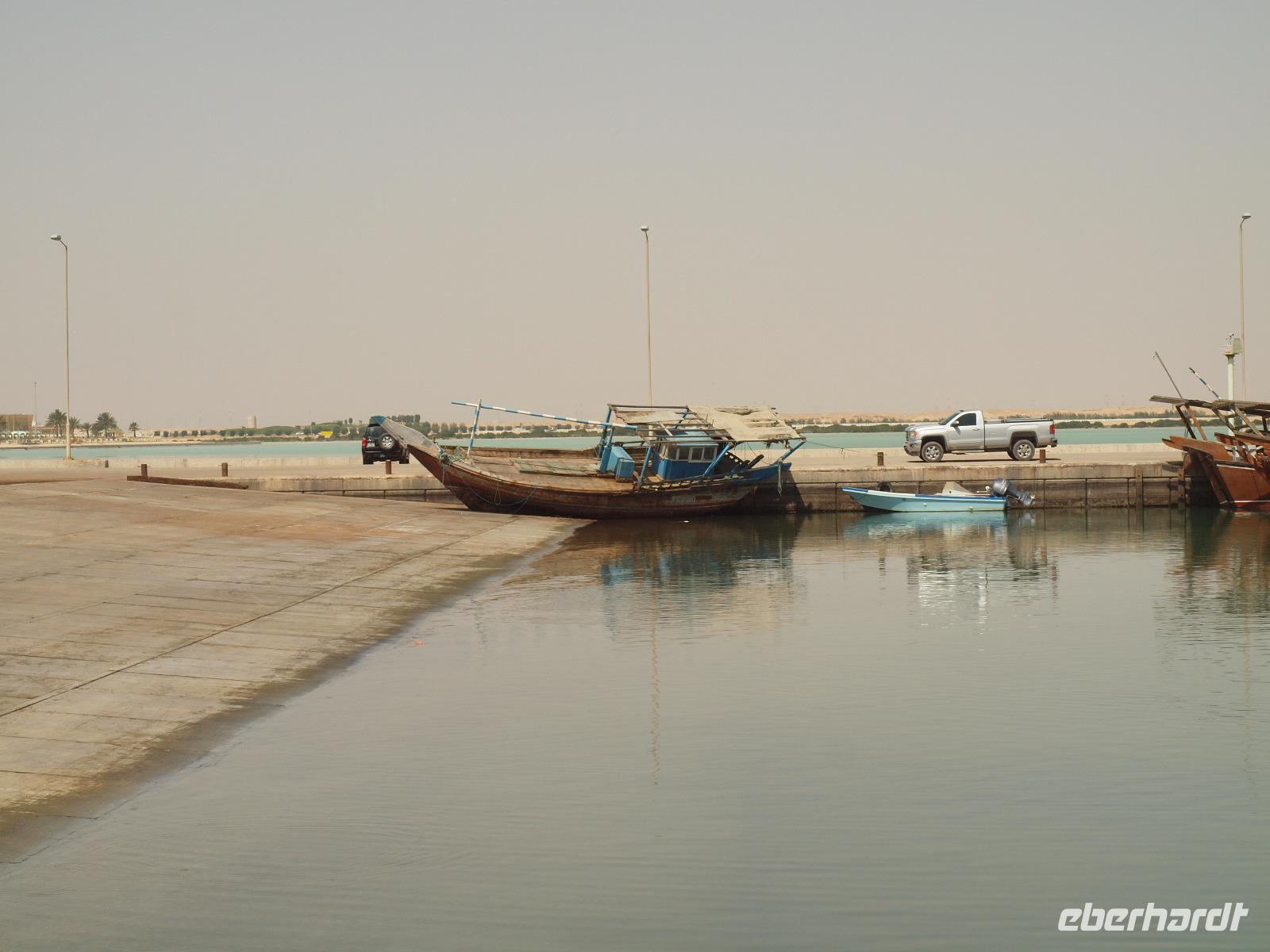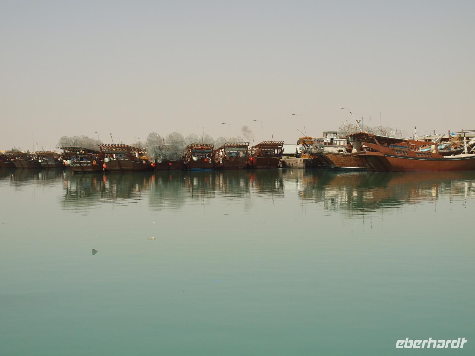 Nach dem Frühstück brechen wir auf zu unserem Ausflug in den Norden von Katar. Unser erster Stopp ist an der Corniche, hier haben wir einen schönen Blick auf die Skyline von Doha. Da sich Doha im Moment sehr verändert finden wir überall neue Bauprojekte und Baustellen. Erst nachdem wir die Stadtgrenze erreicht haben lässt auch der Verkehr nach und wir befinden und plötzlich in einer eher kargen und steinigen Gegend. Unser nächstes Ziel ist der Fischerort Al Khor. Wir schlendern etwas entlang des Hafenbeckens und schauen uns die alten Holzboote, Dhau genannt, genauer an. Auf diesen Booten leben und arbeiten die Fischer noch heute, die Boote sind meist nur gepachtet. Es gibt hier auch einen kleinen Fischmarkt, den wir uns natürlich auch einmal aus der Nähe anschauen.