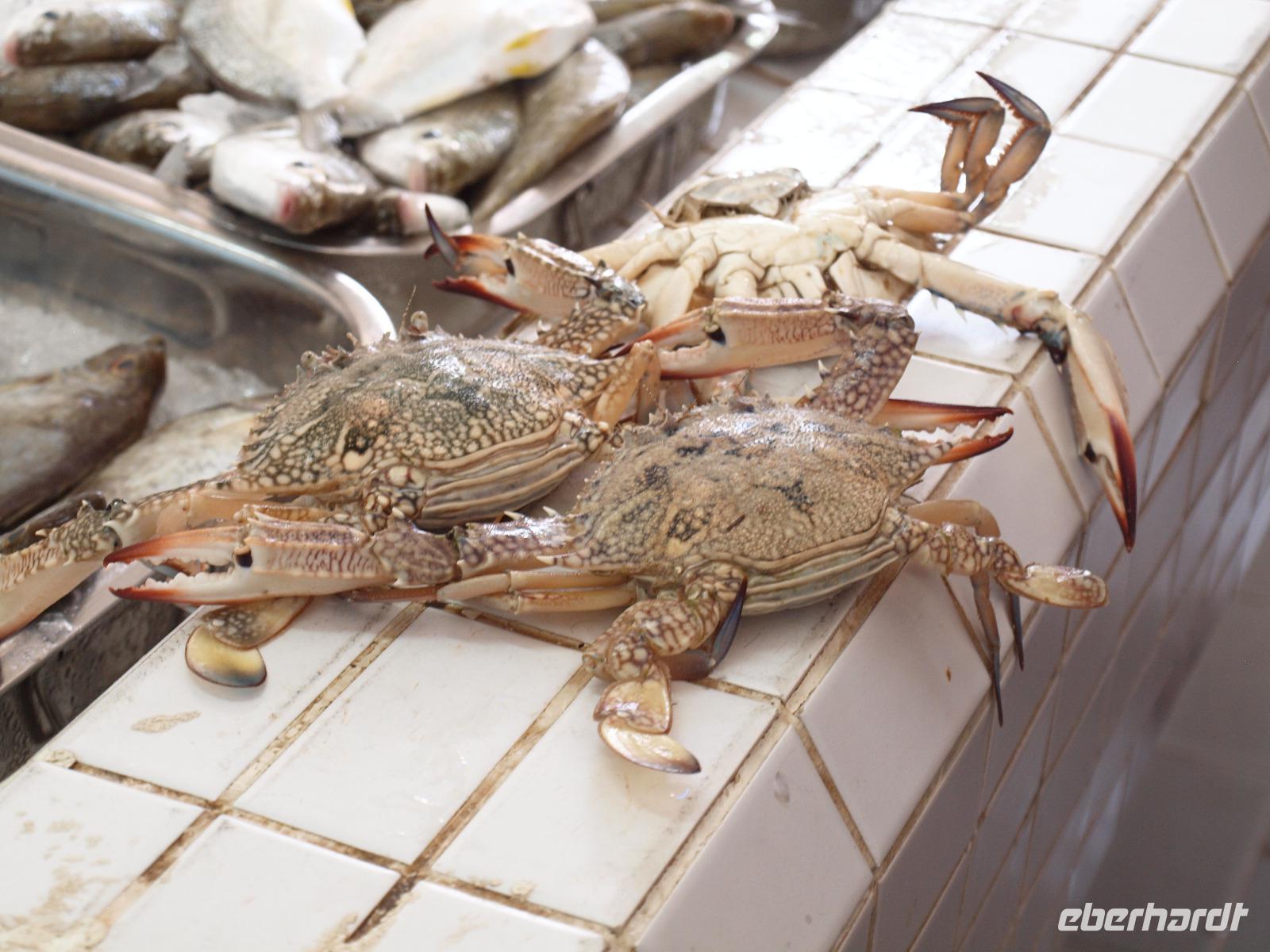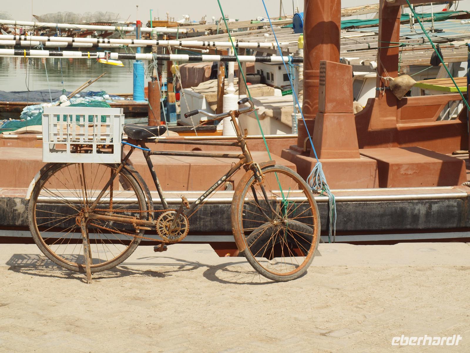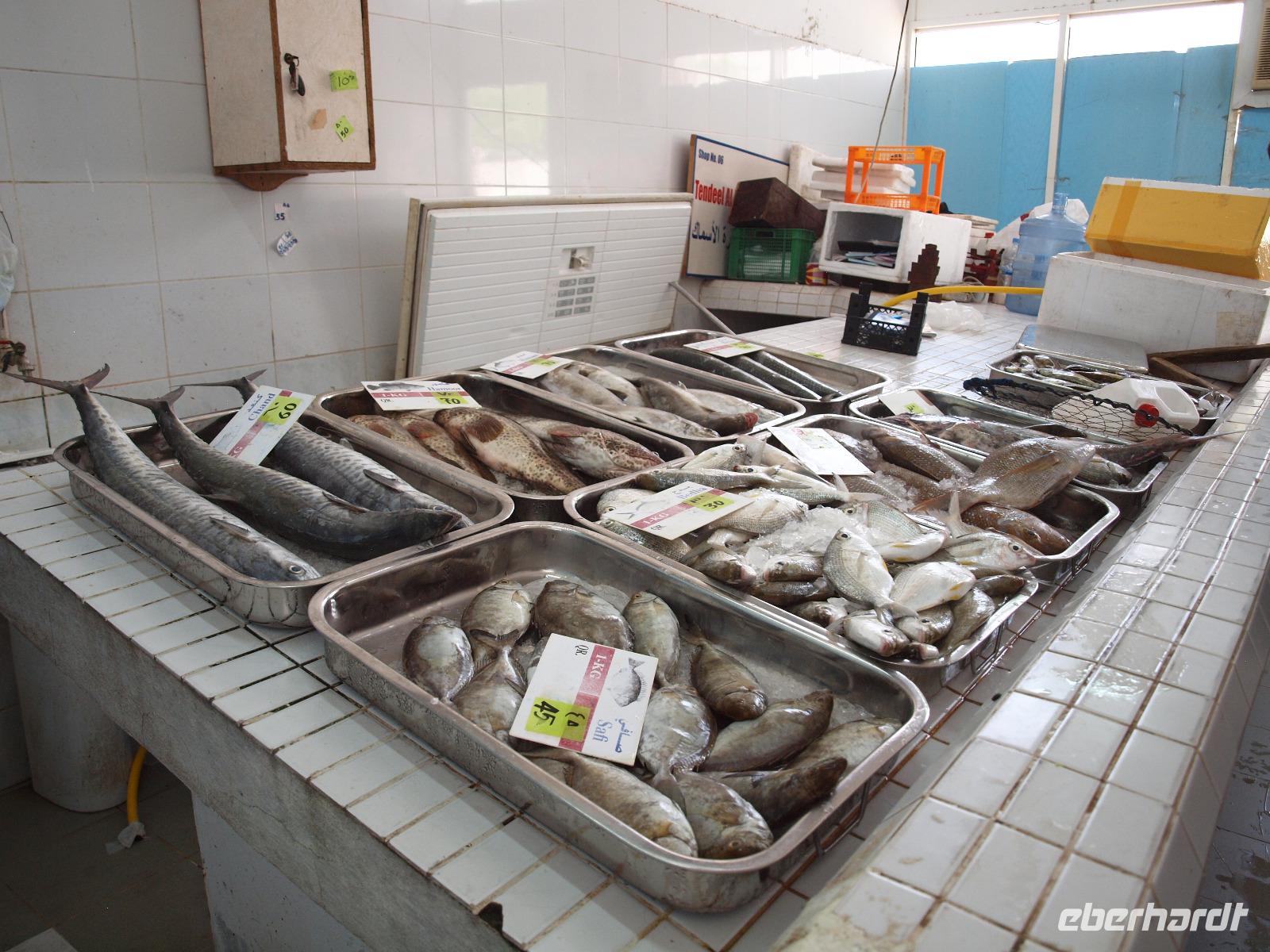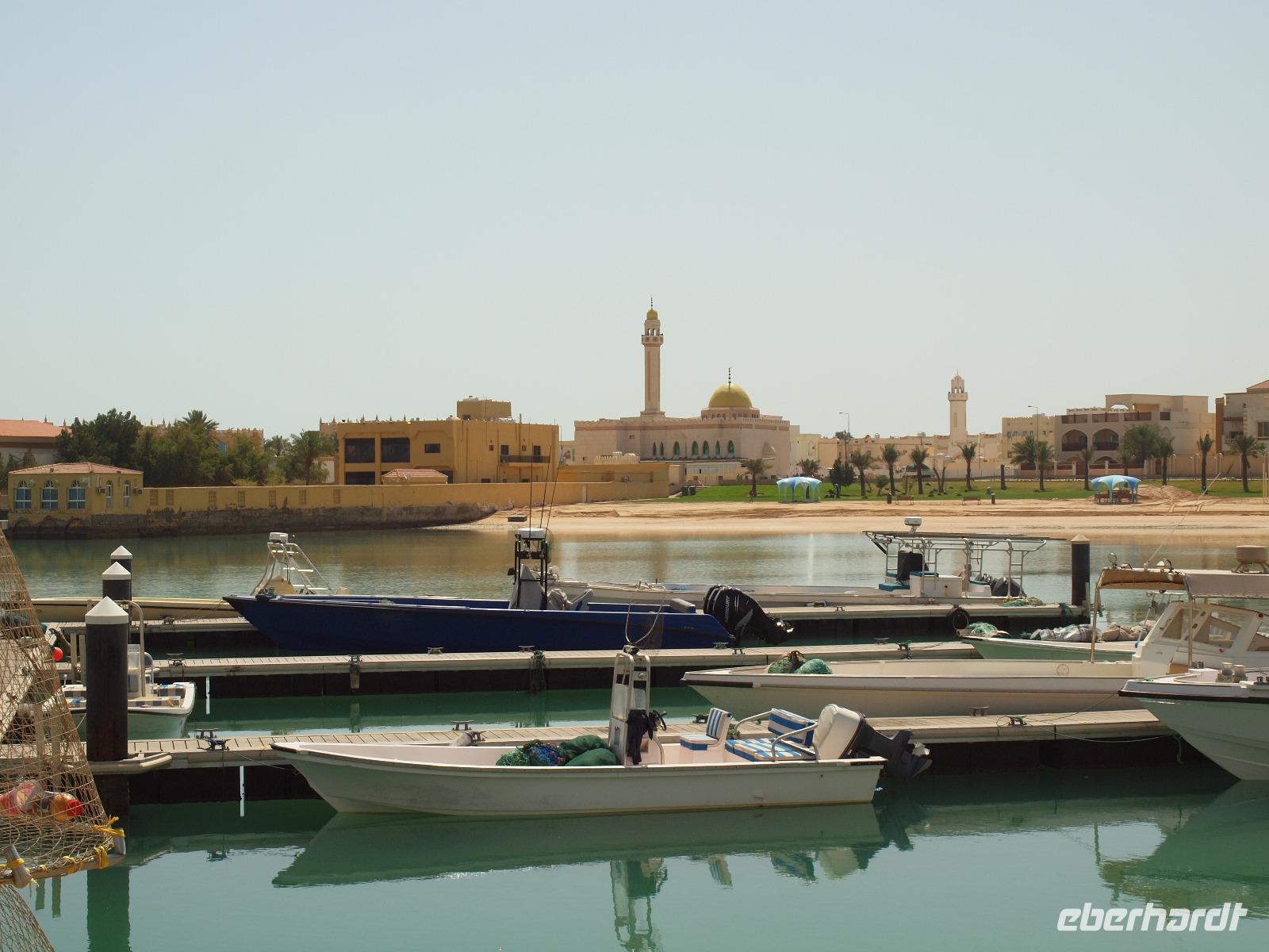 Nach dem Frühstück brechen wir auf zu unserem Ausflug in den Norden von Katar. Unser erster Stopp ist an der Corniche, hier haben wir einen schönen Blick auf die Skyline von Doha. Da sich Doha im Moment sehr verändert finden wir überall neue Bauprojekte und Baustellen. Erst nachdem wir die Stadtgrenze erreicht haben lässt auch der Verkehr nach und wir befinden und plötzlich in einer eher kargen und steinigen Gegend. Unser nächstes Ziel ist der Fischerort Al Khor. Wir schlendern etwas entlang des Hafenbeckens und schauen uns die alten Holzboote, Dhau genannt, genauer an. Auf diesen Booten leben und arbeiten die Fischer noch heute, die Boote sind meist nur gepachtet. Es gibt hier auch einen kleinen Fischmarkt, den wir uns natürlich auch einmal aus der Nähe anschauen.