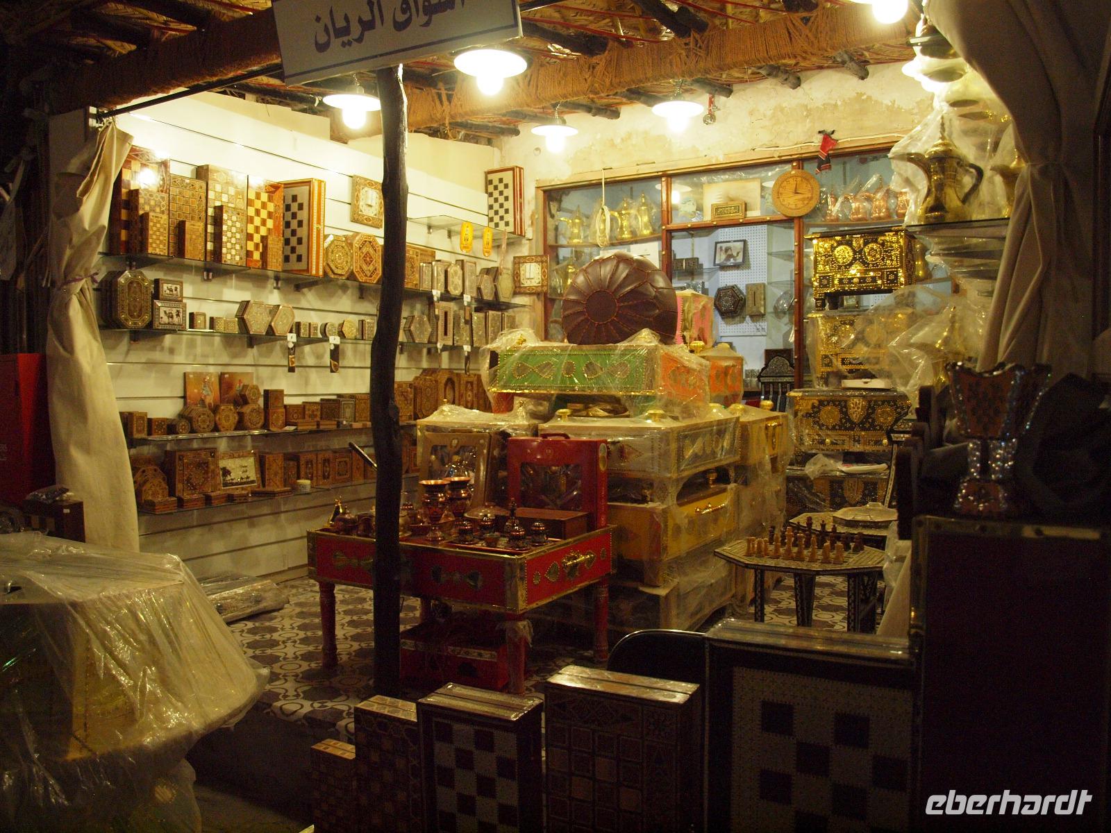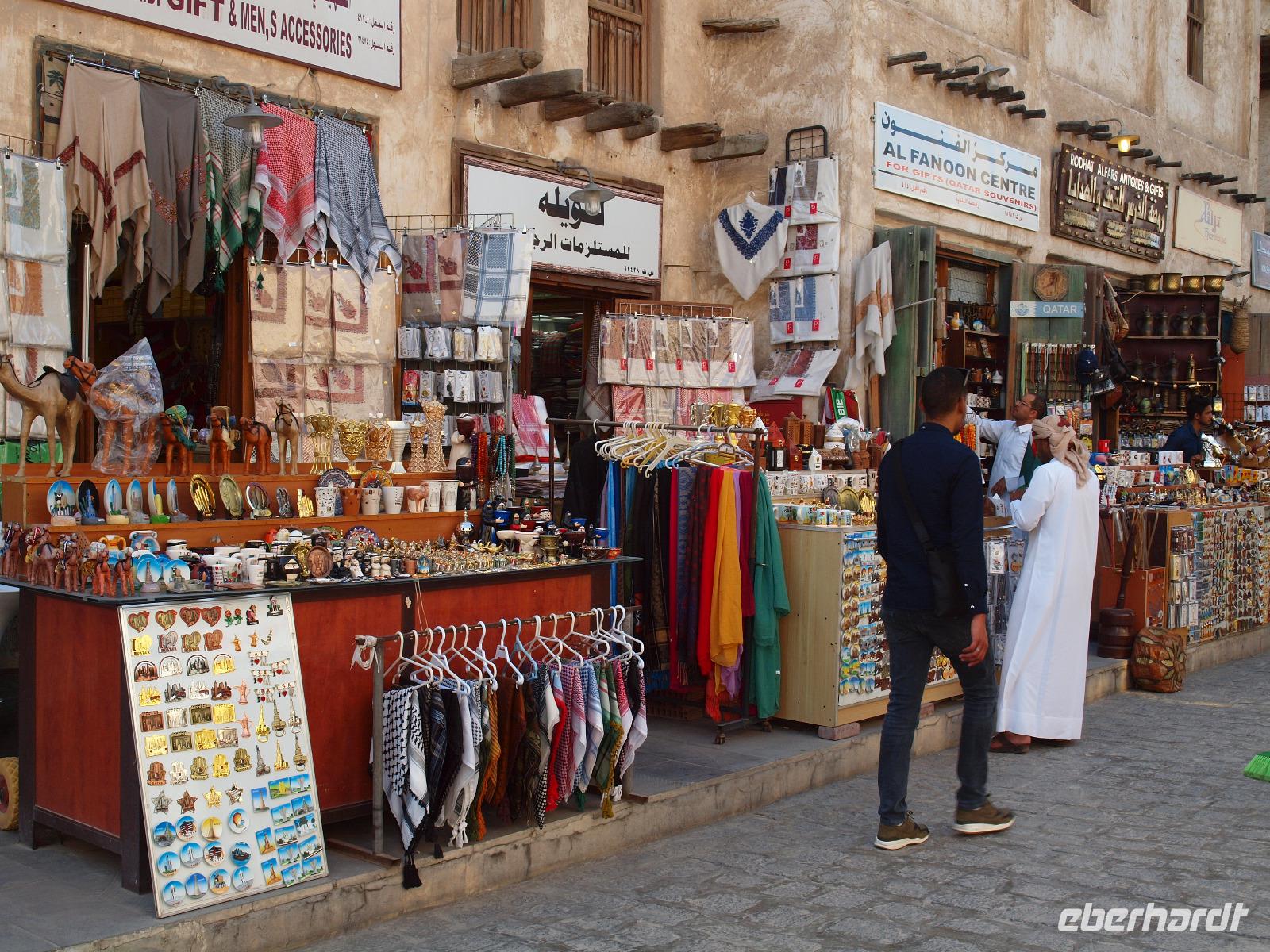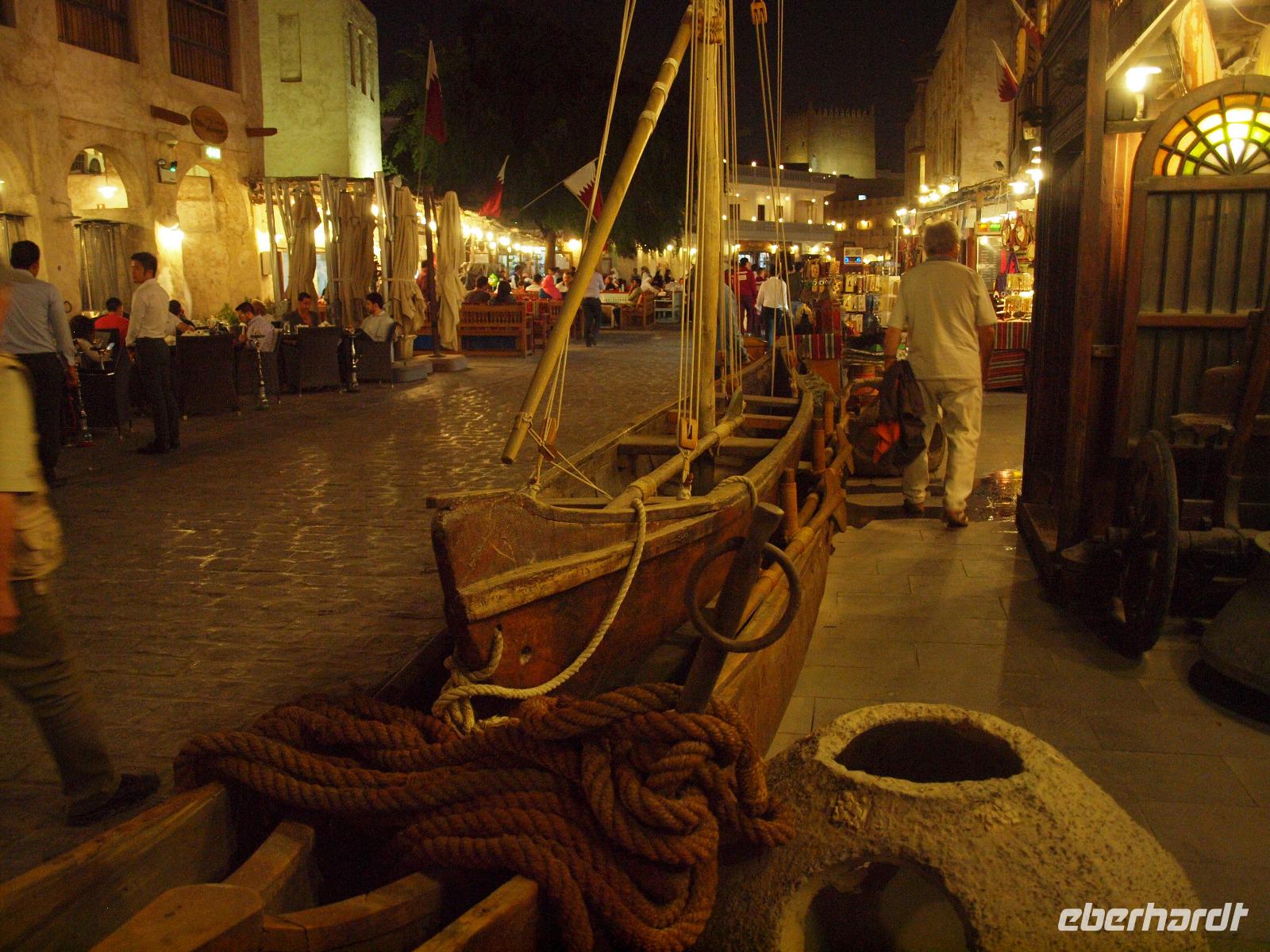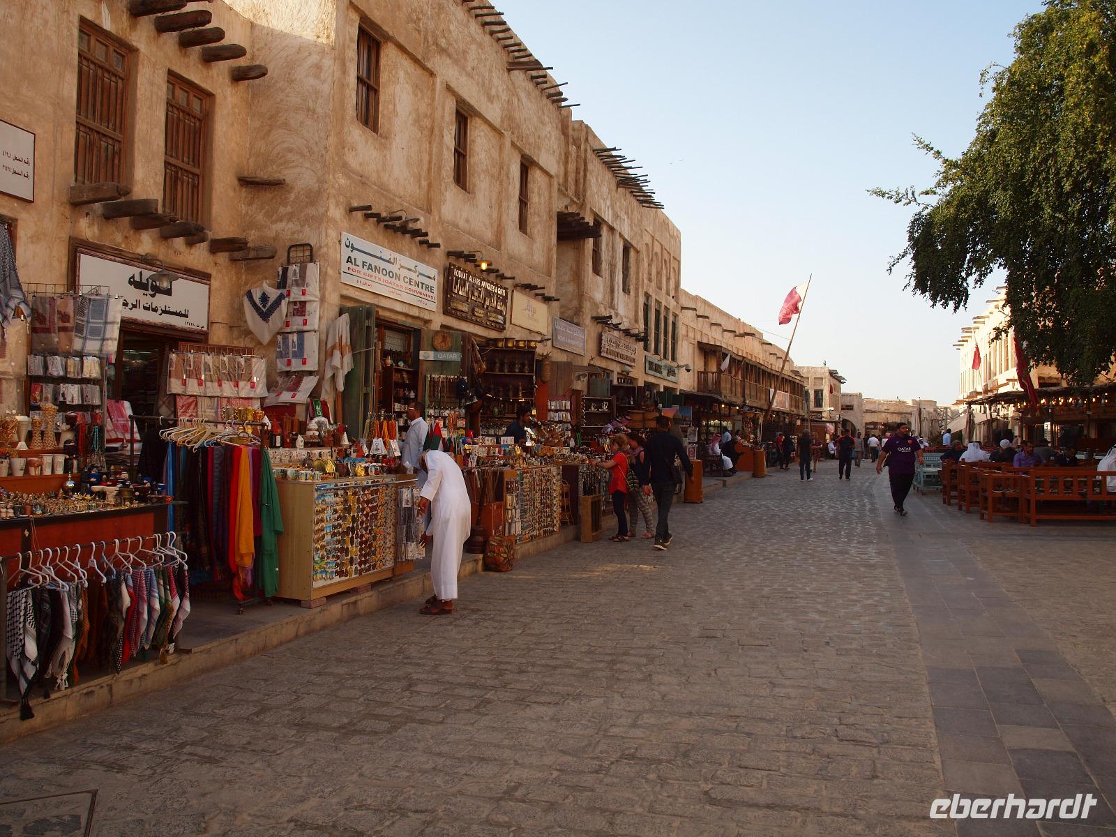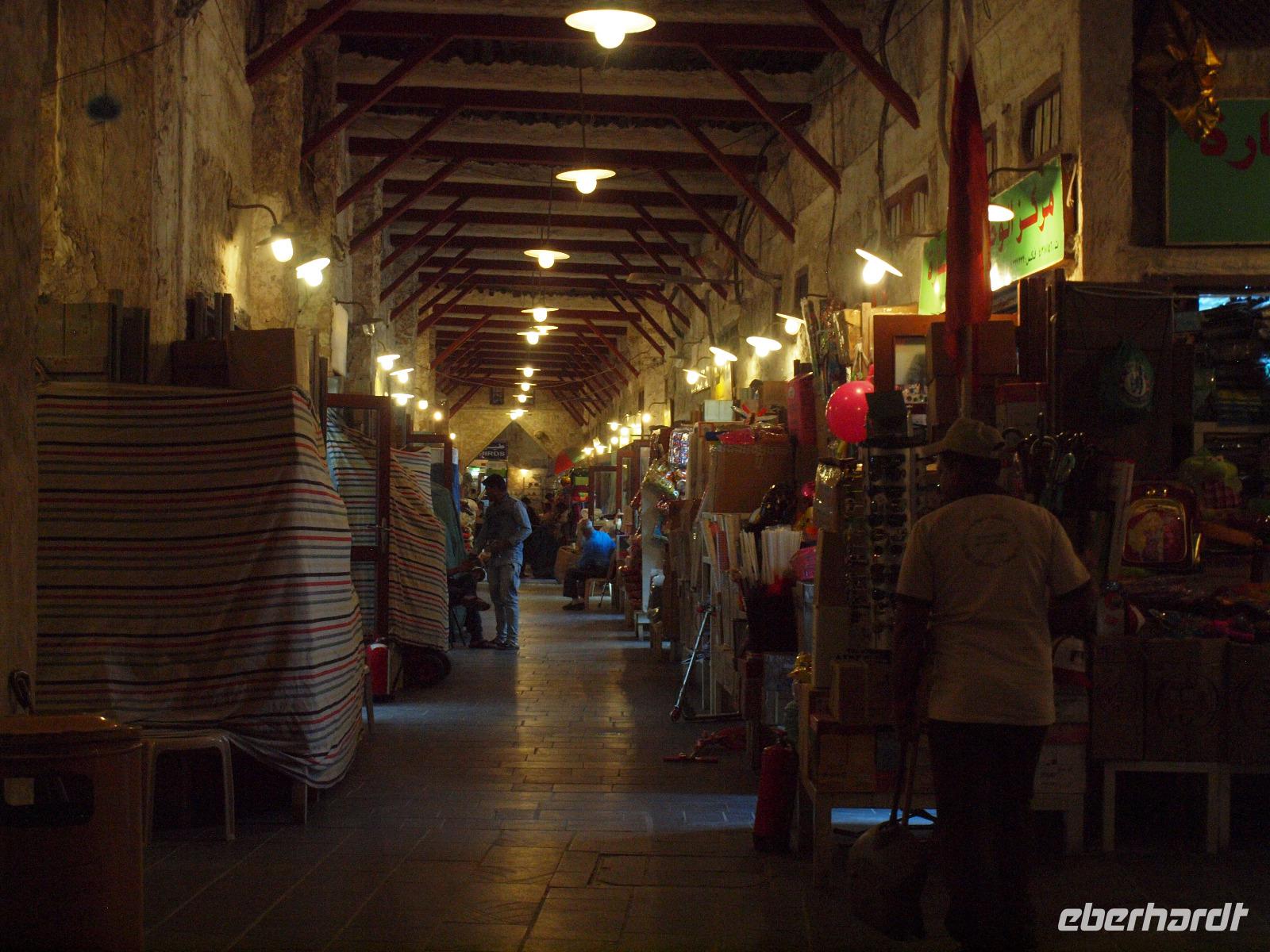 Es ist bereits spät geworden, unser Reiseleiter Sahel, aus Ägypten, nimmt uns freundlich in Empfang und bringt uns zum Hotel. Von hier geht es gleich weiter zum Souk Waqif, immerhin ist es Zeit für das Abendessen. Nach der ausreichenden Stärkung sind wir noch nicht bereit zurück ins Hotel zu fahren. Wir wollen gern den lauwarmen Abend auskosten und den Souk erkunden. Sahel geht mit uns also noch eine Runde. Vorbei an zahlreichen Stoffläden und Läden mit lauter Krimskram bis hin zu widersprüchlichen Freiluft-Zoohandlungen führt uns Sahel durch den Abend. Zurück im Hotel verabreden wir uns für den nächsten Tag und gehen auf unsere Zimmer.