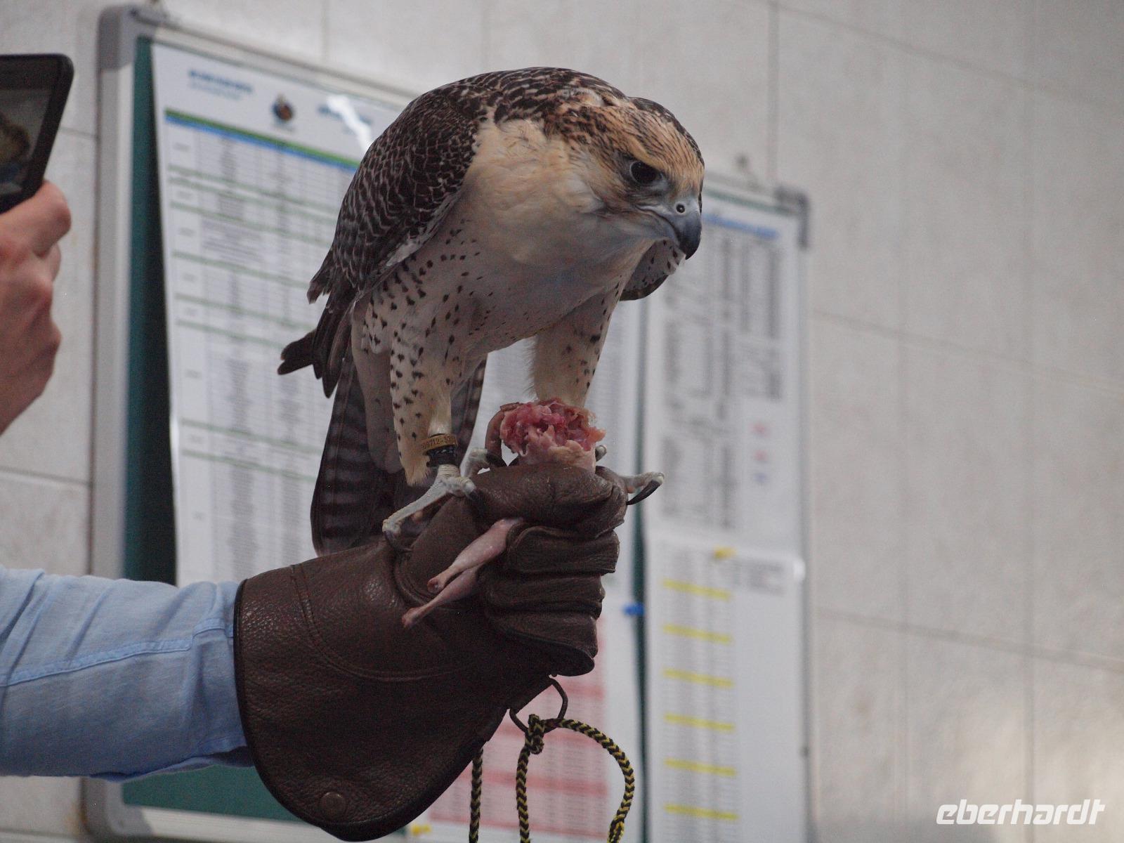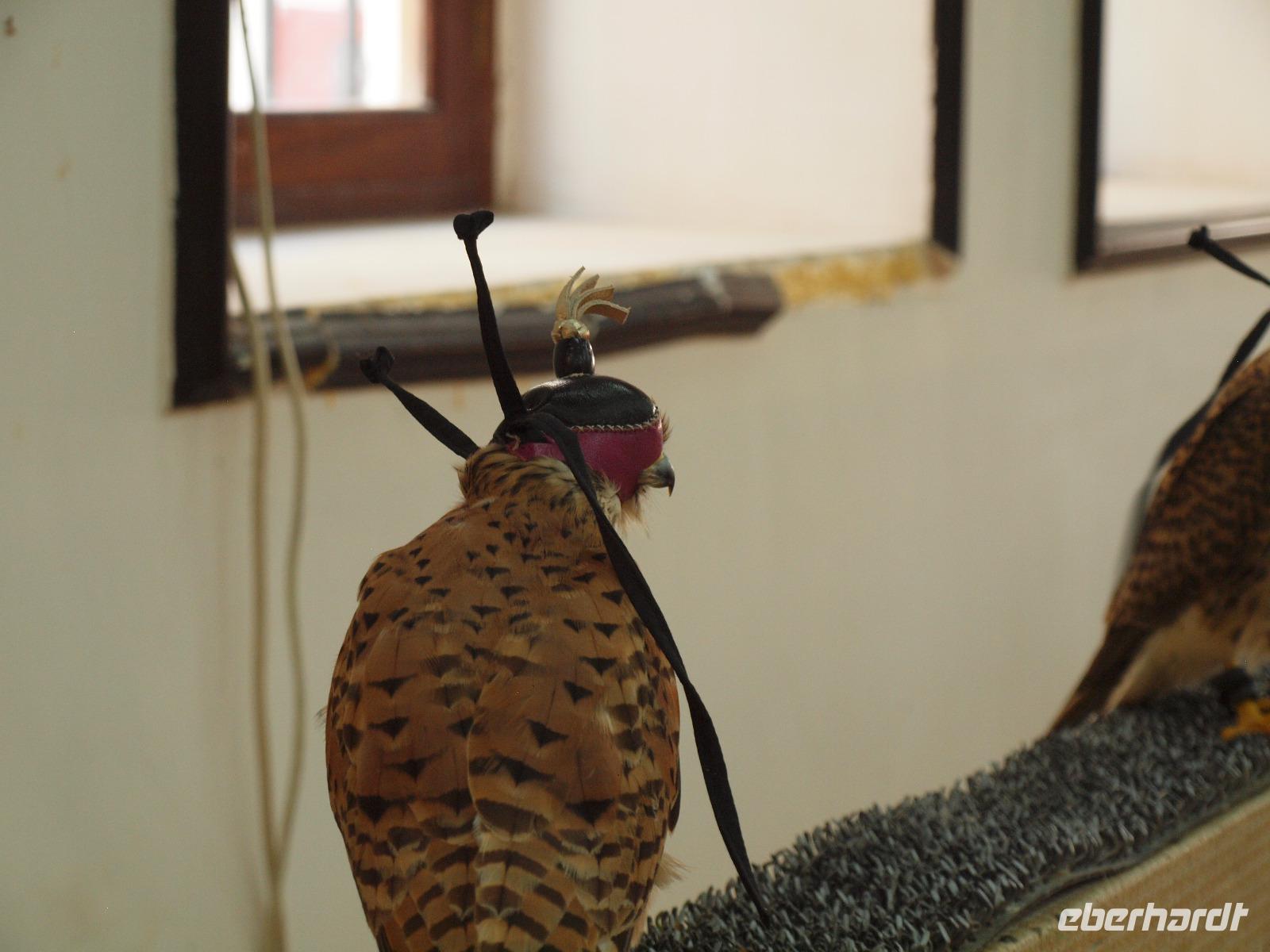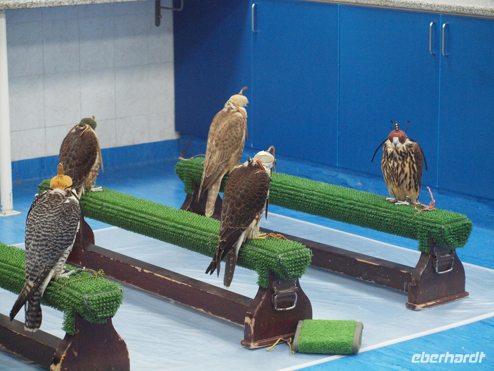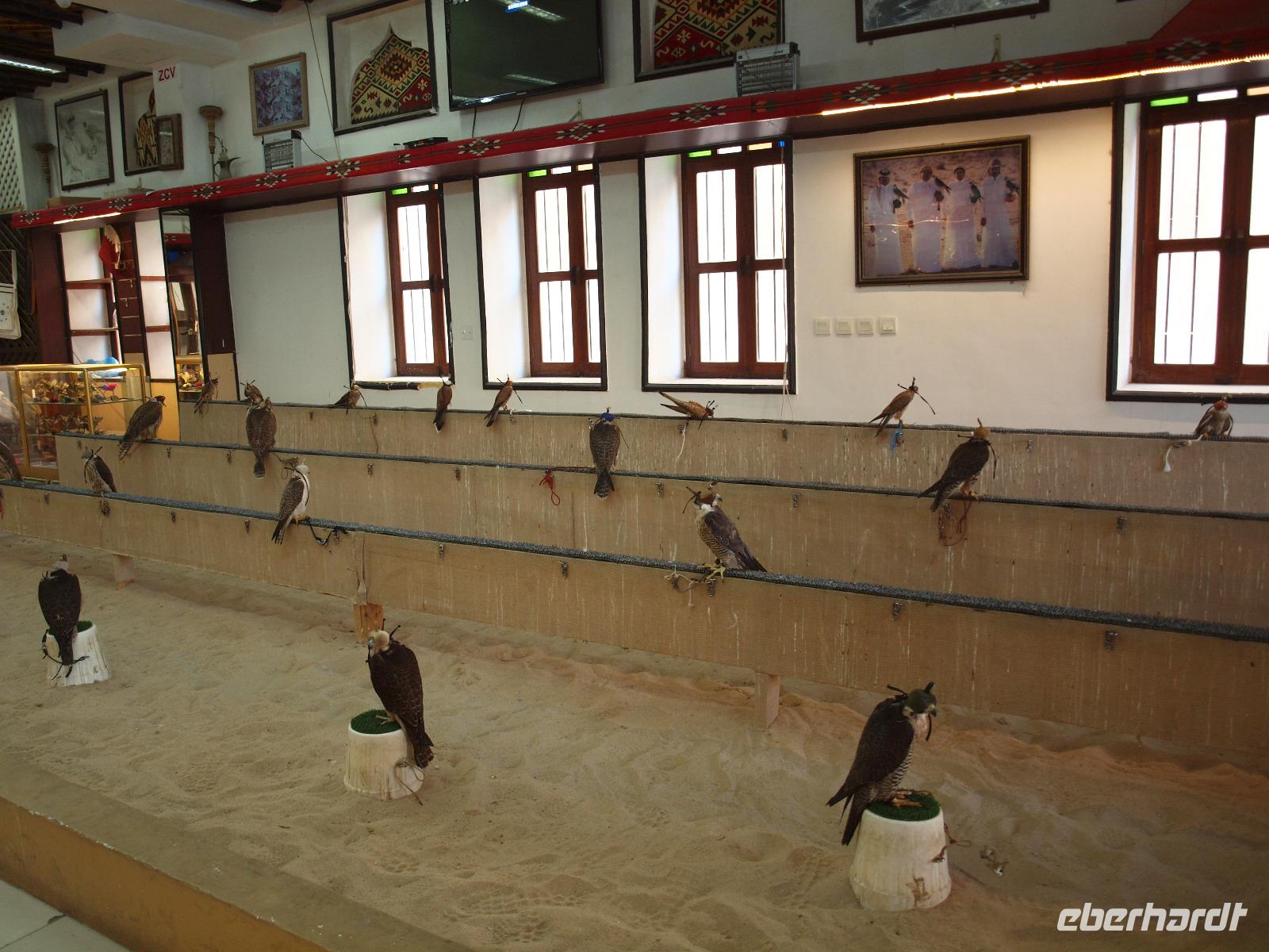 Seit 1999 werden in der Falkenklinik Falken die sich bei der Jagd oder beim notwendigen täglichen Training verletzt haben behandelt und gesund gepflegt. Ungewöhnlich für ein Tierkrankenhaus: Die Klinik ist äußerst luxuriös, die Käfige groß und alle Gebäude sind mit edlen Hölzern verkleidet. Wir erkennen sofort, welchen Status die Tiere in dem Wüstenstaat inne haben. Wir werden zu erst in eine Art Ausstellungsraum gebeten. Hier werden die Grundfakten über die Falken erklärt, wie viele Arten es gibt, welche Phasen sie durchleben und wie man Sie am Ende für die Hilfe zum Überleben nutzen konnte. Die Führung geht weiter in den Behandlungsraum, hier fallen uns zu erst die Falken auf, die brav und ruhig im sogenannten "Wartezimmer" sitzen und auf ihre Behandlung warten. Die Tiere die wir hier sehen sind Tagespatienten und werden am Ende des Tages von ihren Besitzern wieder abgeholt. Zur Demonstration wird ein Falke für uns in Narkose gelegt und man erklärt uns wie den Tieren geholfen werden kann, wenn sie zum Beispiel eine gebrochene Feder haben. Zum Schluss der Behandlung, wenn der Falke wieder bei Bewusstsein ist, dürfen wir ihn sogar abwechselnd halten, faszinierend diese edlen Tiere. Nach einer Weile ist es etwas unruhig im Behandlungszimmer... schnell wissen wir auch warum. Die Direktorin selbst, Frau Dr. Müller, ist mit einigen Gästen ebenfalls unterwegs und unternimmt eine kleine Führung durch ihr Krankenhaus. Unsere Tour geht nach der Raubtierfütterung auch weiter und wir sehen noch einen Operationsraum von außen und den Raum in dem all die Auszeichnungen ausgestellt sind, die das Krankenhaus im Laufe der Jahre erhalten hat. Das Krankenhaus selbst dient aber auch als Tierheim. So gibt es hier zum Beispiel ein paar Eulen, die sich in der Natur verletzt haben und nie überleben würden in freier Wildbahn. Also bleiben sie wohlbehütet in der Klinik. Zum Ende der Führung werden wir noch in ein Haus gebracht in dem die Falken fliegen und und sich in Ruhe mausern können. Außerdem gibt es noch einen weiteren Ausstellungsraum zu sehen. Hier sind die Beutetiere und die Geschichte der Freundschaft zwischen Mensch und Falke nocheinmal zu sehen, in diesem Fall vor allem die Freundschaft zwischen dem Scheich und seinem Falken.